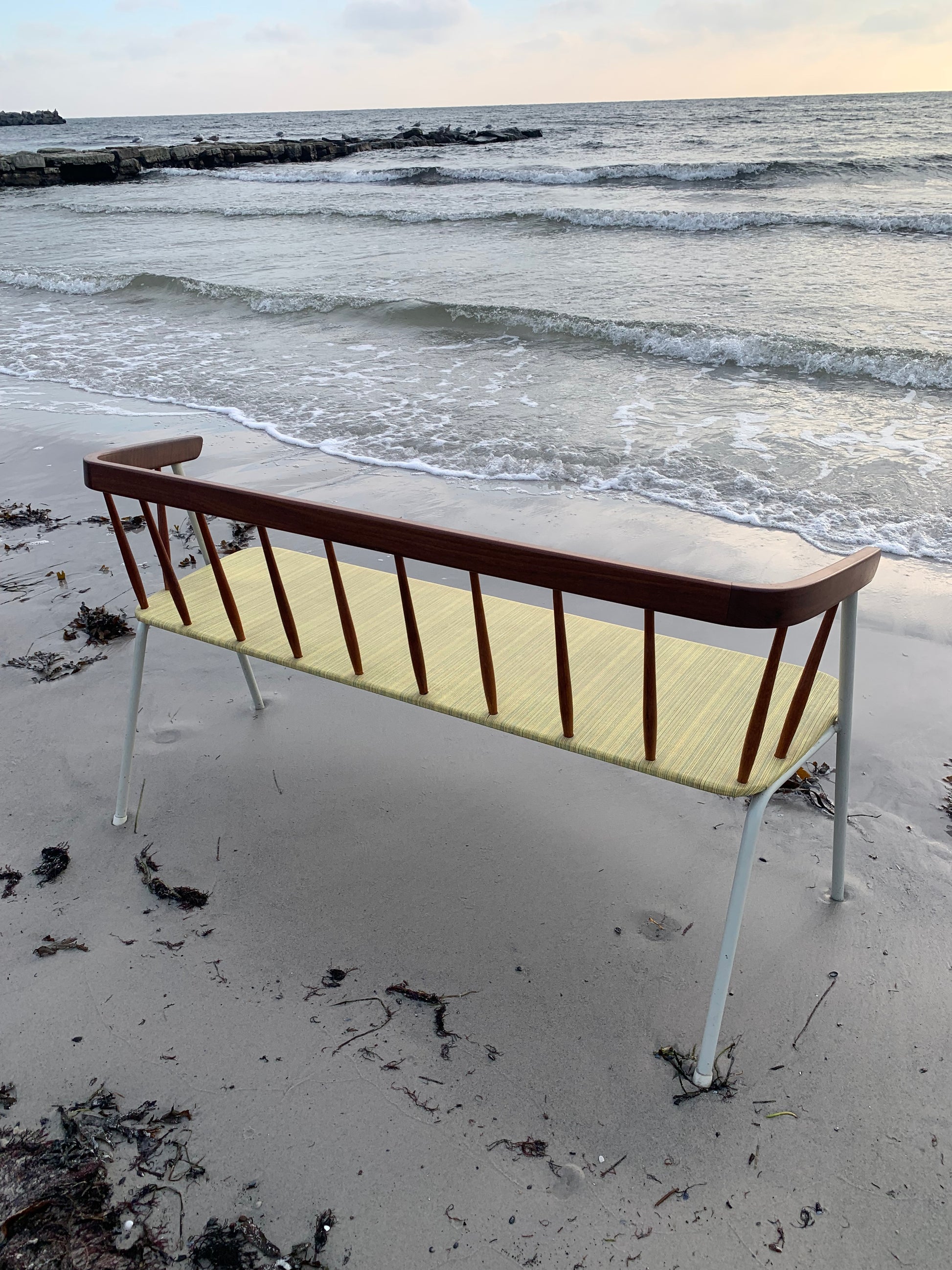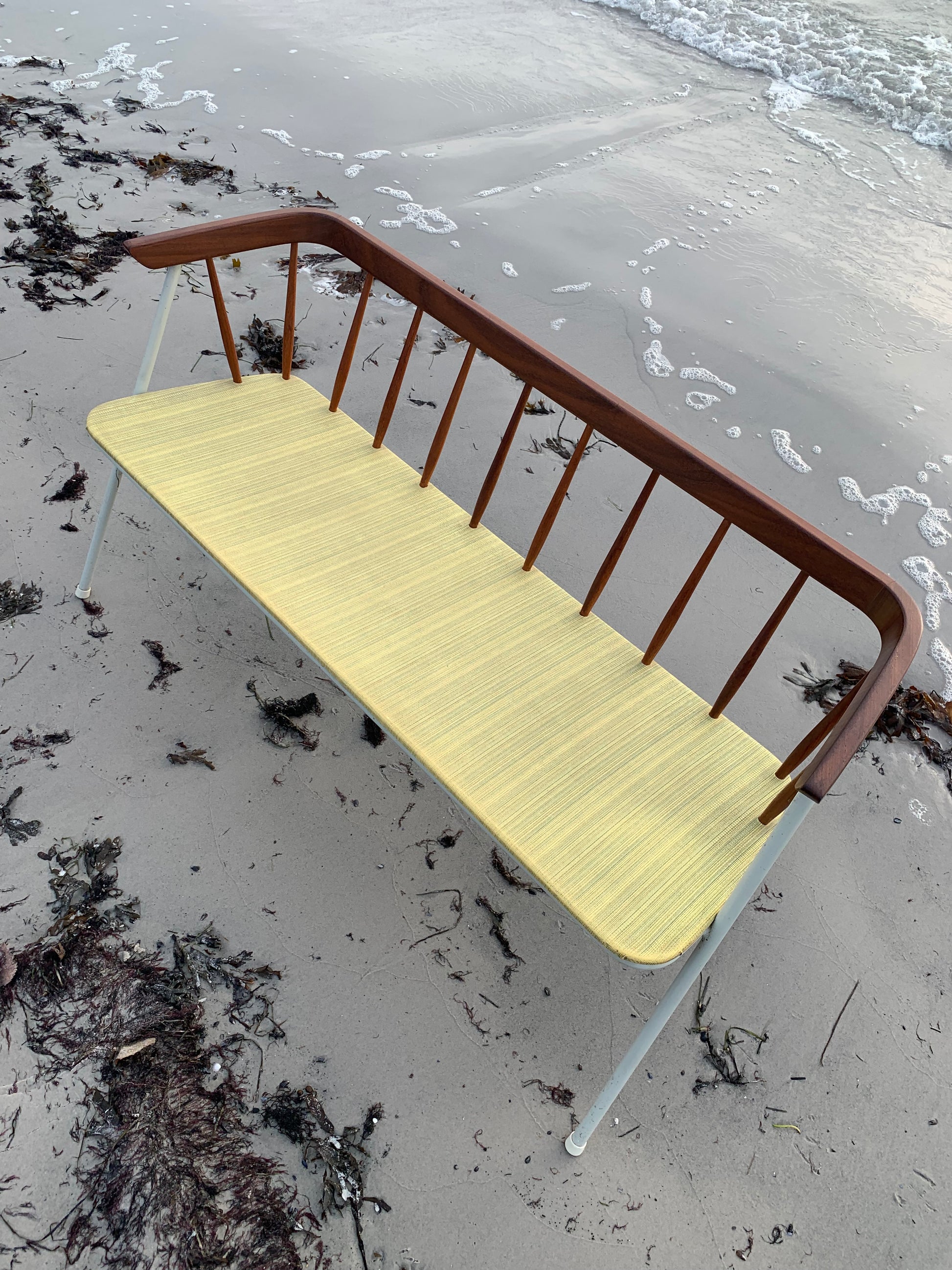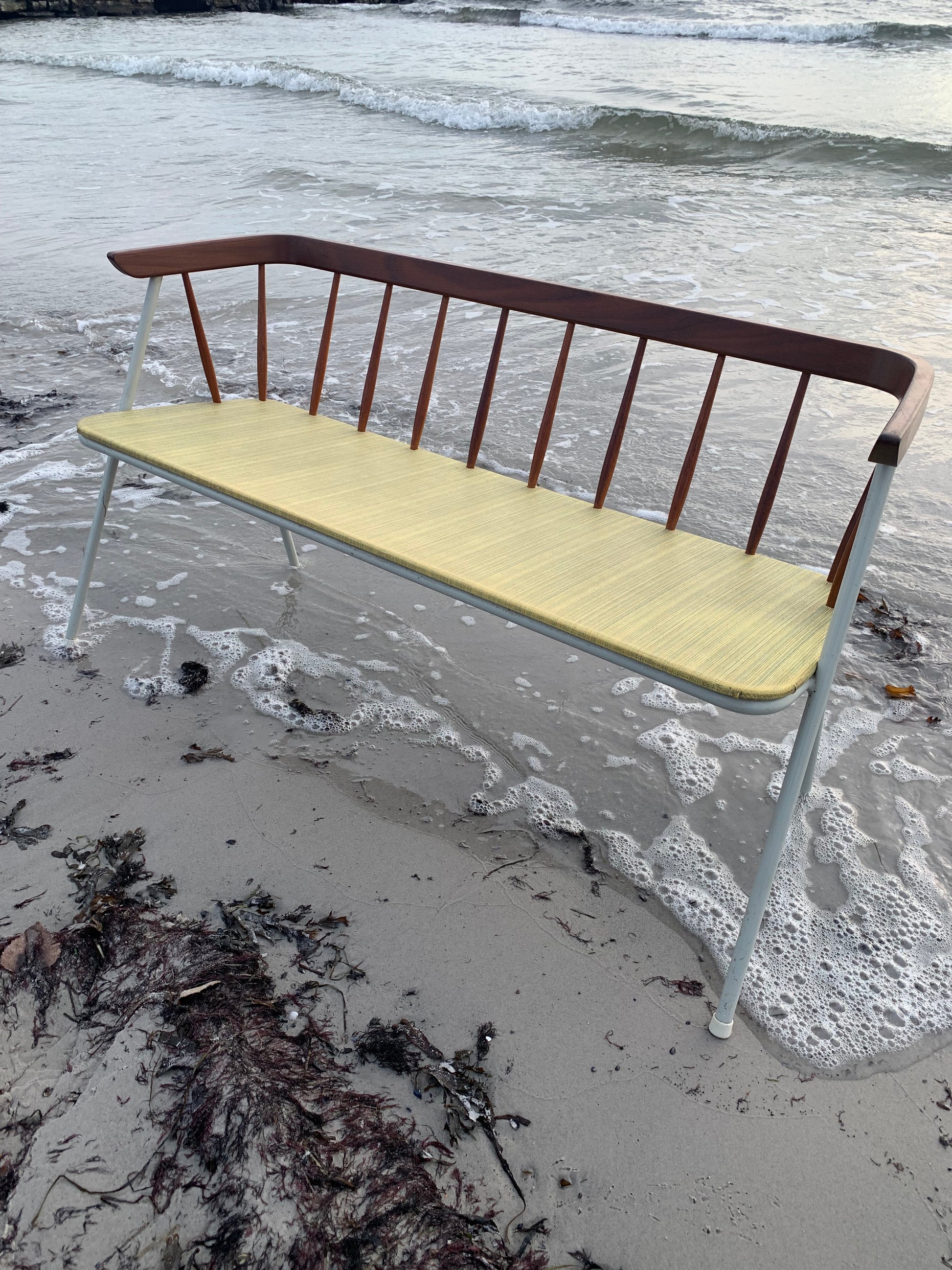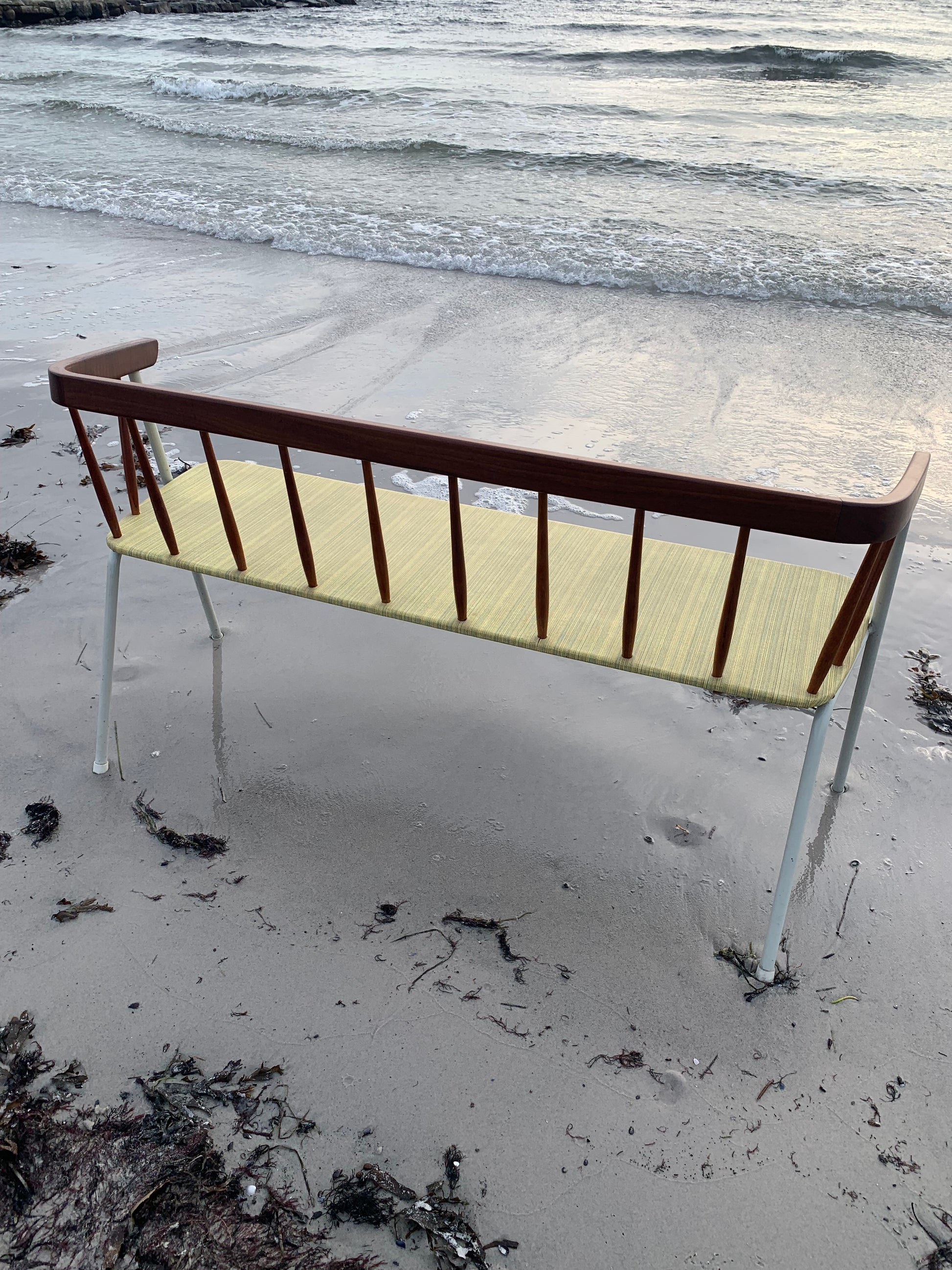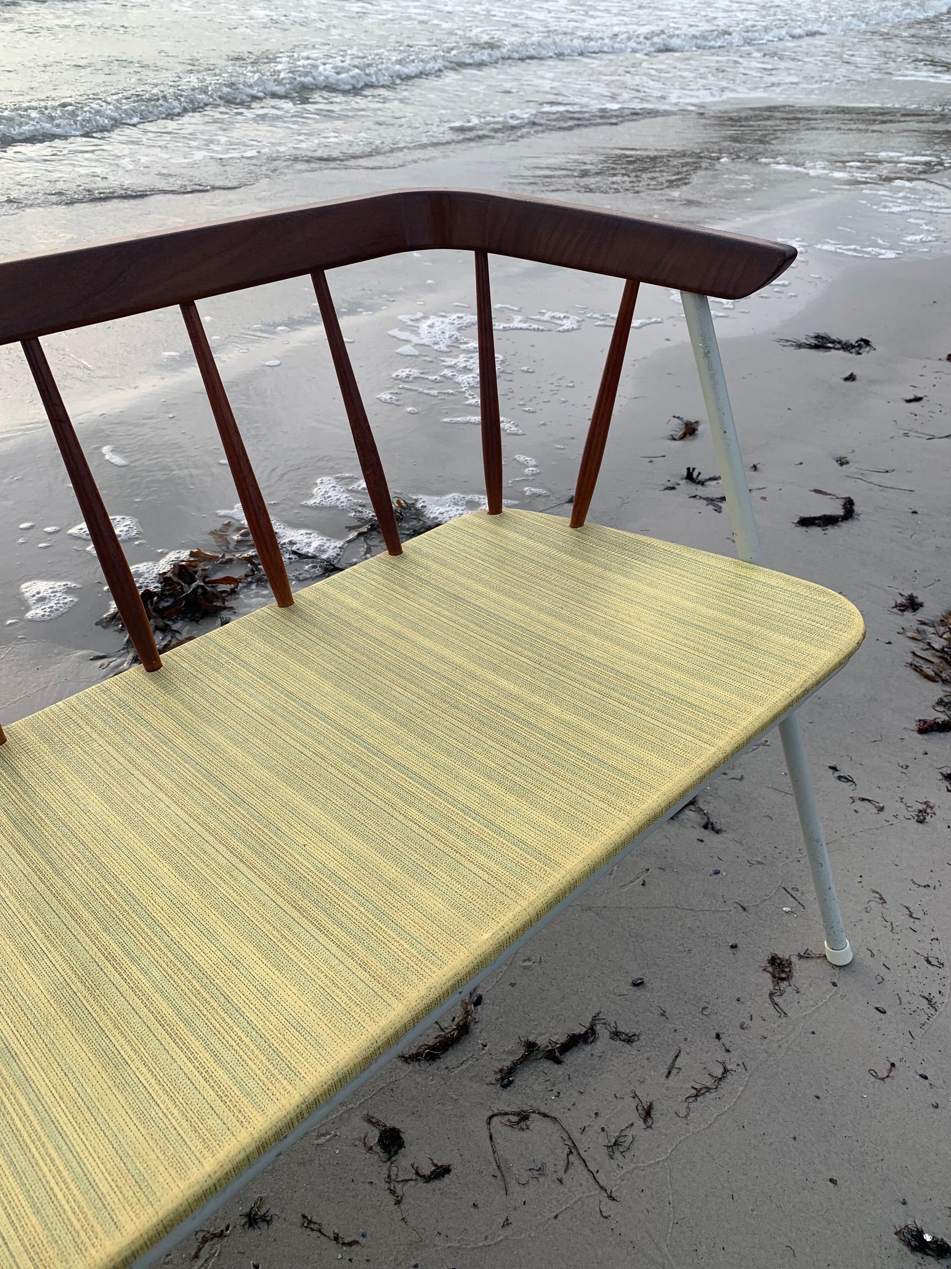 Fin liten bänk eller "ribbsoffa" tillverkad av en möbelsnickare i Sverige. Titta bara på den ribbade ryggstödet i trä, den har några väldigt fina hantverksdetaljer. Detta är en fin vintagemöbel med tecken på slitage men överlag både charmig och i riktigt gott vintageskick.