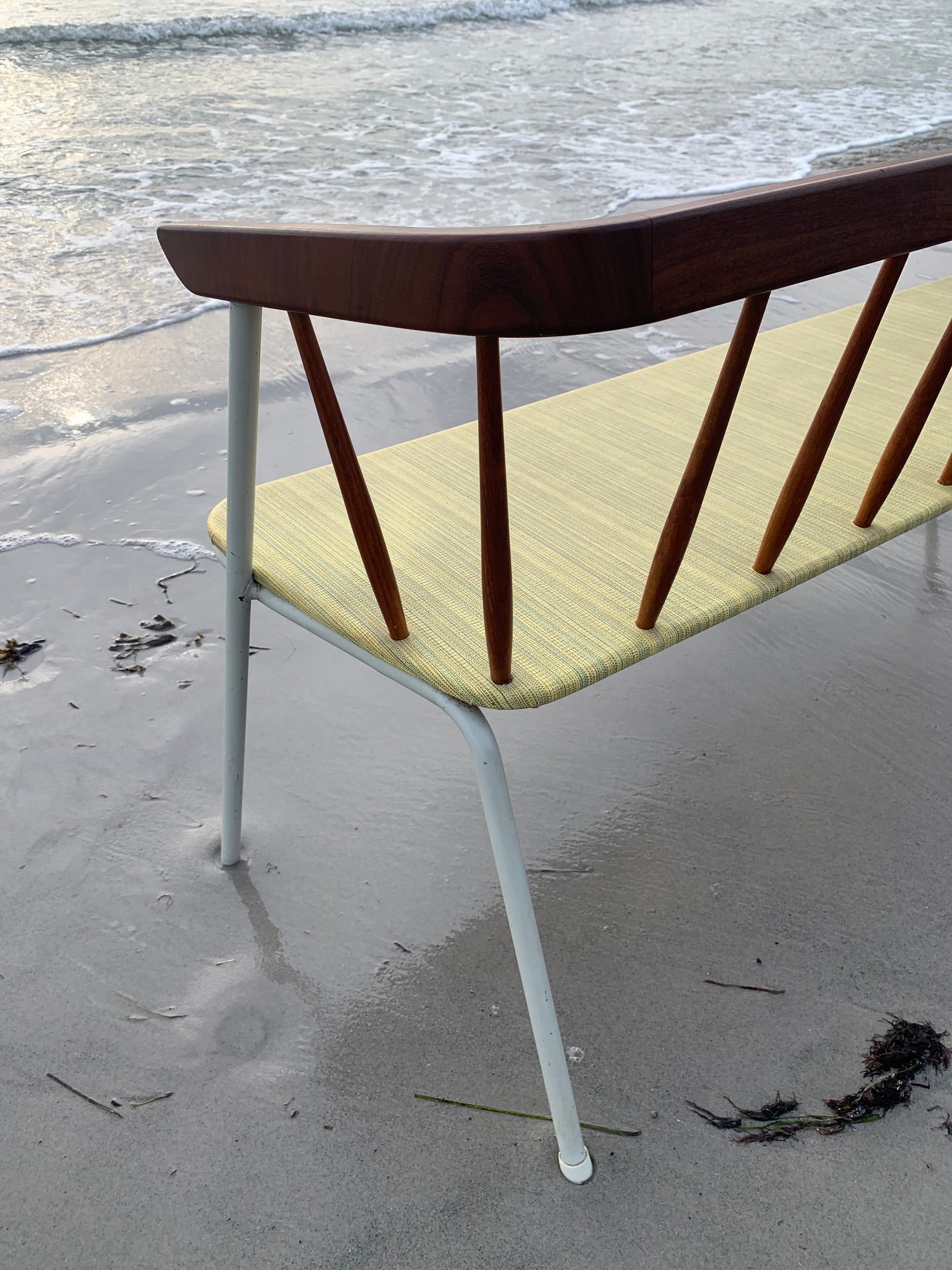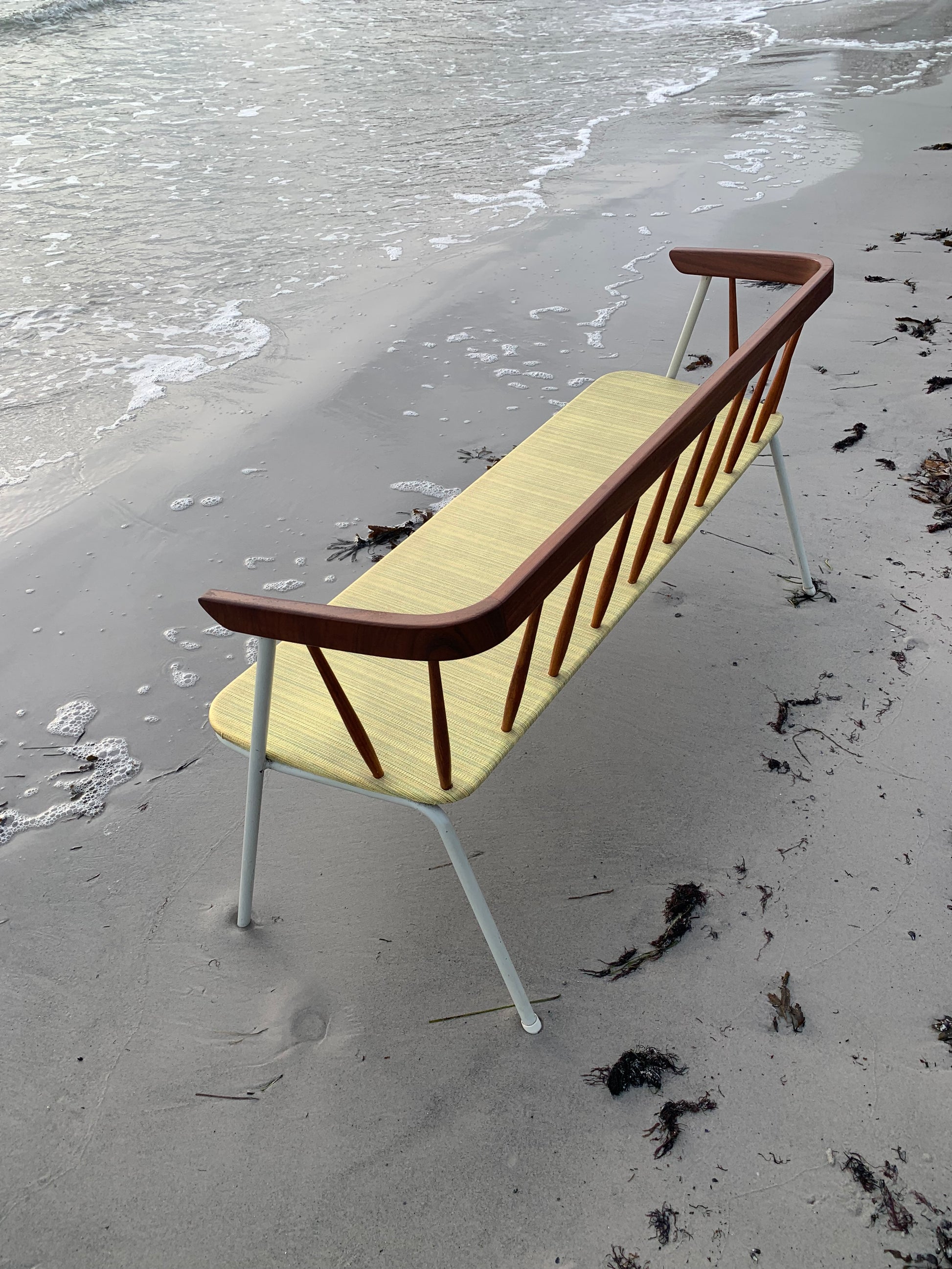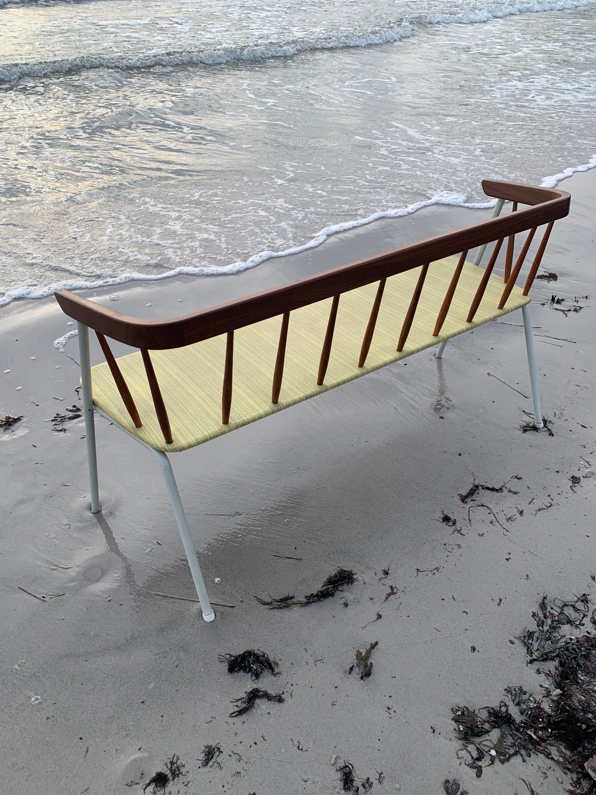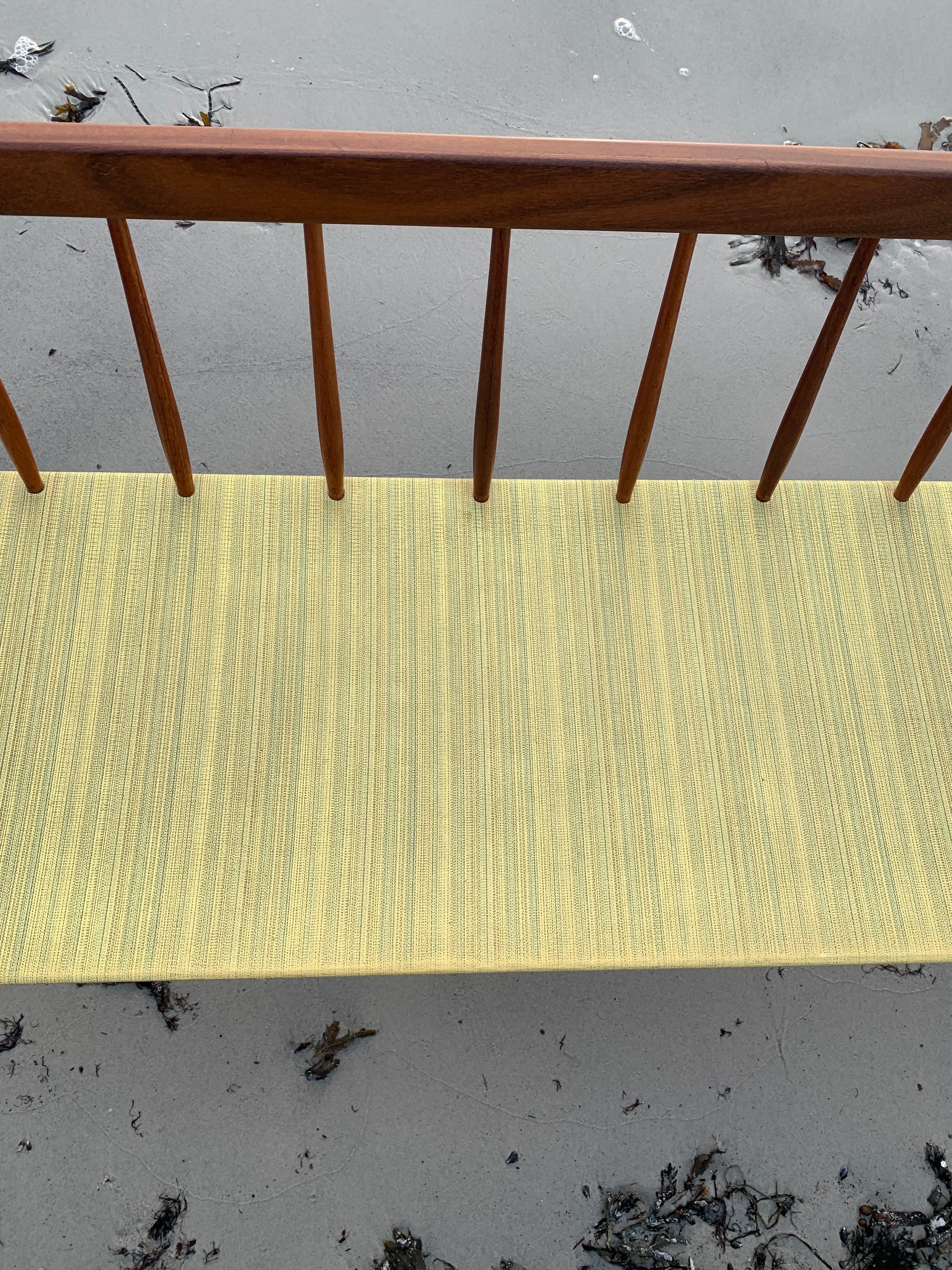 Fin liten bänk eller "ribbsoffa" tillverkad av en möbelsnickare i Sverige. Titta bara på den ribbade ryggstödet i trä, den har några väldigt fina hantverksdetaljer. Detta är en fin vintagemöbel med tecken på slitage men överlag både charmig och i riktigt gott vintageskick.