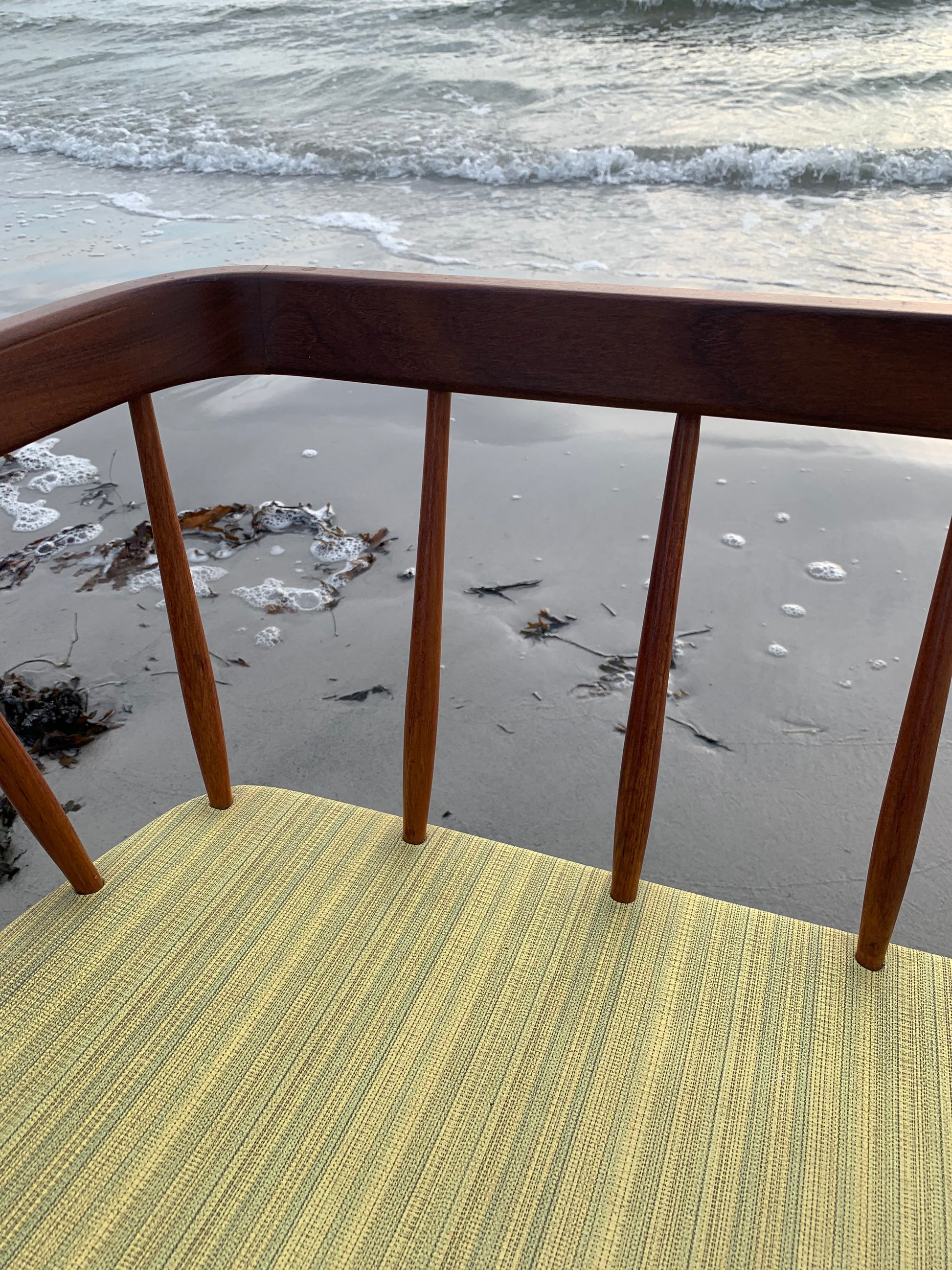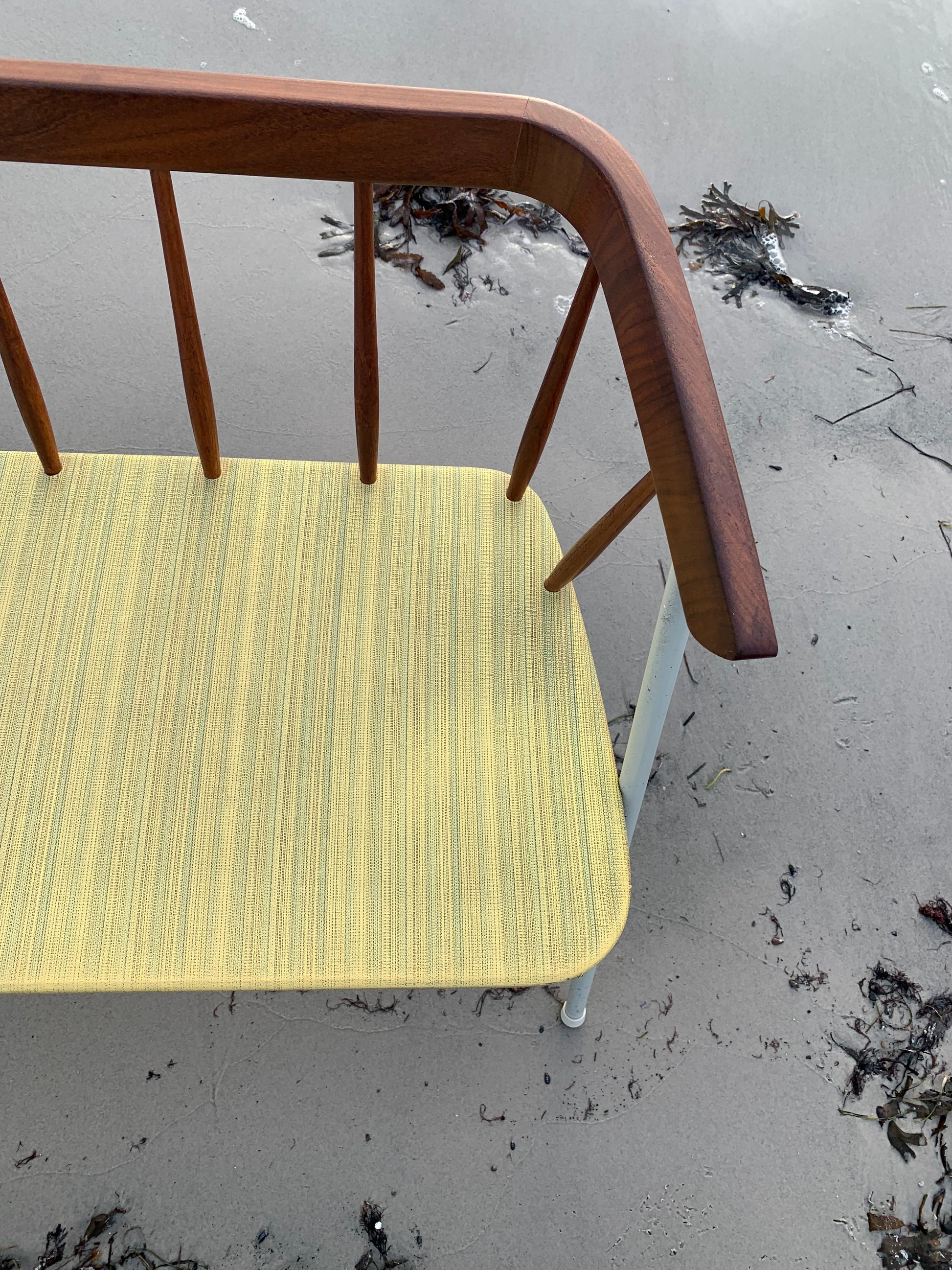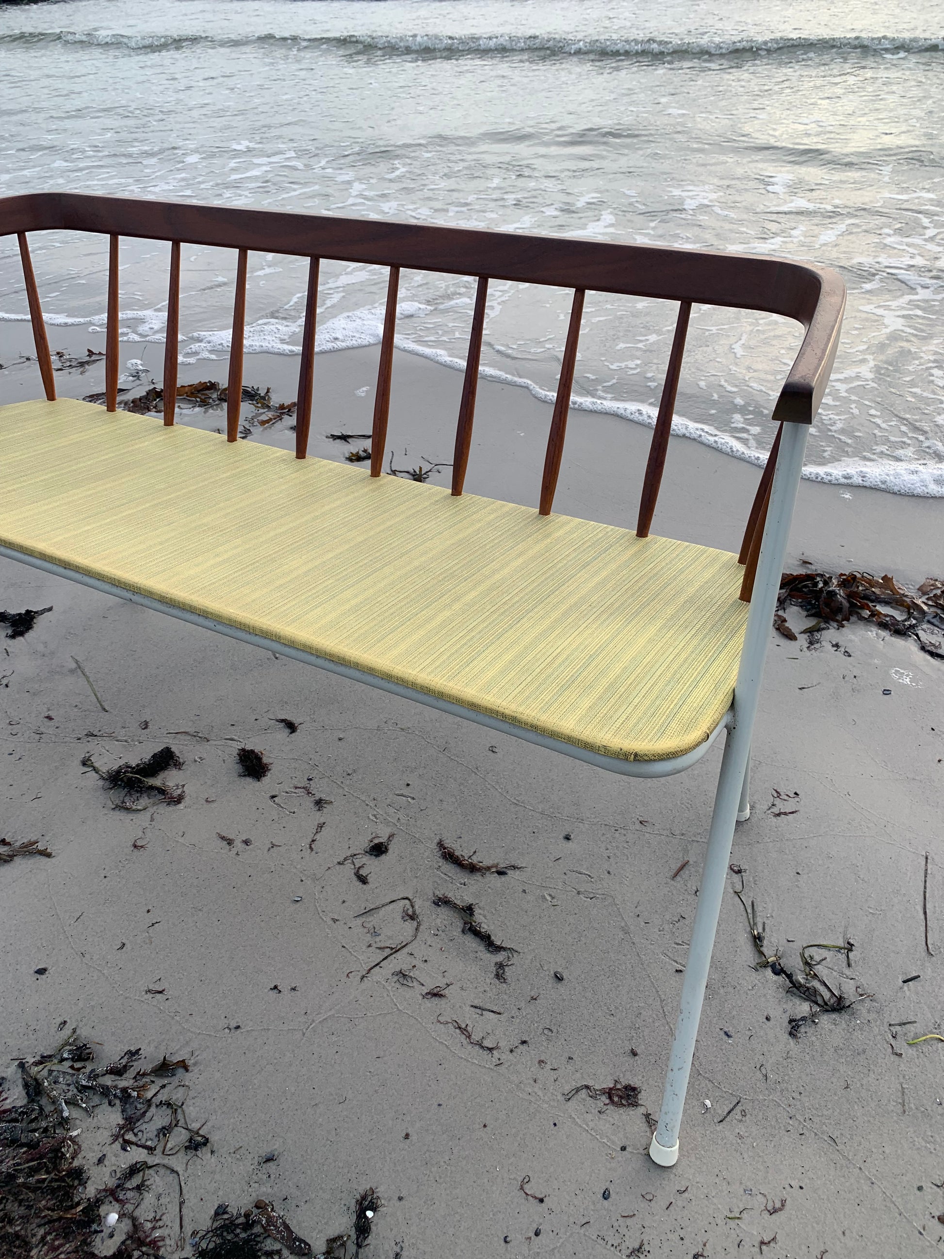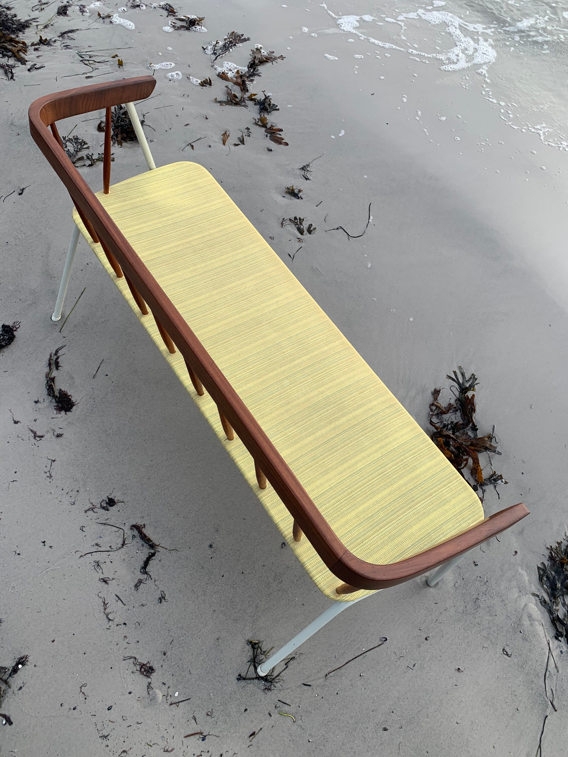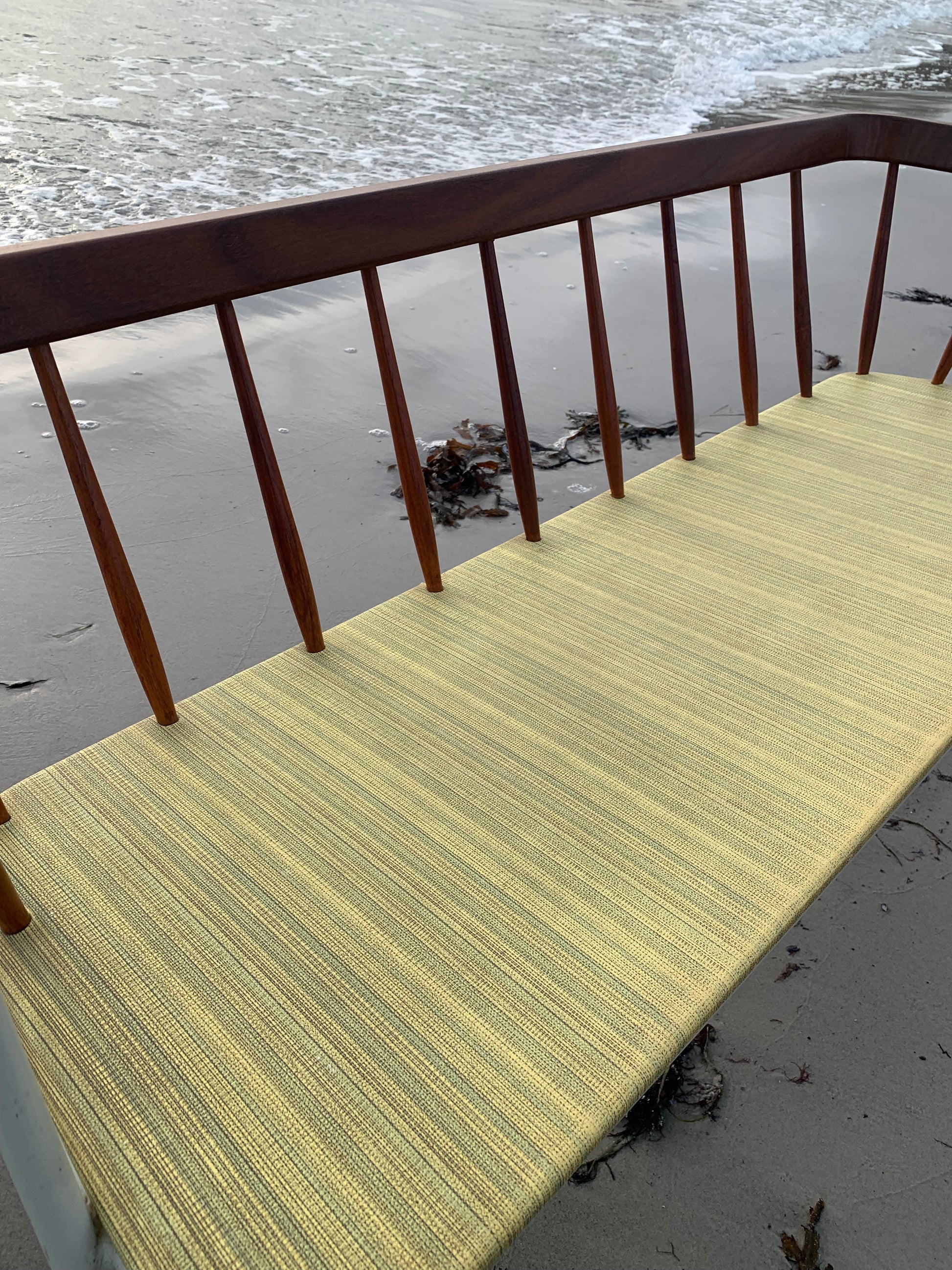 Fin liten bänk eller "ribbsoffa" tillverkad av en möbelsnickare i Sverige. Titta bara på den ribbade ryggstödet i trä, den har några väldigt fina hantverksdetaljer. Detta är en fin vintagemöbel med tecken på slitage men överlag både charmig och i riktigt gott vintageskick.