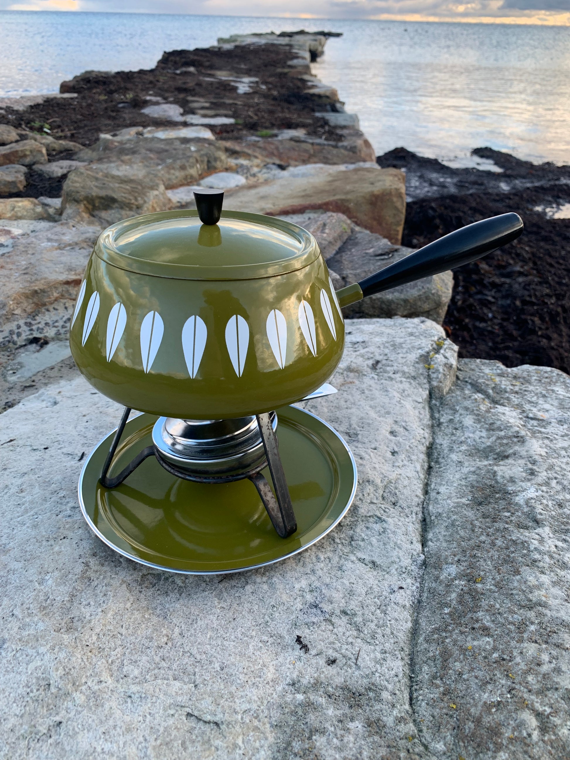 Sällsynt vackert exemplar av det klassiska Cathrineholm Lotus fondue-setet. Grytan och de andra delarna har mycket få tecken på slitage med tanke på åldern (locket har ett enda litet emaljsknäpp - se foto). Detta är verkligen handplockad återvinning när den är som bäst.