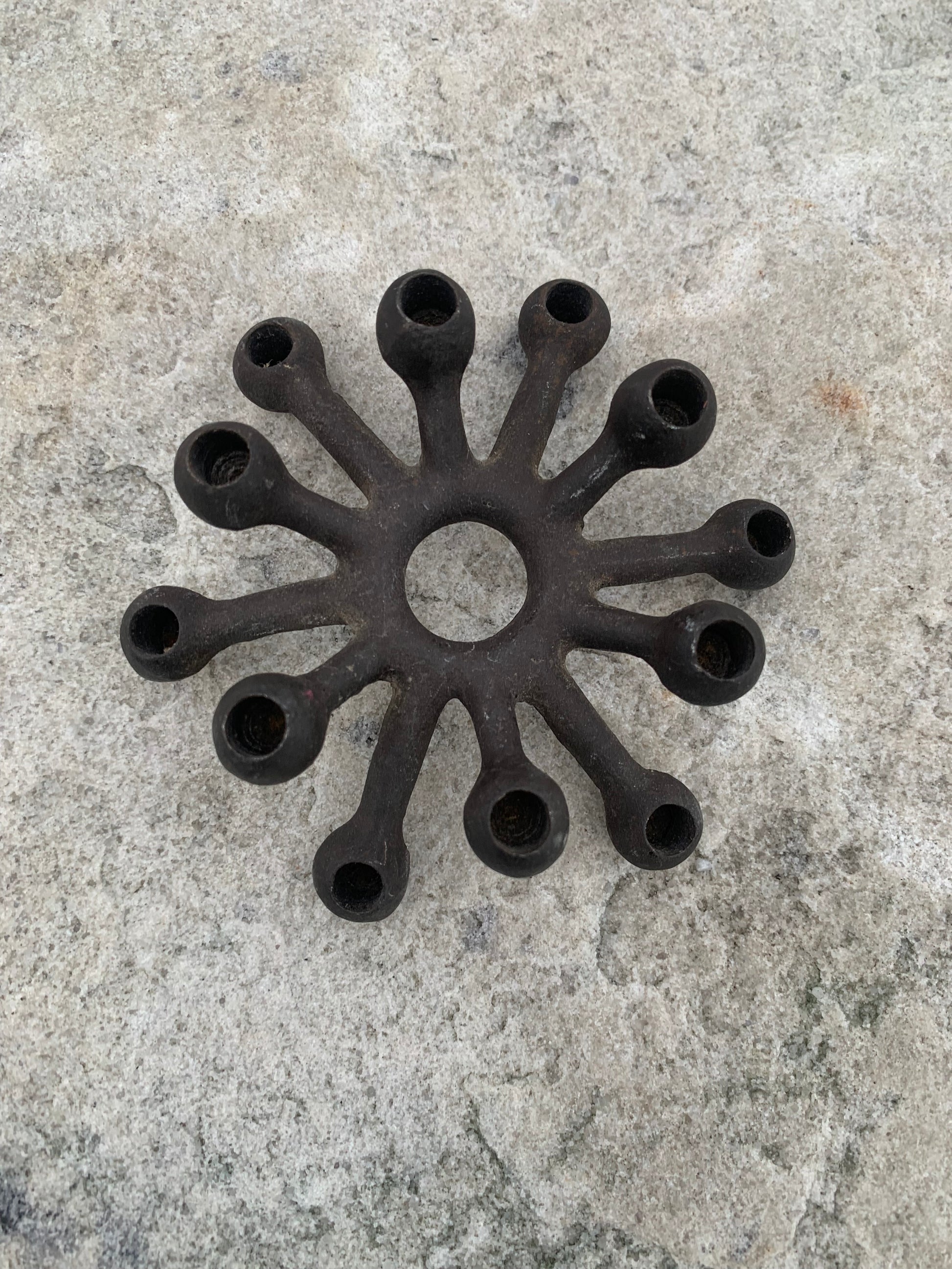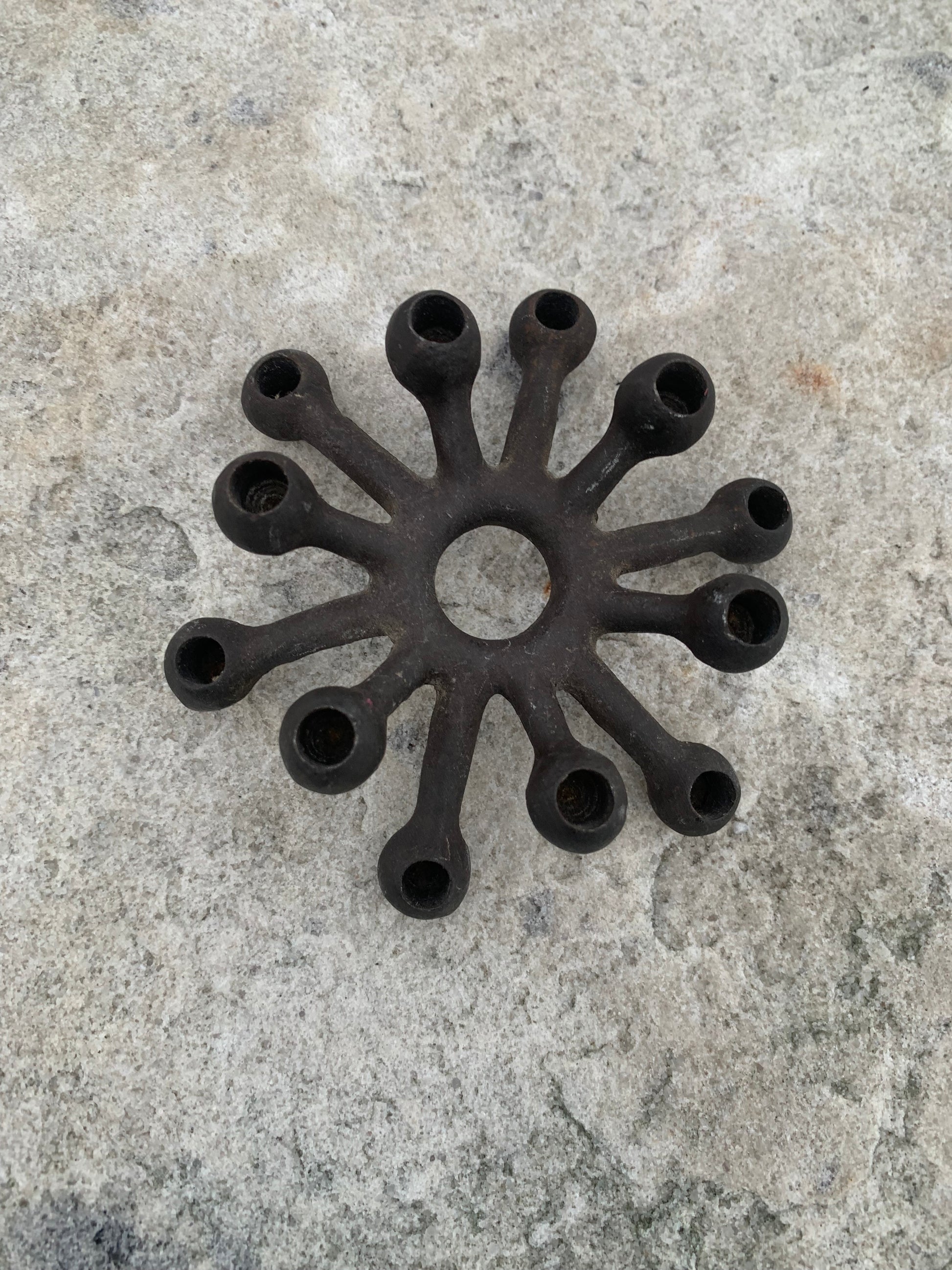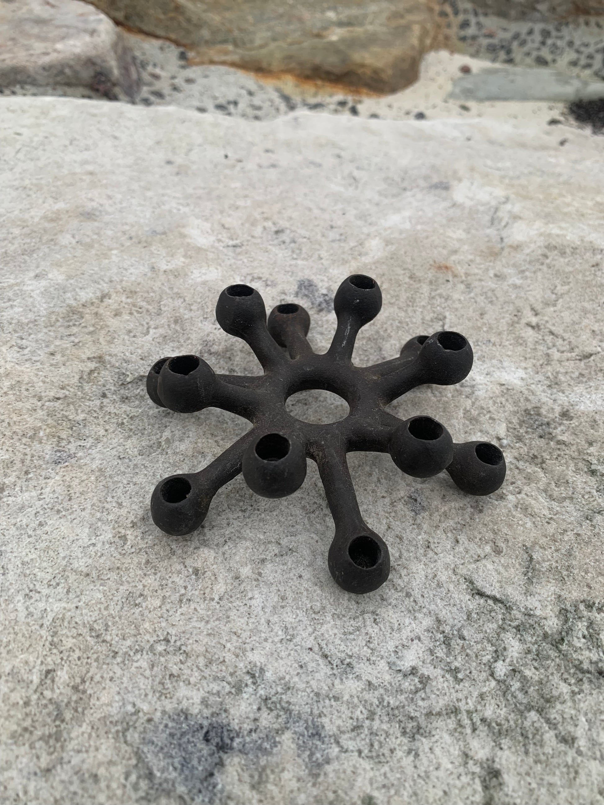 Dette er en stearinlysholder til op til 12 små lys (specielle blyant-tynde stearinlys med en diameter på 0,3 "/ 7 mm) i støbejern med en hård, sand sort finish. Med sine to holdere ligner det en edderkop i form - og dermed almindeligvis omtalt som edderkop.