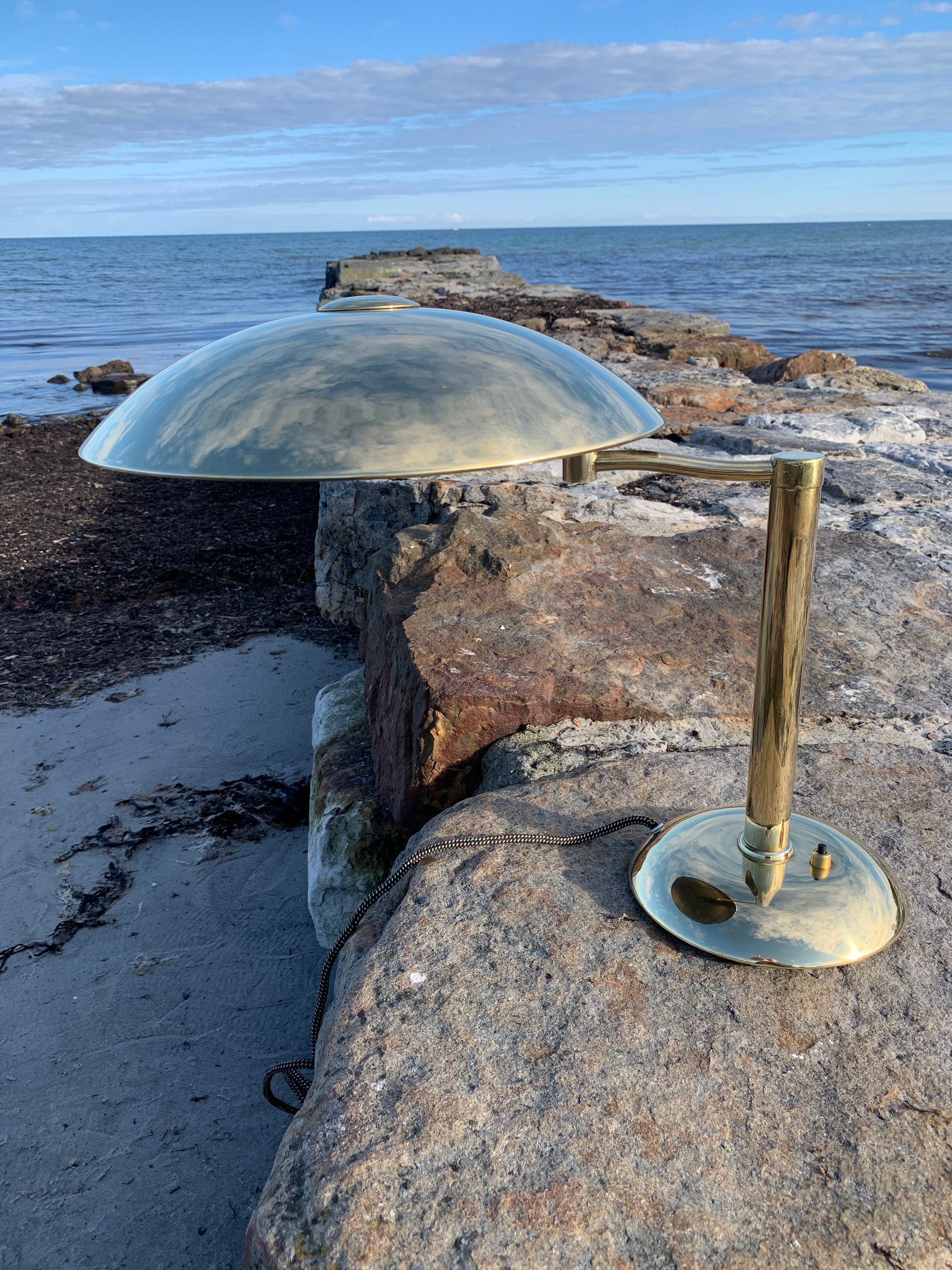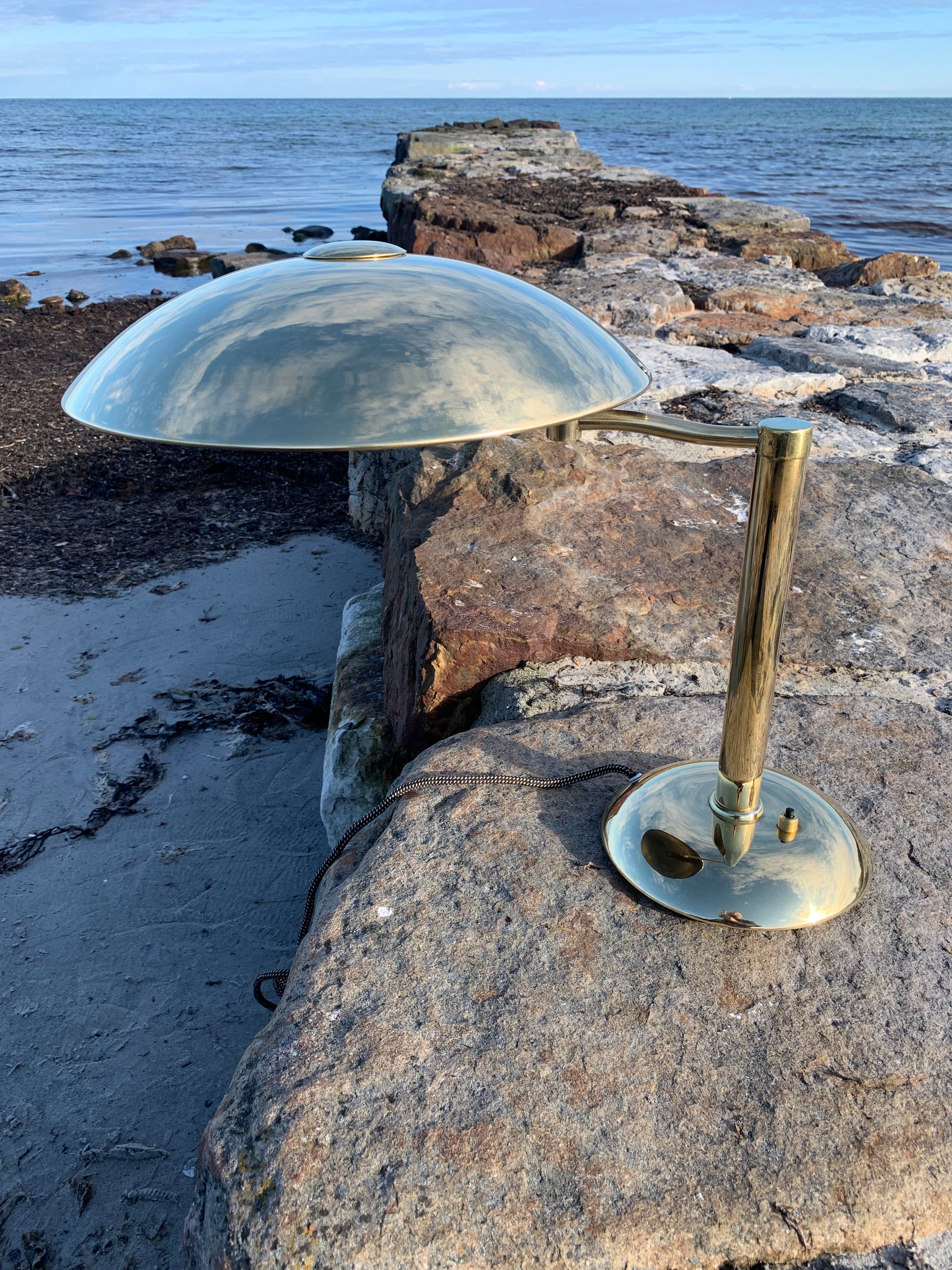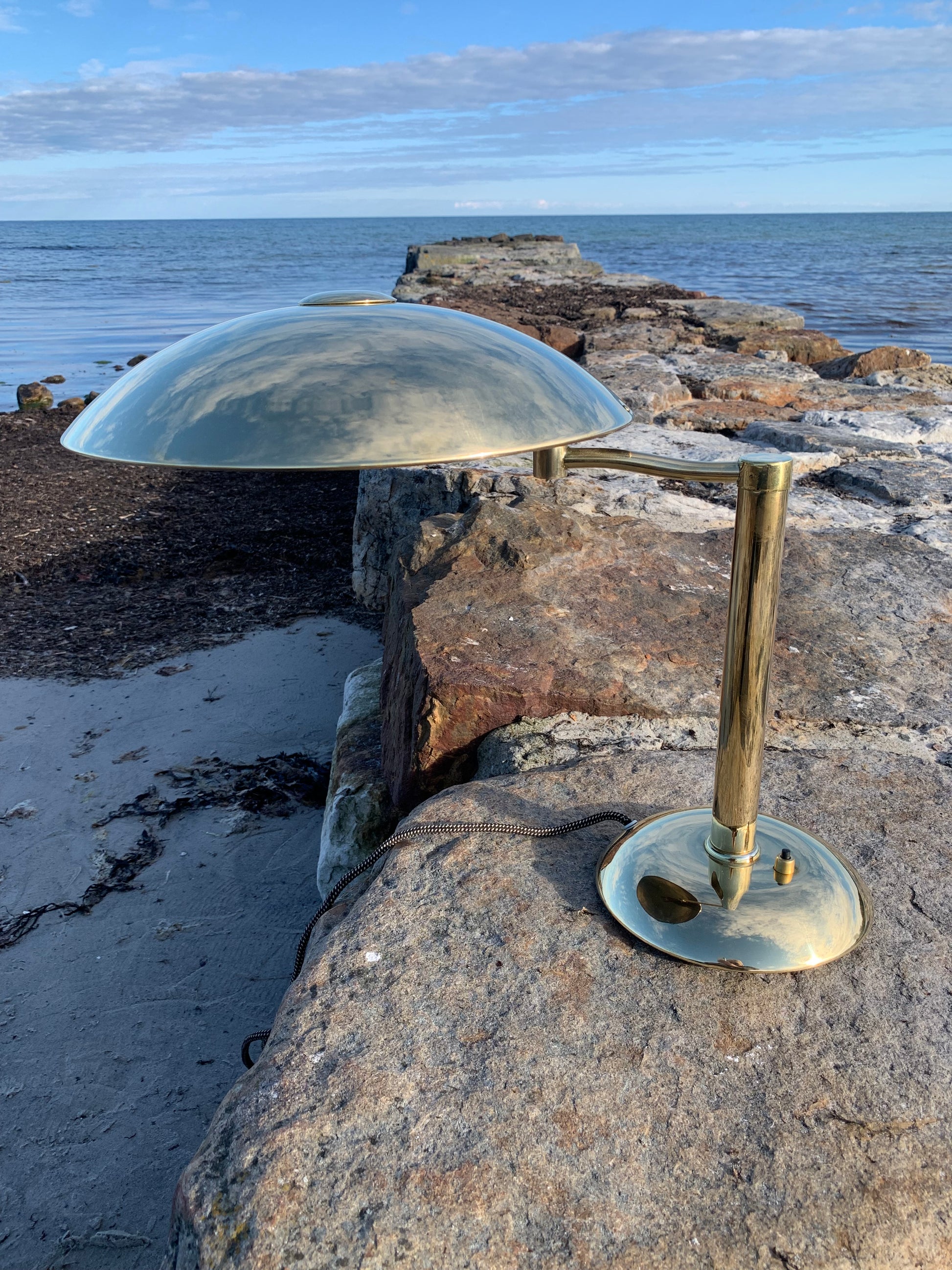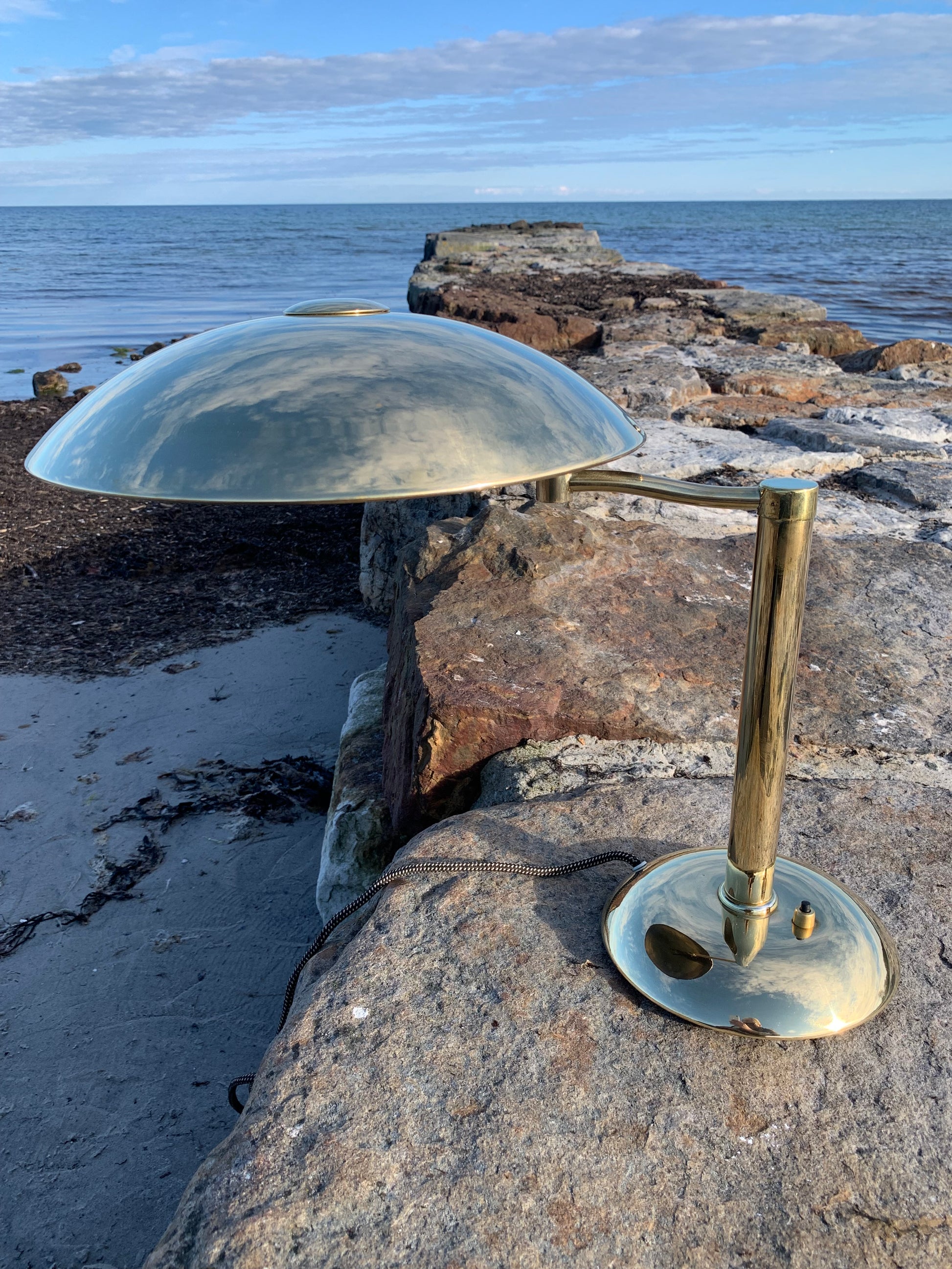 Vacker och omsorgsfullt restaurerad Egon Hillebrand vintagelampa i mässing. Lampan har en riktigt fin detalj i form av en svängarm. Detta kan göra att lampan förändrar hela sitt uttryck. Lampan framstår som vacker och med vissa tecken på slitage, vilka är minimala med tanke på dess ålder. Skicket är exceptionellt gott och lampan är nydragen.