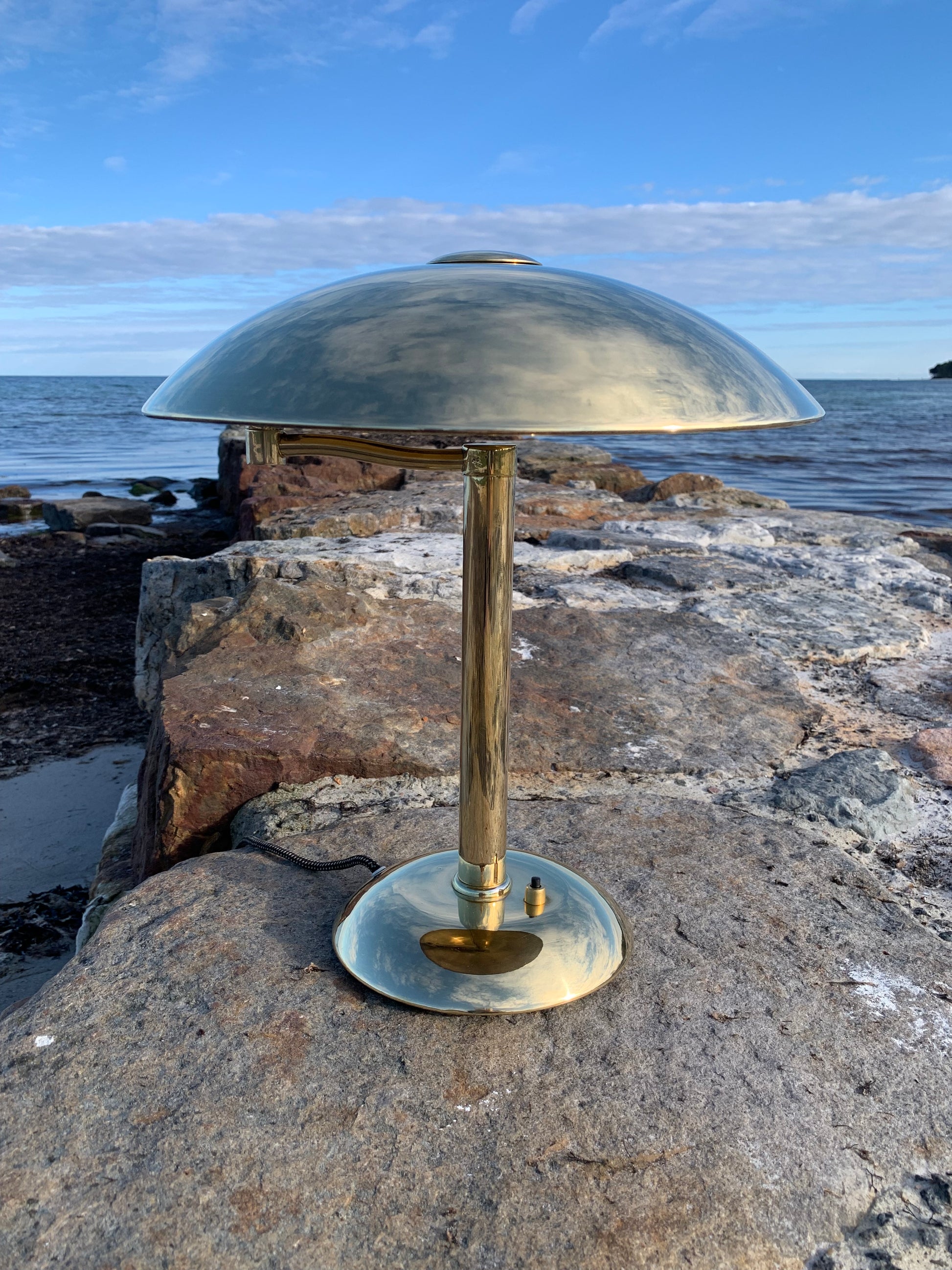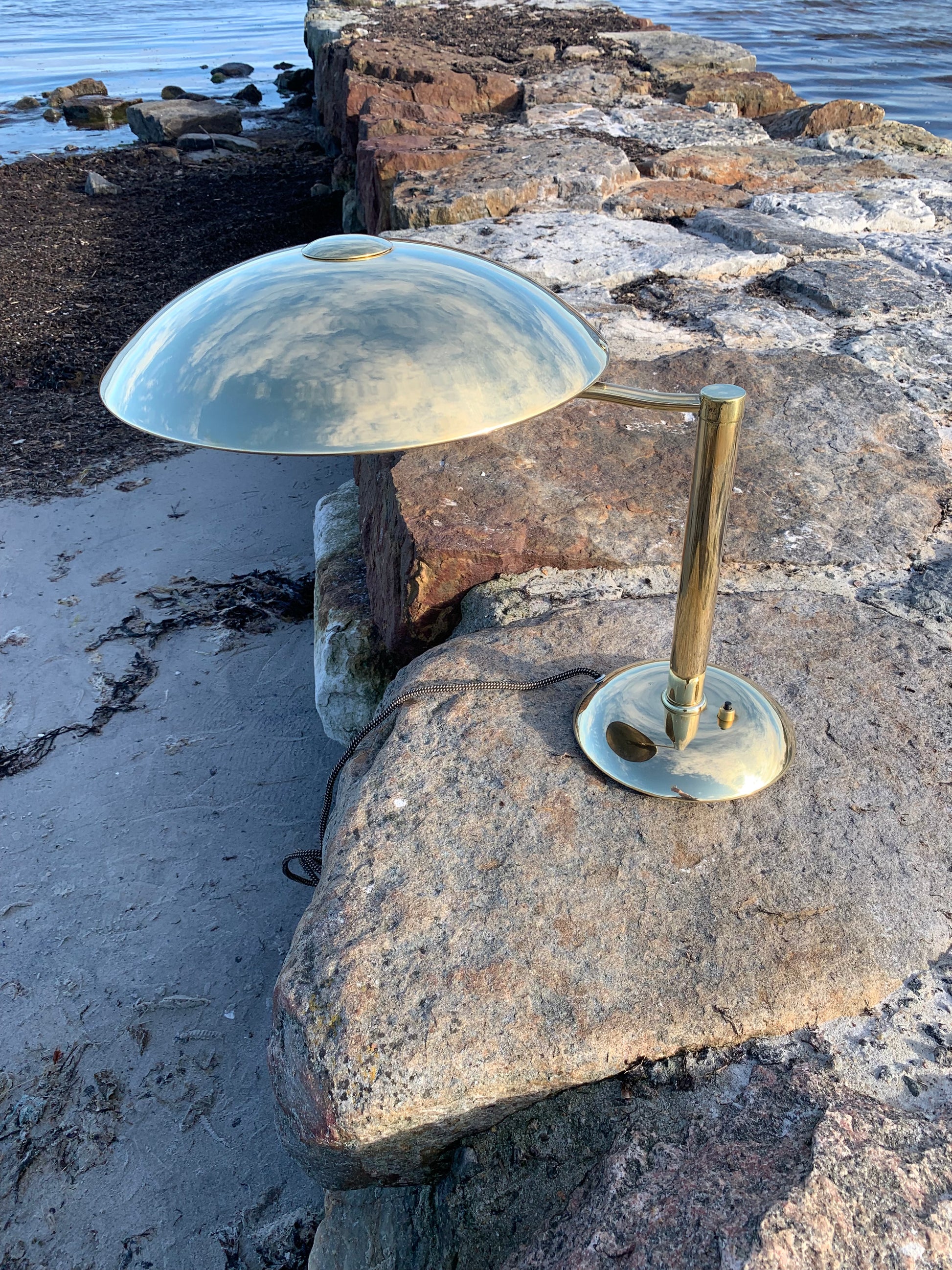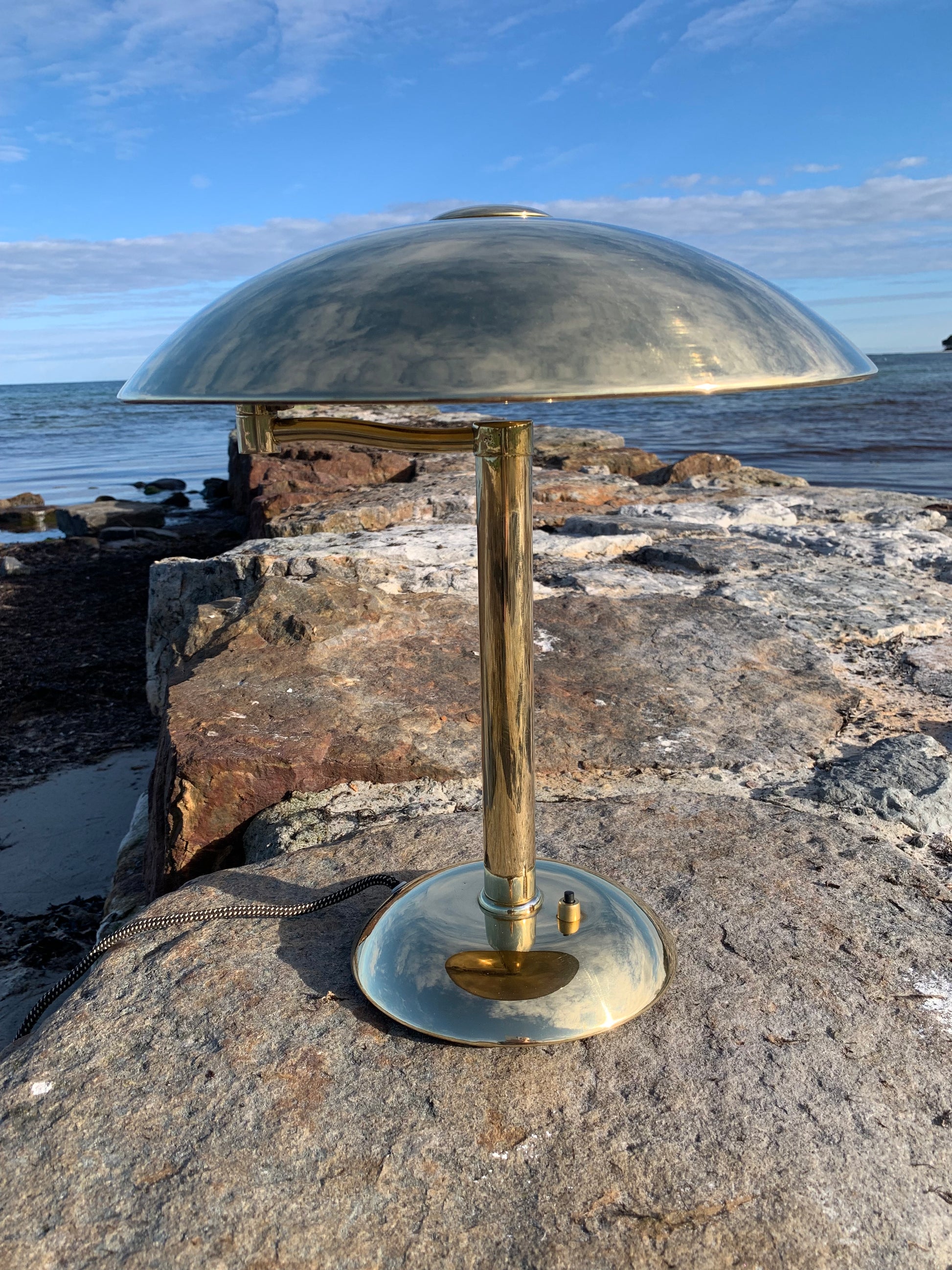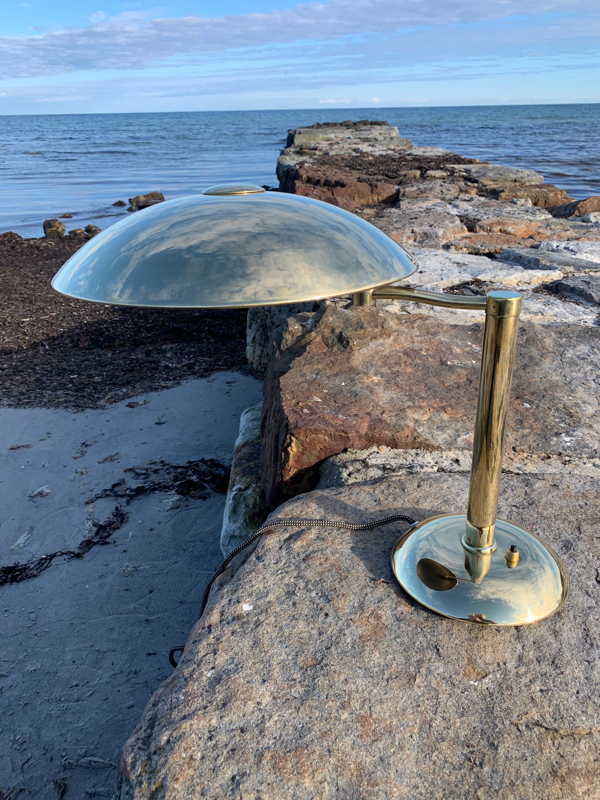 Vacker och omsorgsfullt restaurerad Egon Hillebrand vintagelampa i mässing. Lampan har en riktigt fin detalj i form av en svängarm. Detta kan göra att lampan förändrar hela sitt uttryck. Lampan framstår som vacker och med vissa tecken på slitage, vilka är minimala med tanke på dess ålder. Skicket är exceptionellt gott och lampan är nydragen.
