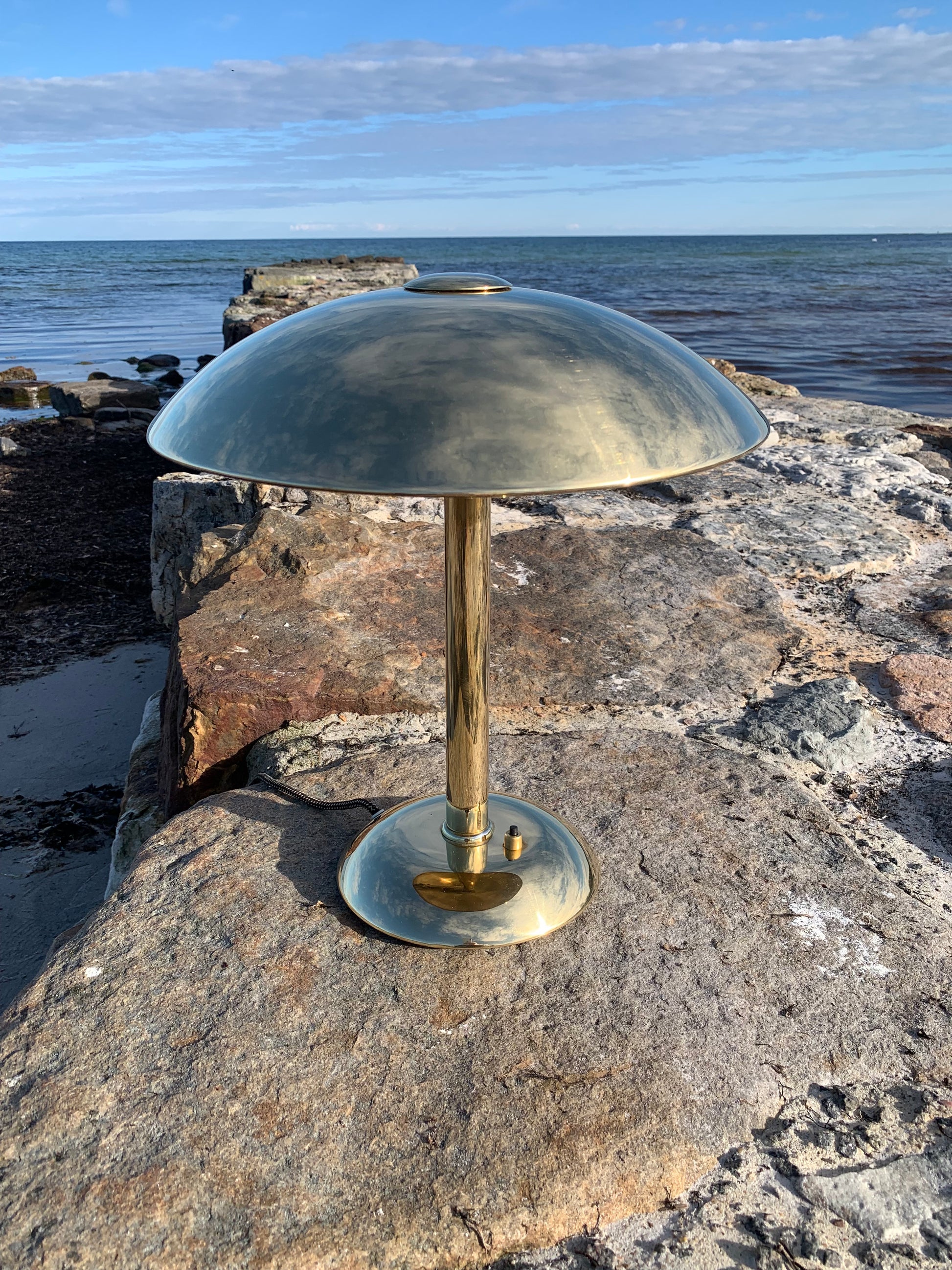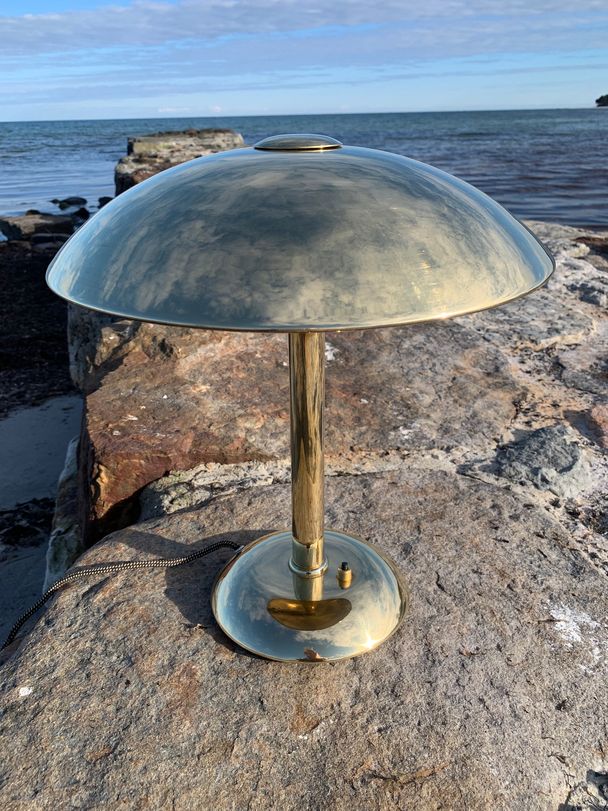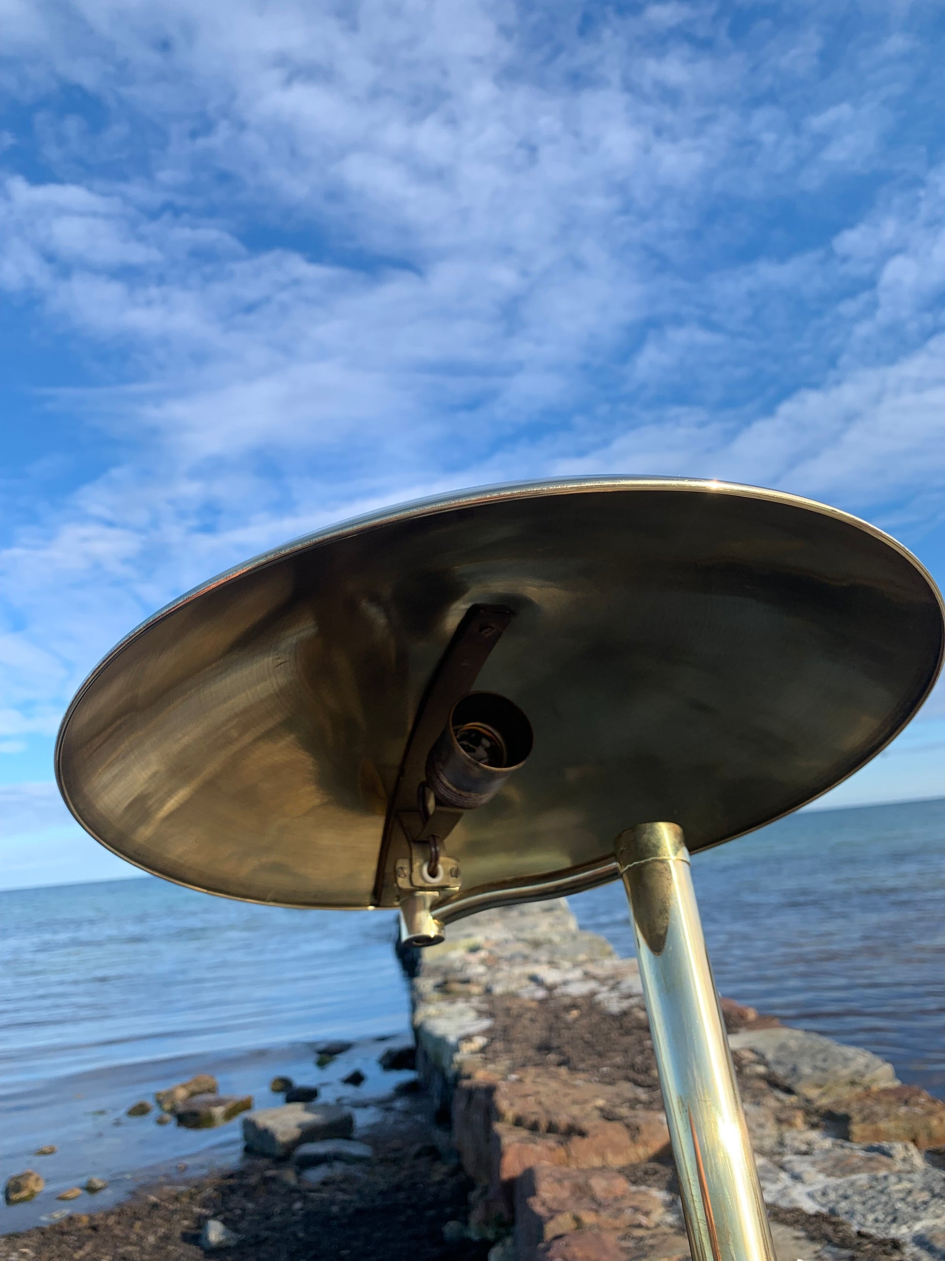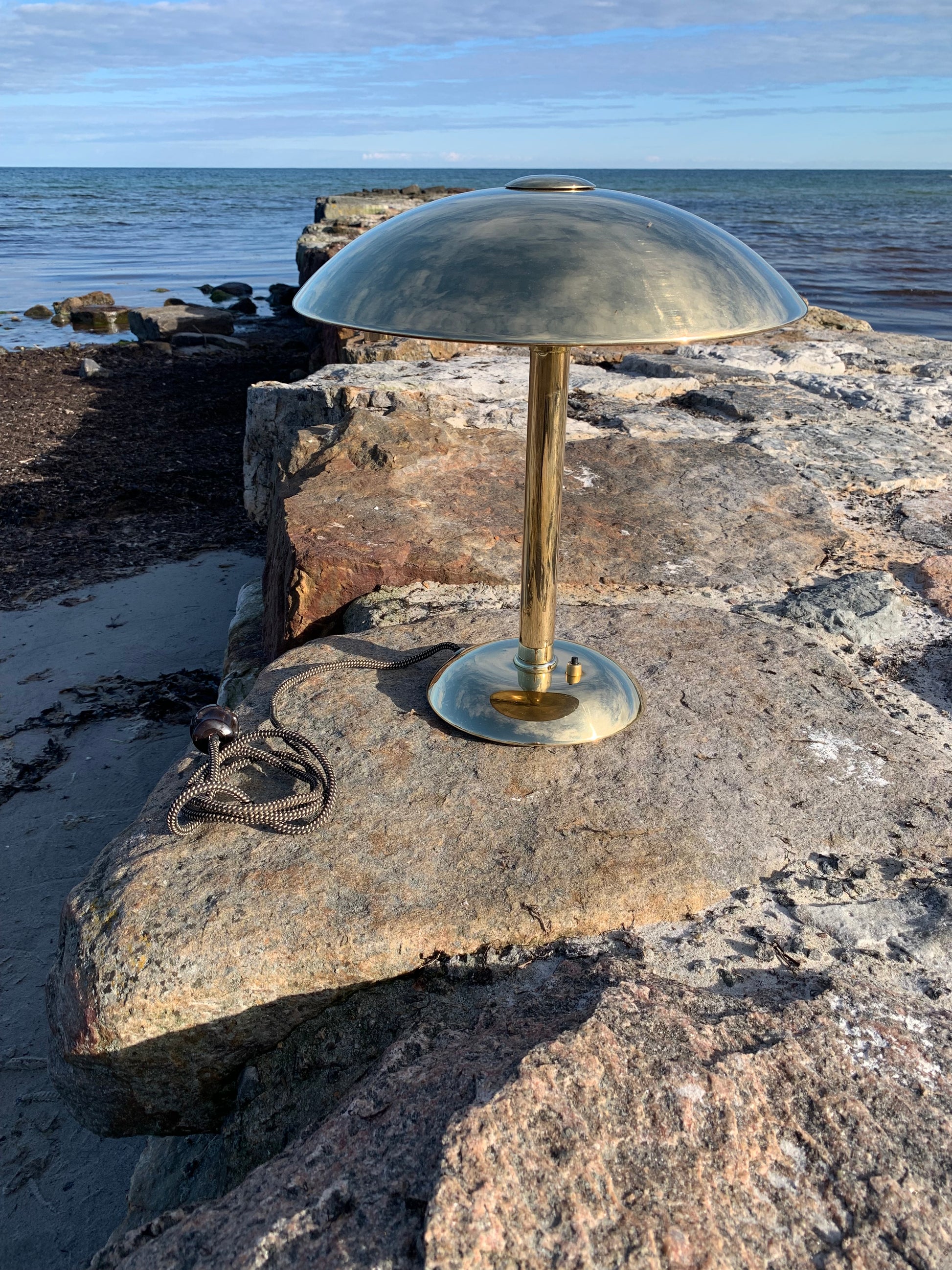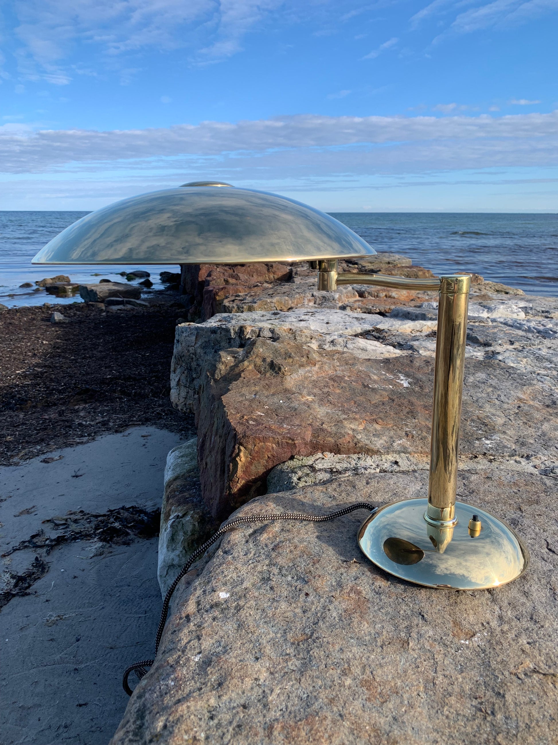 Vacker och omsorgsfullt restaurerad Egon Hillebrand vintagelampa i mässing. Lampan har en riktigt fin detalj i form av en svängarm. Detta kan göra att lampan förändrar hela sitt uttryck. Lampan framstår som vacker och med vissa tecken på slitage, vilka är minimala med tanke på dess ålder. Skicket är exceptionellt gott och lampan är nydragen.