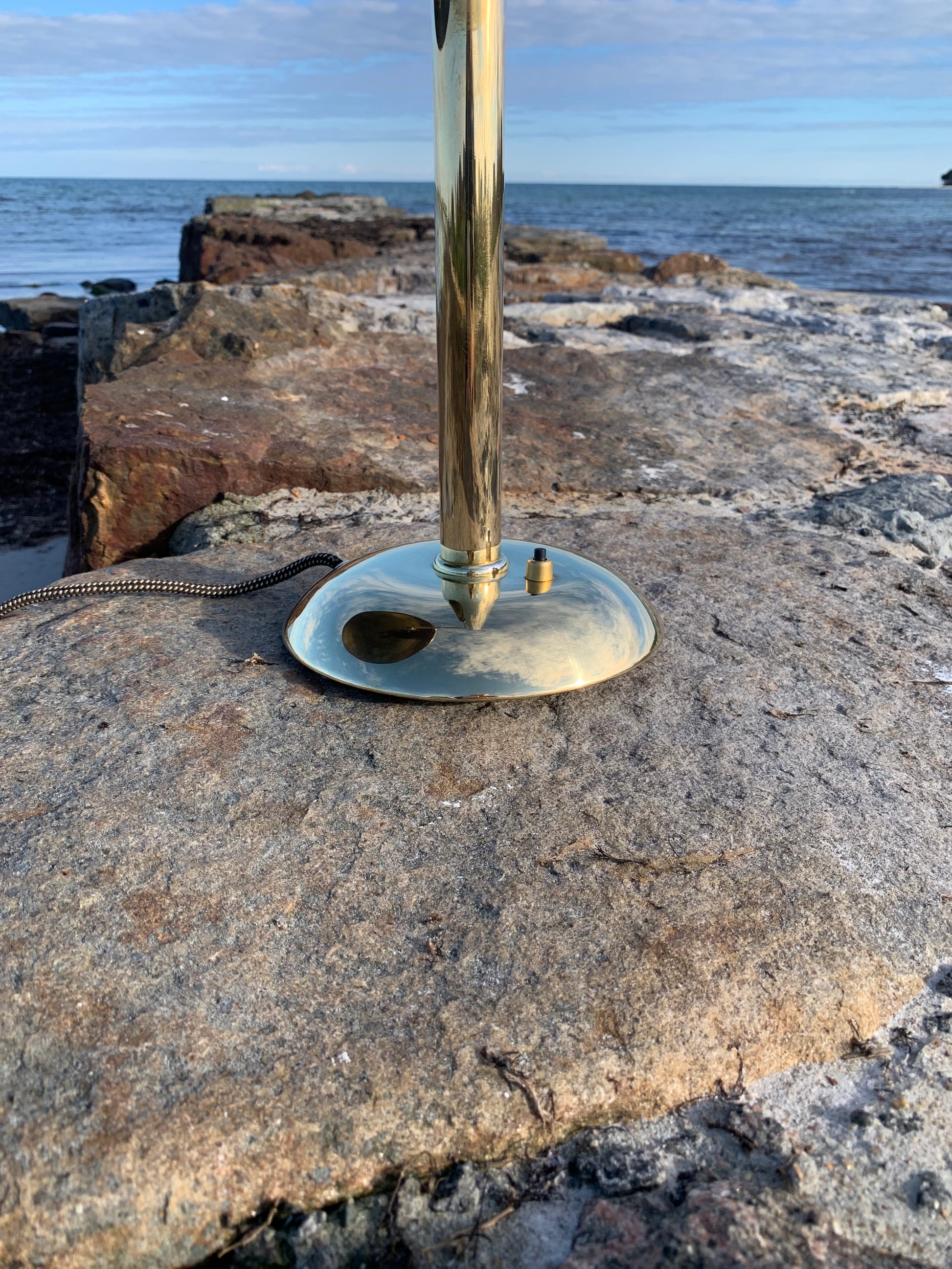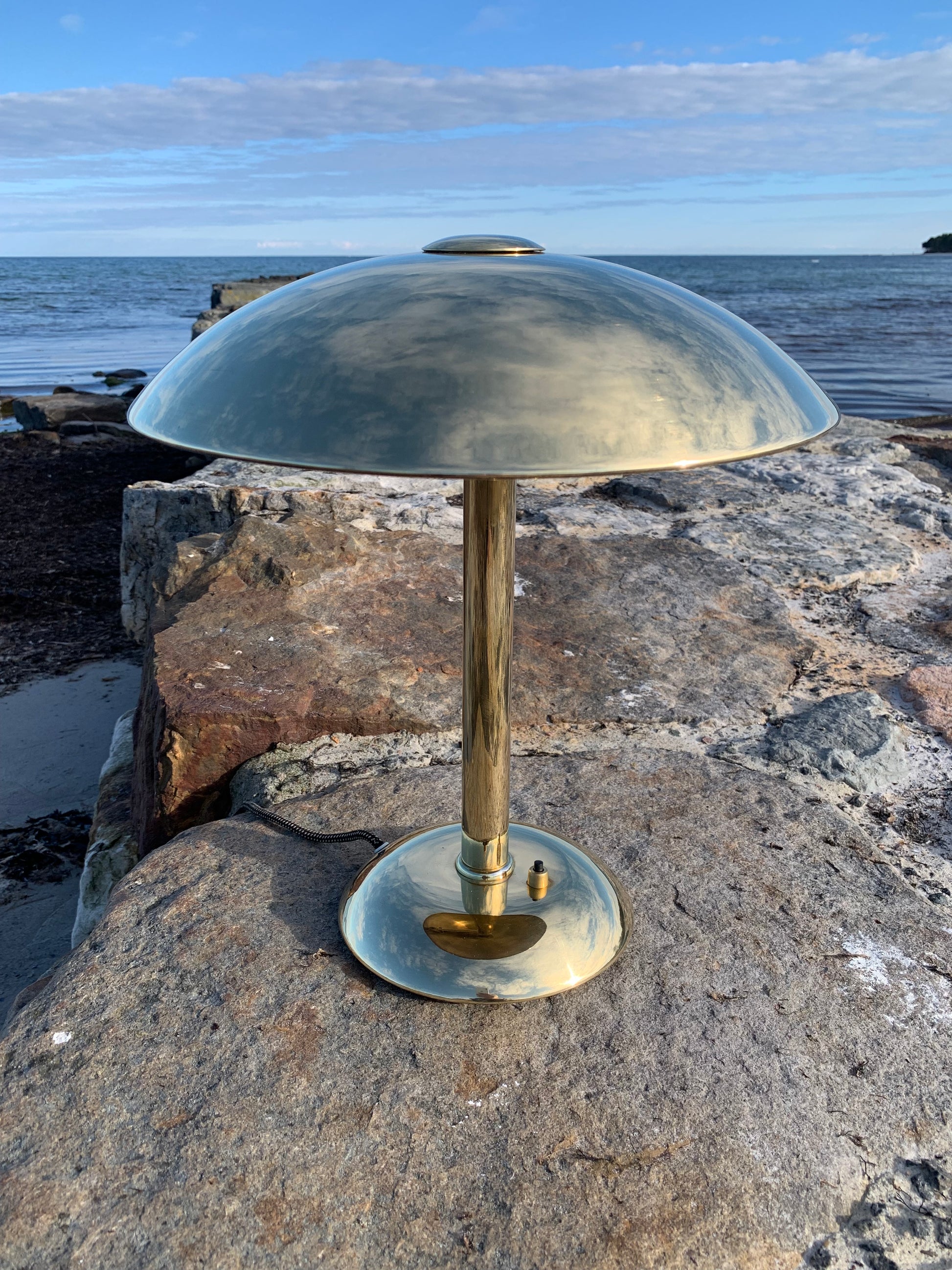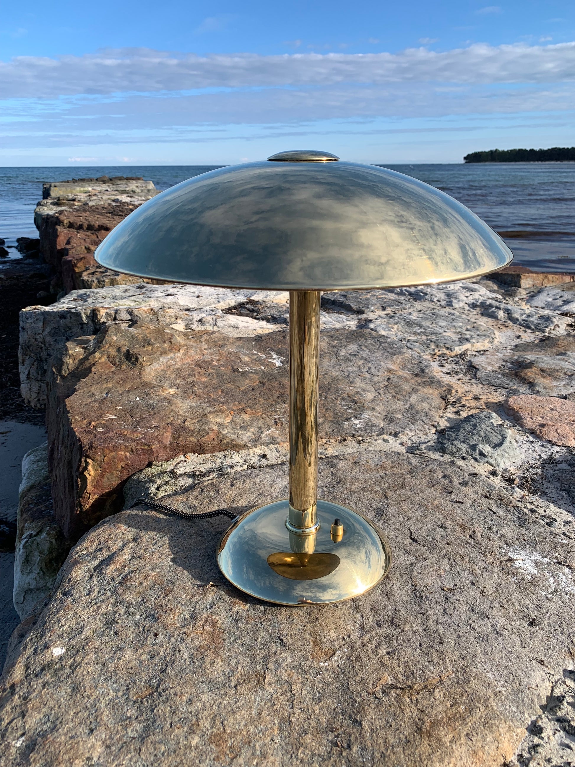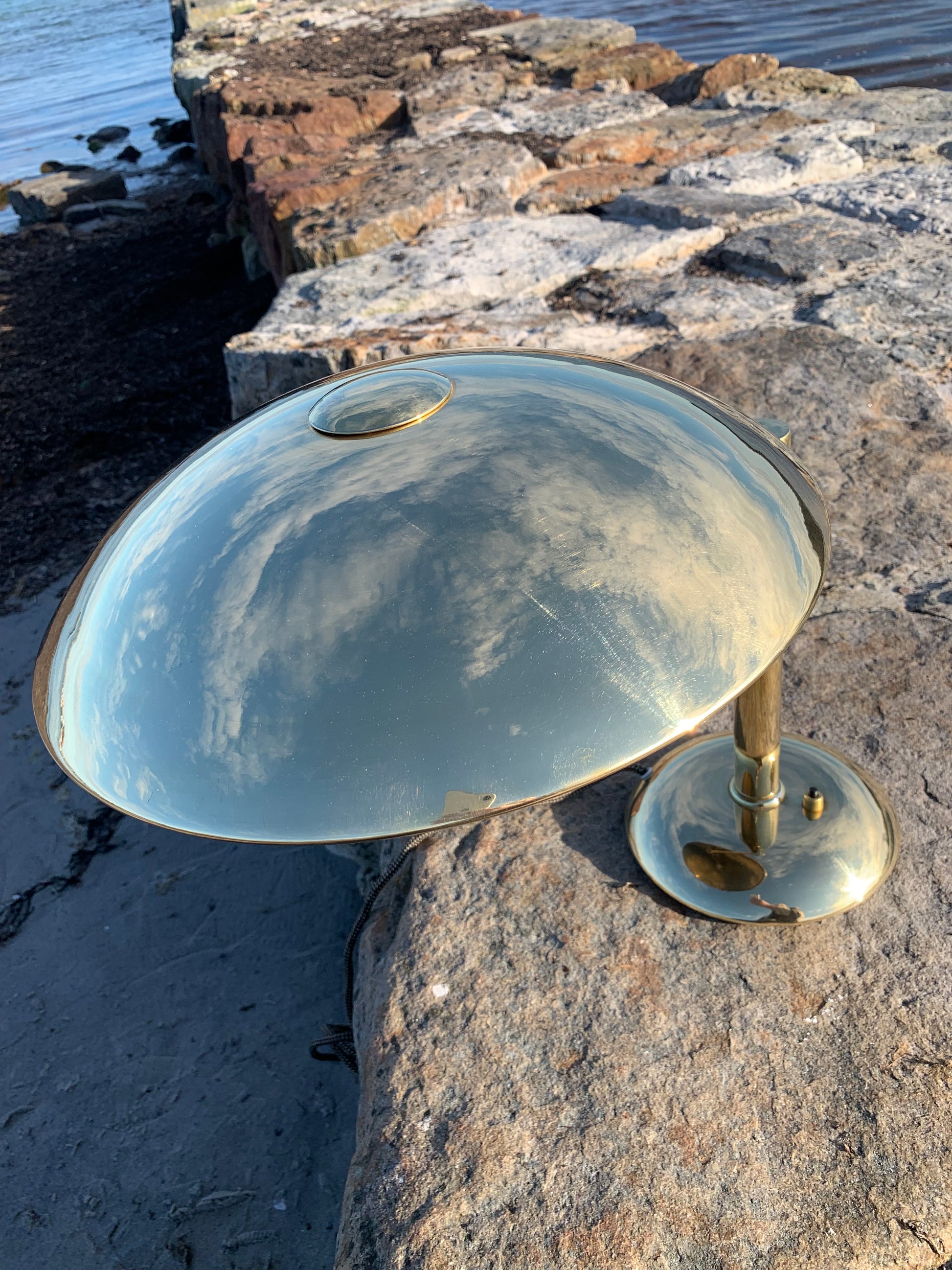 Vacker och omsorgsfullt restaurerad Egon Hillebrand vintagelampa i mässing. Lampan har en riktigt fin detalj i form av en svängarm. Detta kan göra att lampan förändrar hela sitt uttryck. Lampan framstår som vacker och med vissa tecken på slitage, vilka är minimala med tanke på dess ålder. Skicket är exceptionellt gott och lampan är nydragen.