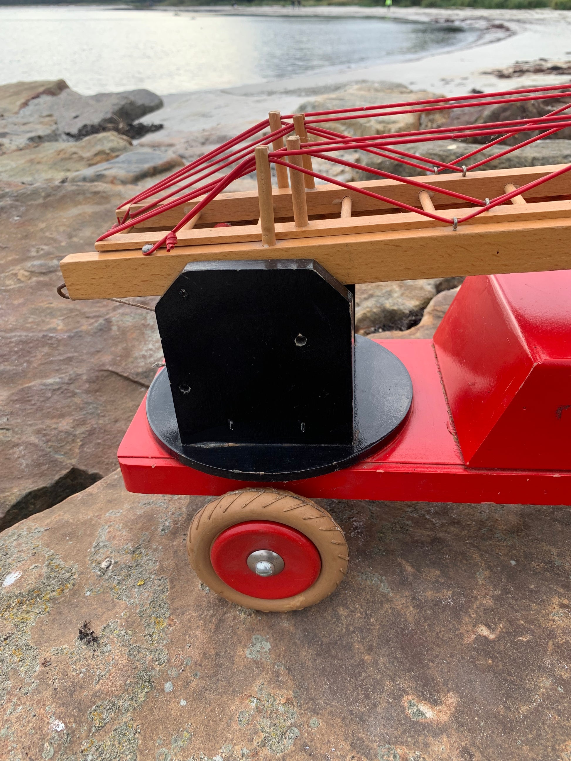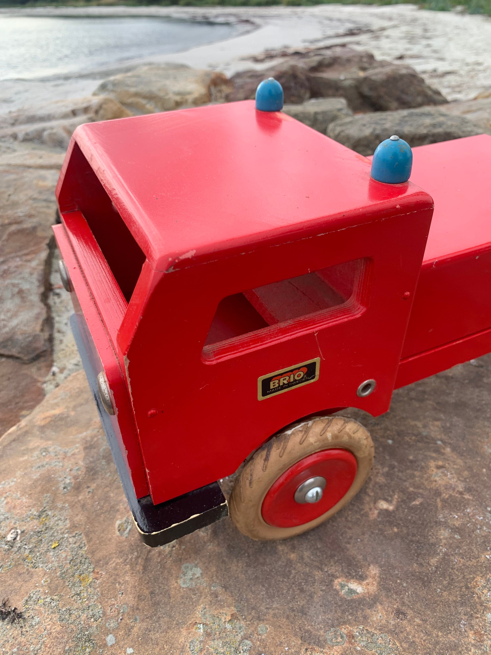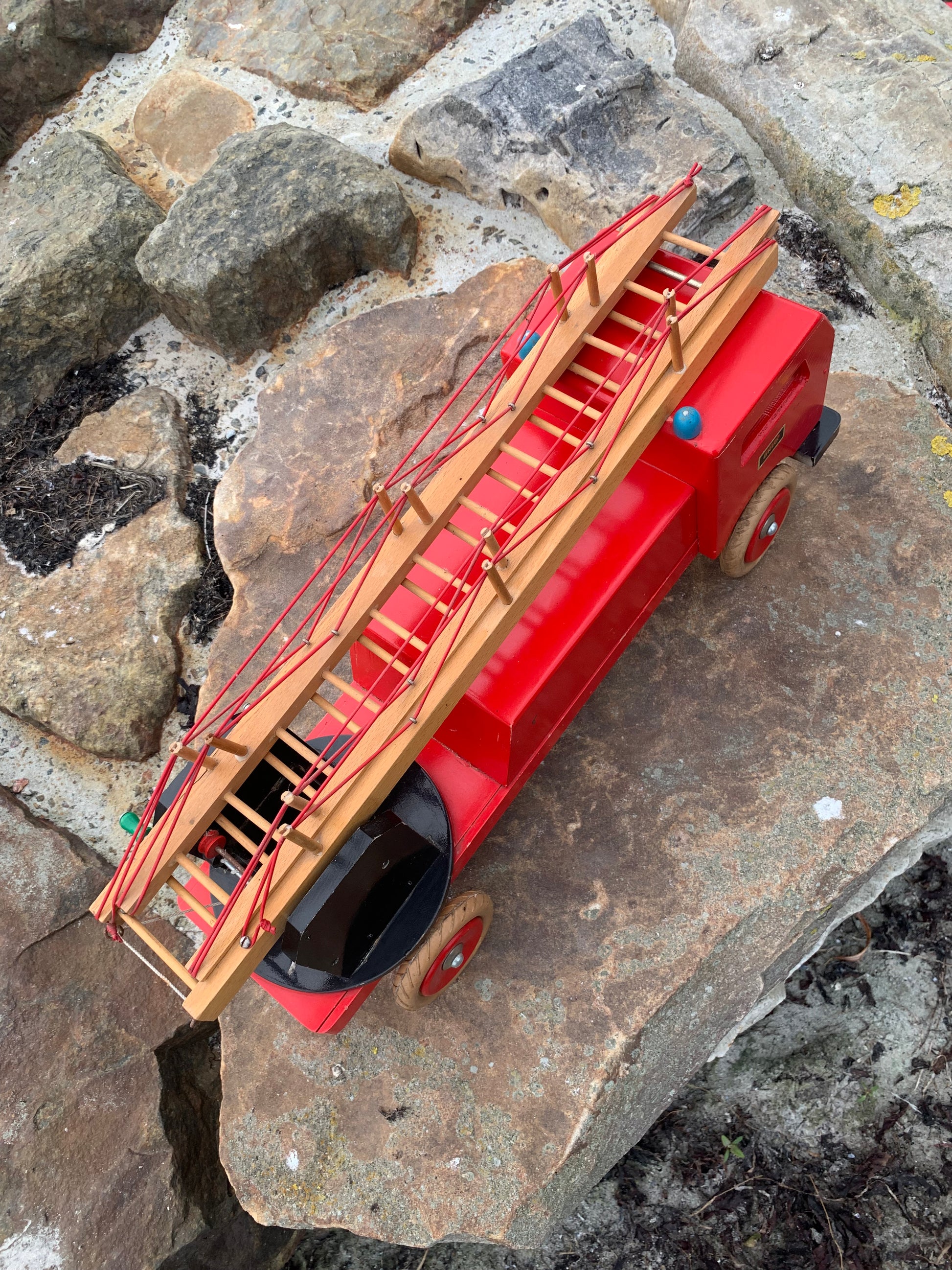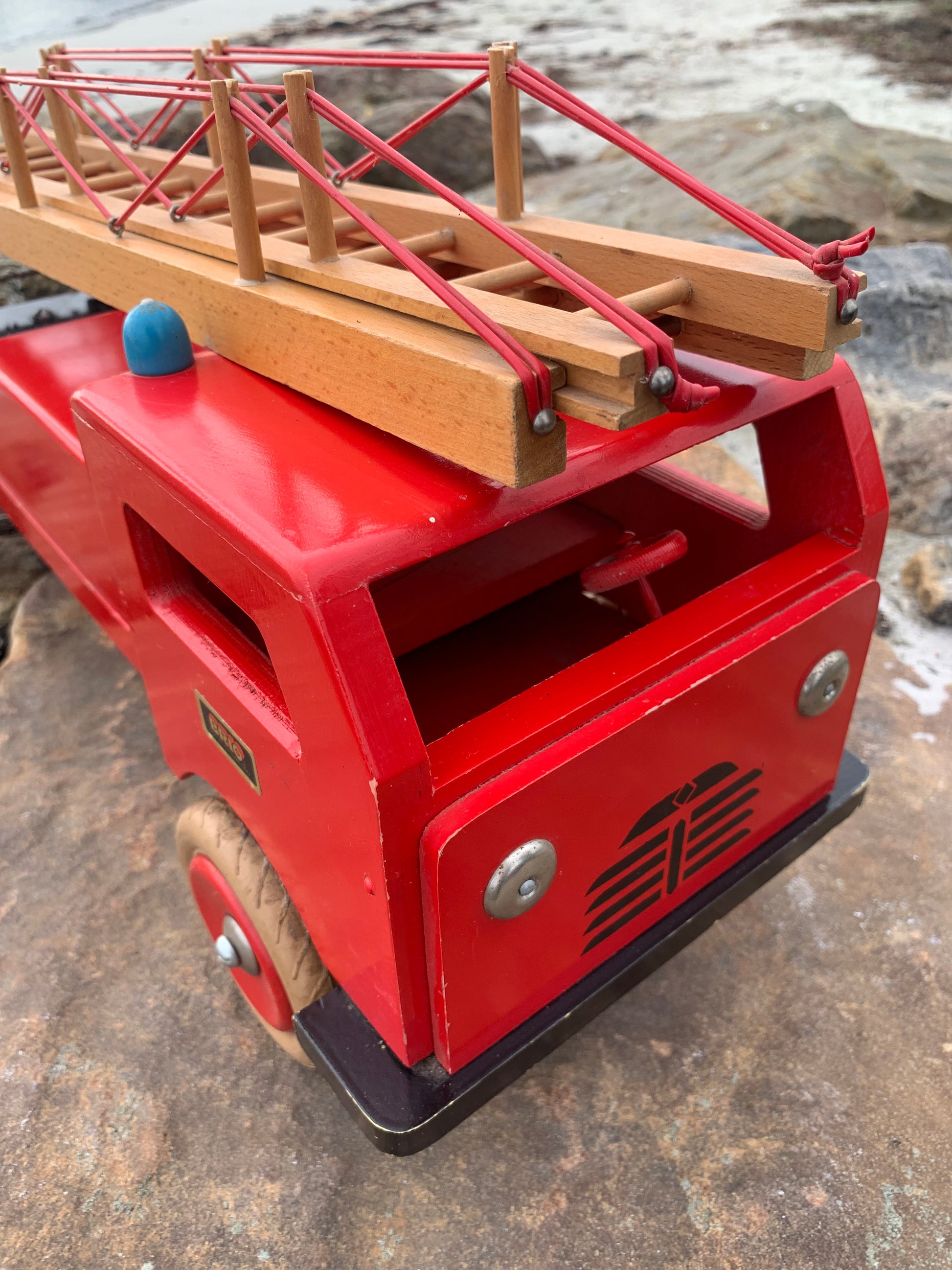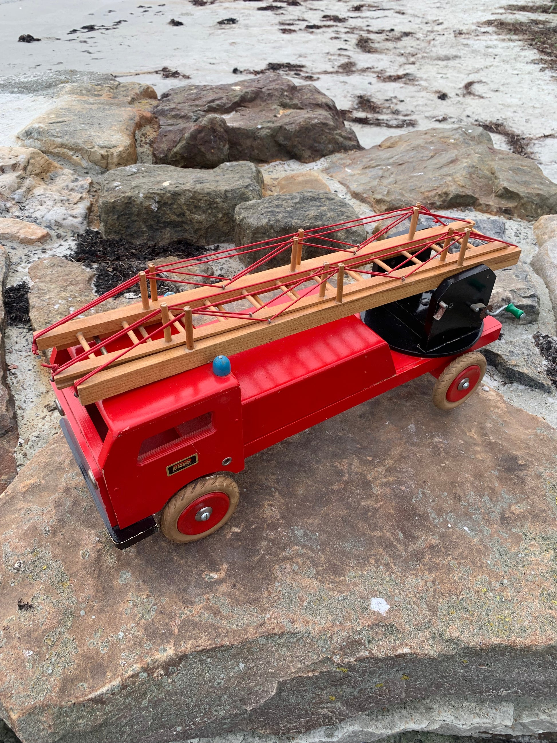 Vacker och stor gammal röd BRIO brandbil funnen och köpt från en samlare som berättade att den troligen var från 1950-60-talet. Skicket är inte helt perfekt, men med tanke på åldern är den mycket bra.