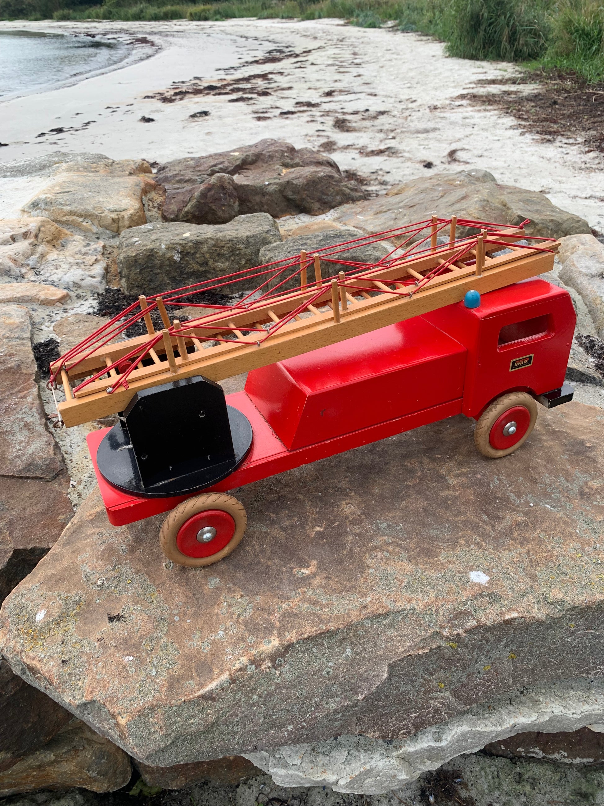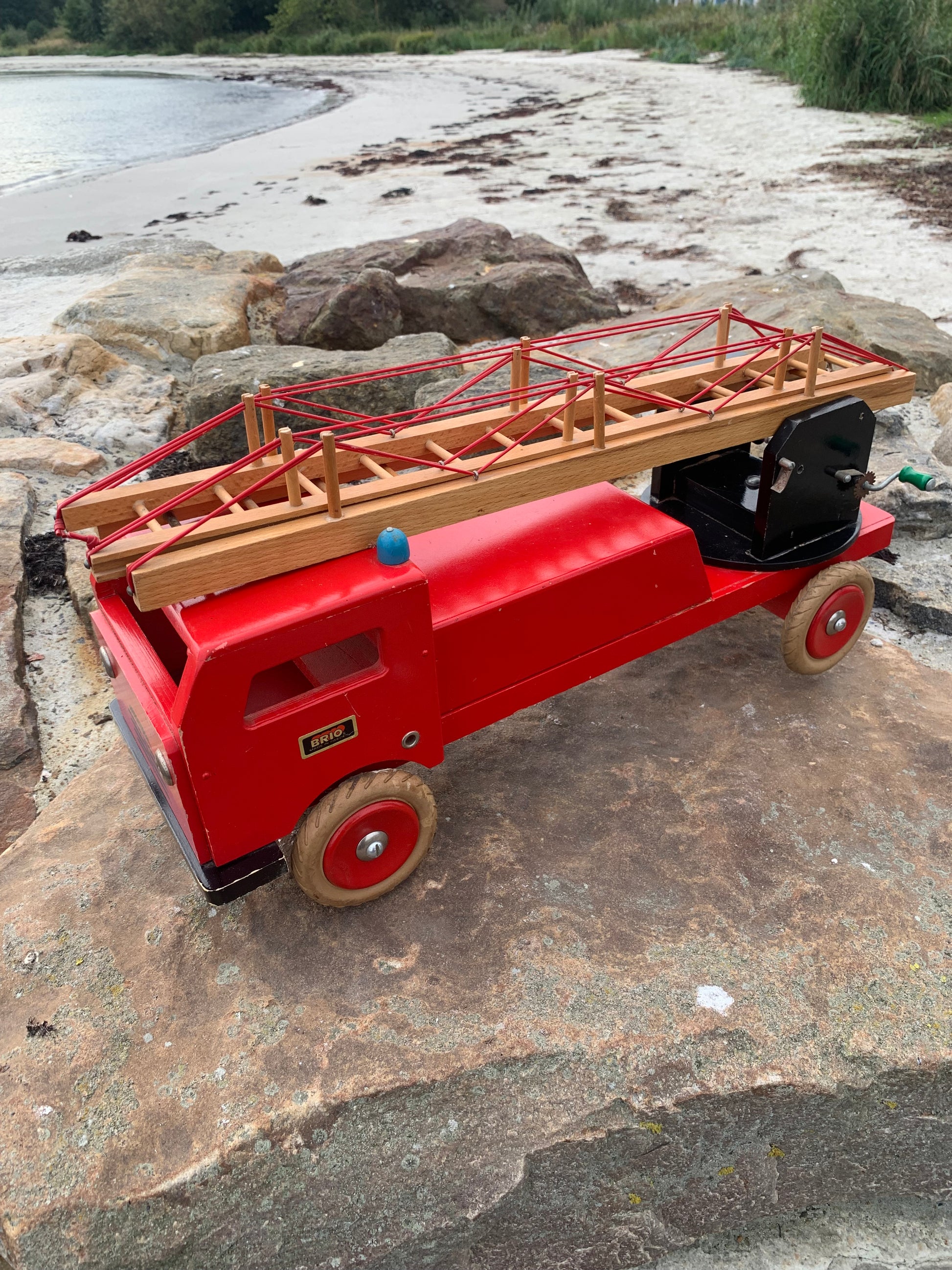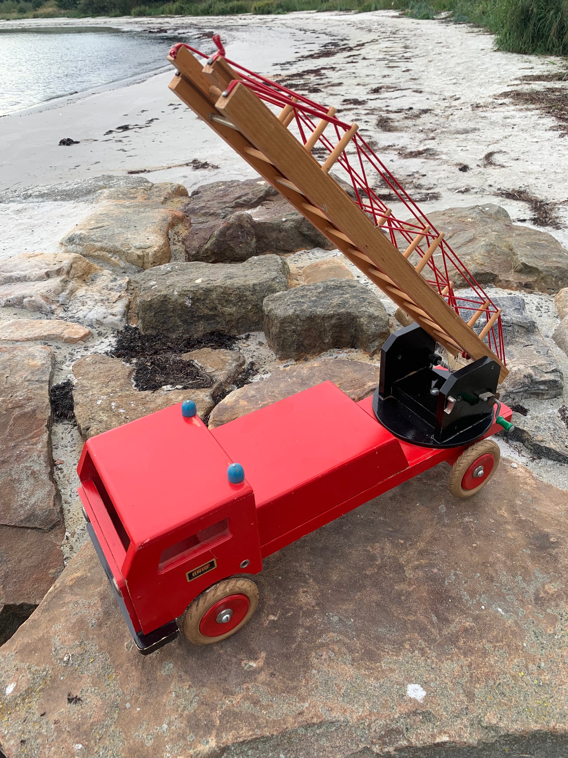 Vacker och stor gammal röd BRIO brandbil med stege