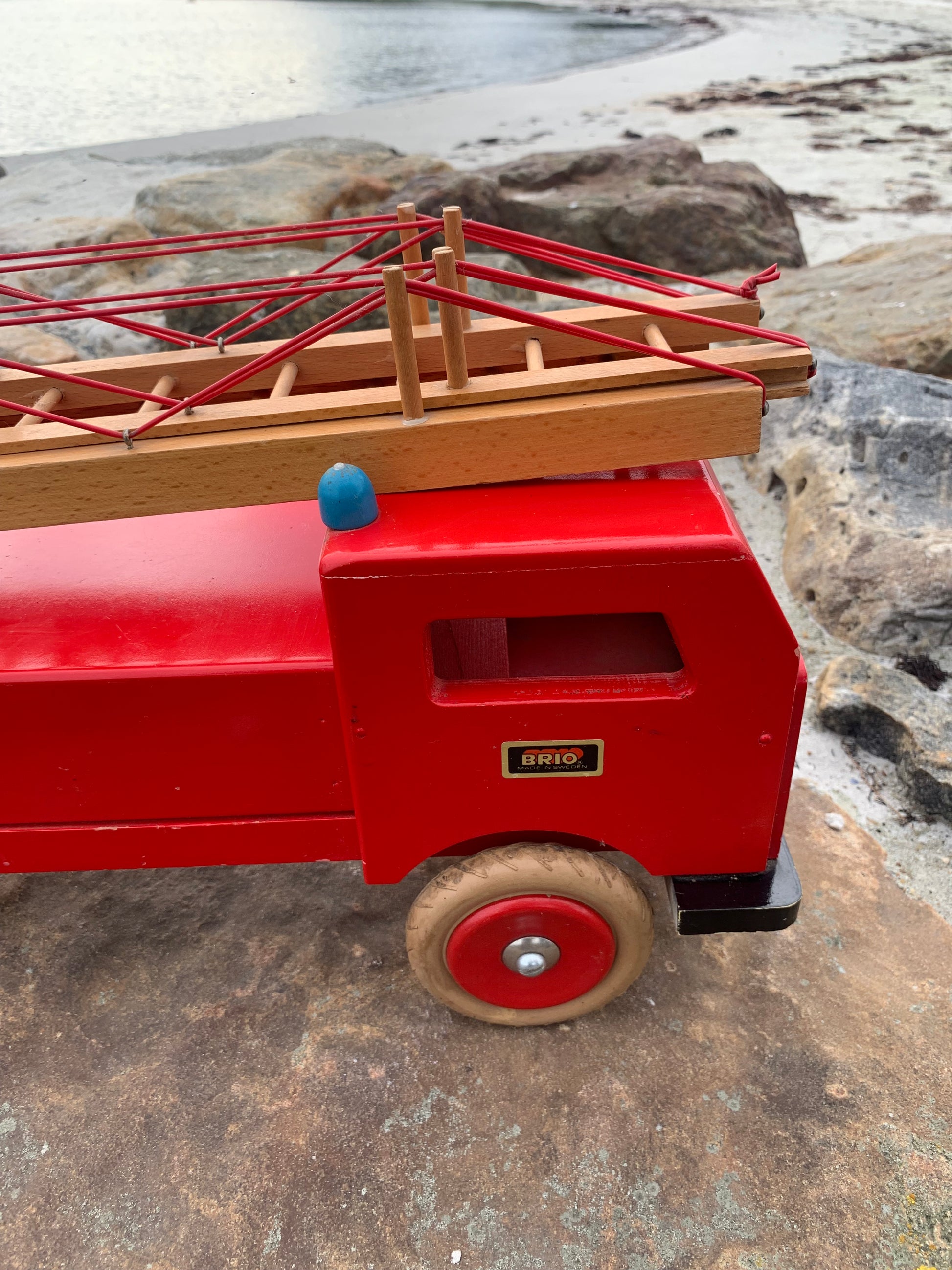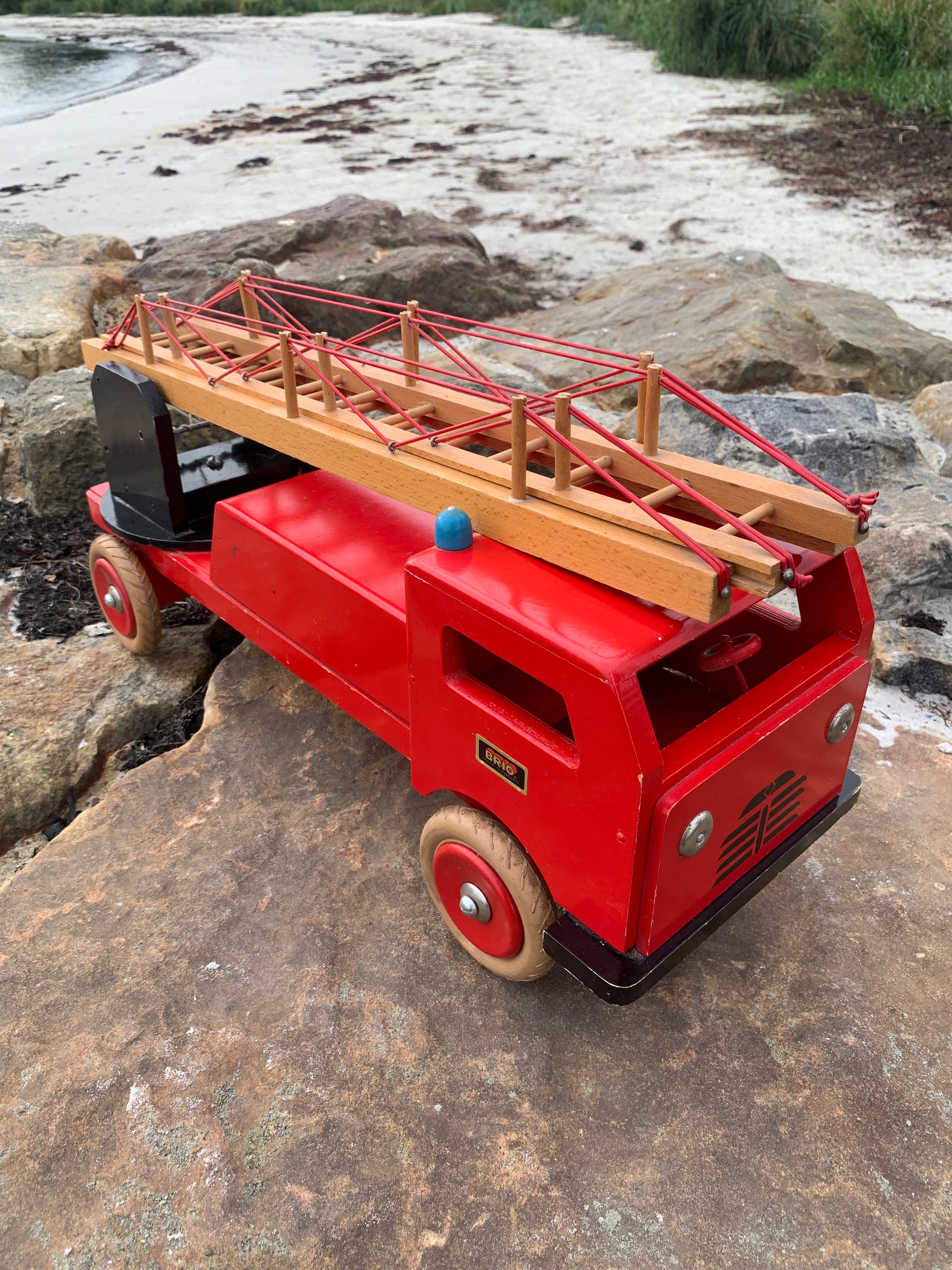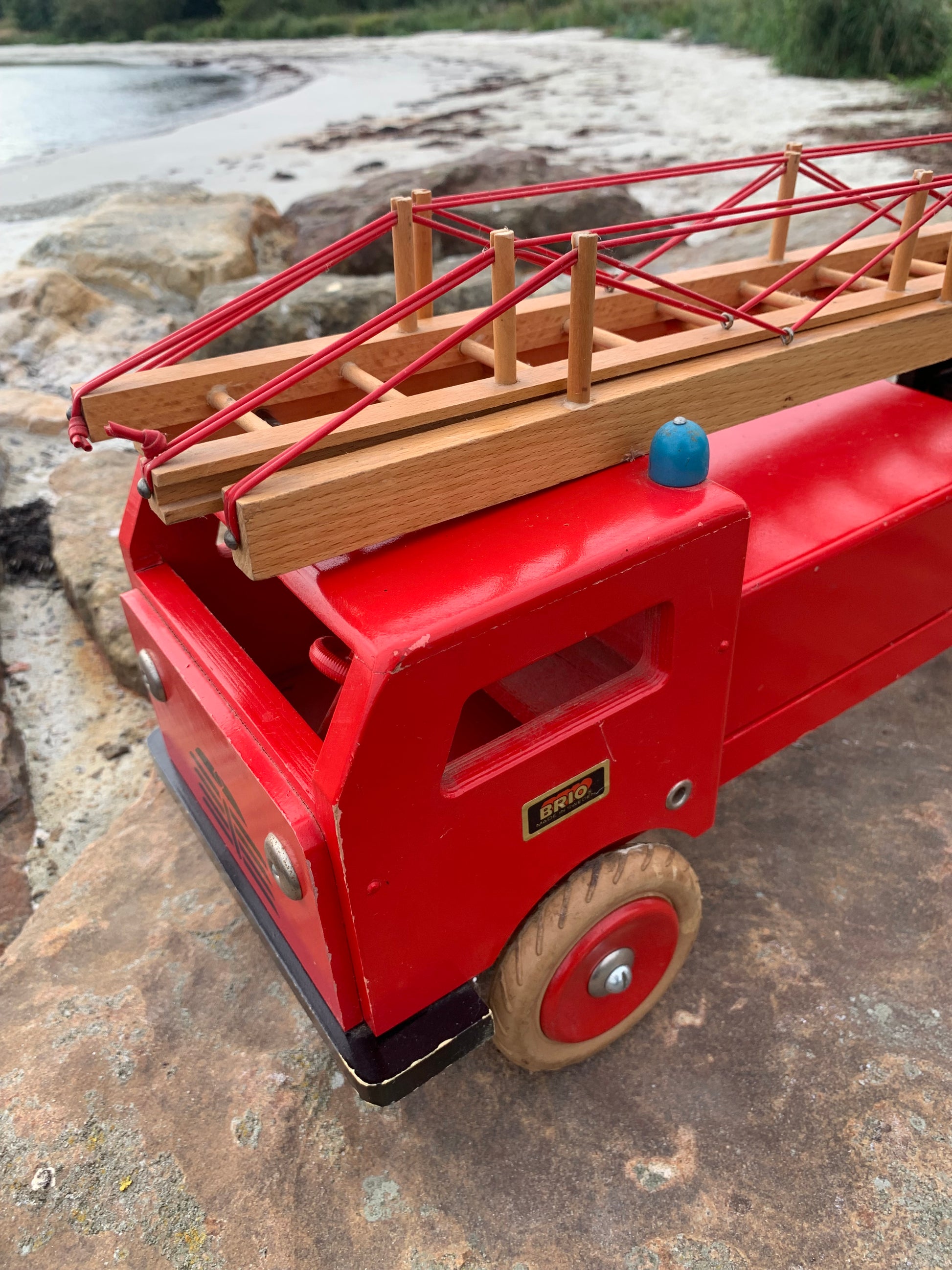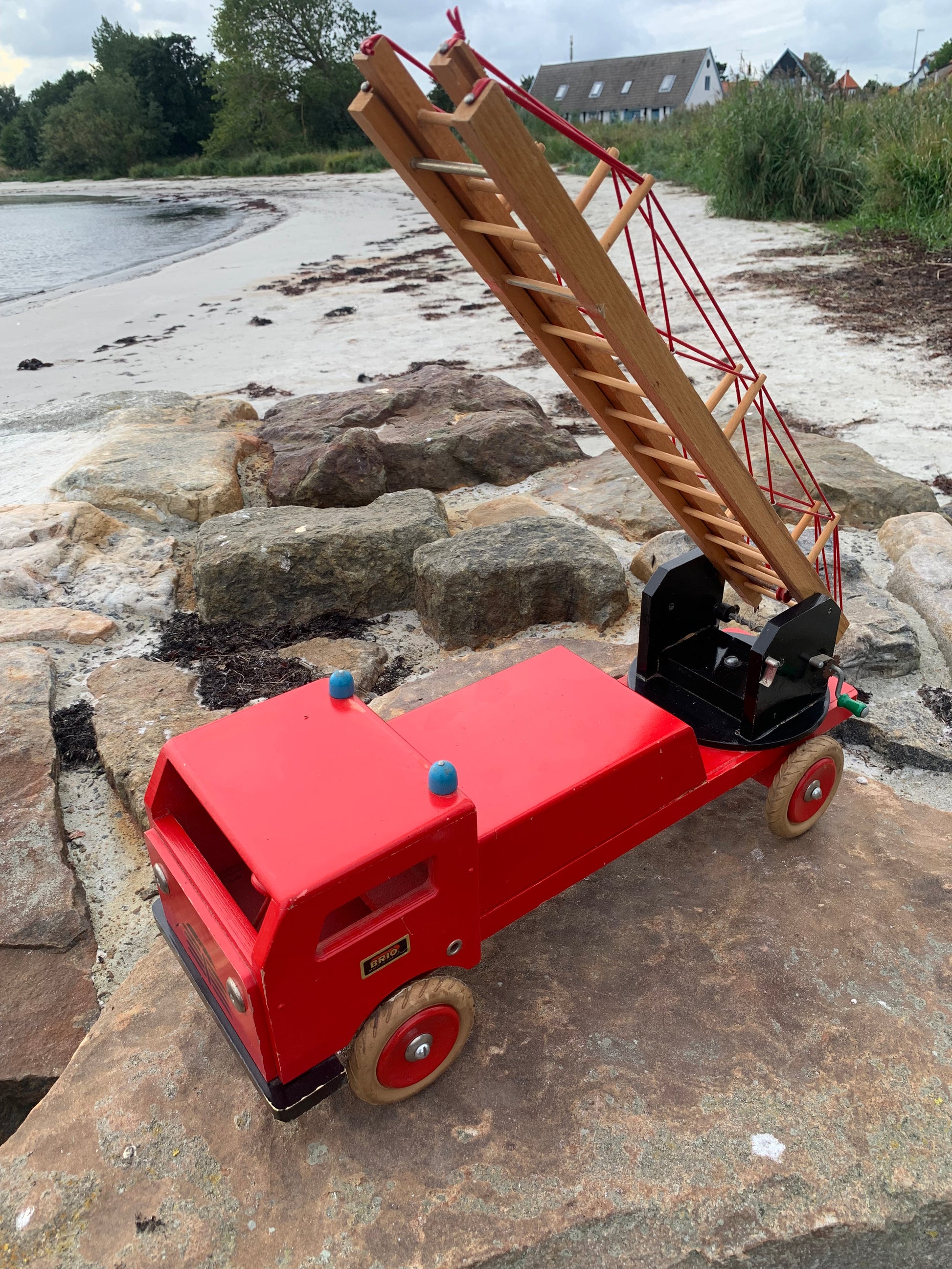 Vacker och stor gammal röd BRIO brandbil med stege