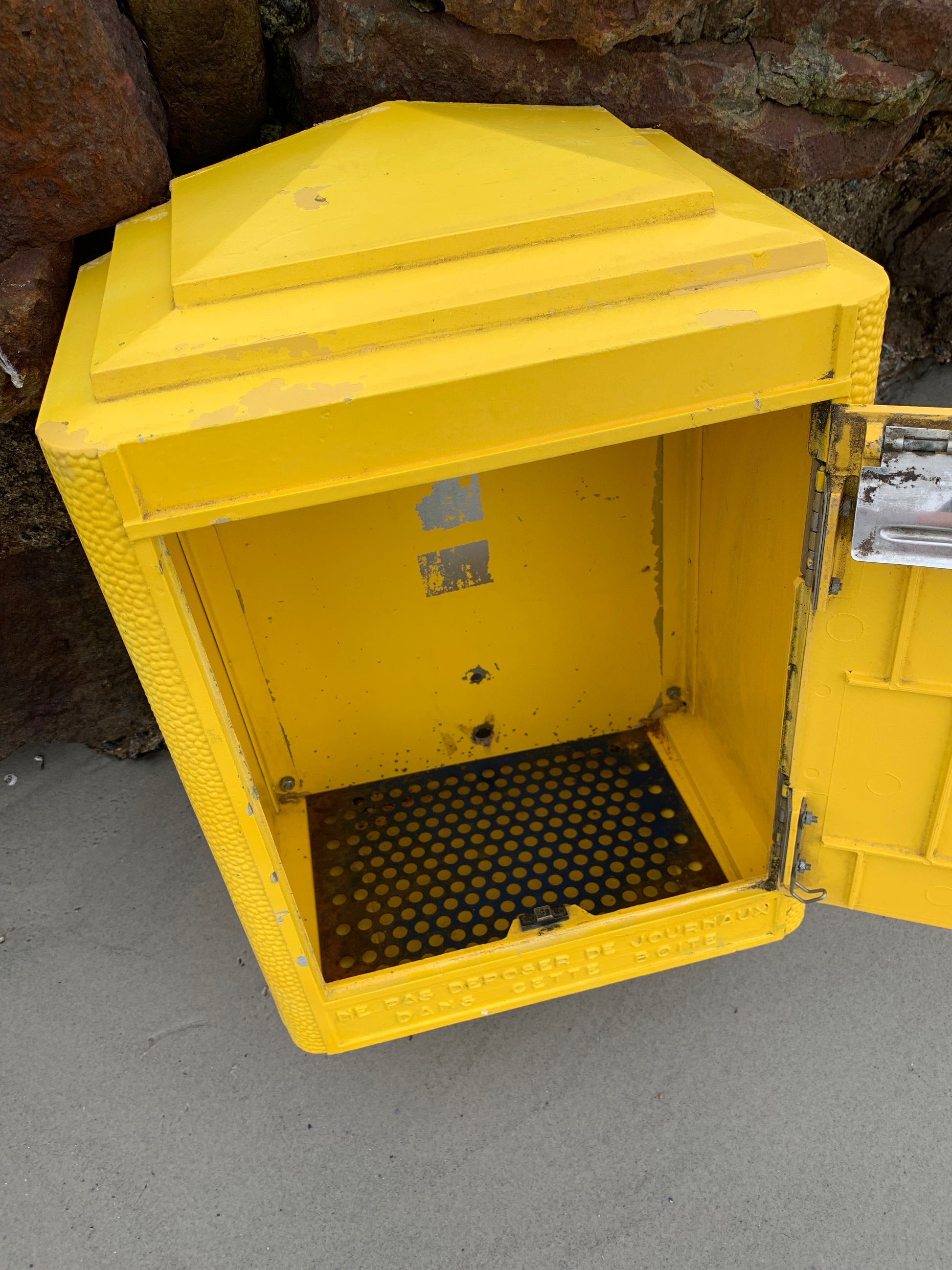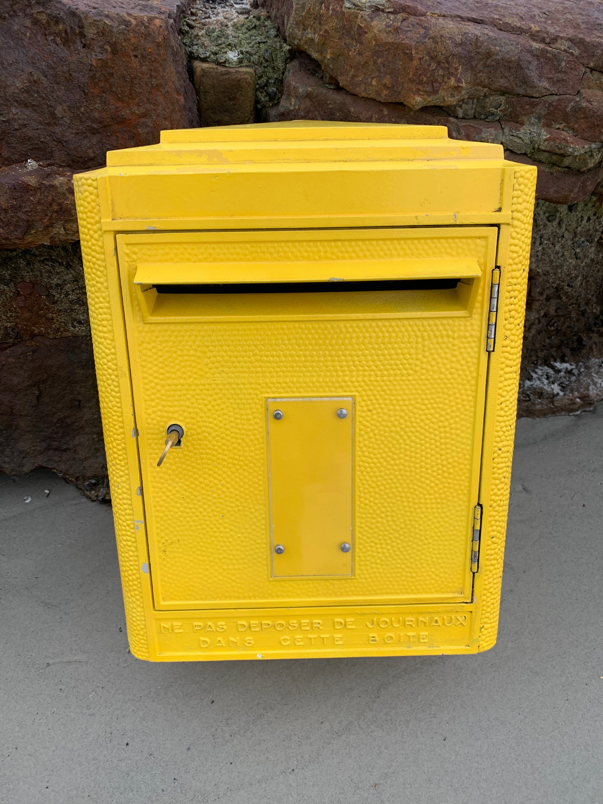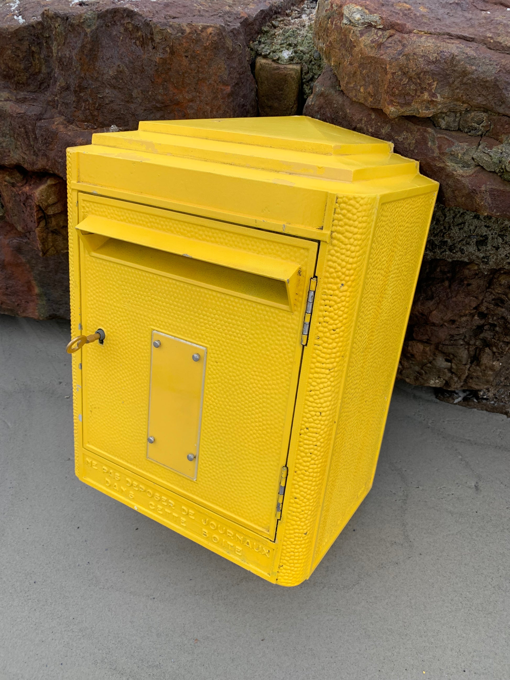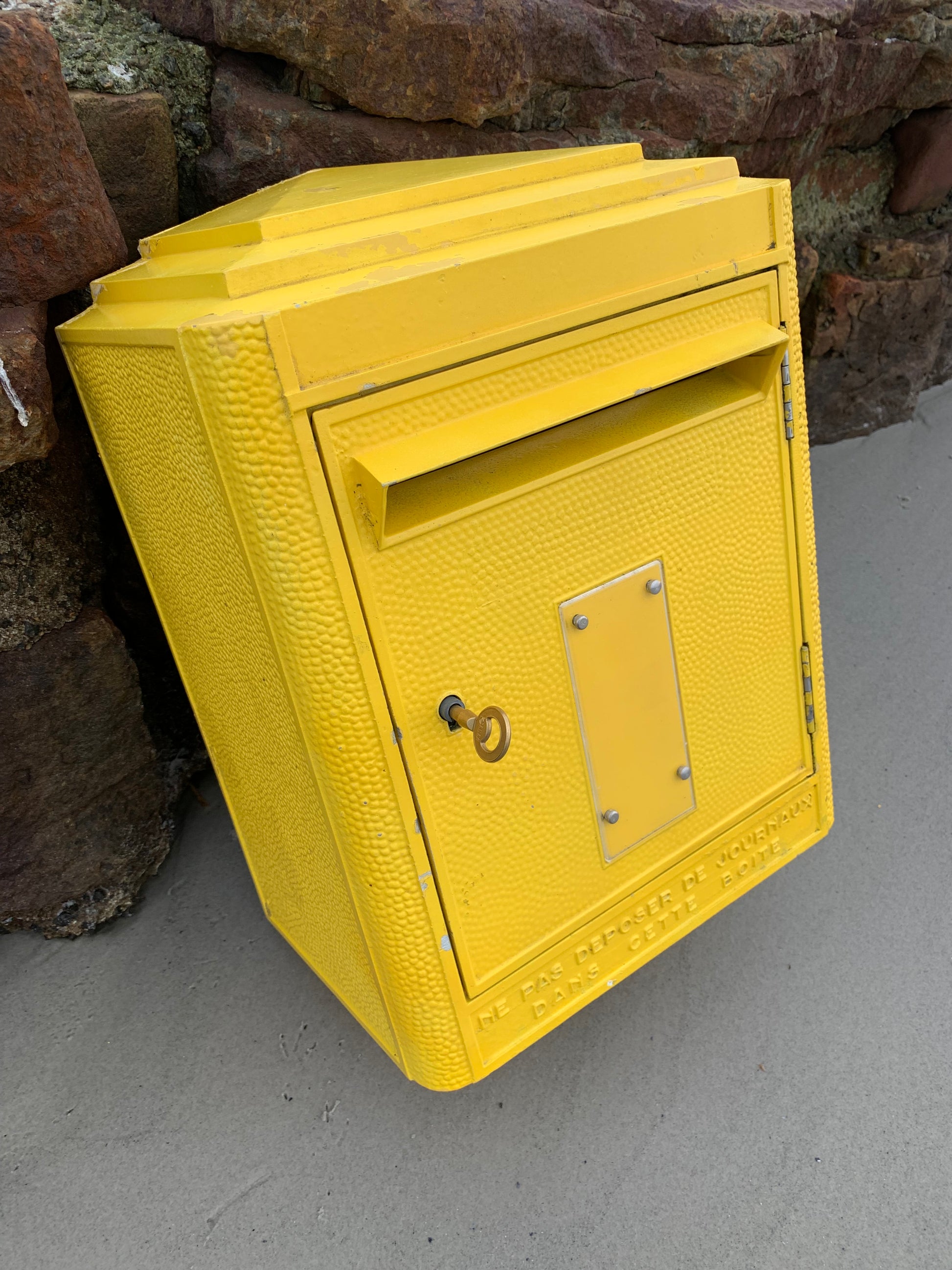 Vacker gammal fransk brevlåda, funnen i Frankrike. Brevlådan är både autentisk och charmig med en charmig patina. Brevlådan designades på Dejoie-gjuteriet i denna officiella form sedan 1950 och tillverkades i Nantes av 100 % återvinningsbar aluminium, varav 30 % är tillverkad av återvunnet material. Brevlådan har ett fungerande lås och en medföljande originalnyckel.