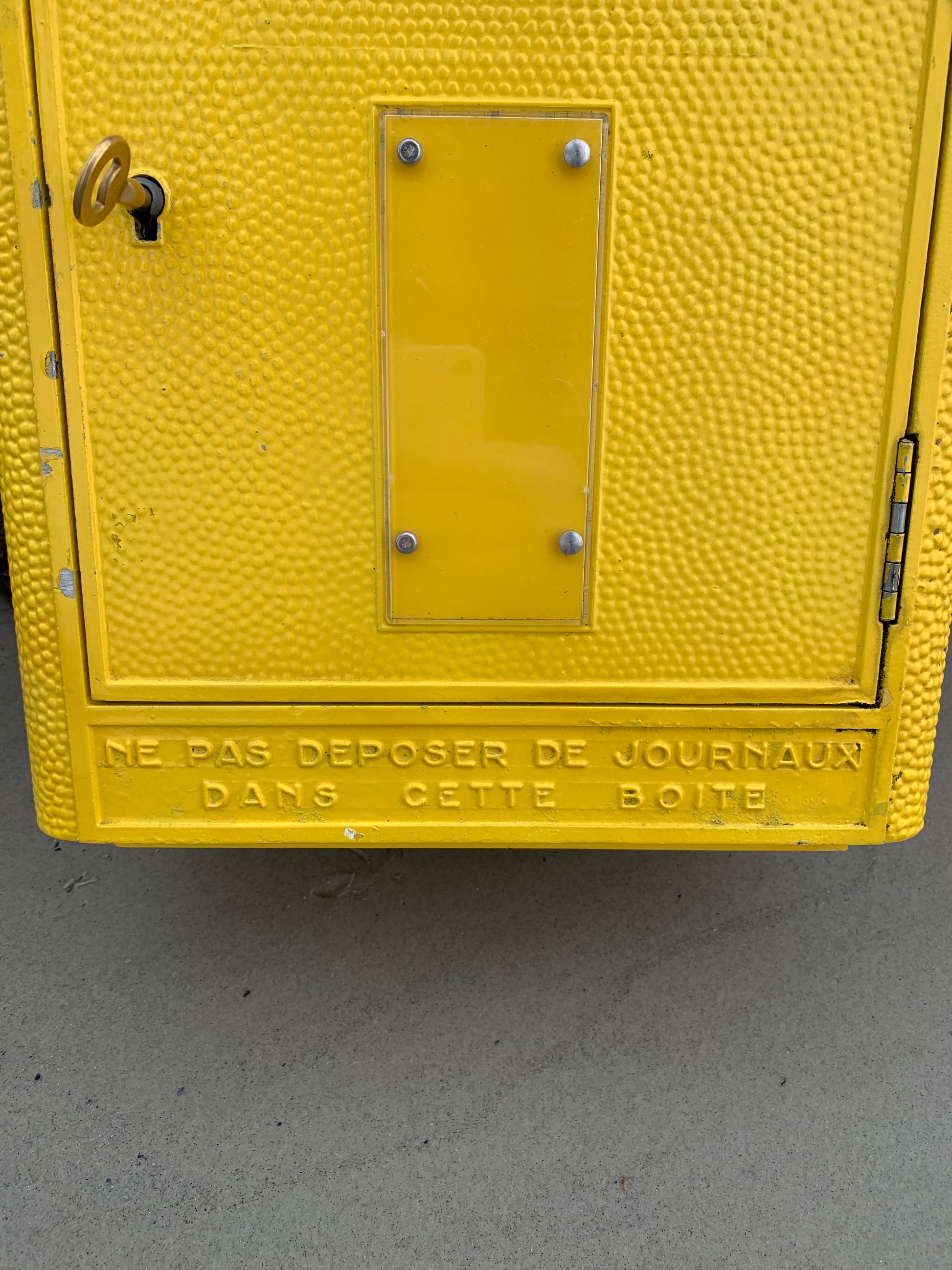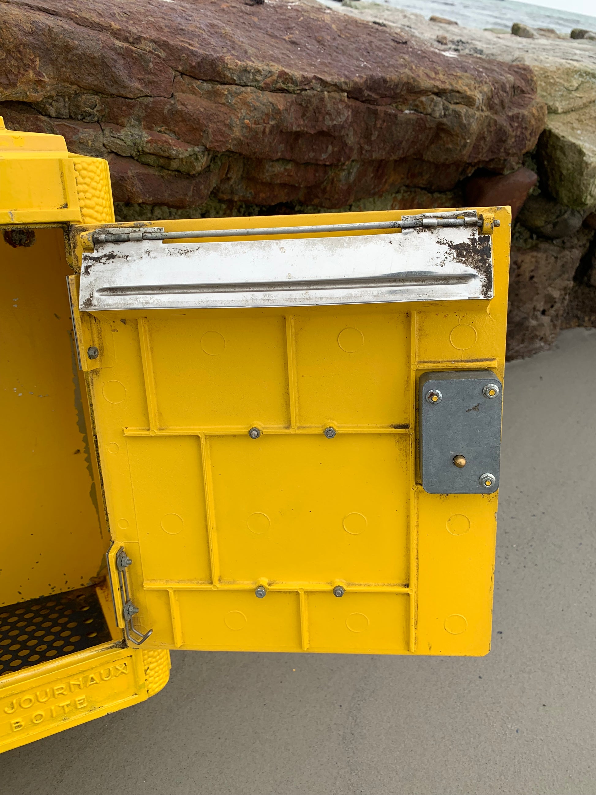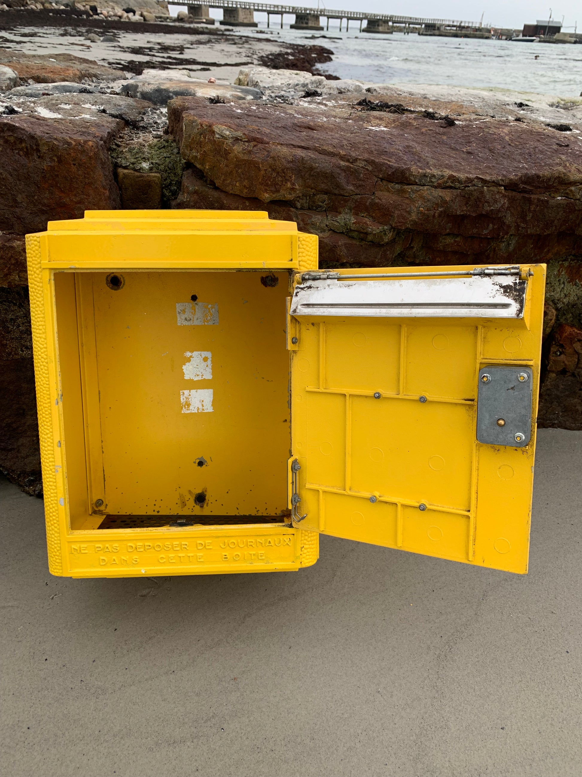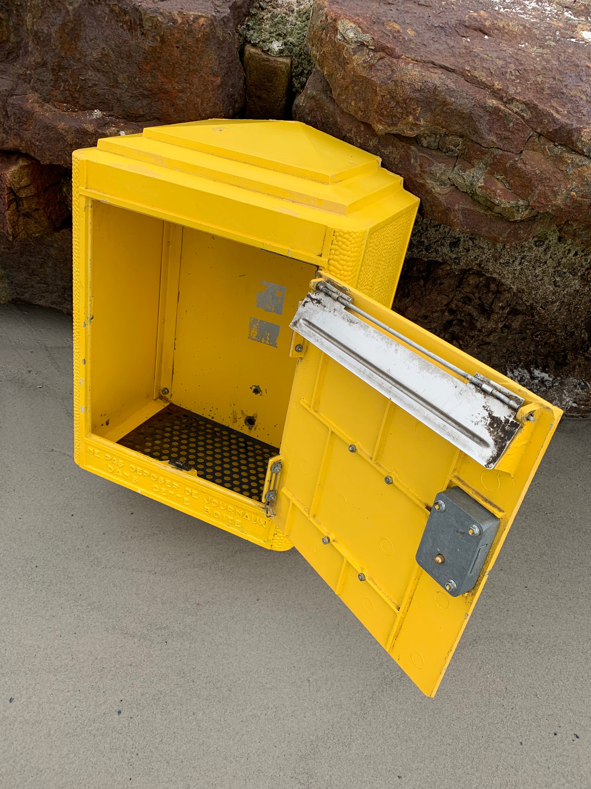 Vacker gammal fransk brevlåda, funnen i Frankrike. Brevlådan är både autentisk och charmig med en charmig patina. Brevlådan designades på Dejoie-gjuteriet i denna officiella form sedan 1950 och tillverkades i Nantes av 100 % återvinningsbar aluminium, varav 30 % är tillverkad av återvunnet material. Brevlådan har ett fungerande lås och en medföljande originalnyckel.