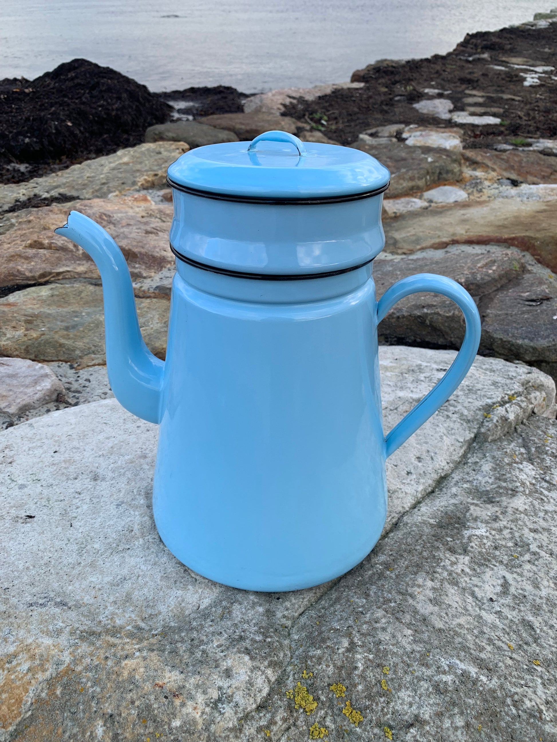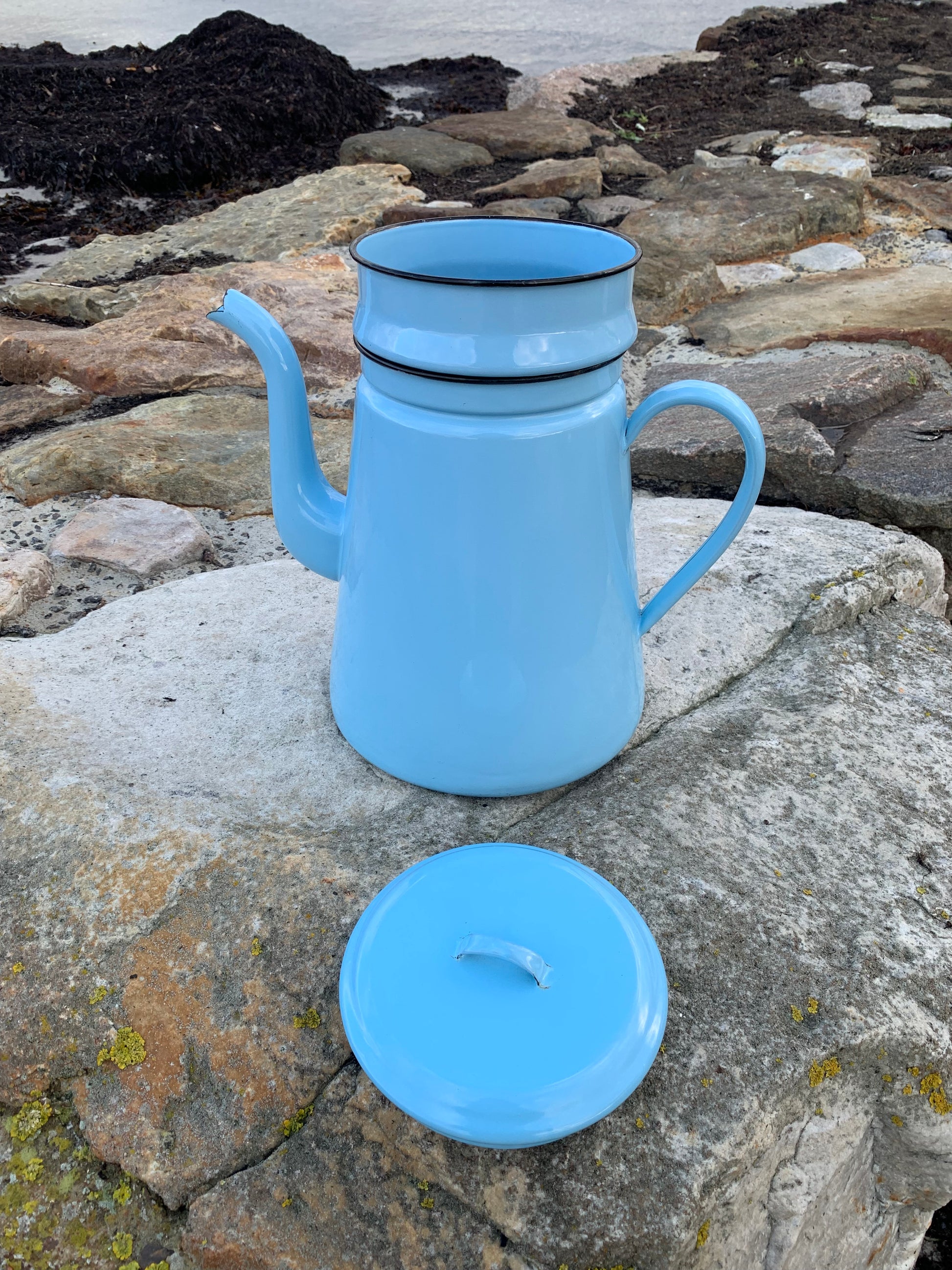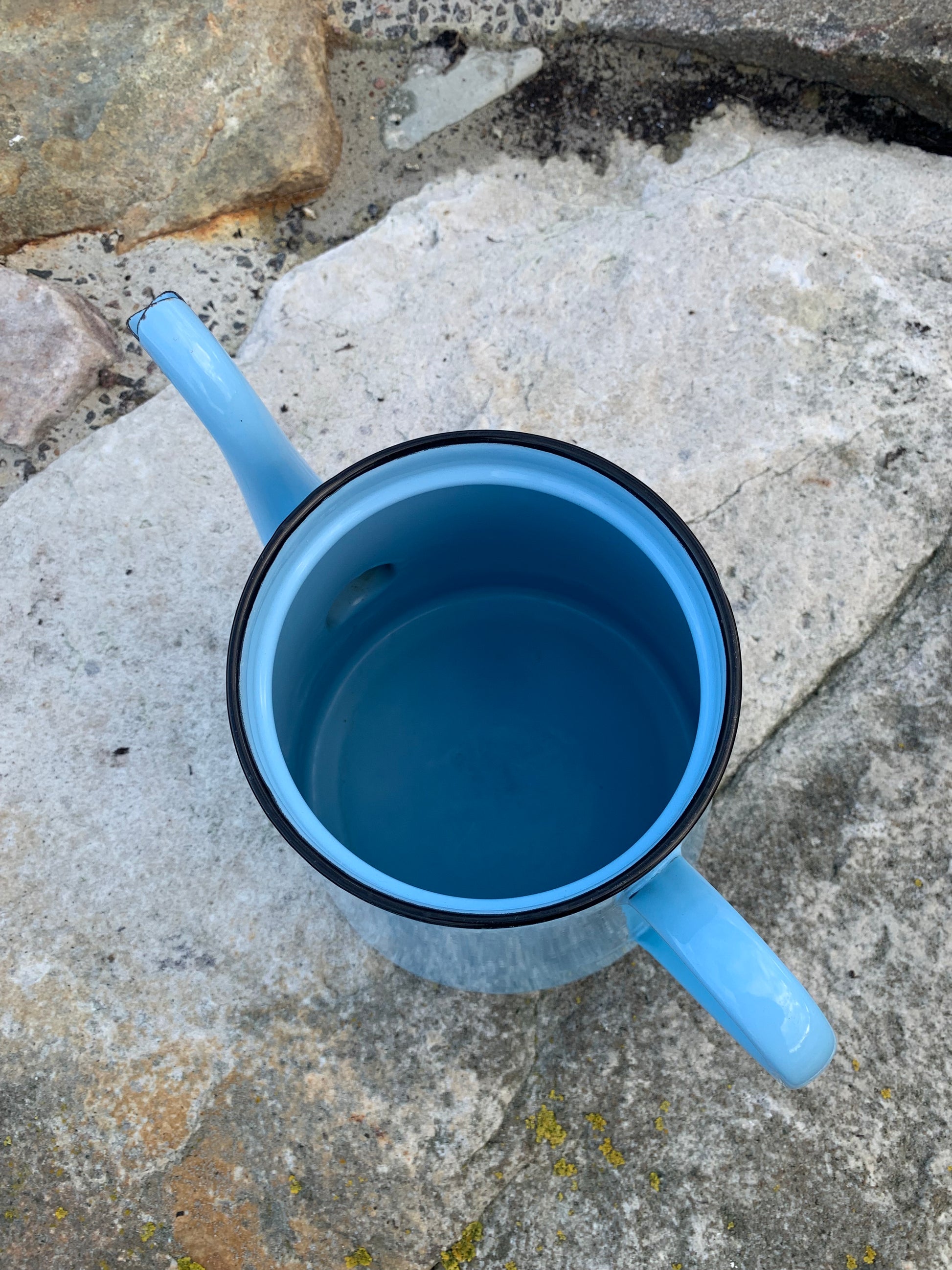 Stor, vacker emaljkanna från Glud och Marstrand. Kannan är en av de mer sällsynta. Den har lite emaljflisor (se bild) men överlag är den i fint vintageskick.