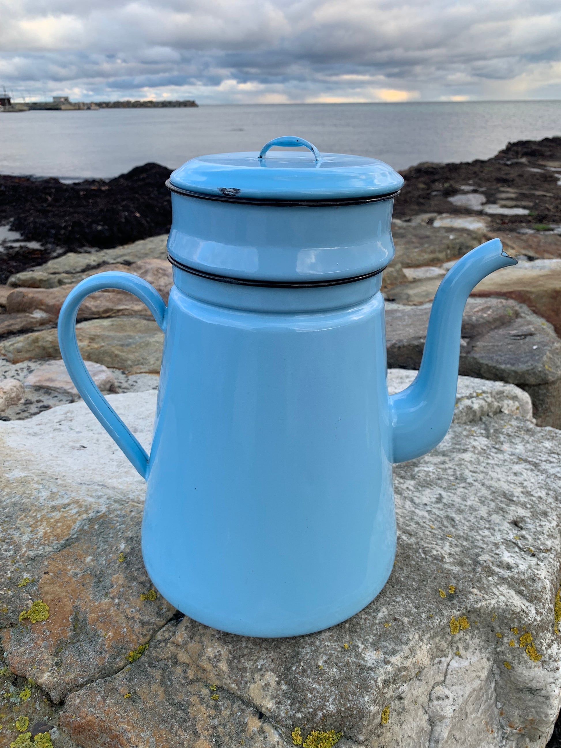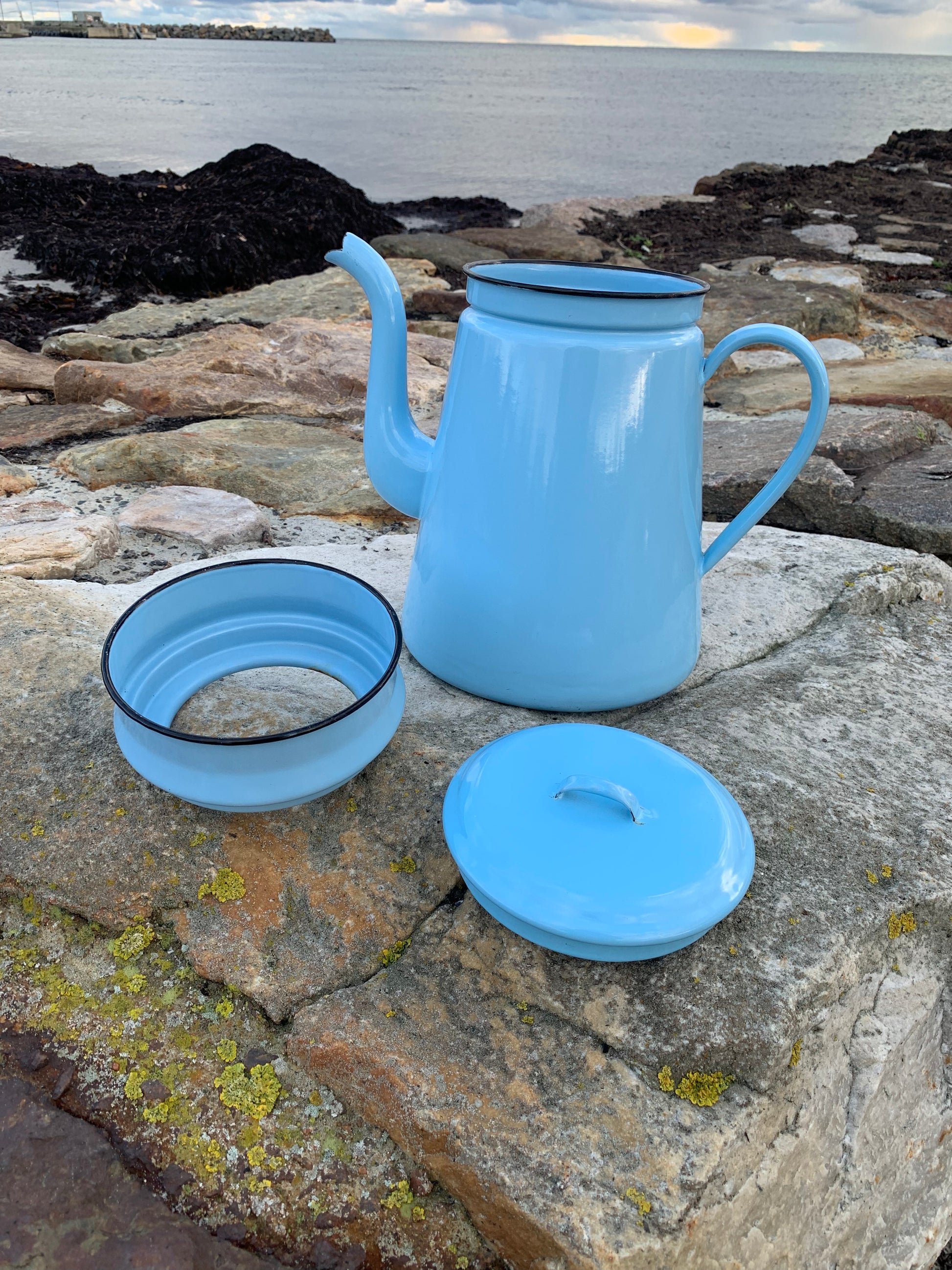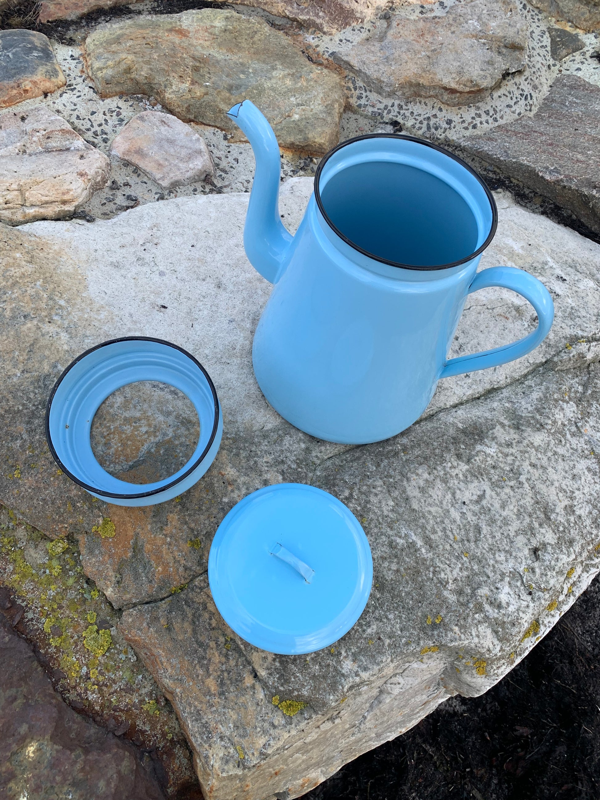 Stor, vacker emaljkanna från Glud och Marstrand. Kannan är en av de mer sällsynta. Den har lite emaljflisor (se bild) men överlag är den i fint vintageskick.