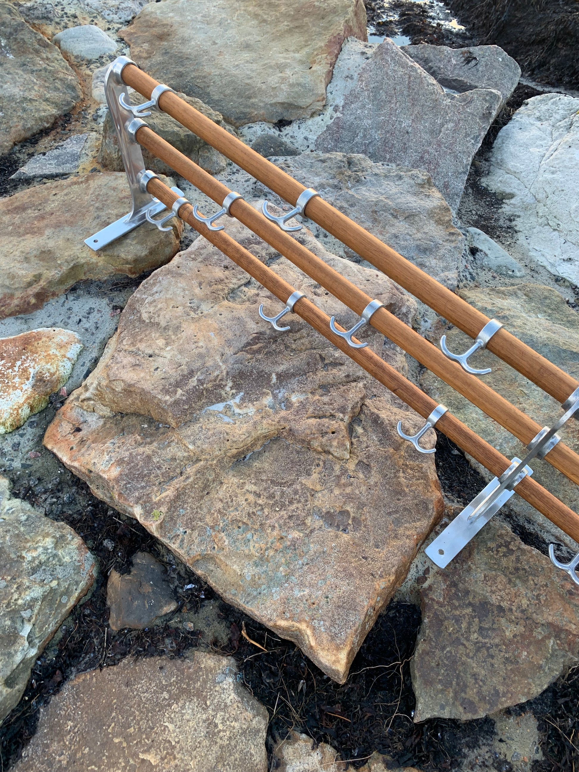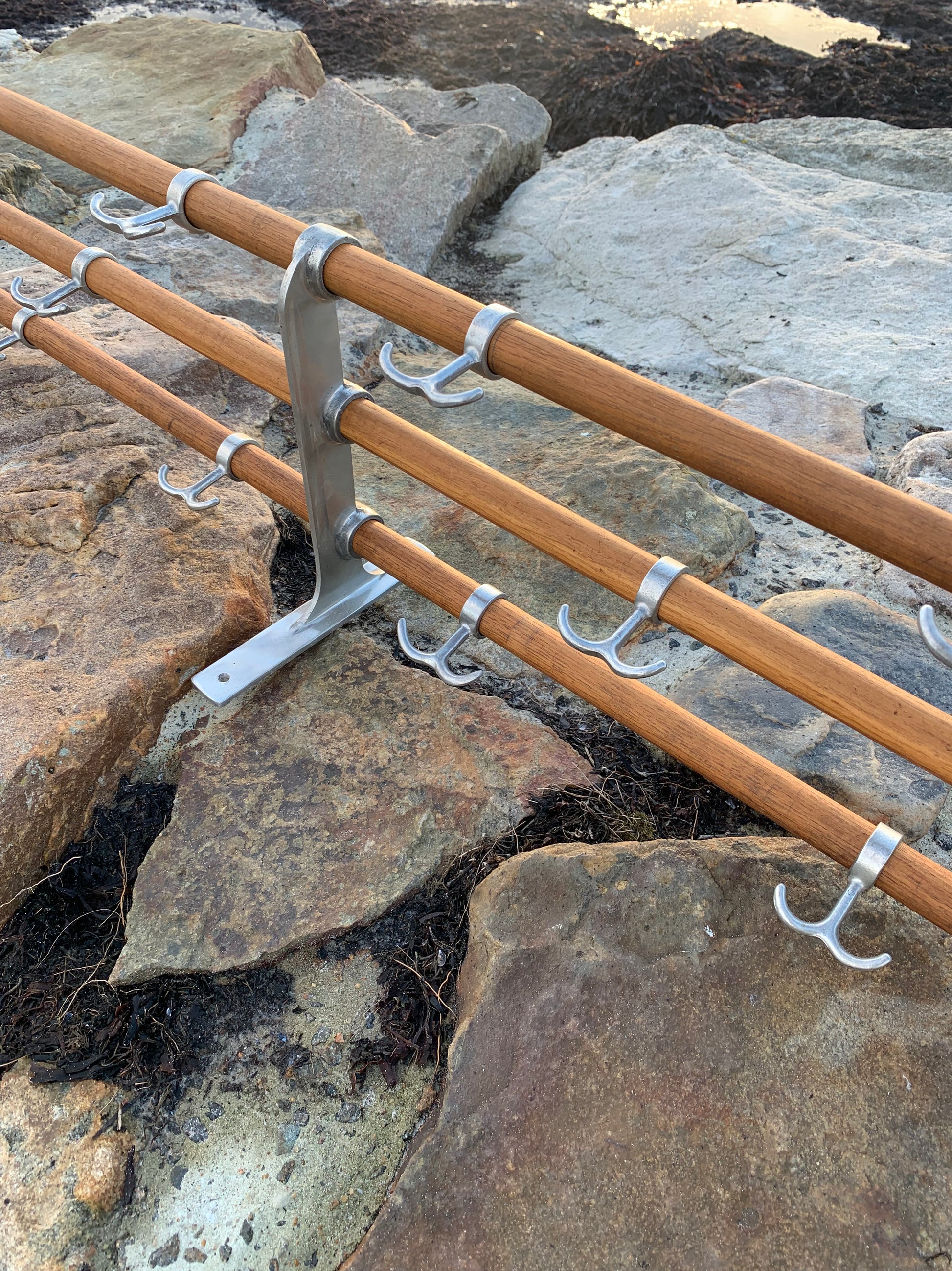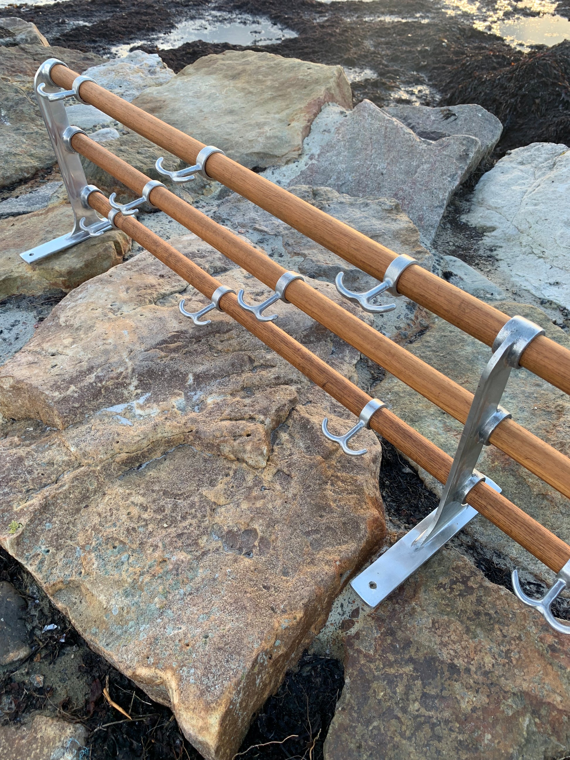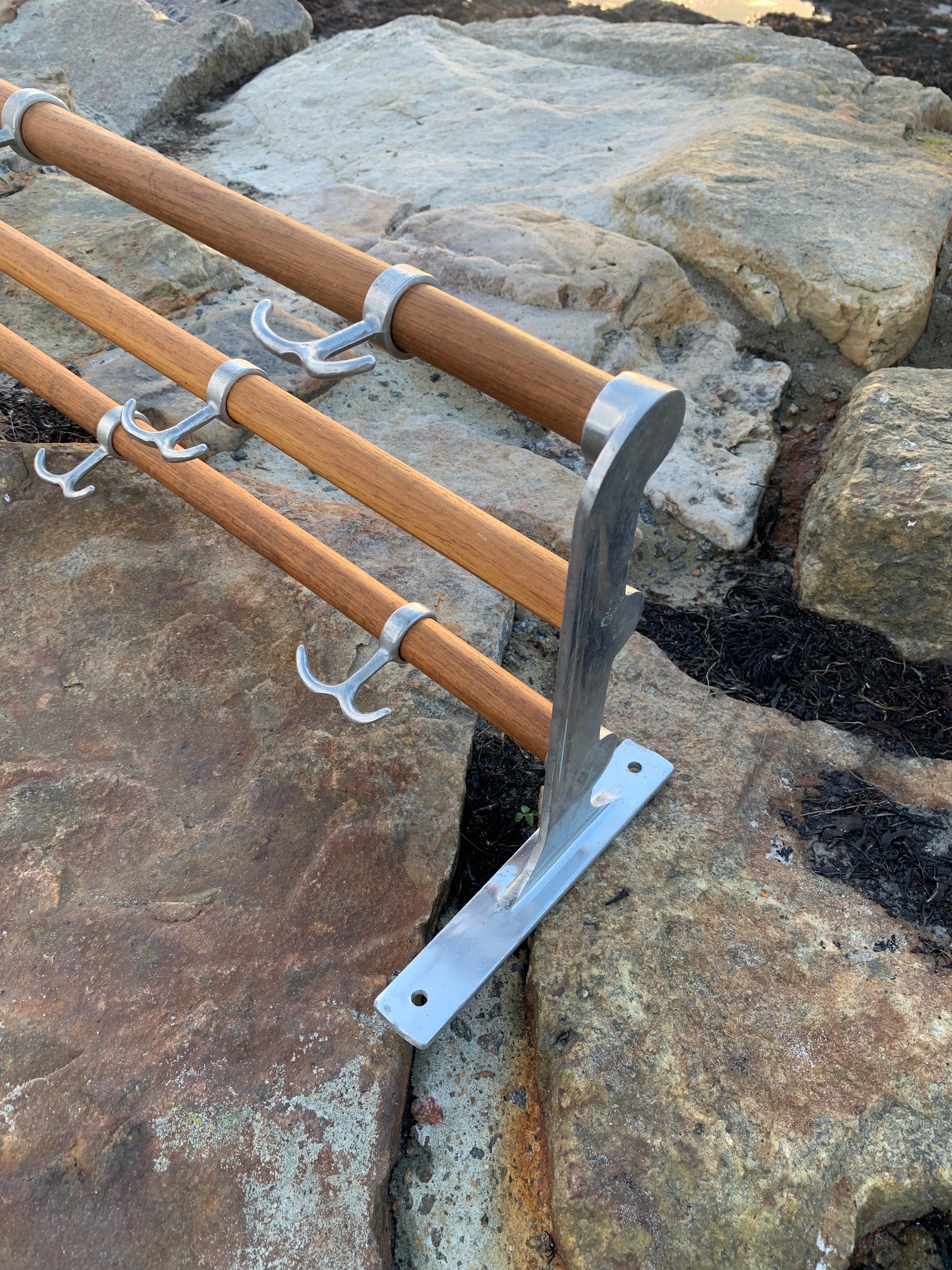 Vacker svensk hatthylla i god design av Gunnar Bolin. Tidens tand har tagit ut sin rätt, så den framstår med åldersrelaterade tecken på slitage, vilket bara tyder på att någon förmodligen har varit nöjd med den.