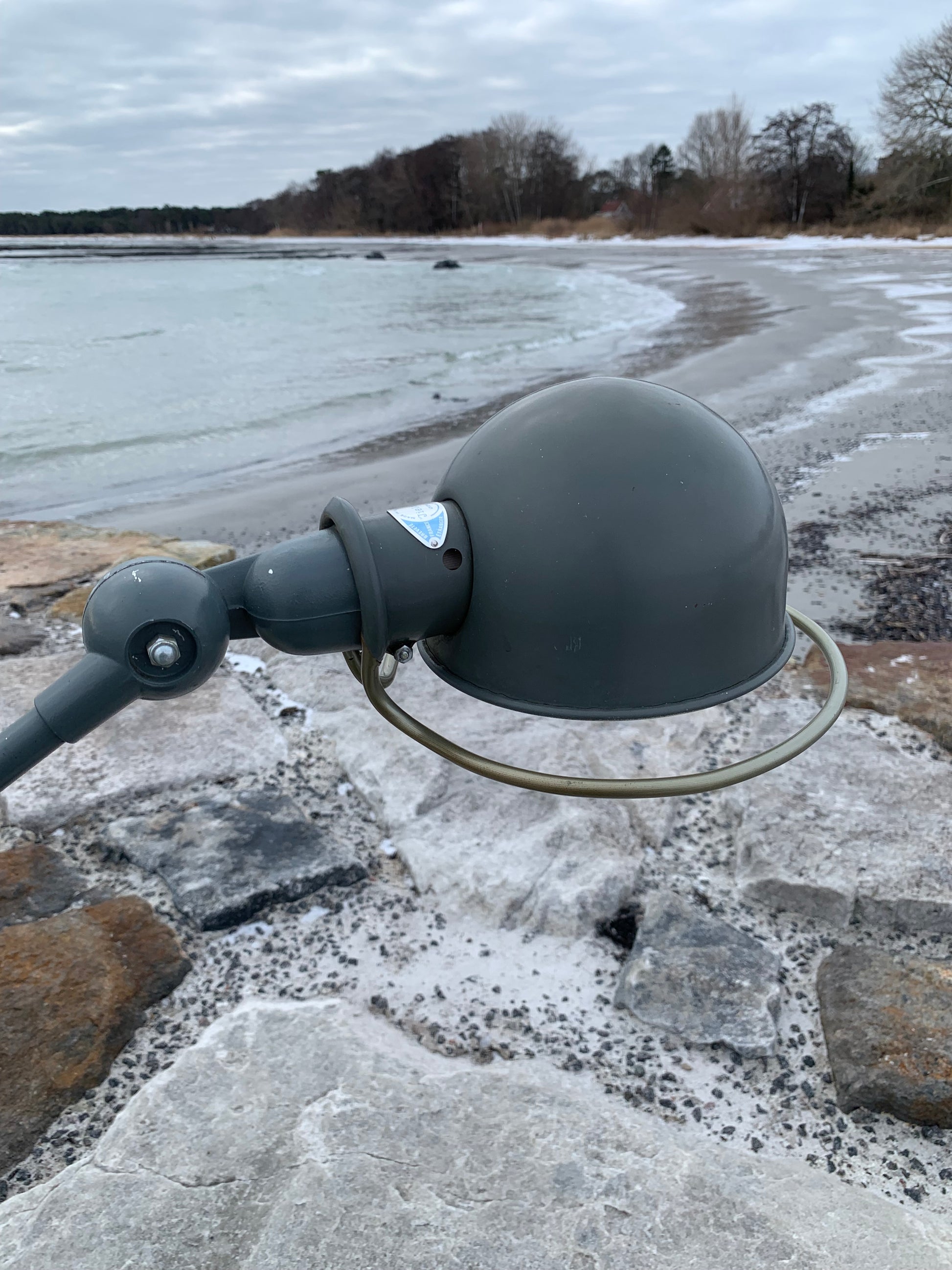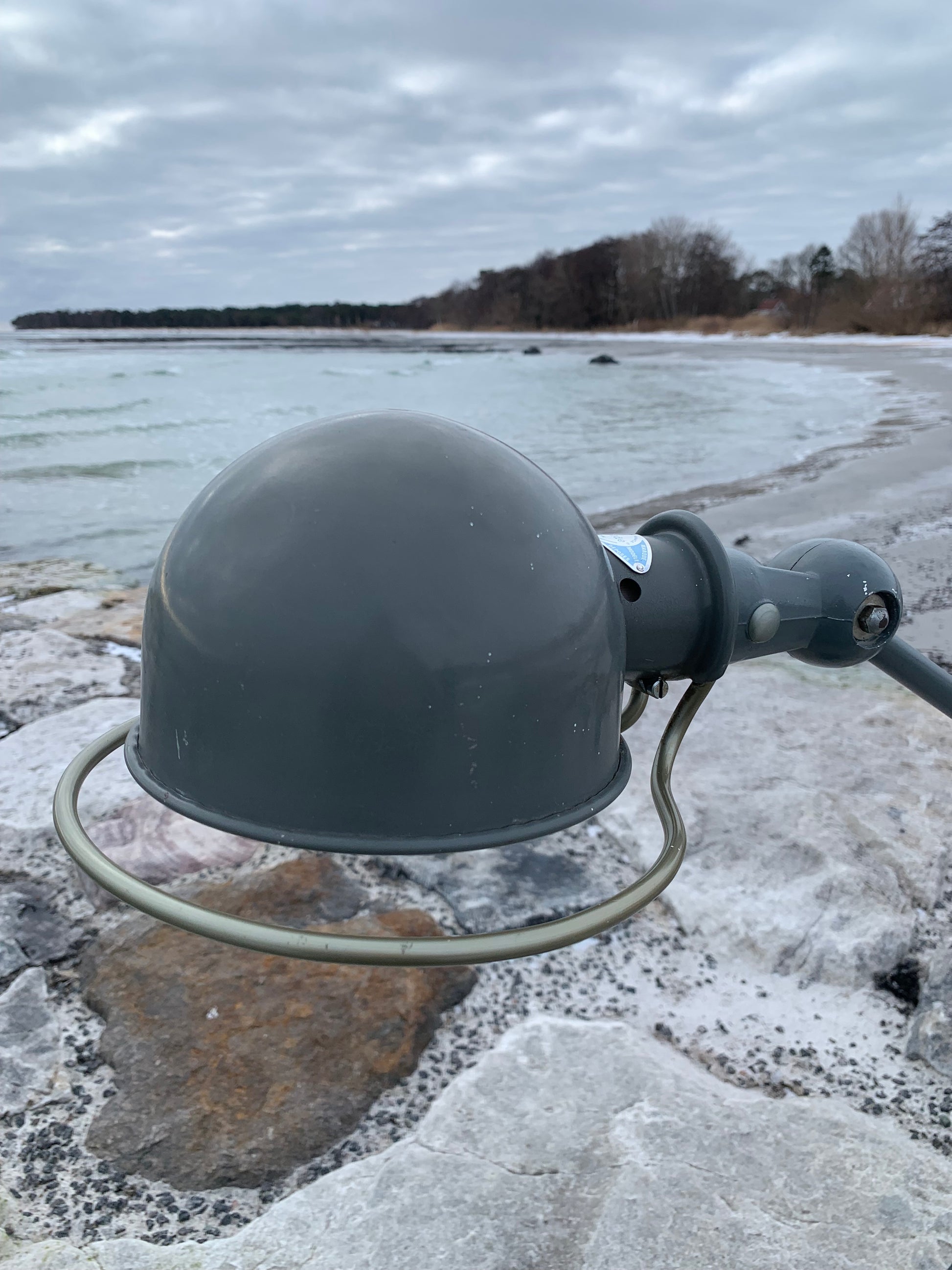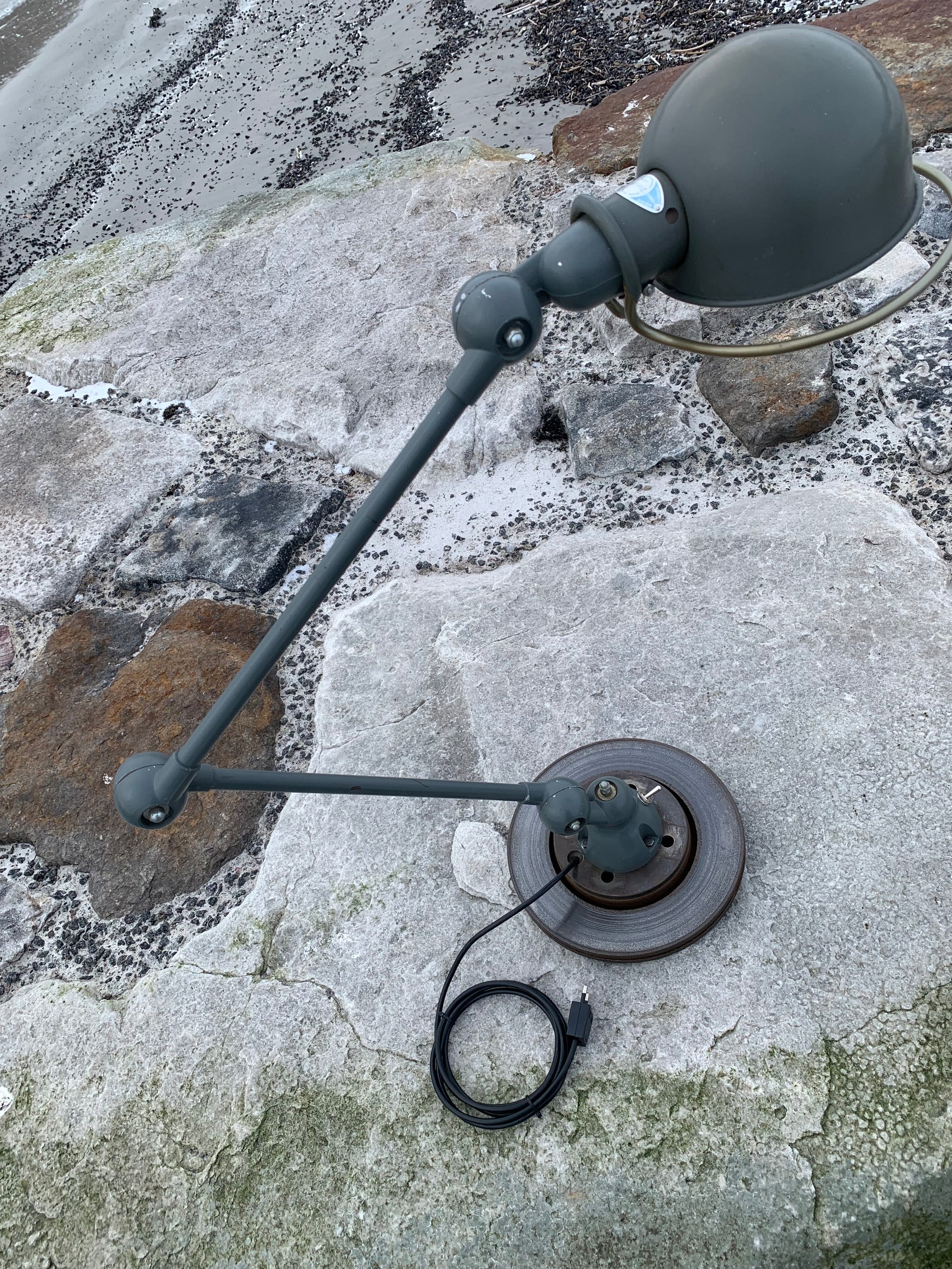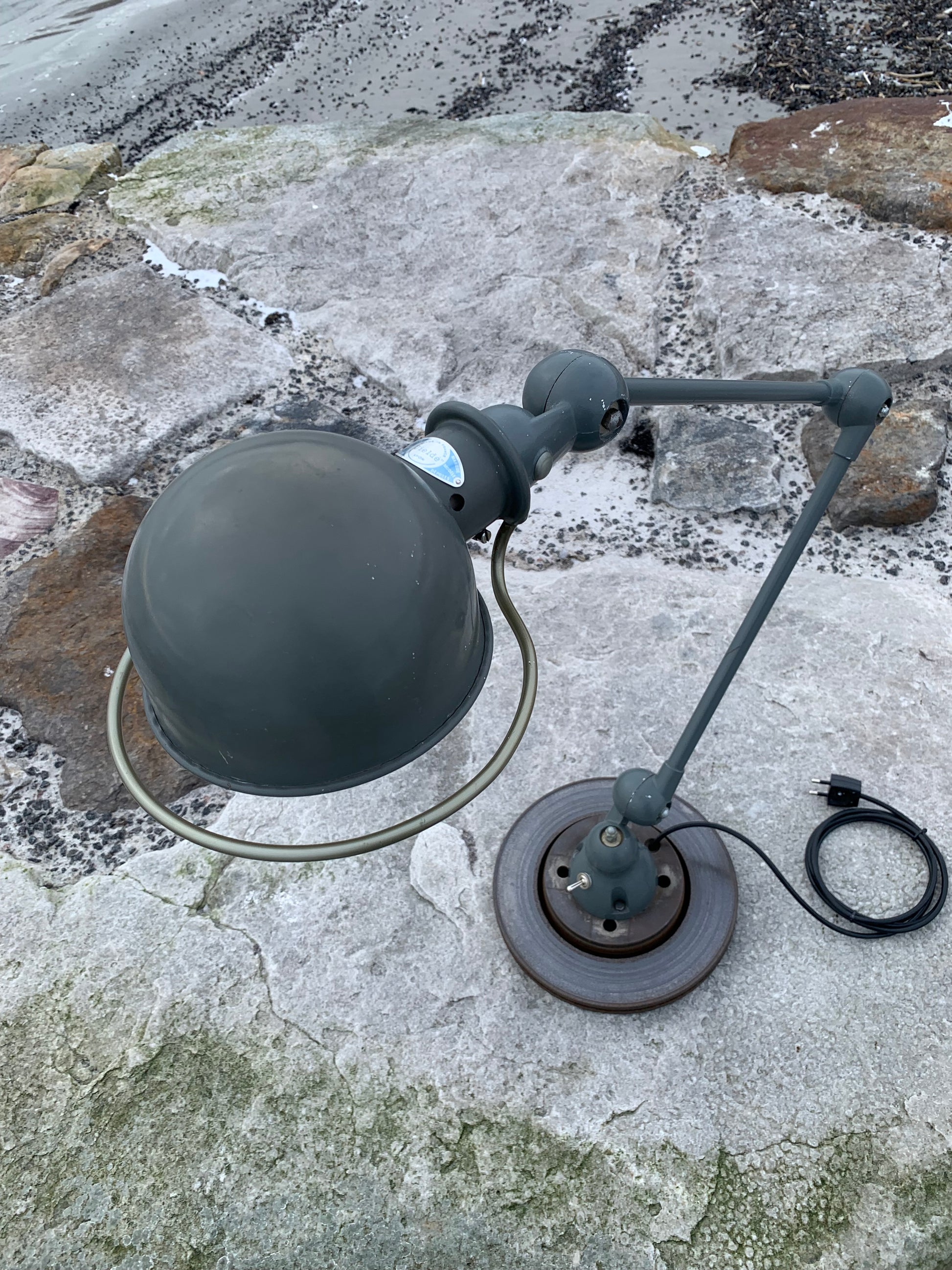 Vacker Jieldé-lampa med original grå lack. Tidens tand har tagit ut sin rätt på lampan, som framstår med patina och riktar sig till dig som ser det perfekta i det ofullkomliga.