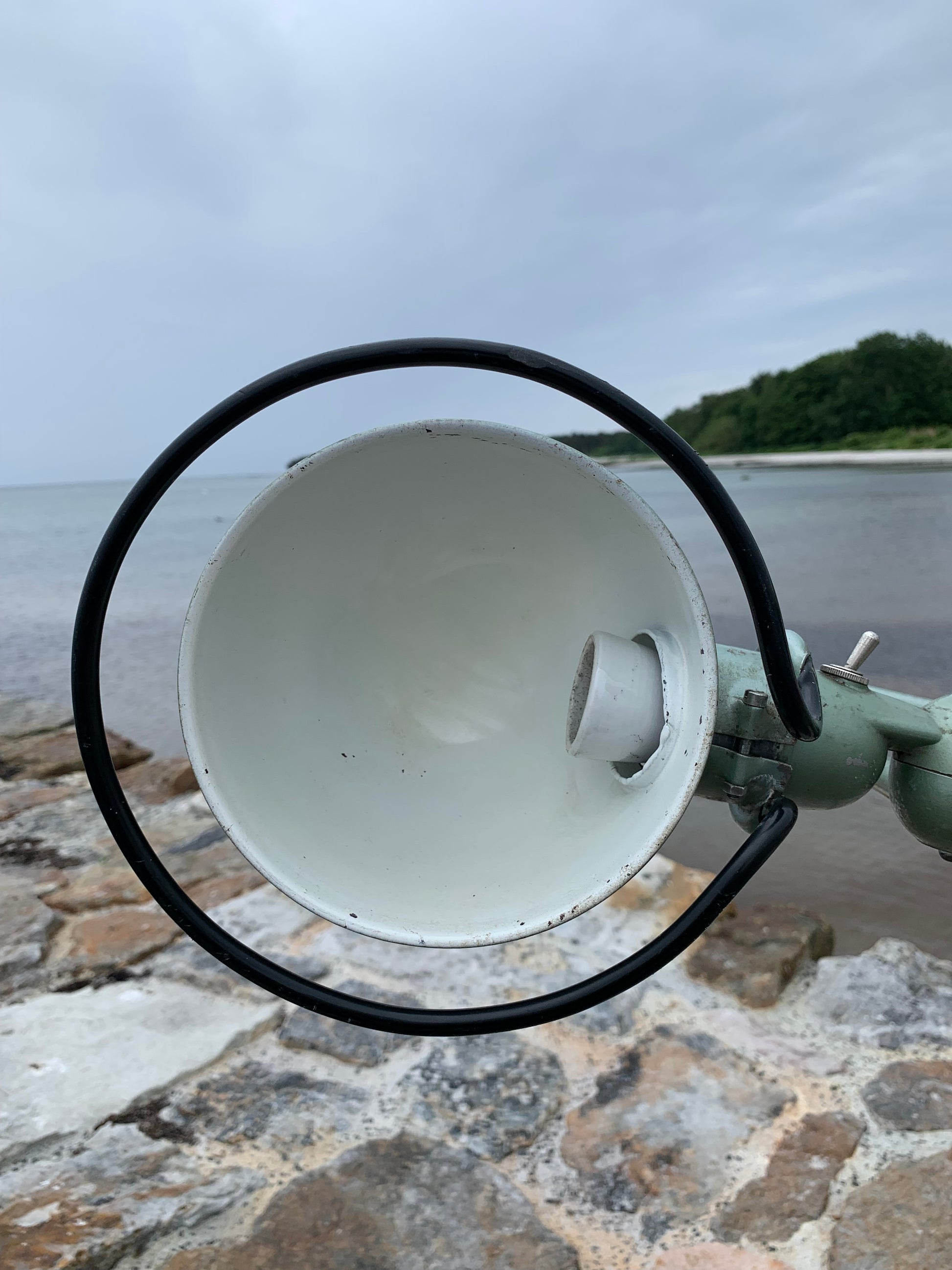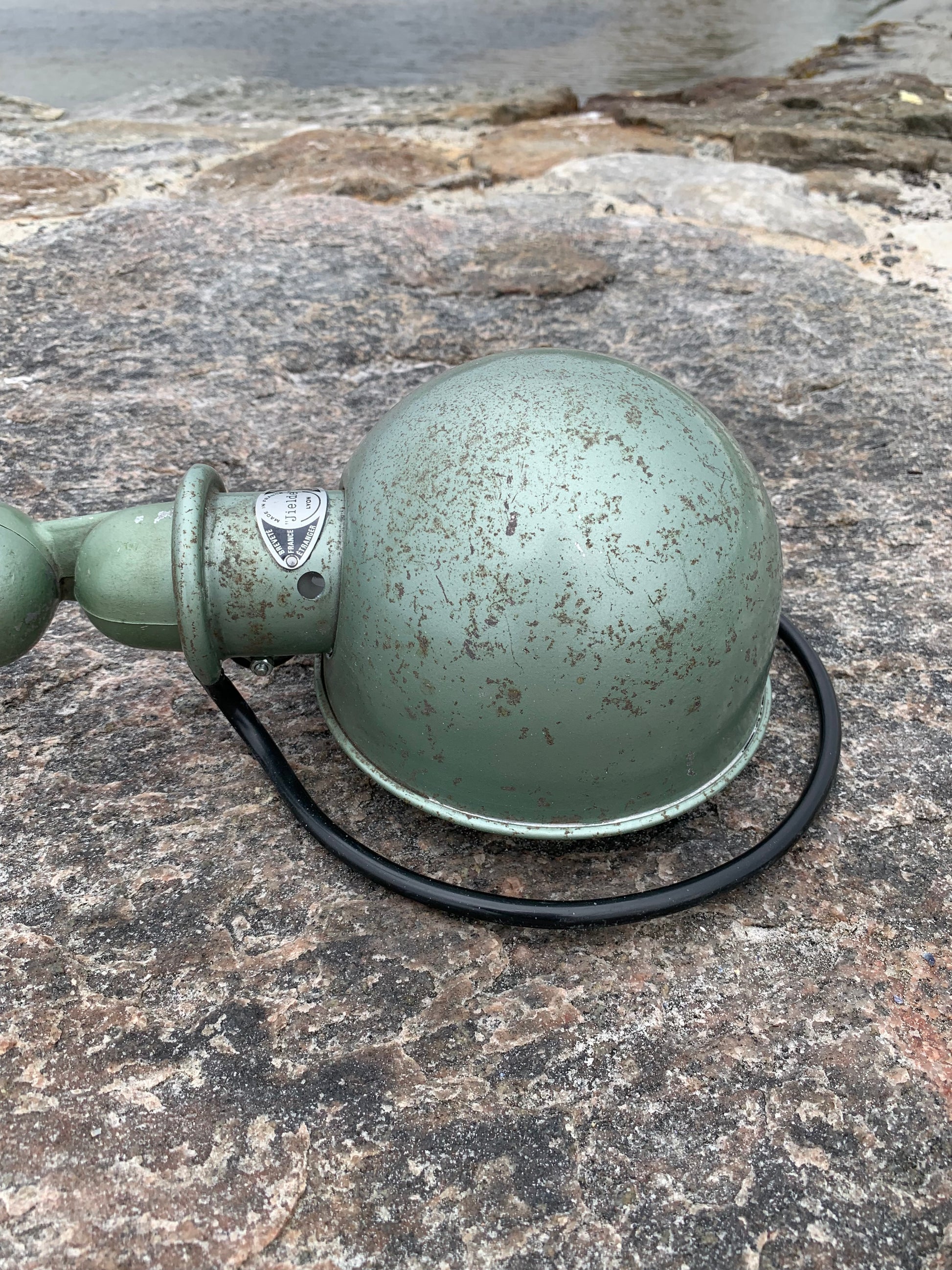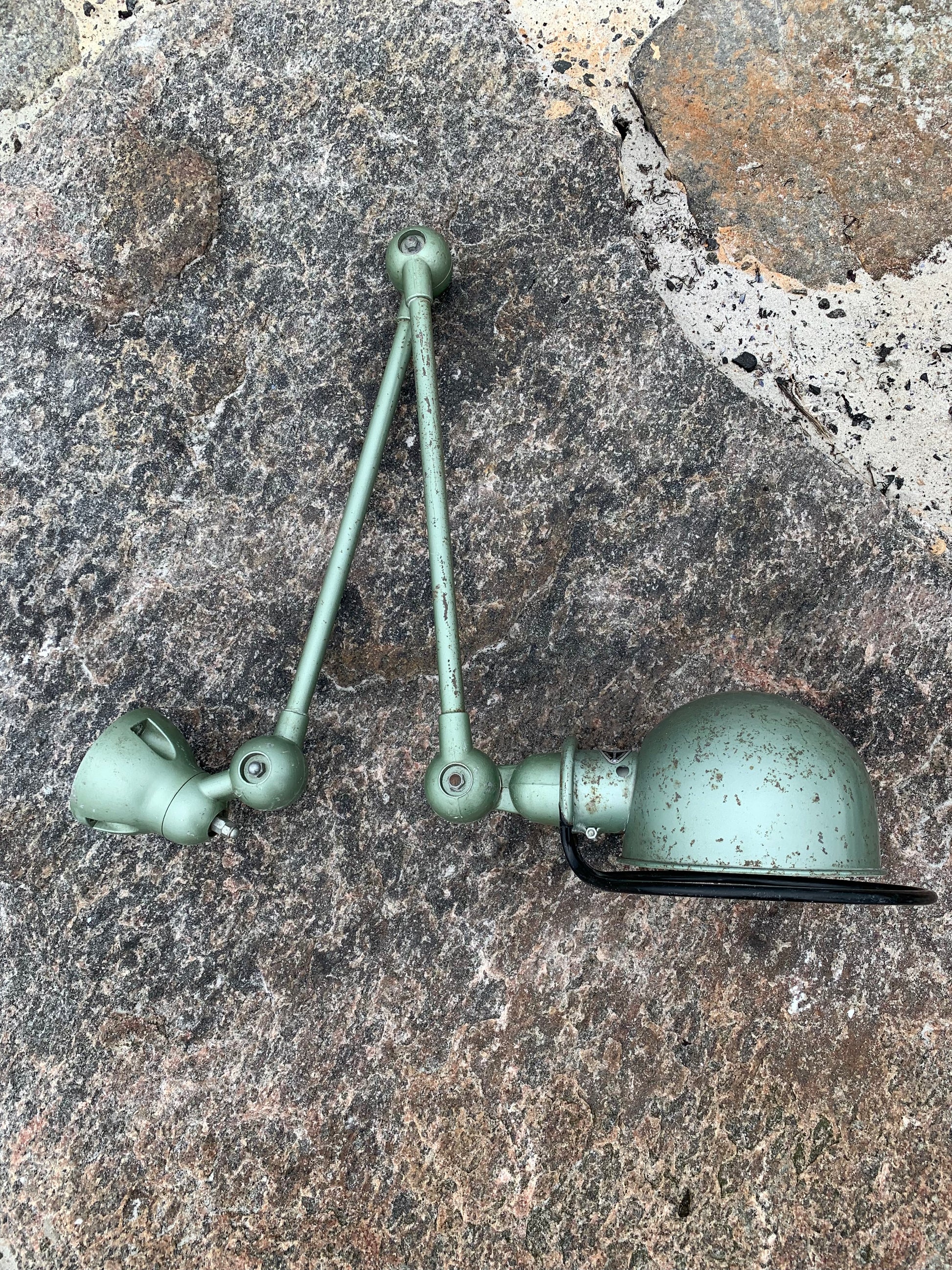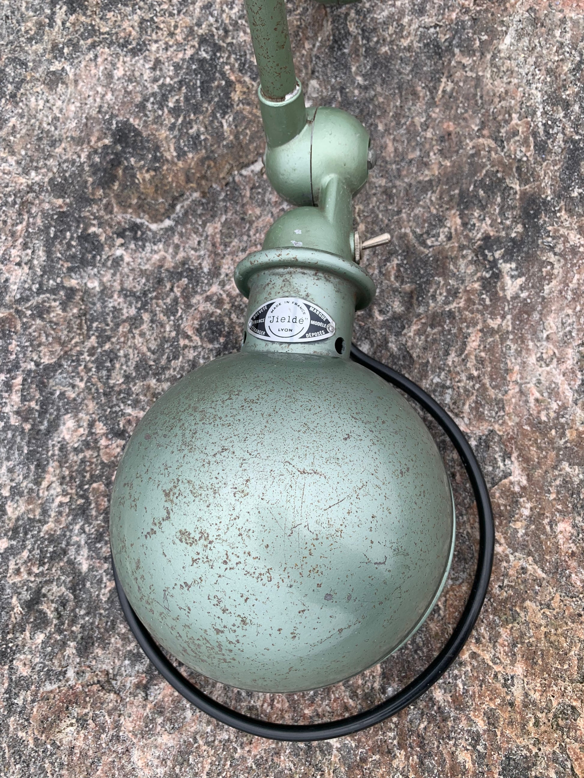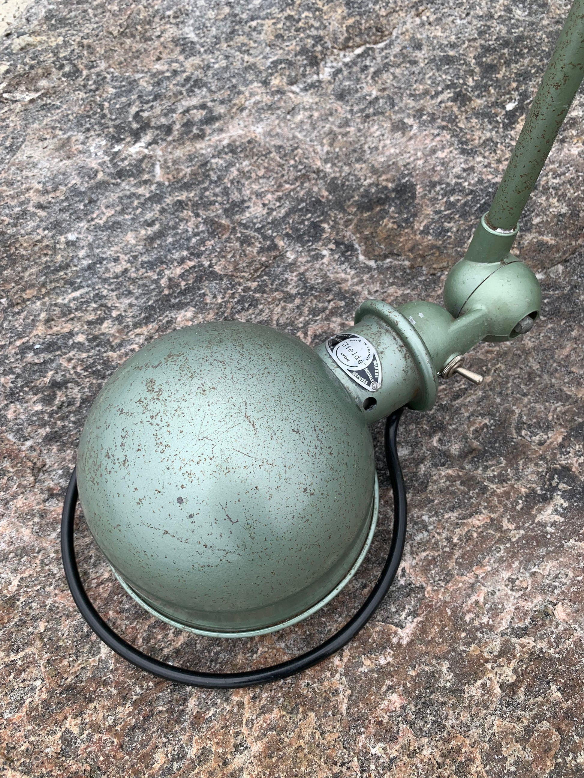 Vacker Jieldé-lampa i en härlig grön färg. Tidens tand har tagit ut sin rätt på lampan, som framstår med en patina och riktar sig till dig som ser det perfekta i det ofullkomliga.
