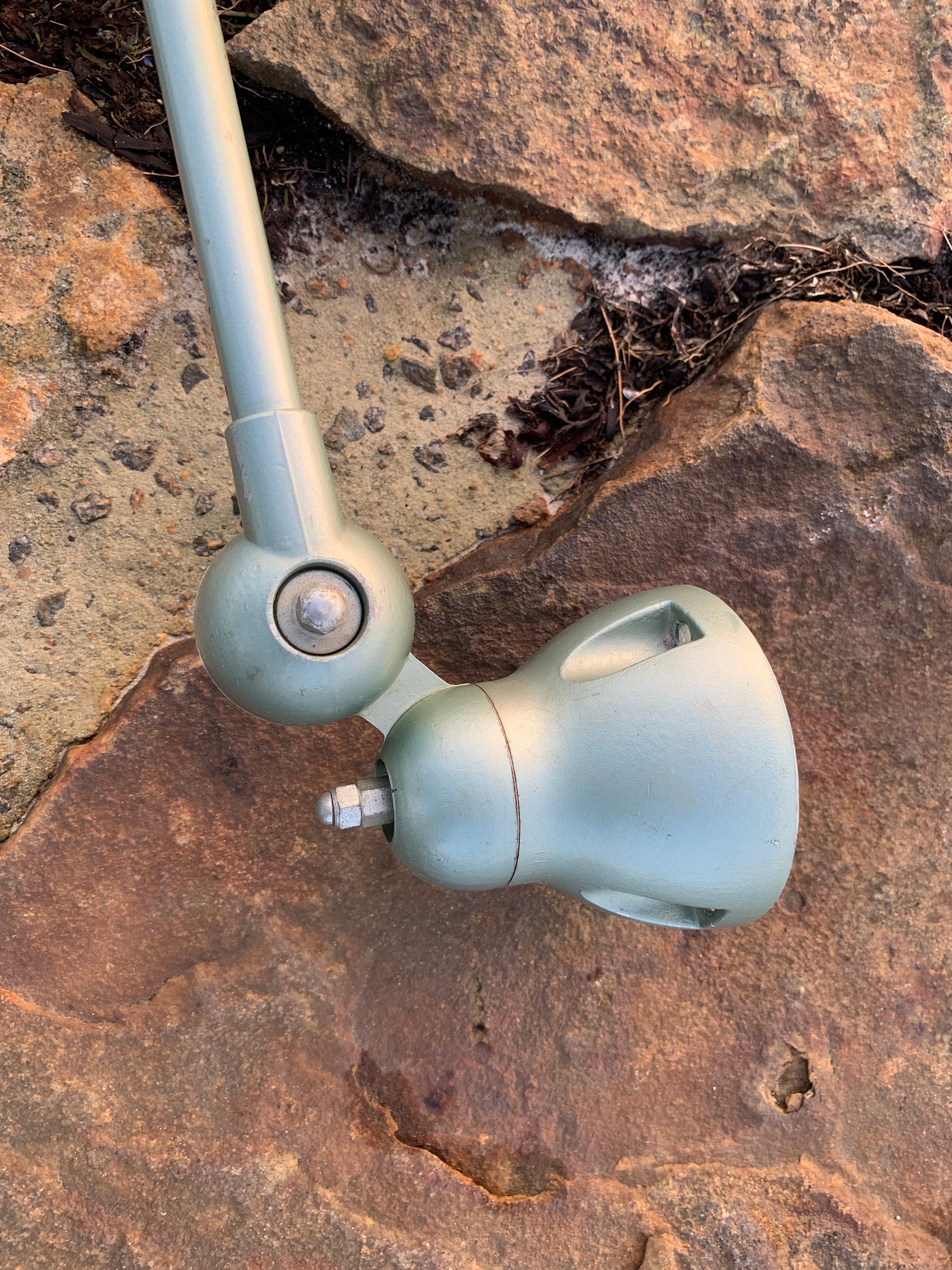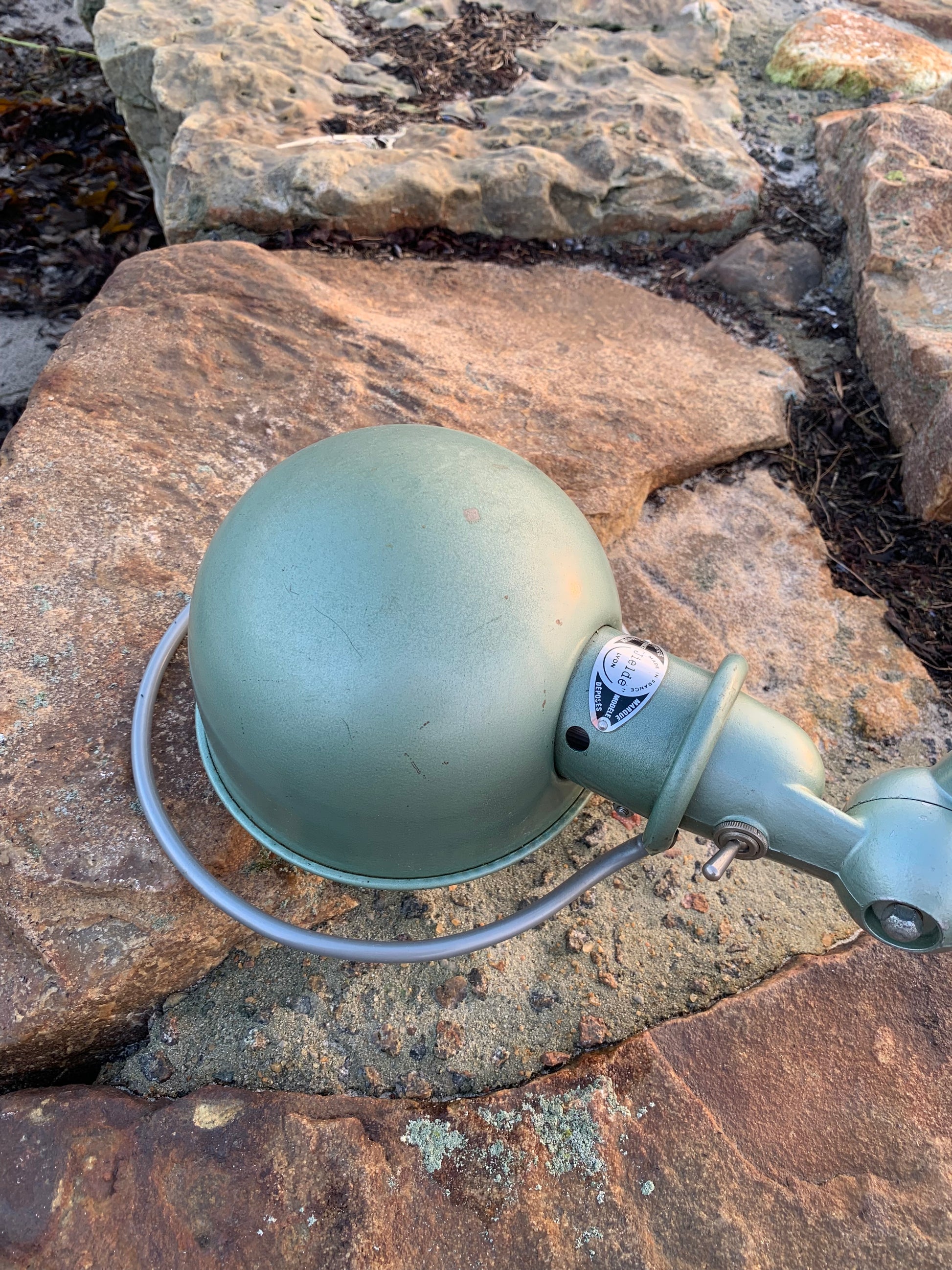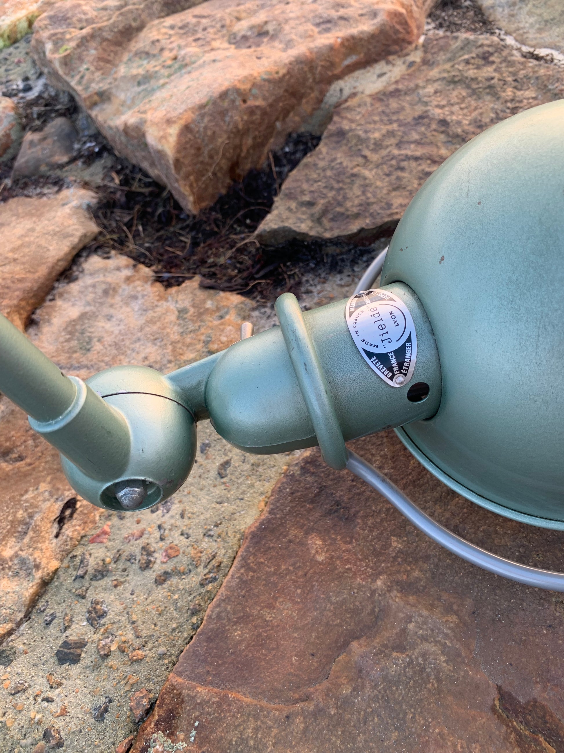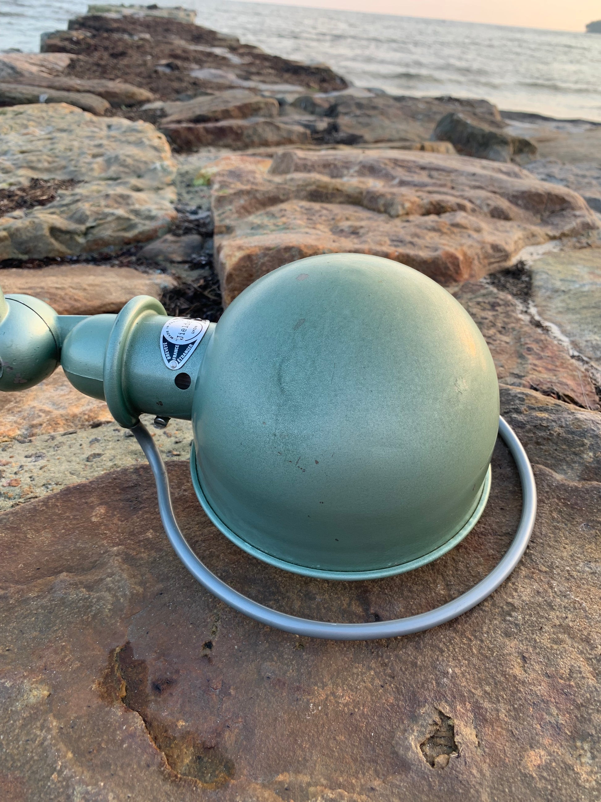 Vacker klassisk Jieldé-lampa i en härlig grön färg. Lampan har vissa åldersrelaterade bruksspår, vilket en sådan lampa (enligt oss) borde ha.