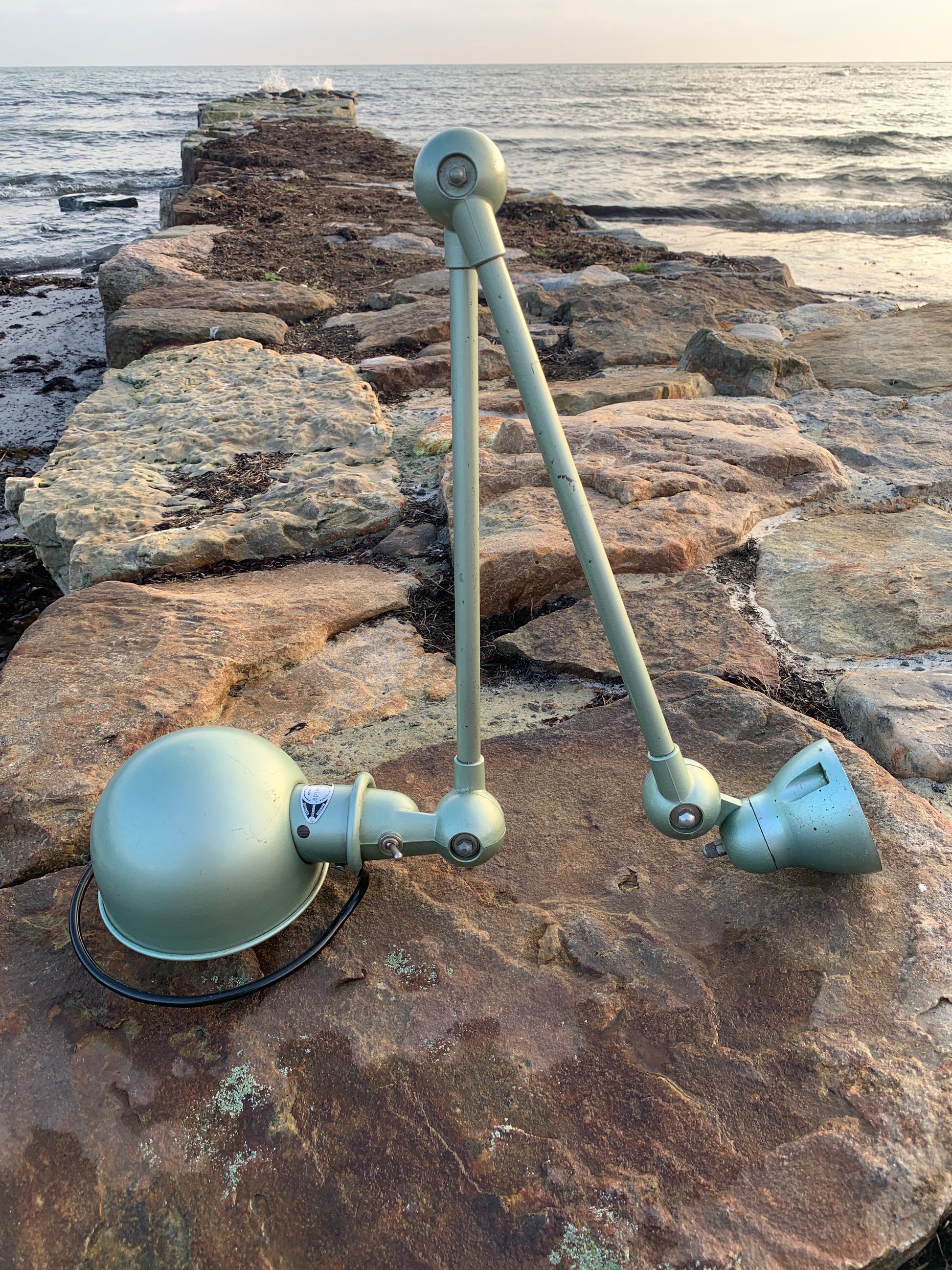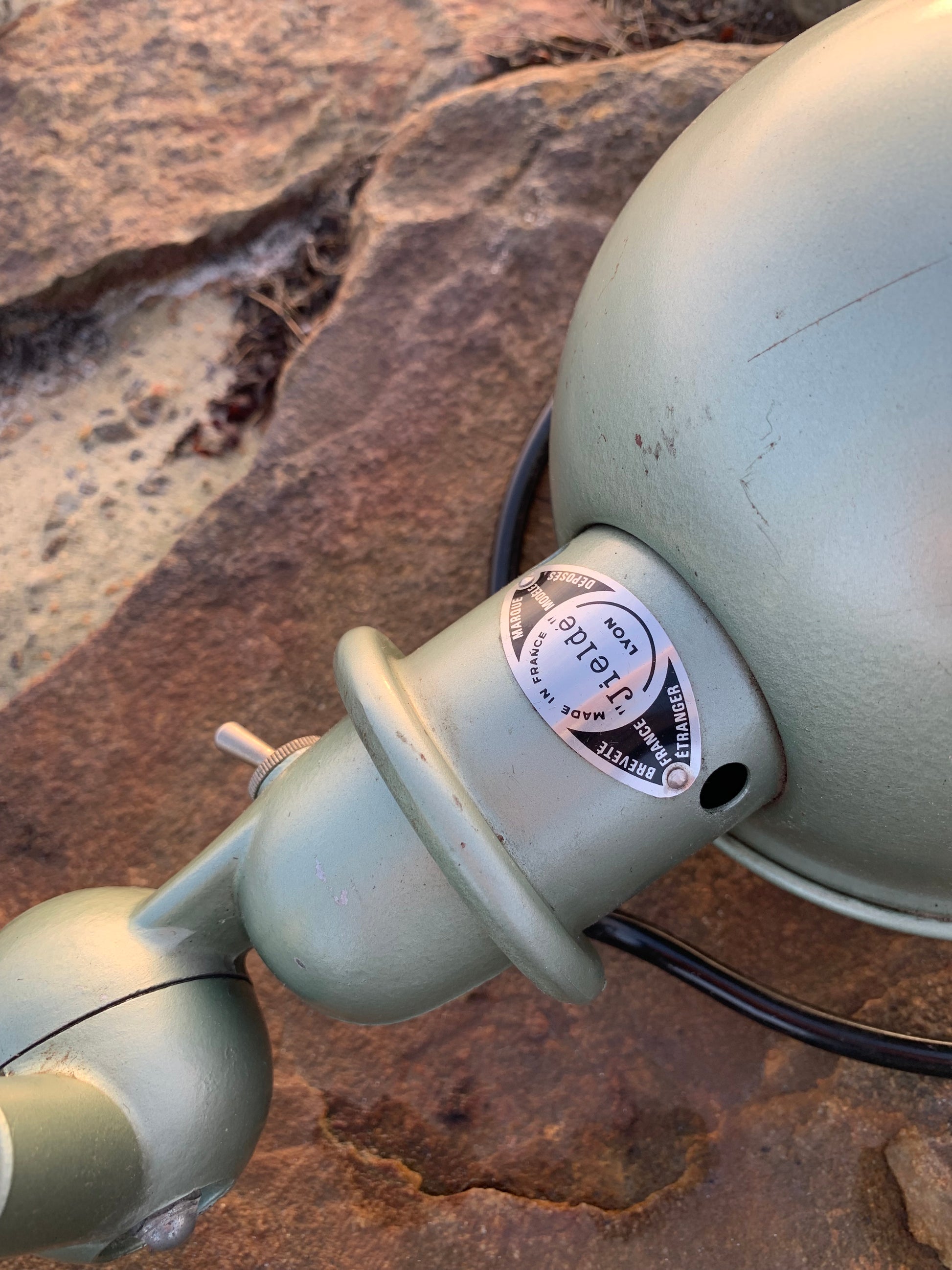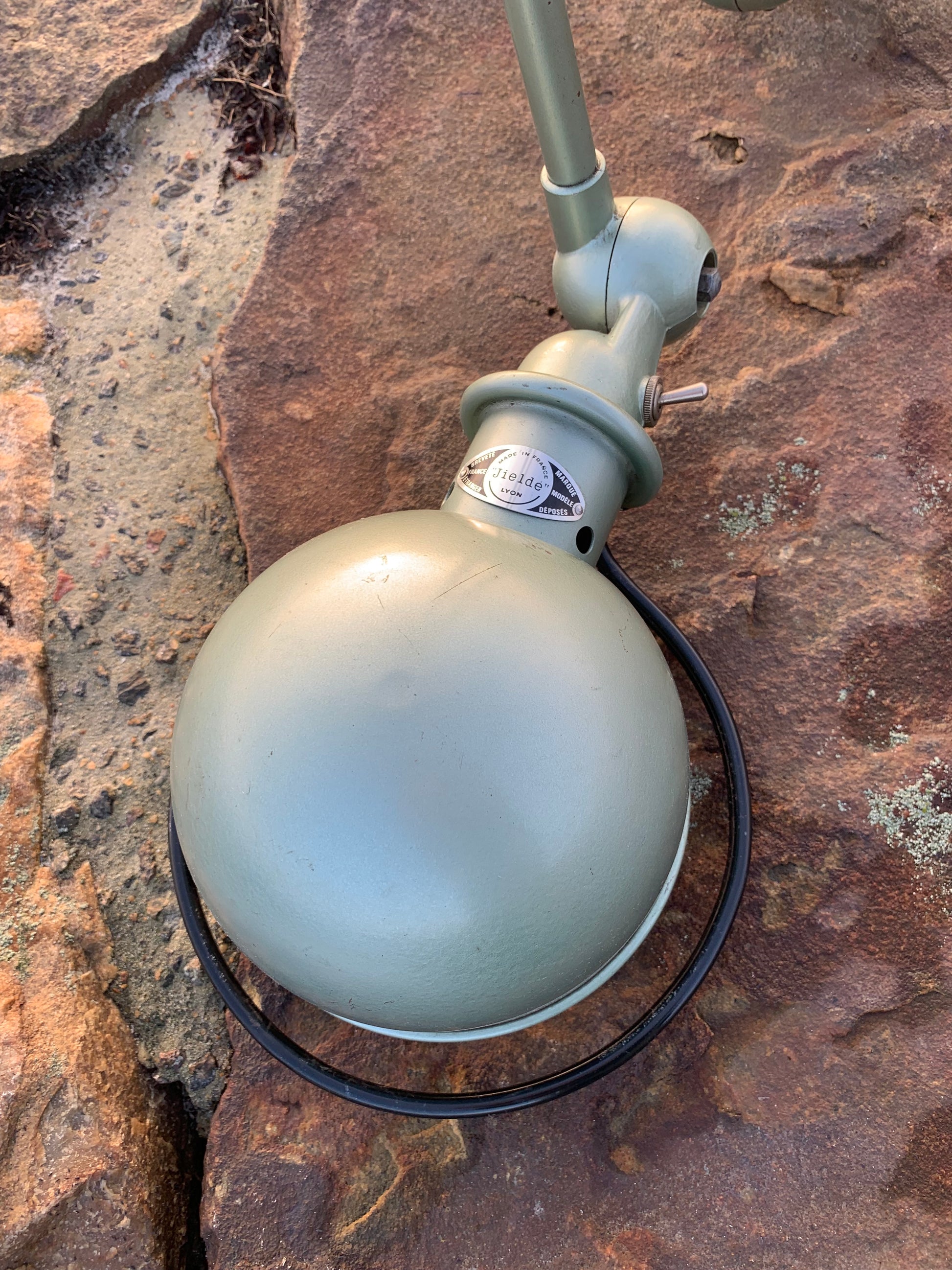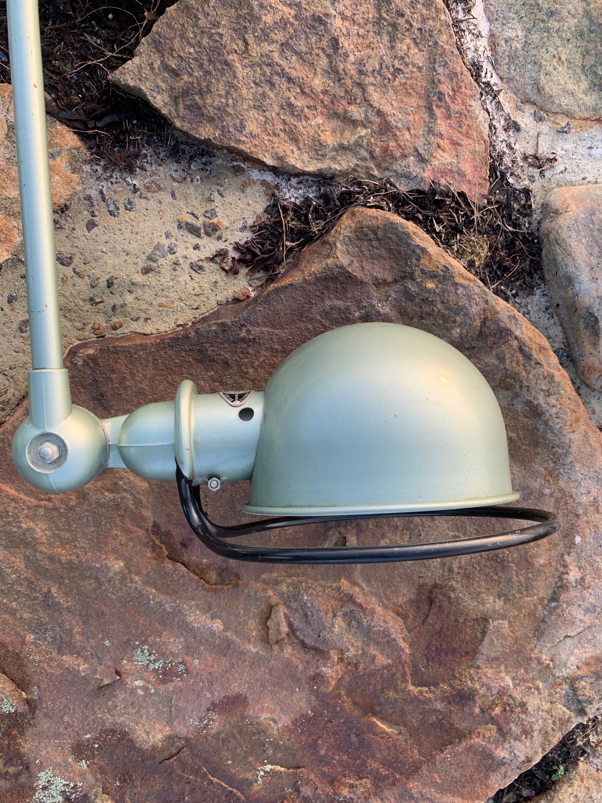 Vacker klassisk Jieldé-lampa i en härlig grön färg. Lampan har vissa åldersrelaterade bruksspår, vilket en sådan lampa (enligt oss) borde ha.