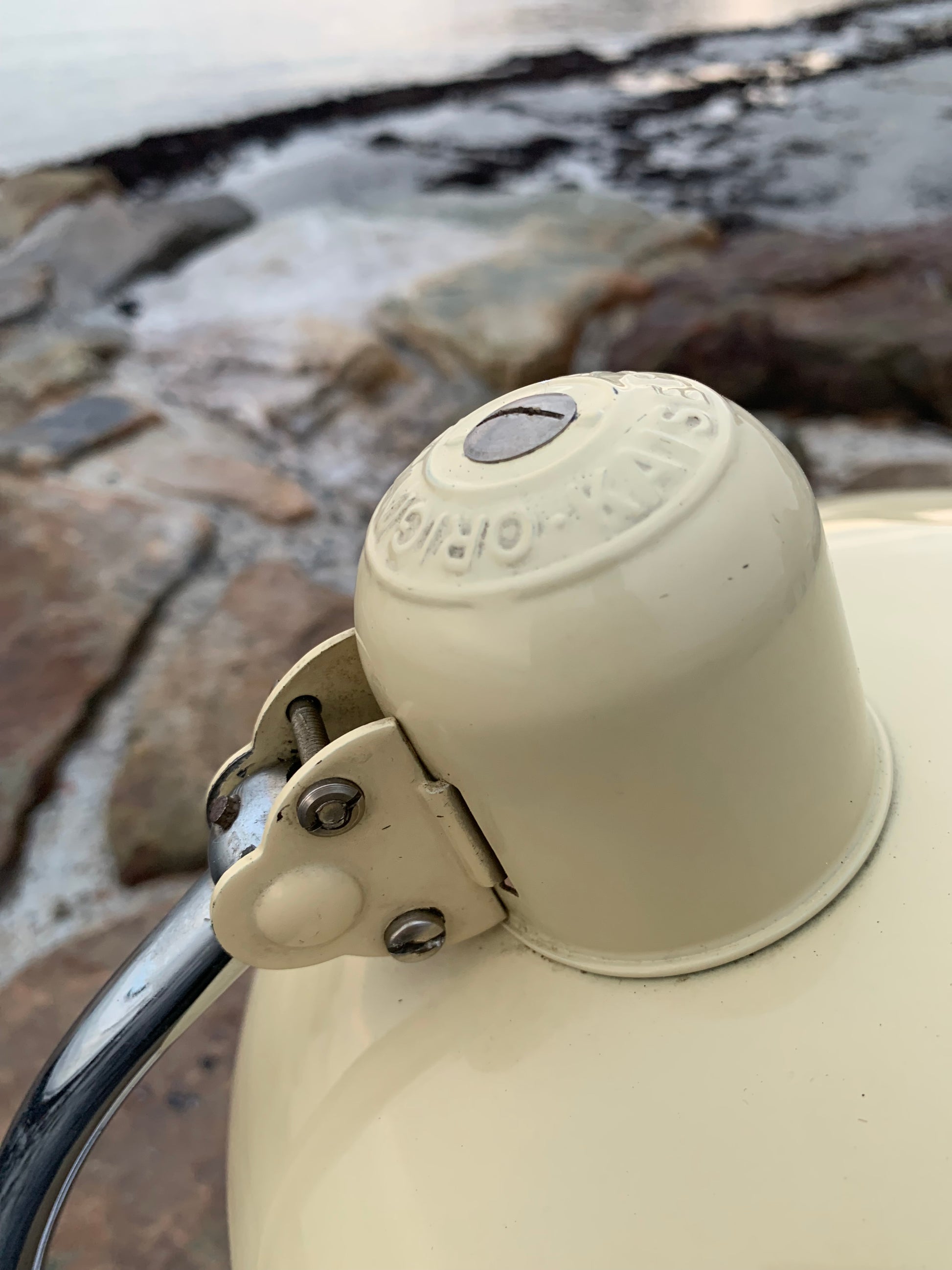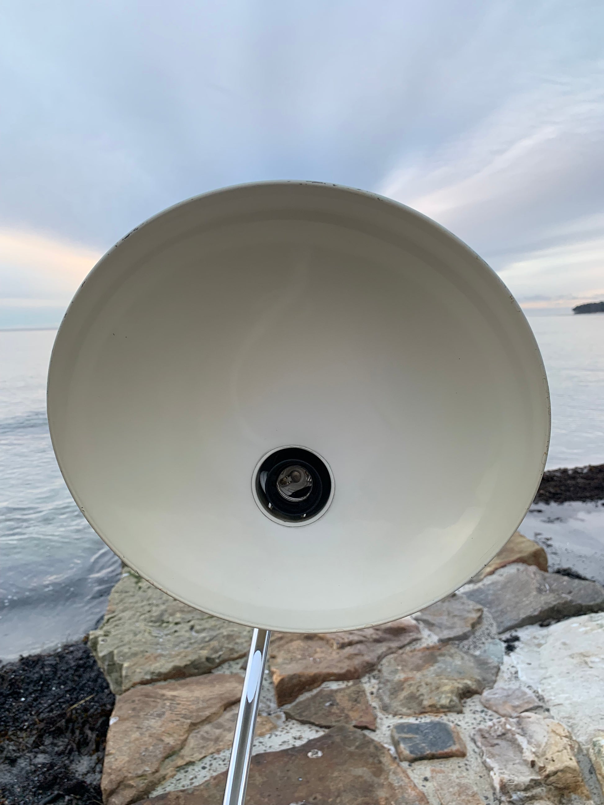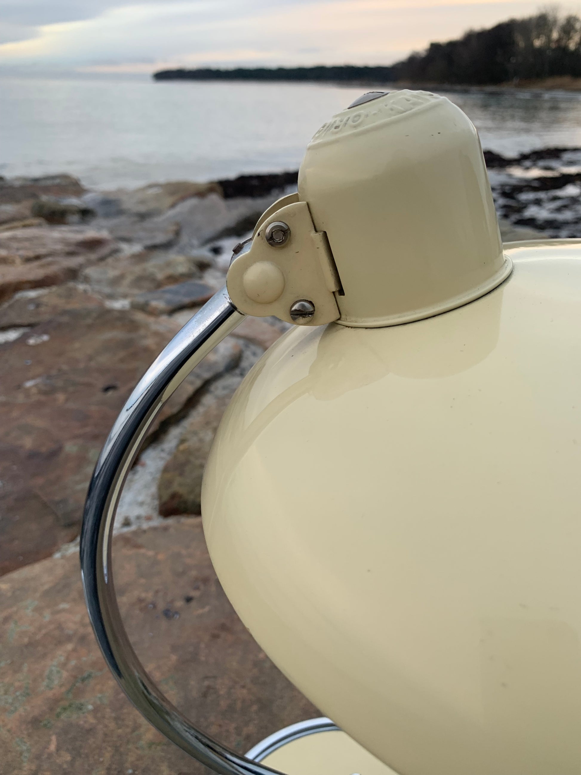 Detta exempel visas i originallack och med nya kablar. Lampan har några åldersrelaterade tecken på slitage, vilket en sådan lampa (enligt oss) borde ha. Lampan har en liten "soft touch" på ett ställe på ena sidan av skärmen och lite tunn färg, men överlag är den i fint vintageskick.
