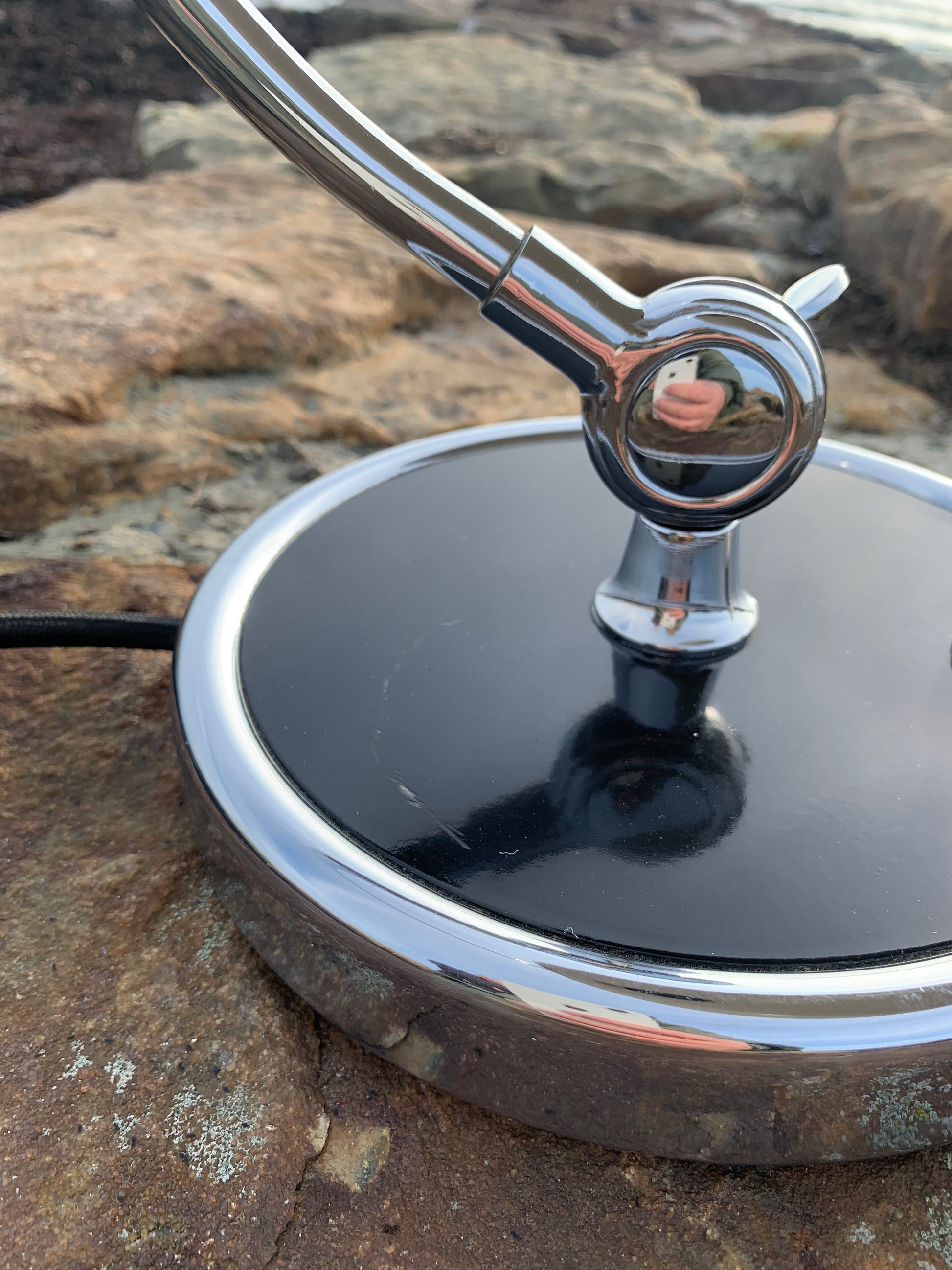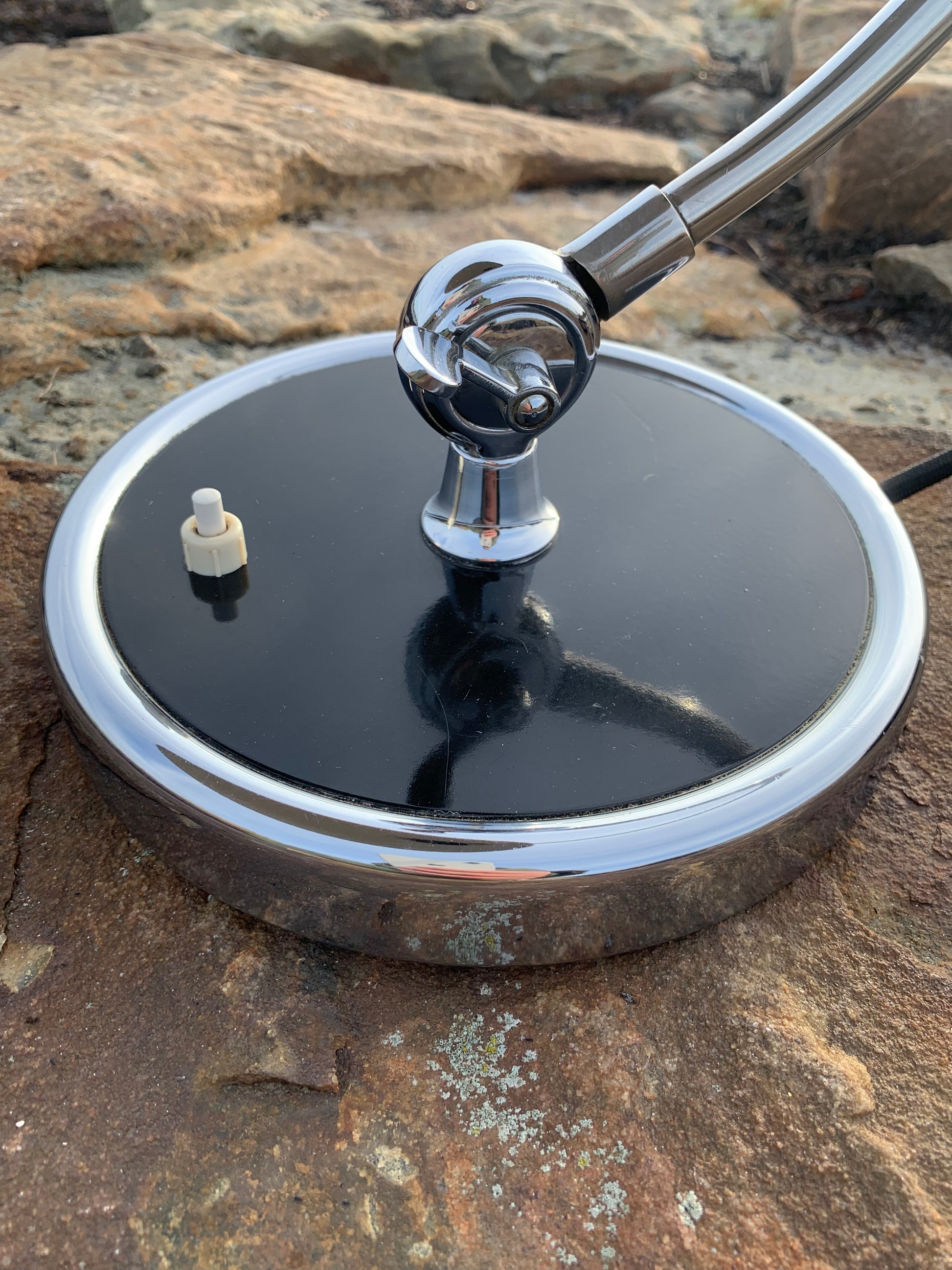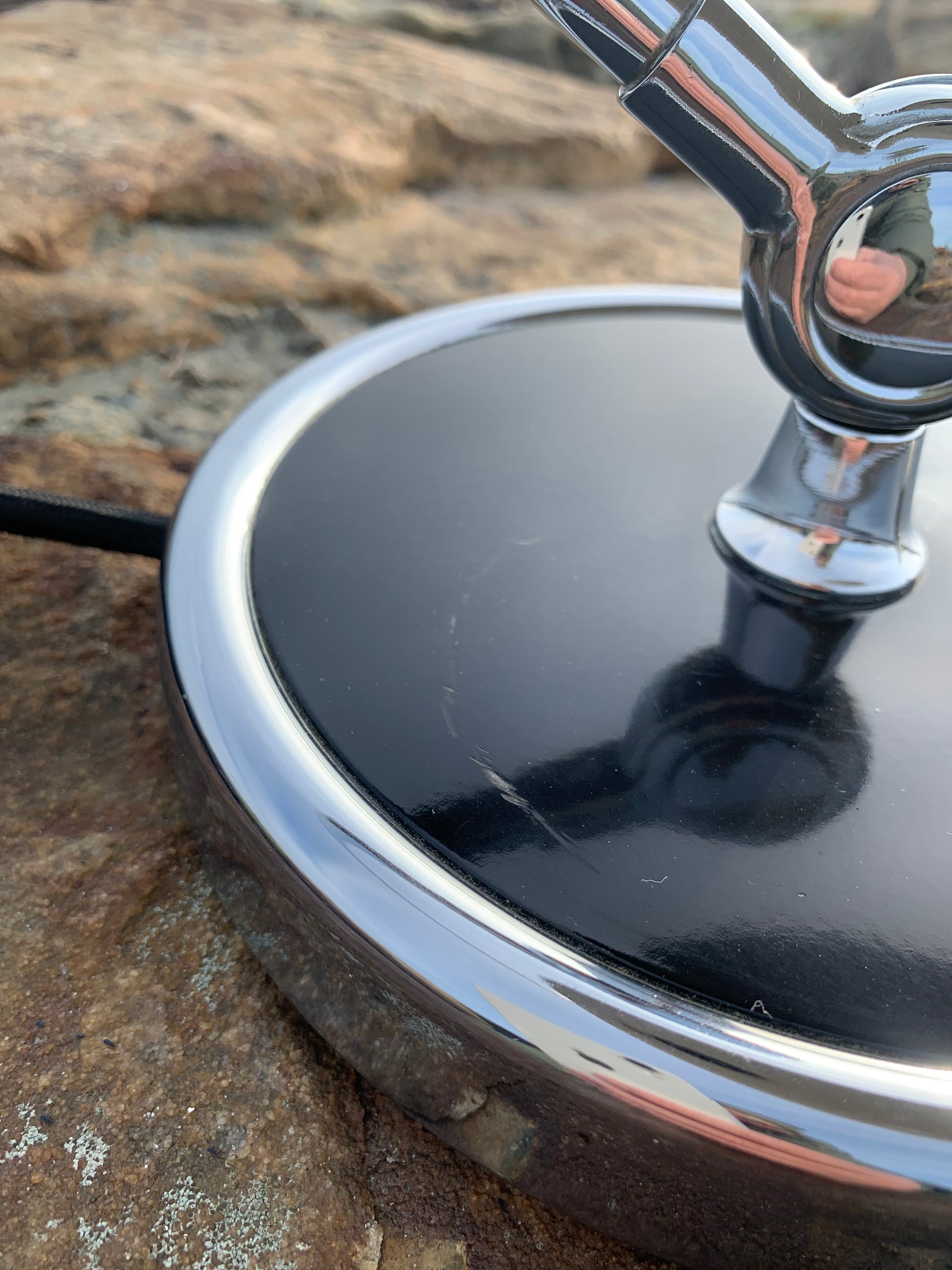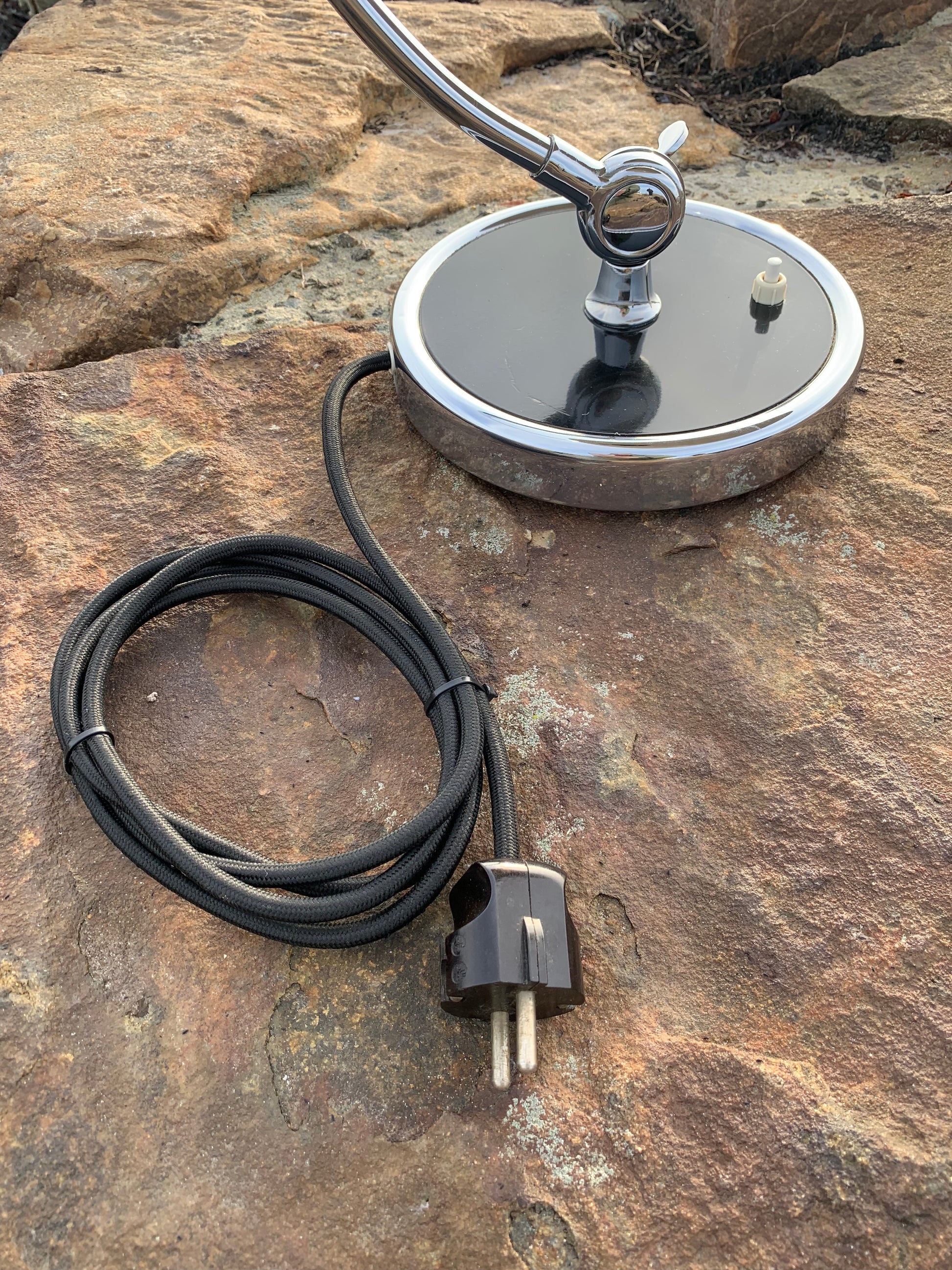 Detta exemplar framstår i originallackering och med nya kablar. Lampan har vissa åldersrelaterade tecken på slitage, vilket en sådan lampa (enligt oss) borde ha. Denna har en repa på basen och lite på kanten av skärmen (se bild) och därför riktar sig lampan till er som ser det perfekta i det ofullkomliga.