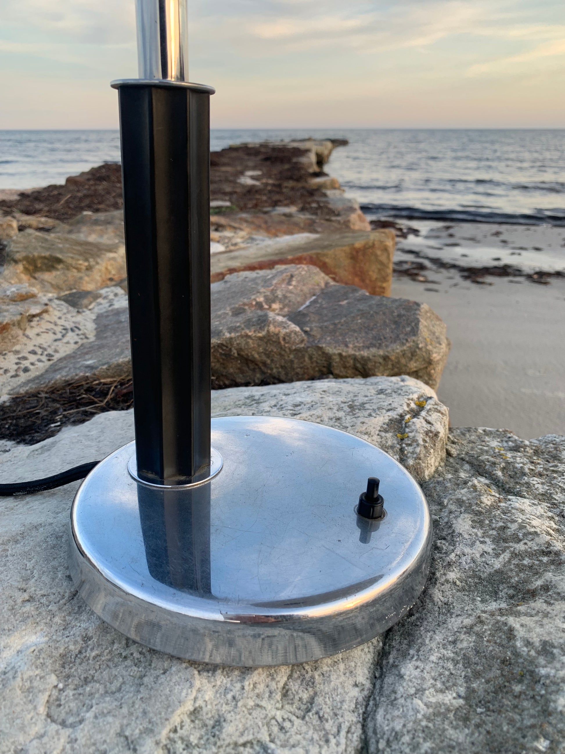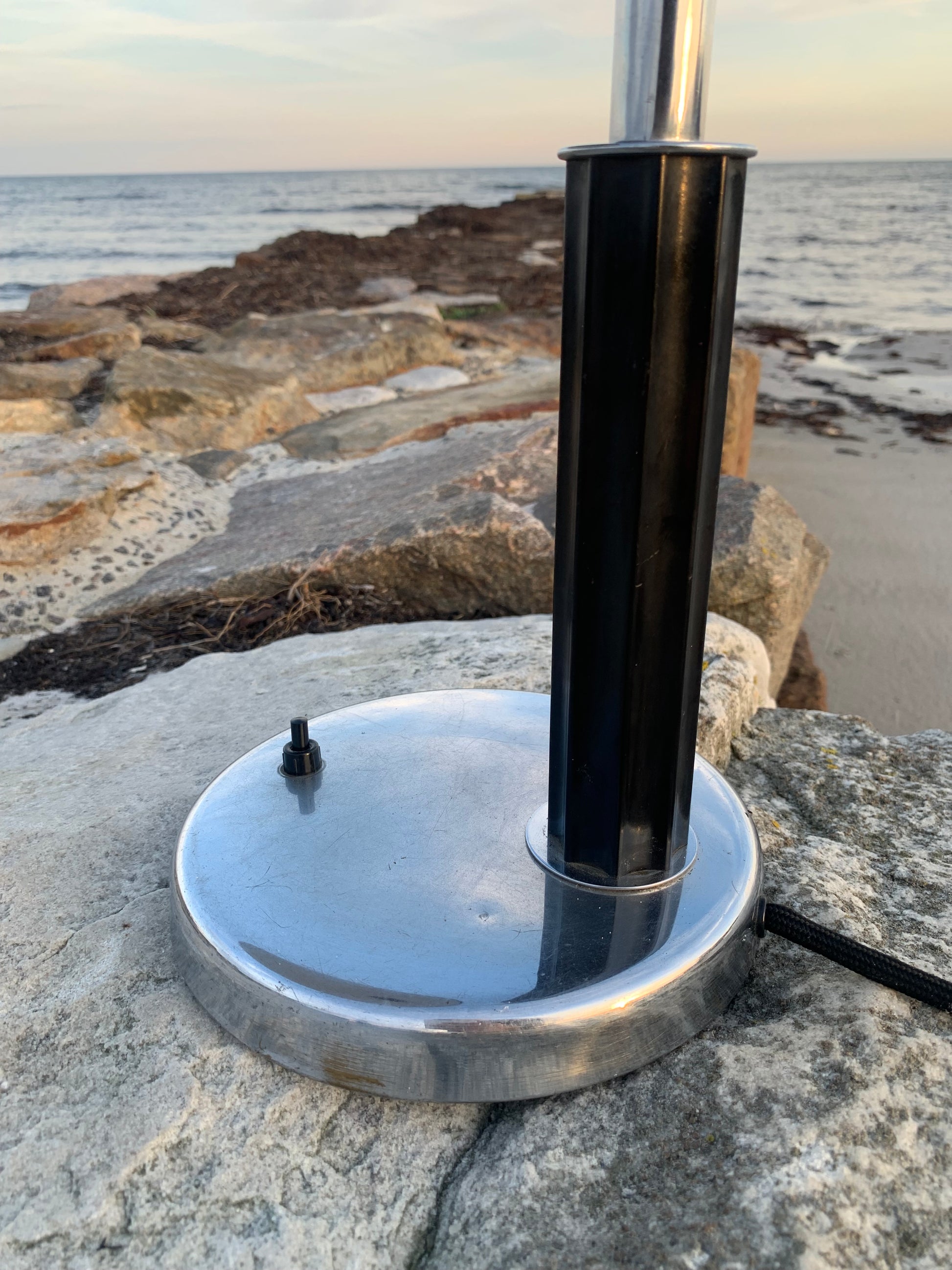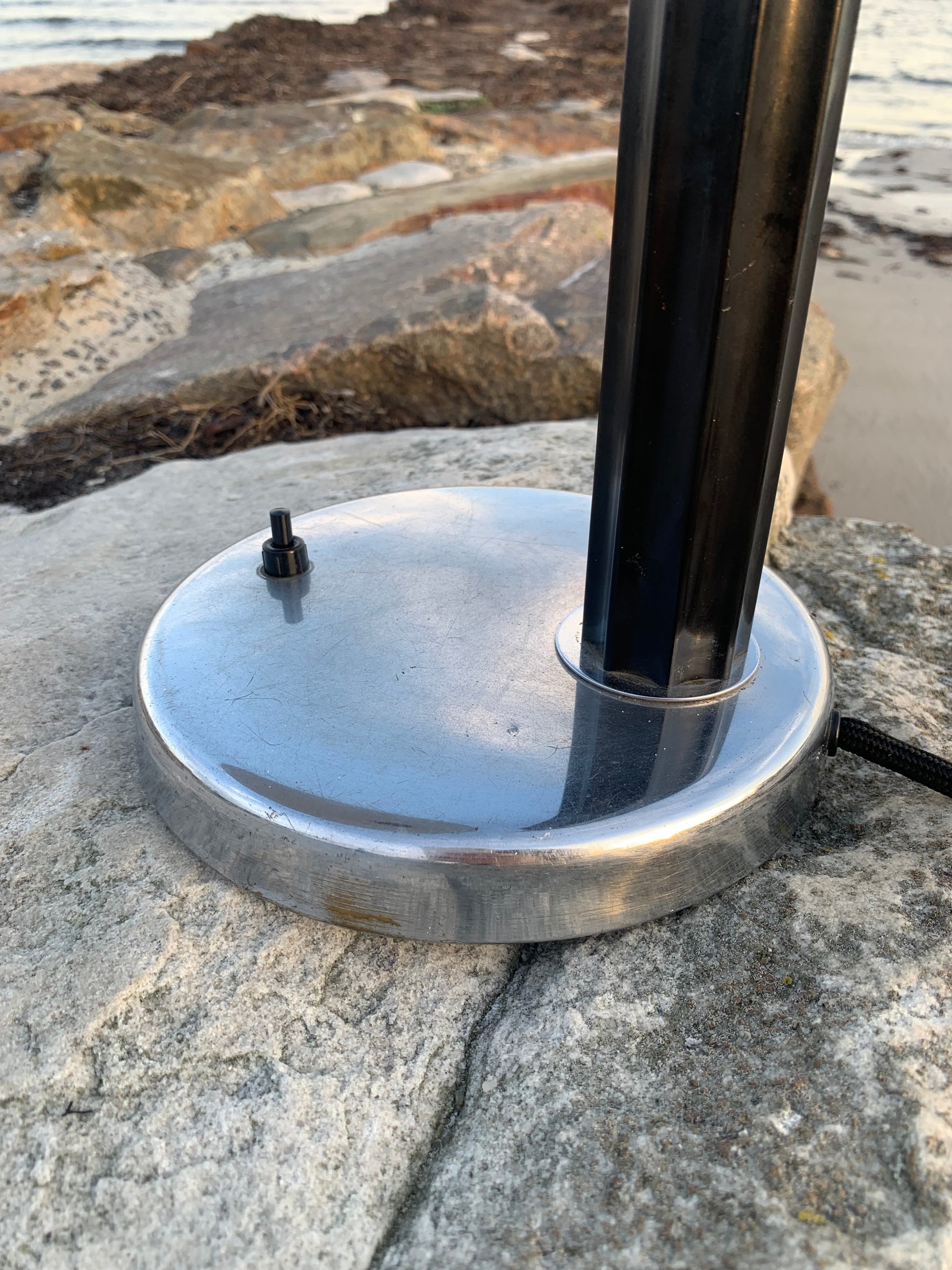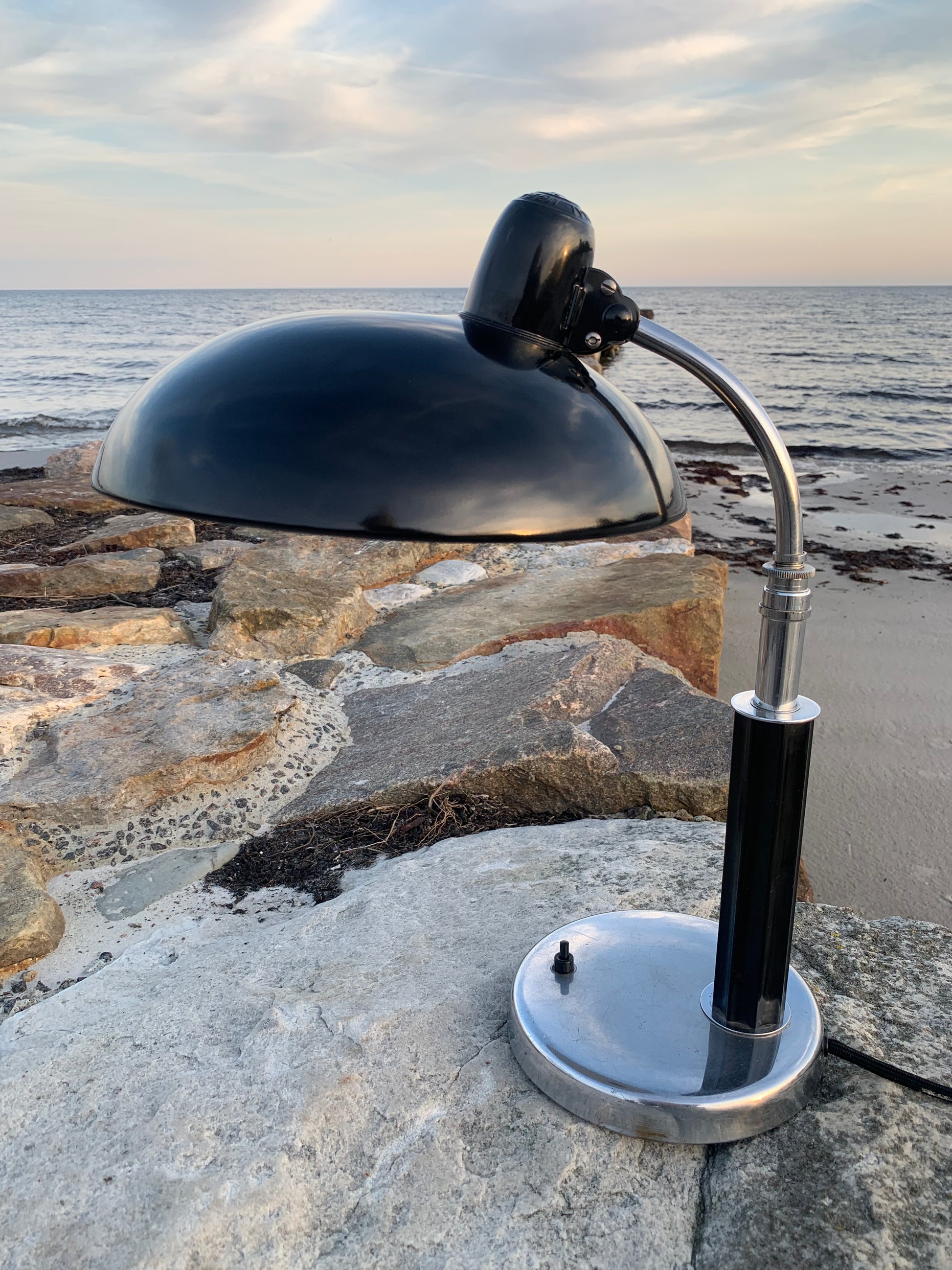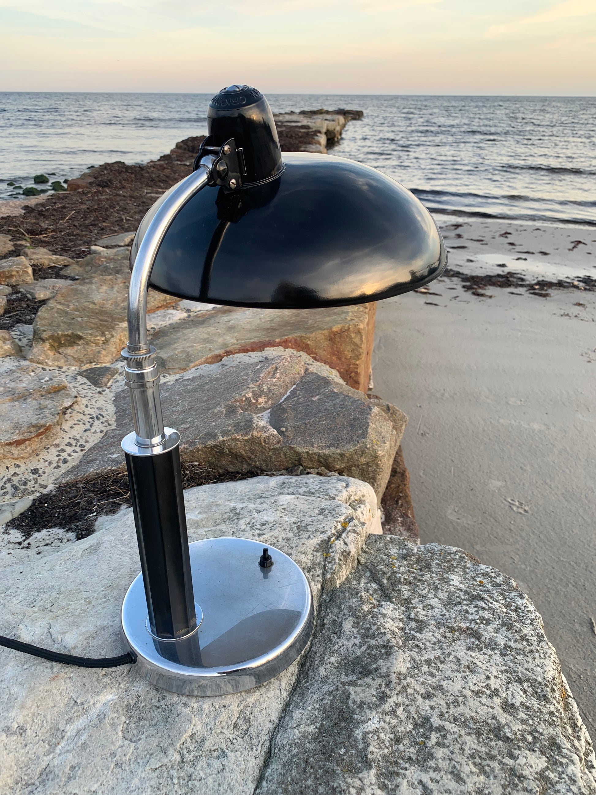 Denna lampa är troligen från mitten av 1930-talet och är ganska unik. Den nedre delen av "armen" är tillverkad av bakelit. Lampan är också höj- och sänkbar. Lampan har vissa åldersrelaterade bruksspår, vilket en sådan lampa (enligt oss) borde ha.
