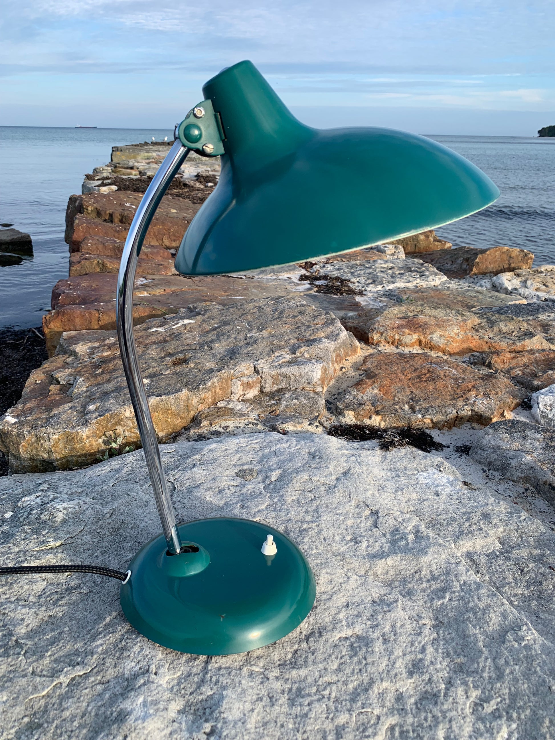 Vacker Kaiser Idell-lampa designad av Christian Dell. Denna vackra klassiker riktar sig till dig som ser skönheten i god och tidlös design. De fina gamla Kaiser Idell-lamporna är ett bevis på god kvalitet och gott hantverk. Dessa vackra gamla vintagelampor har ofta vissa åldersrelaterade tecken på slitage, vilket både förstärker äktheten och originaliteten. Dessa tecken både vittnar om och berättar historien om lampans resa genom flera decennier.