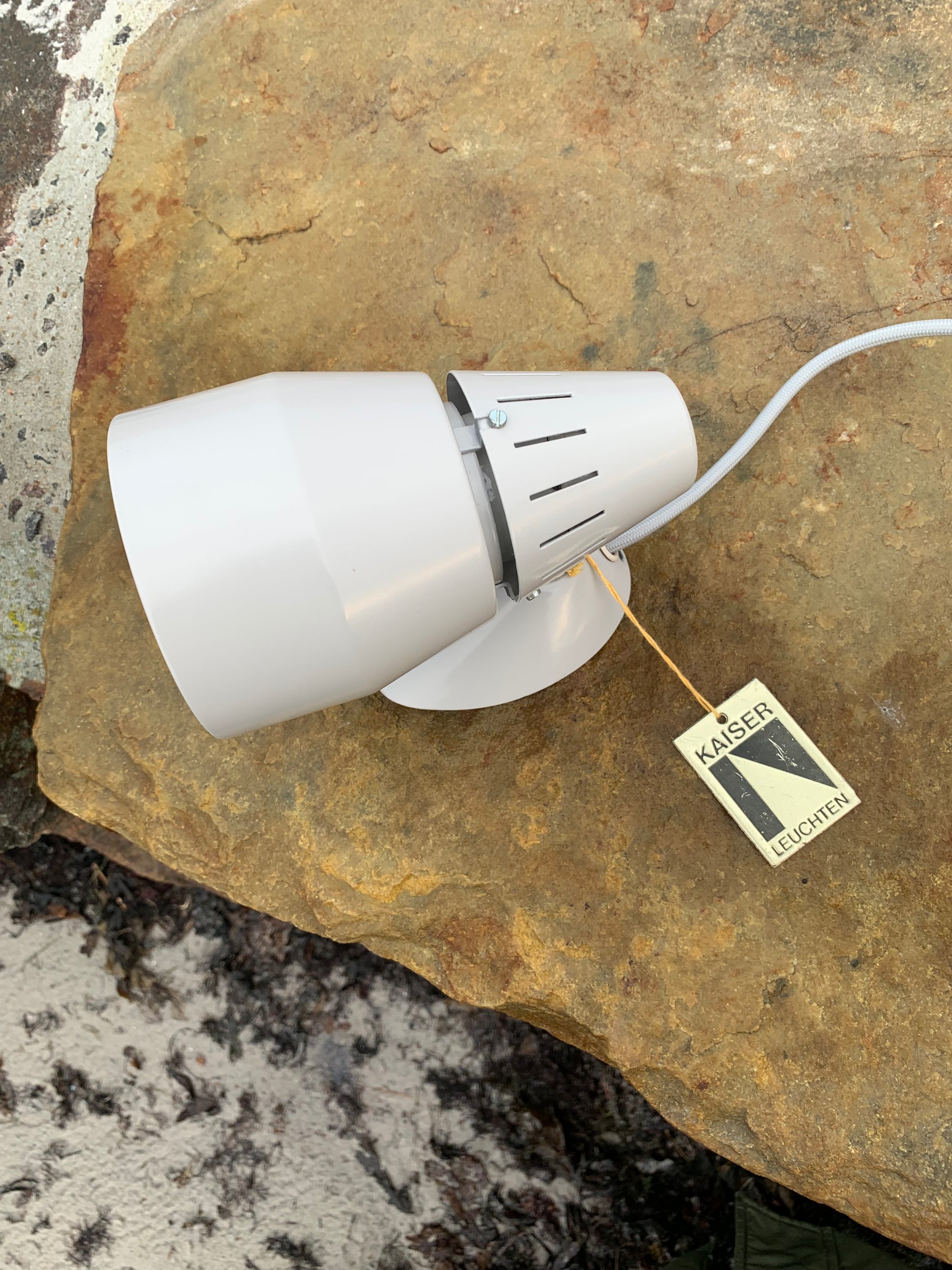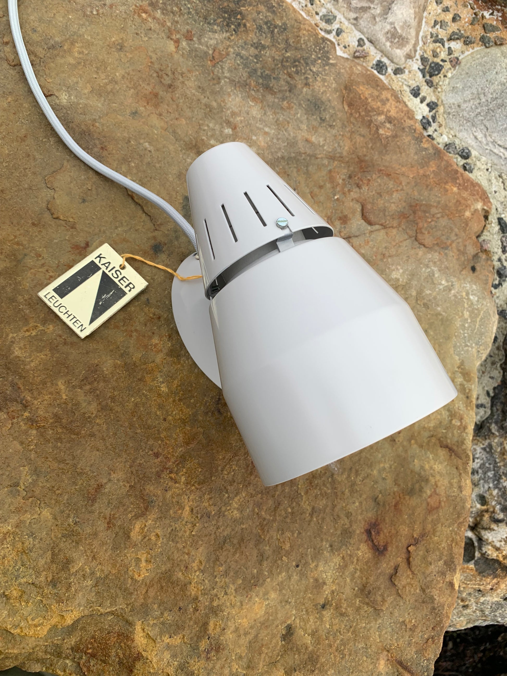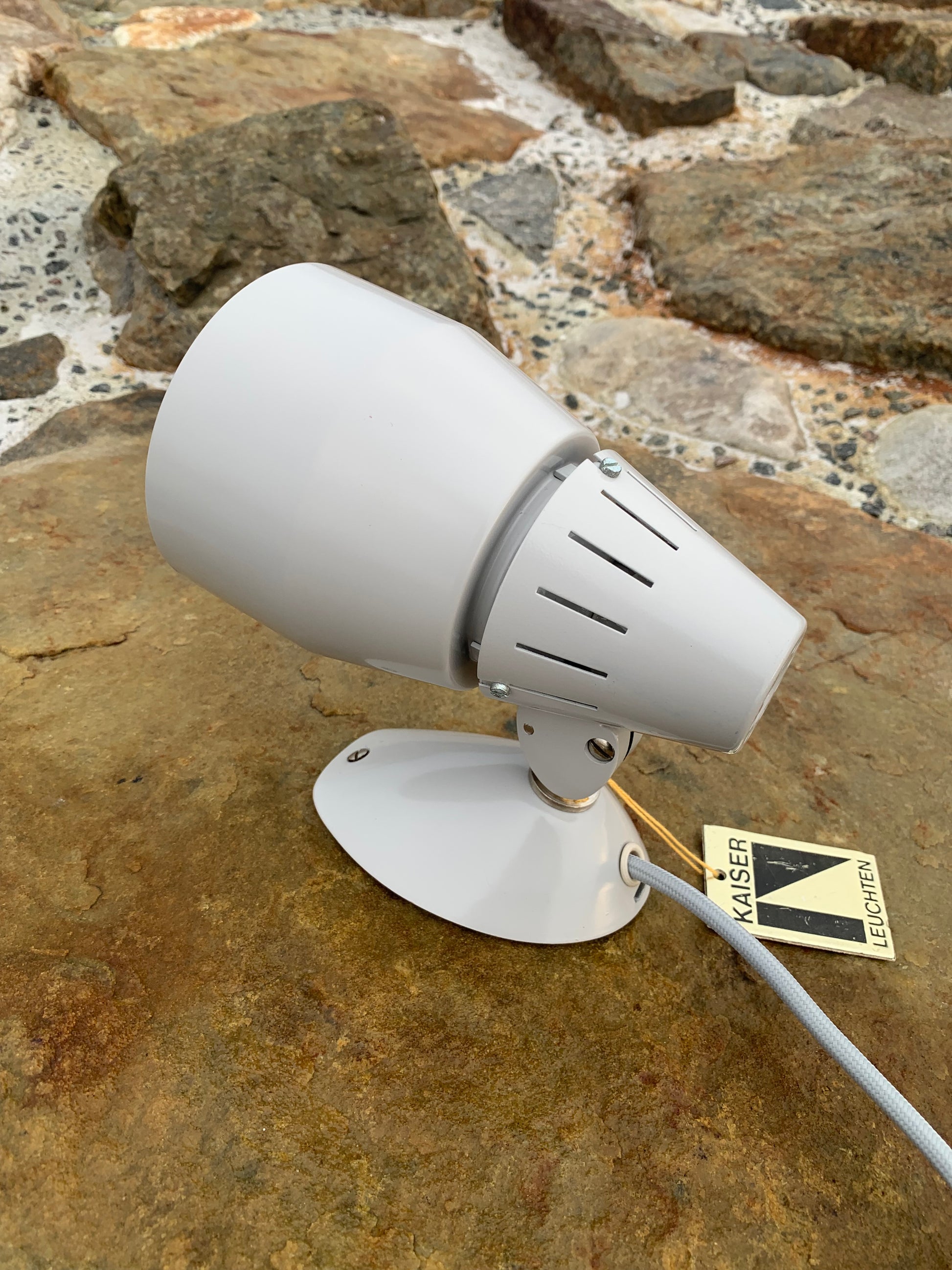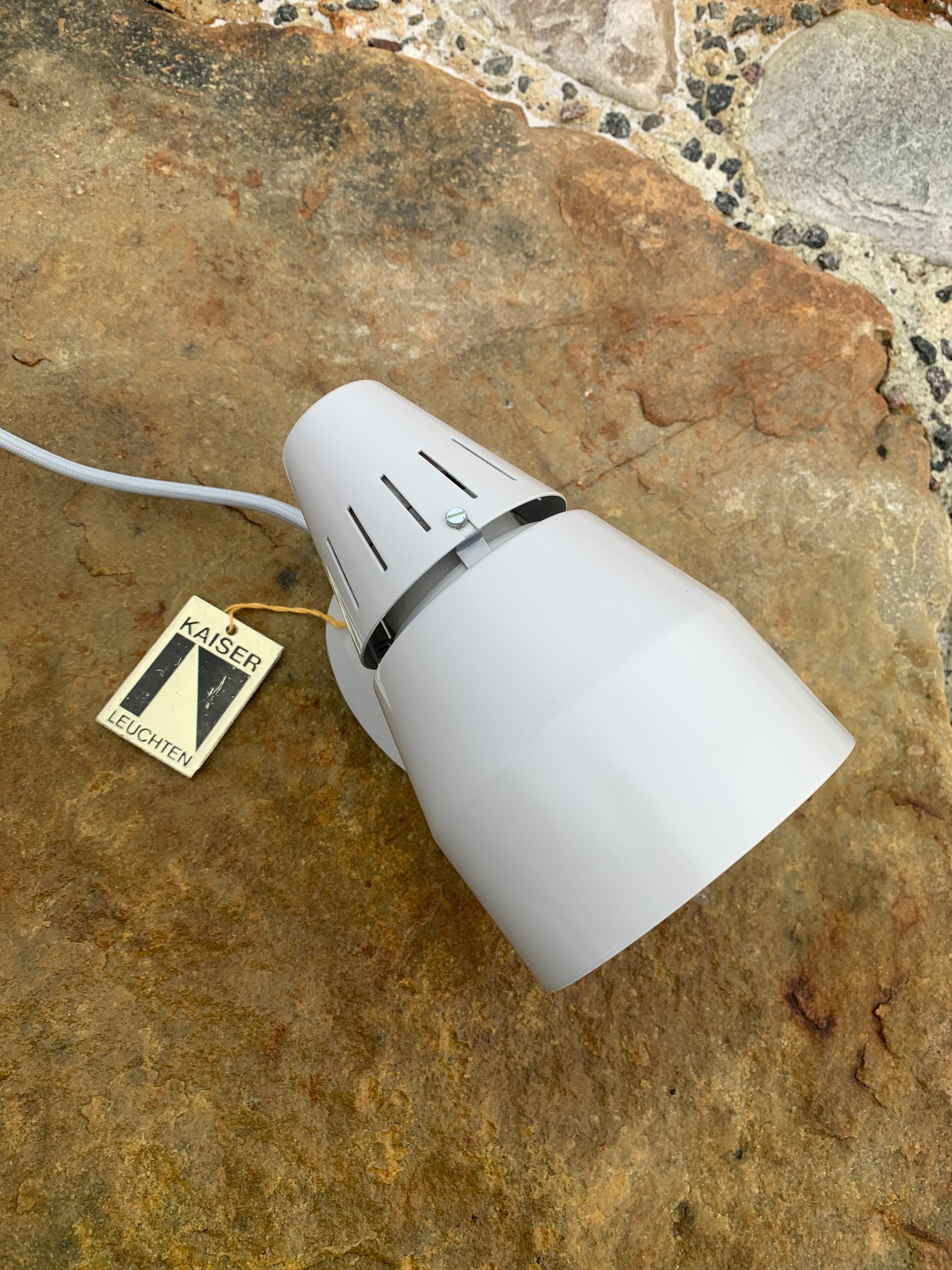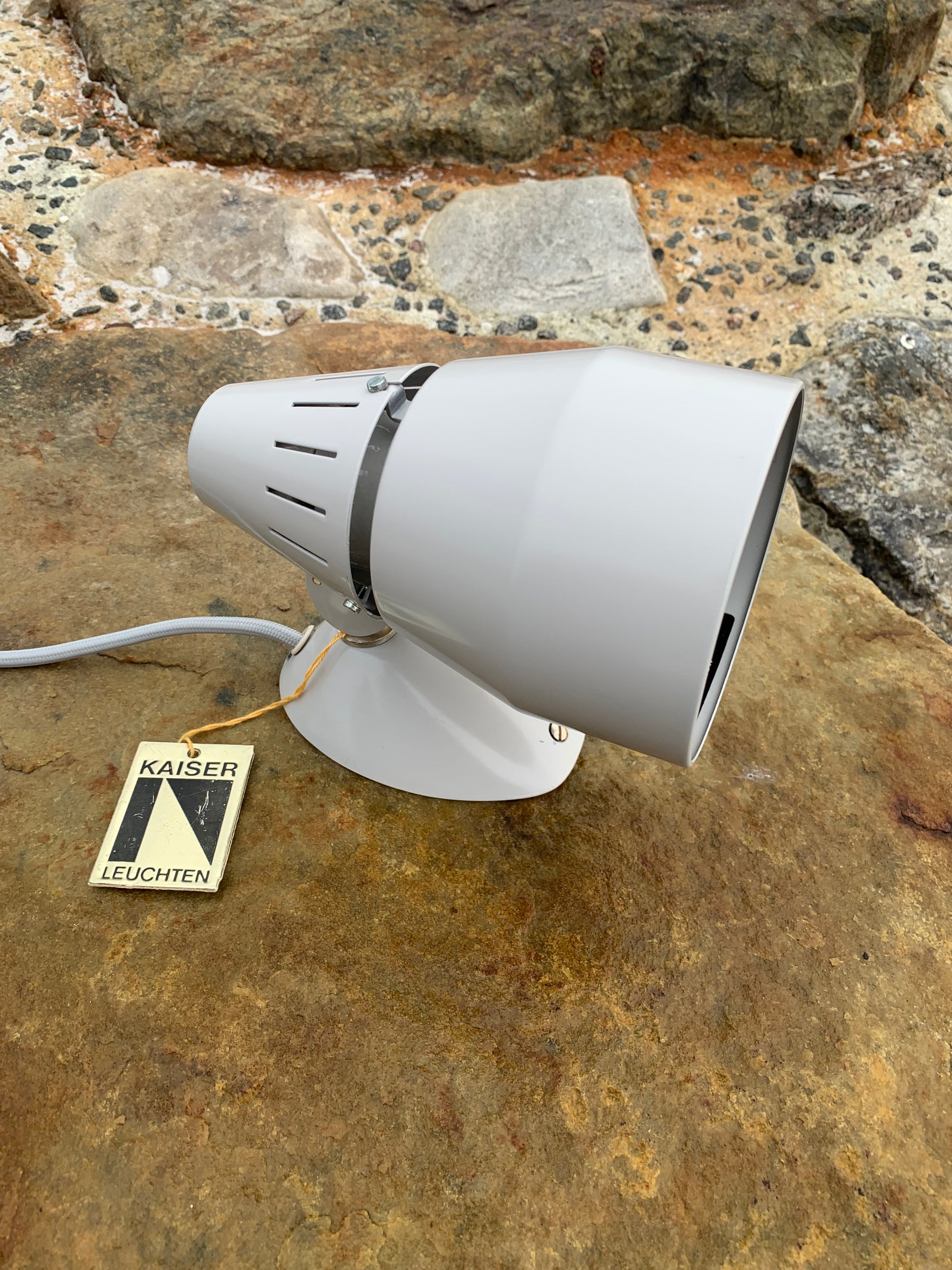 Kaiser Leuchten i original grått. Lampan har nya kablar och nästan inga tecken på slitage då den aldrig har använts. Därför är den i mycket gott vintageskick. En rolig och sällsynt detalj är att originaletiketten fortfarande sitter kvar på lampan.