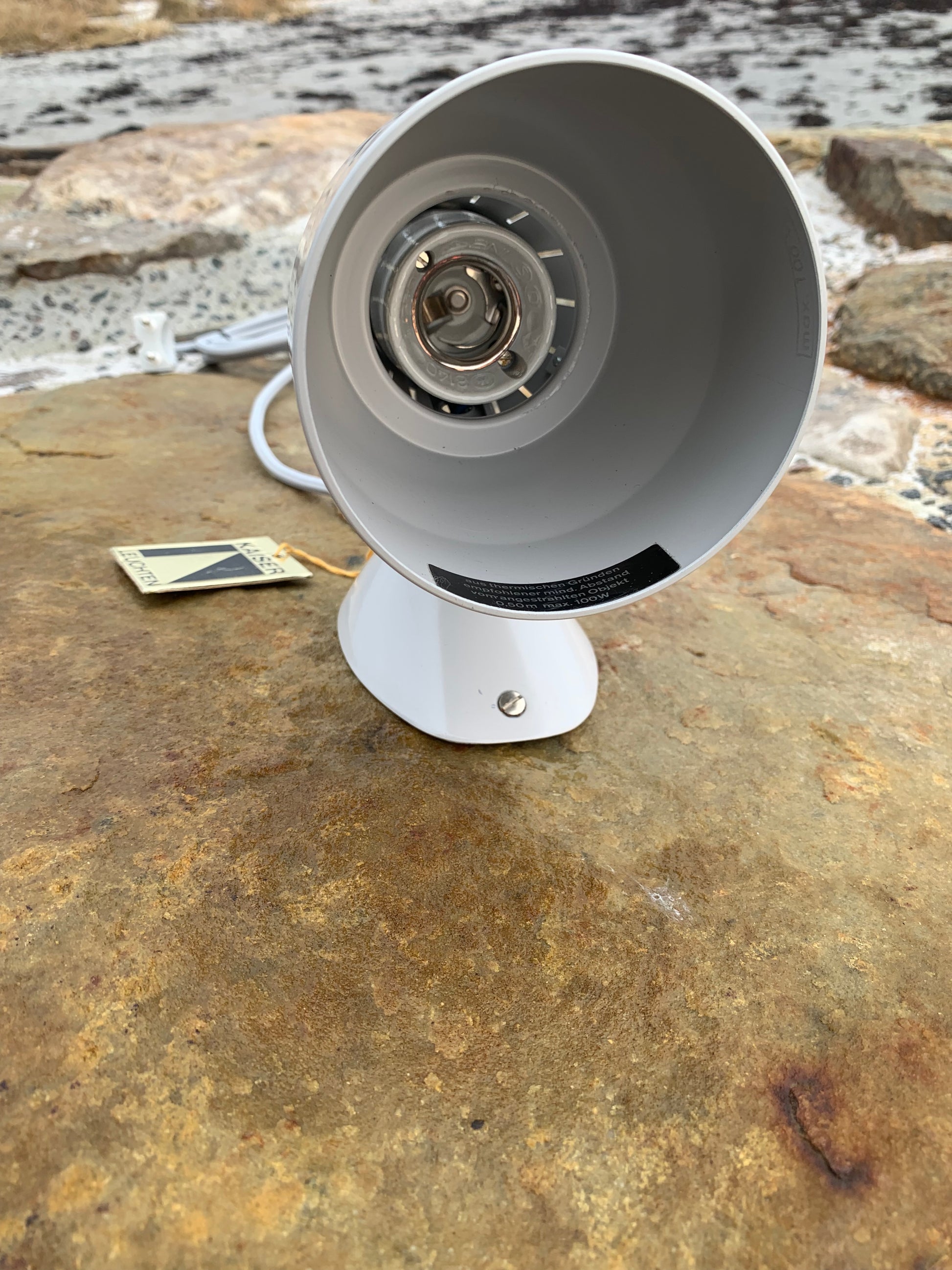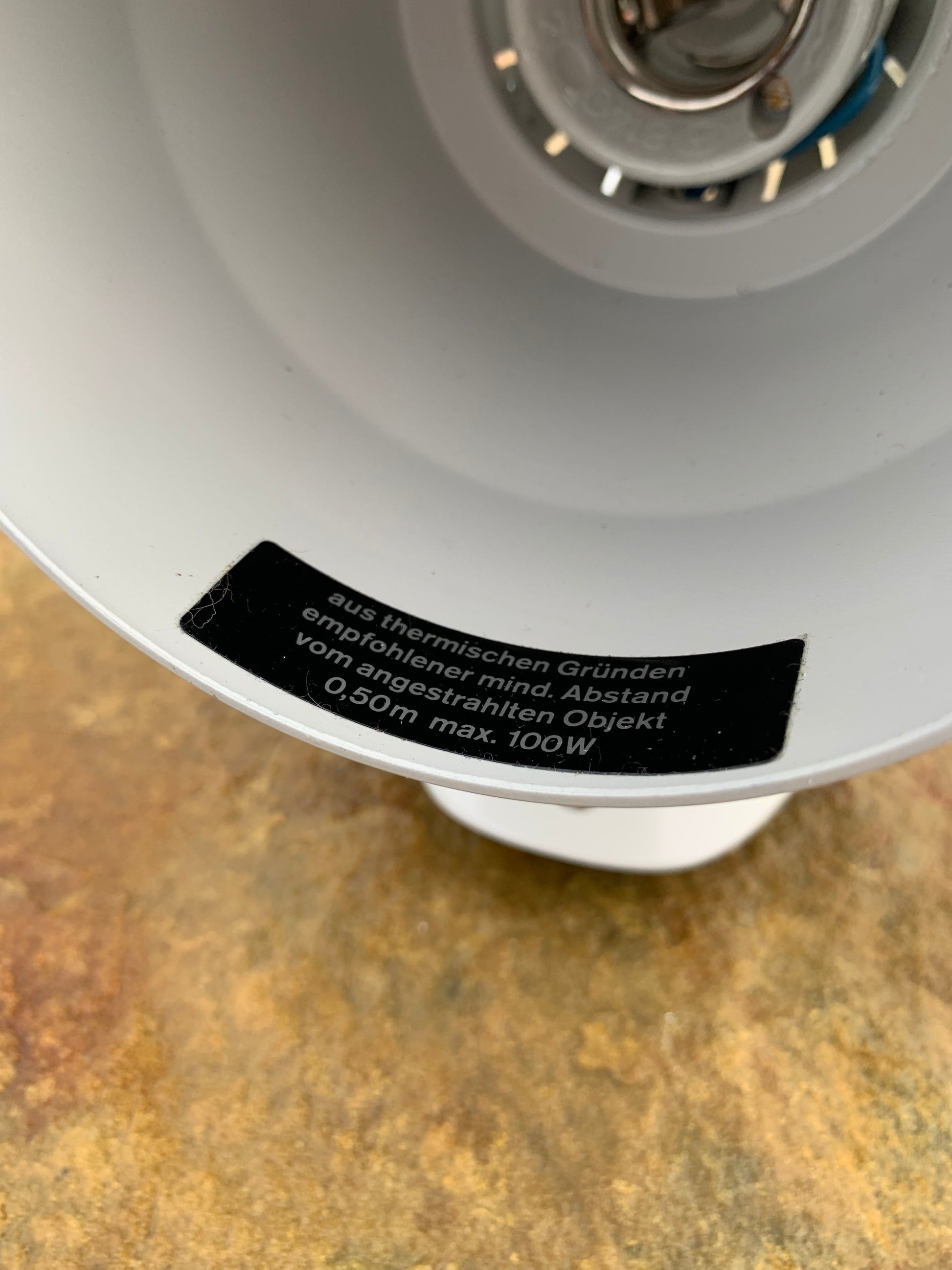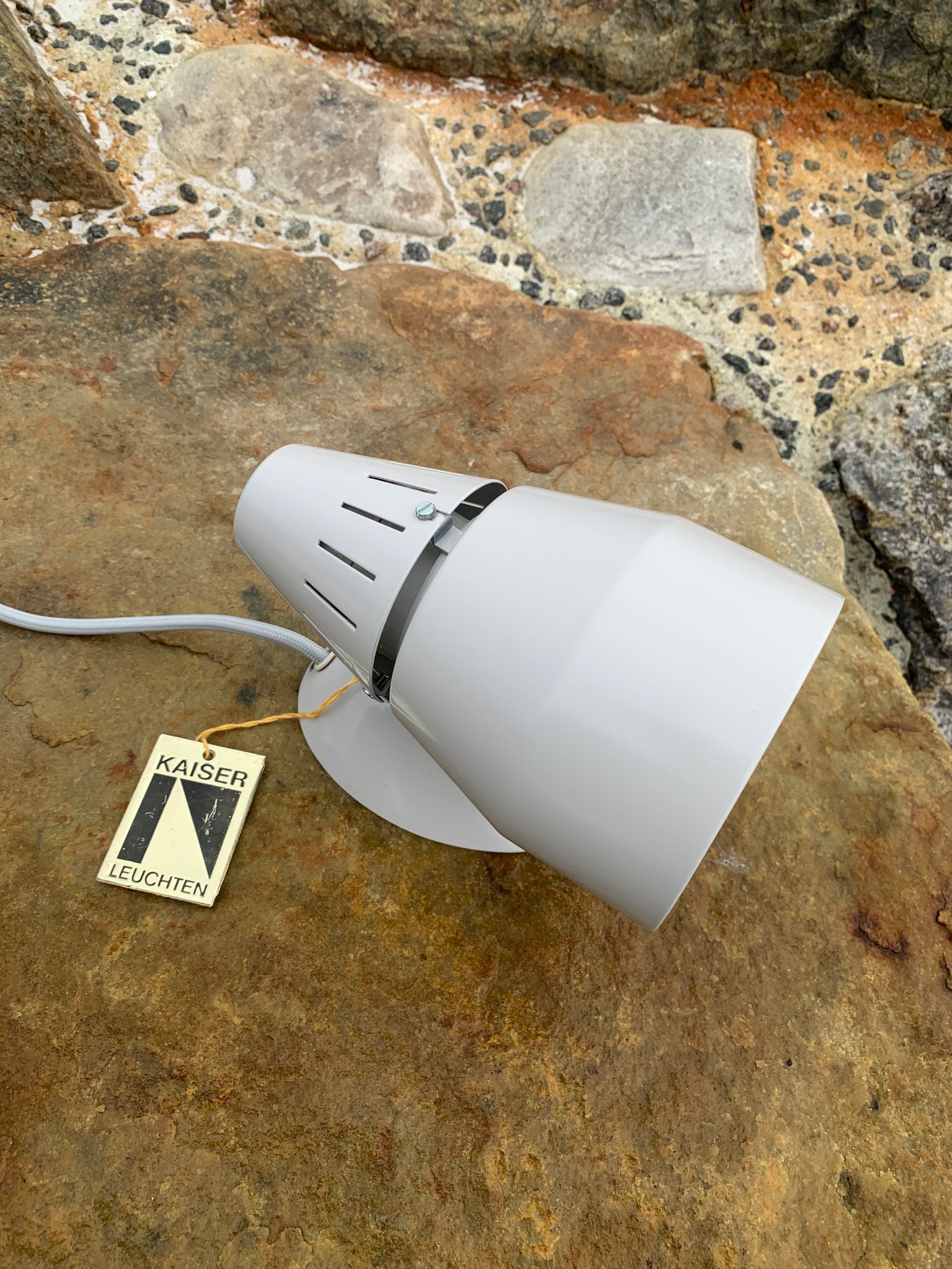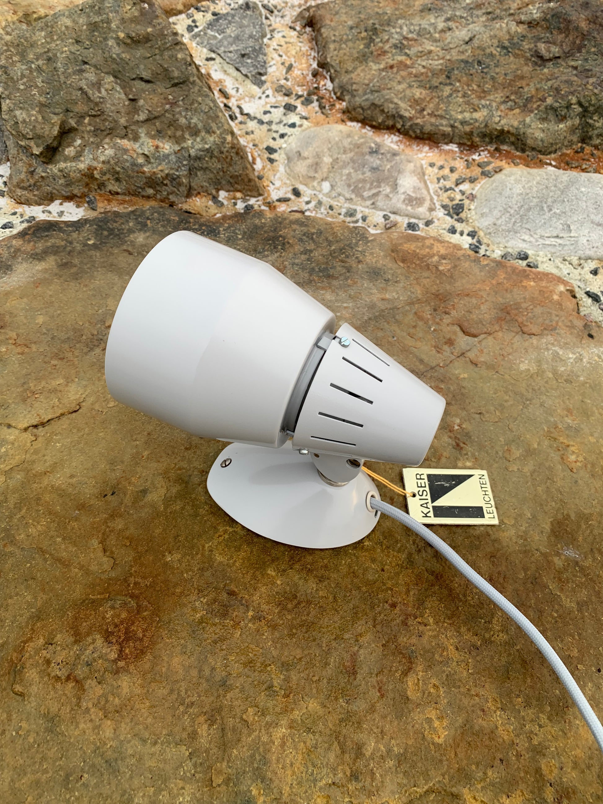 Kaiser Leuchten i original grått. Lampan har nya kablar och nästan inga tecken på slitage då den aldrig har använts. Därför är den i mycket gott vintageskick. En rolig och sällsynt detalj är att originaletiketten fortfarande sitter kvar på lampan.
