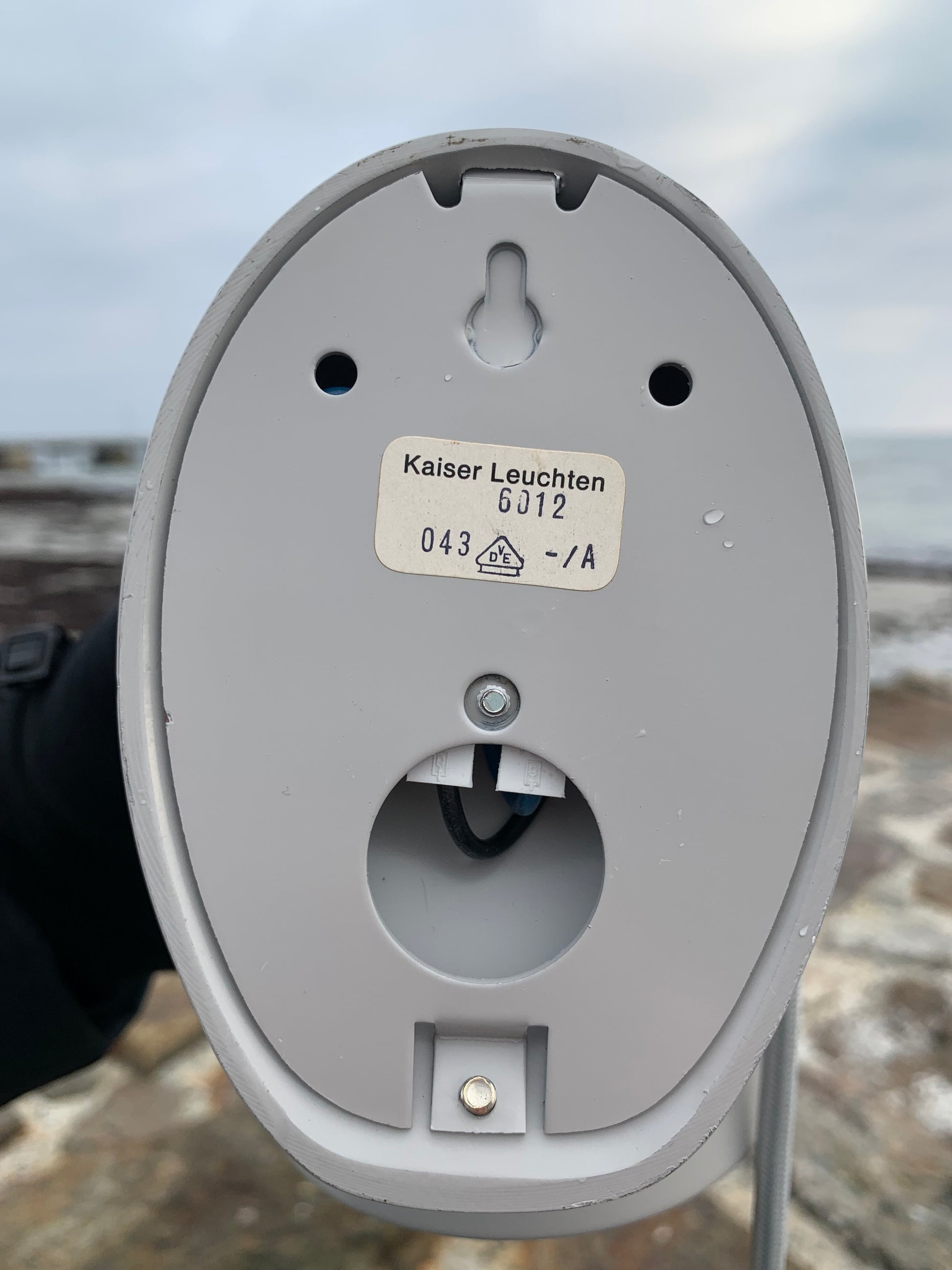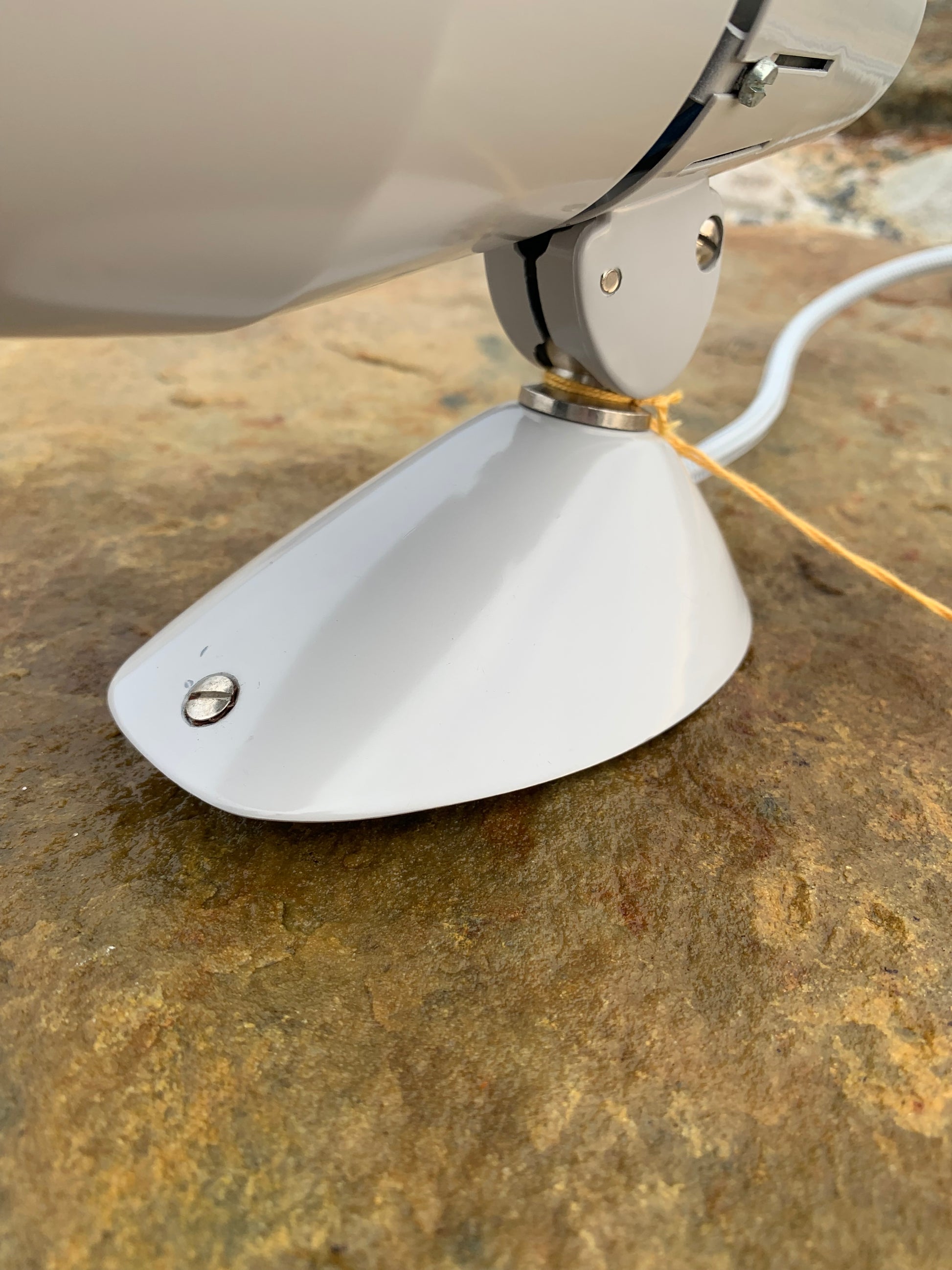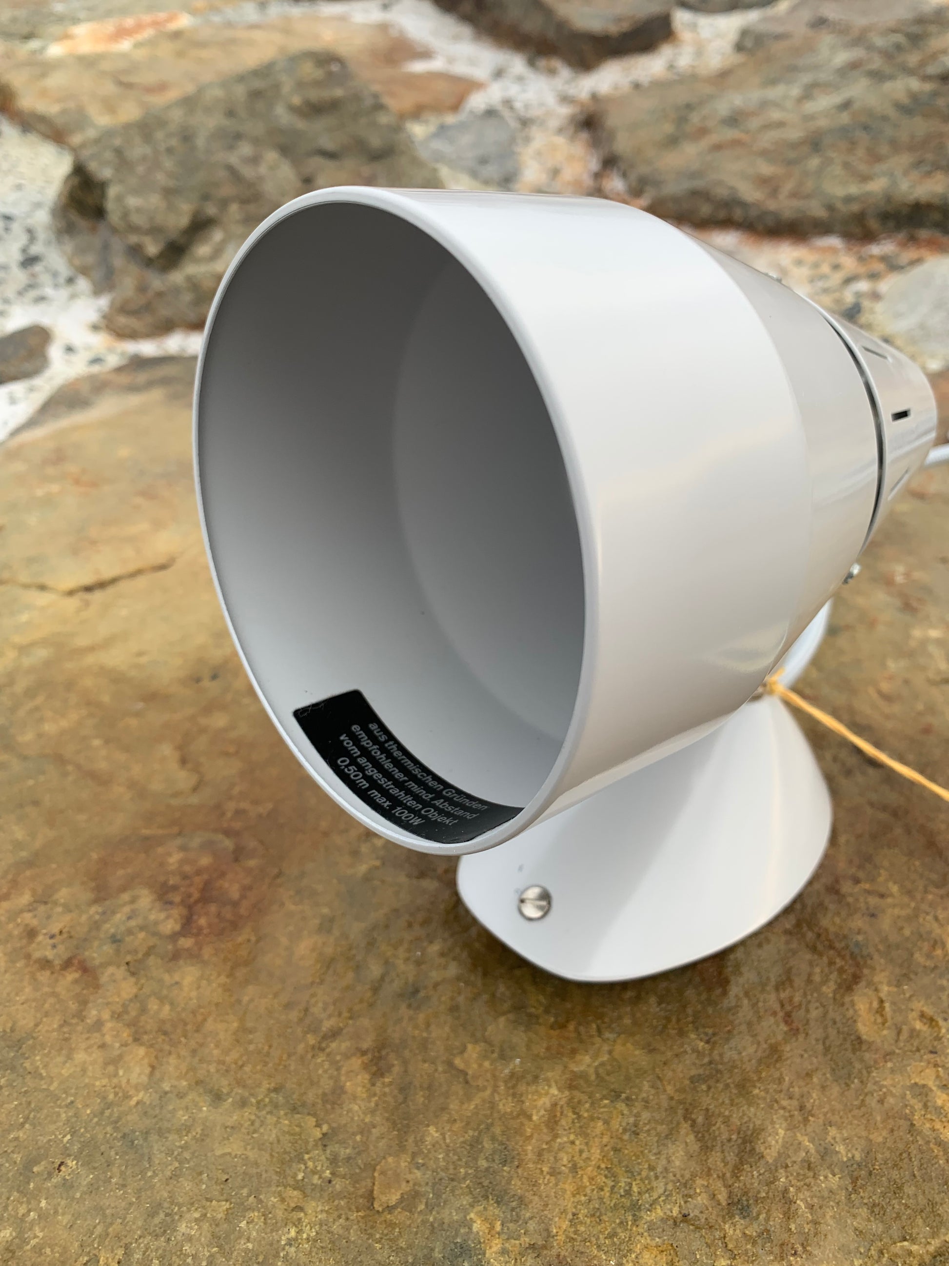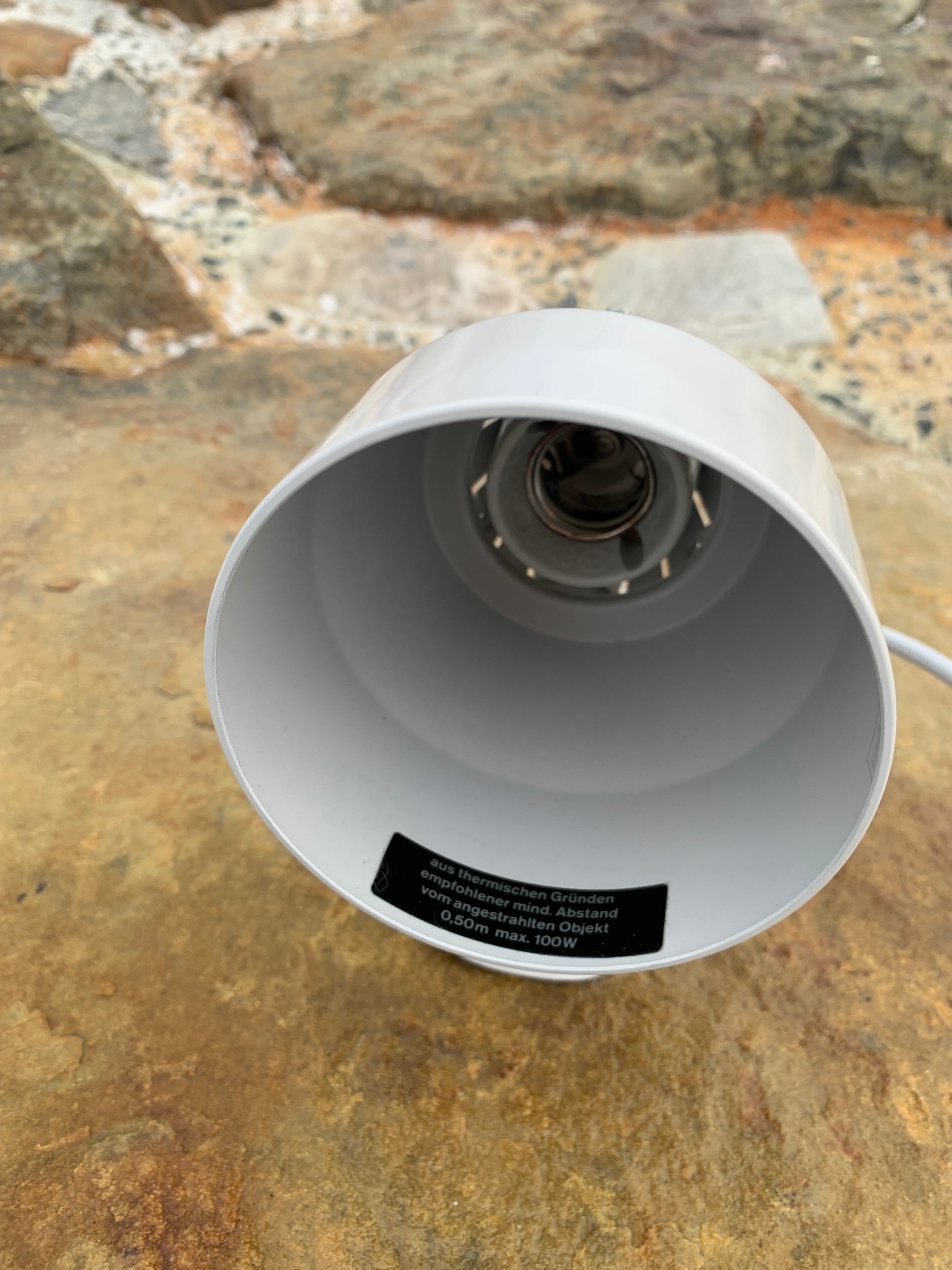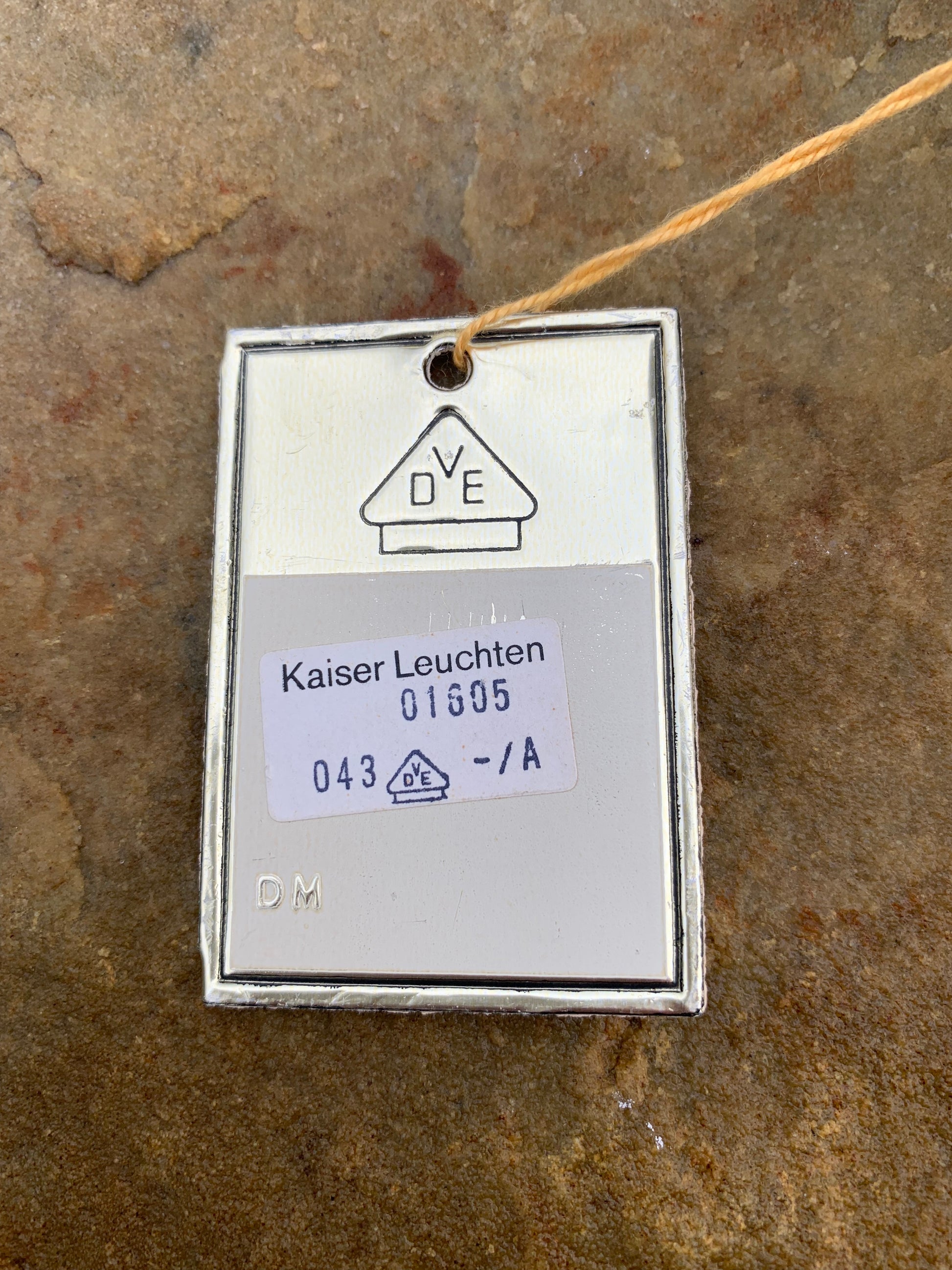 Kaiser Leuchten i original grått. Lampan har nya kablar och nästan inga tecken på slitage då den aldrig har använts. Därför är den i mycket gott vintageskick. En rolig och sällsynt detalj är att originaletiketten fortfarande sitter kvar på lampan.
