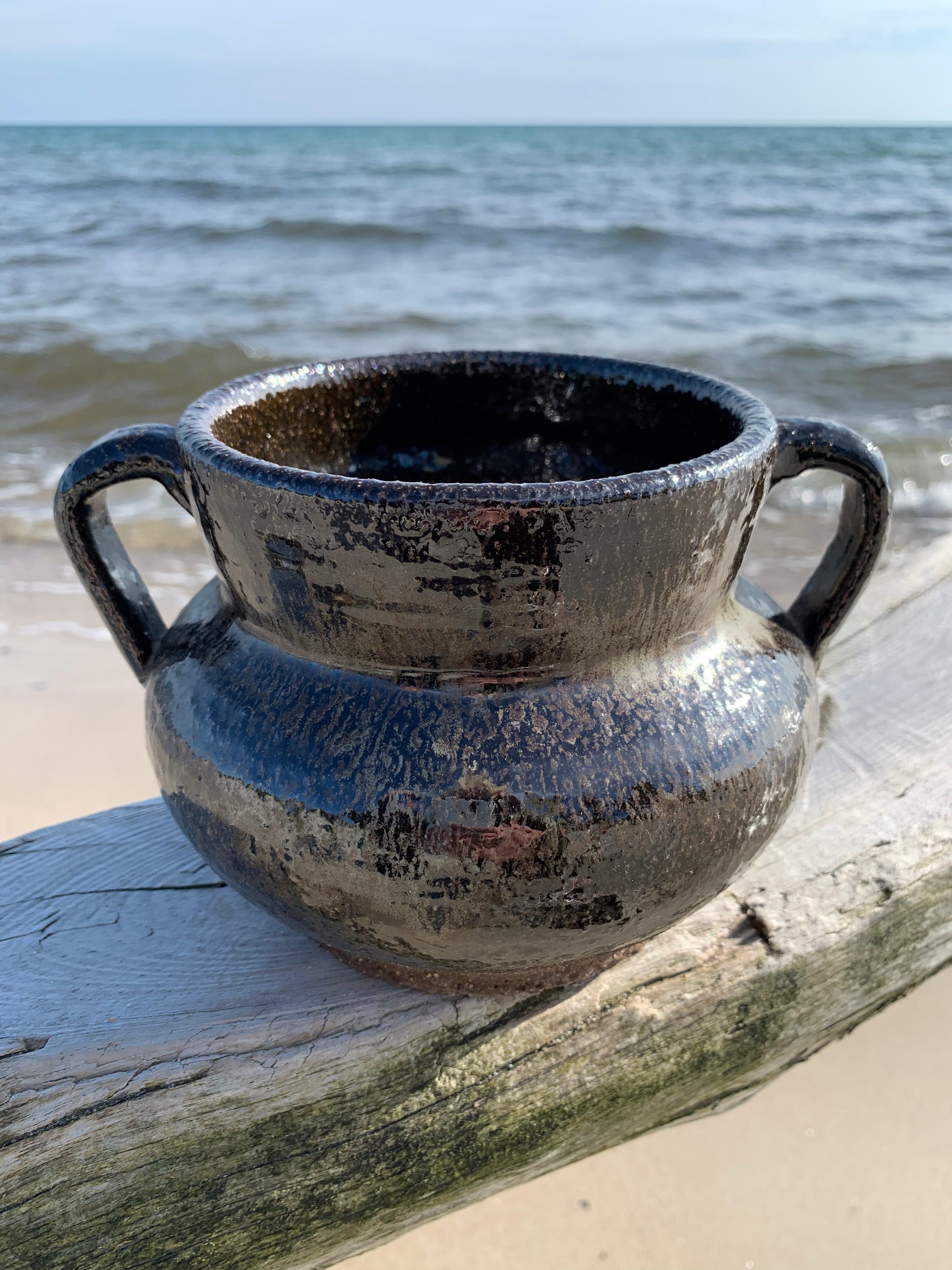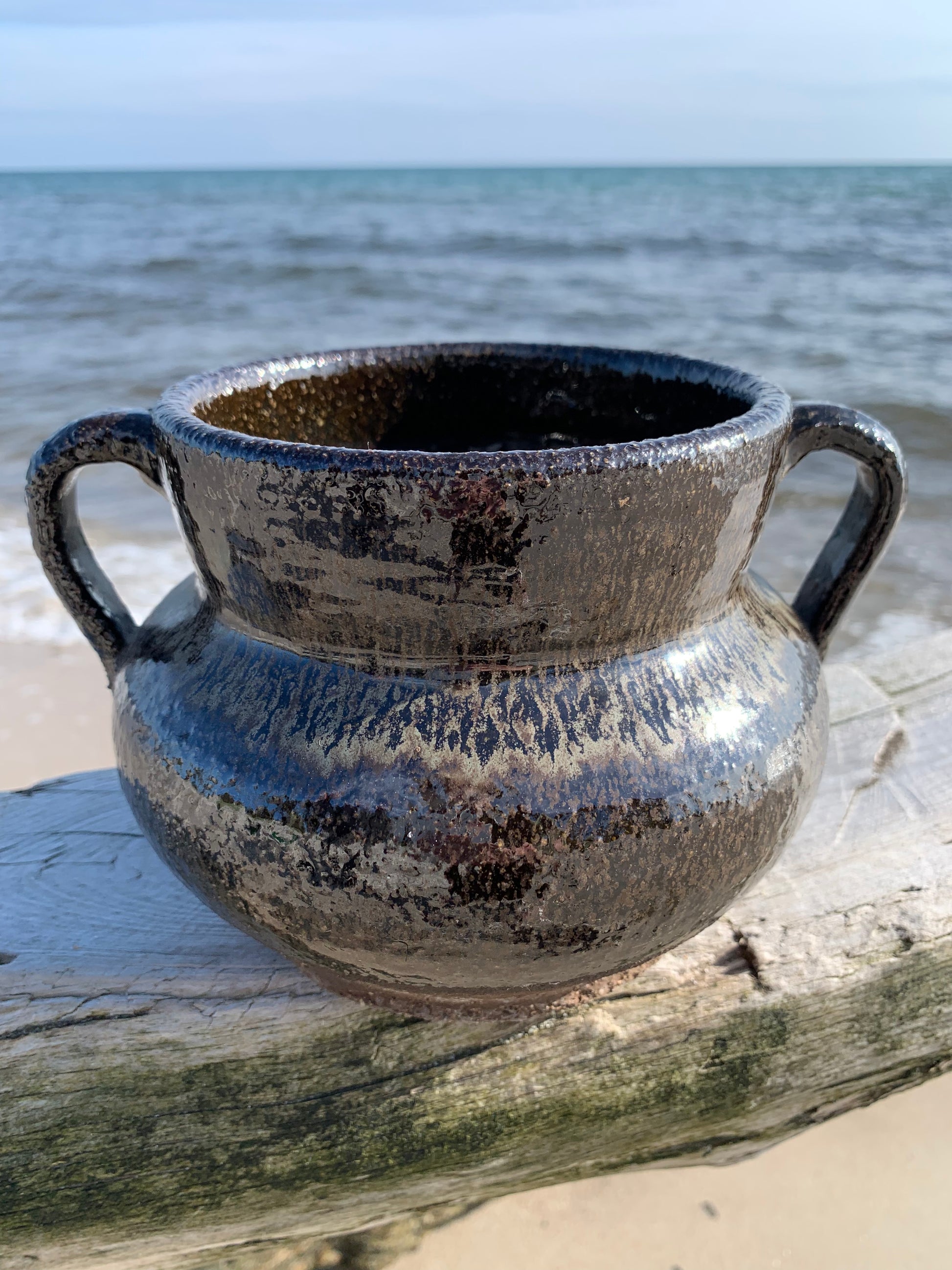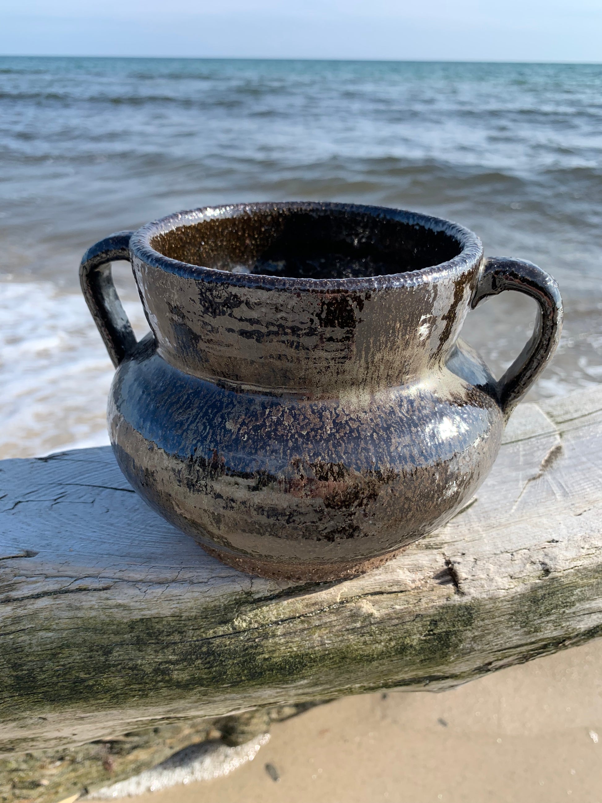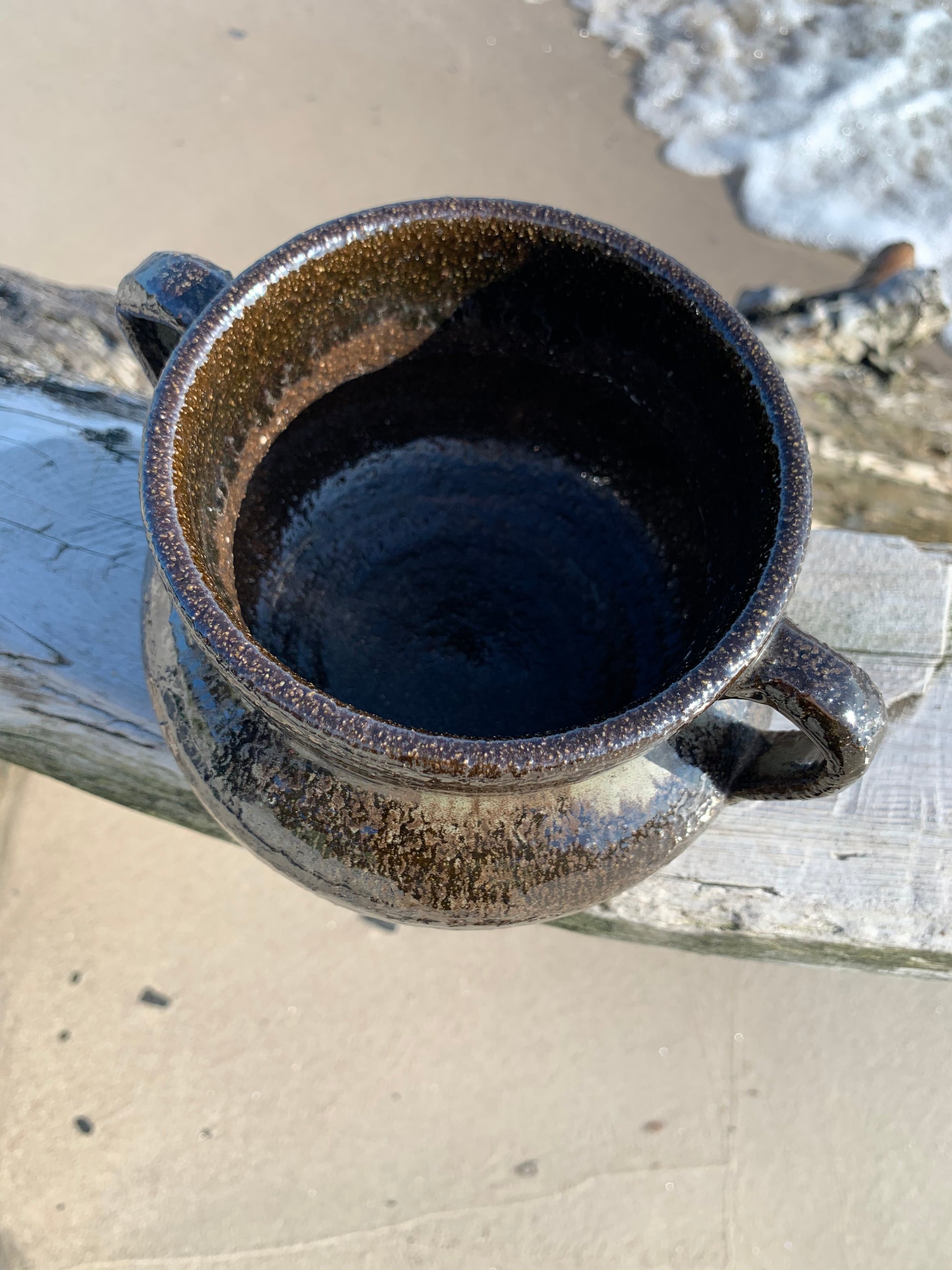 Keramikburk med öron. Tyvärr kan vi inte tyda vem som ligger bakom, bara att det är danskt. Stativet är fint och intakt.