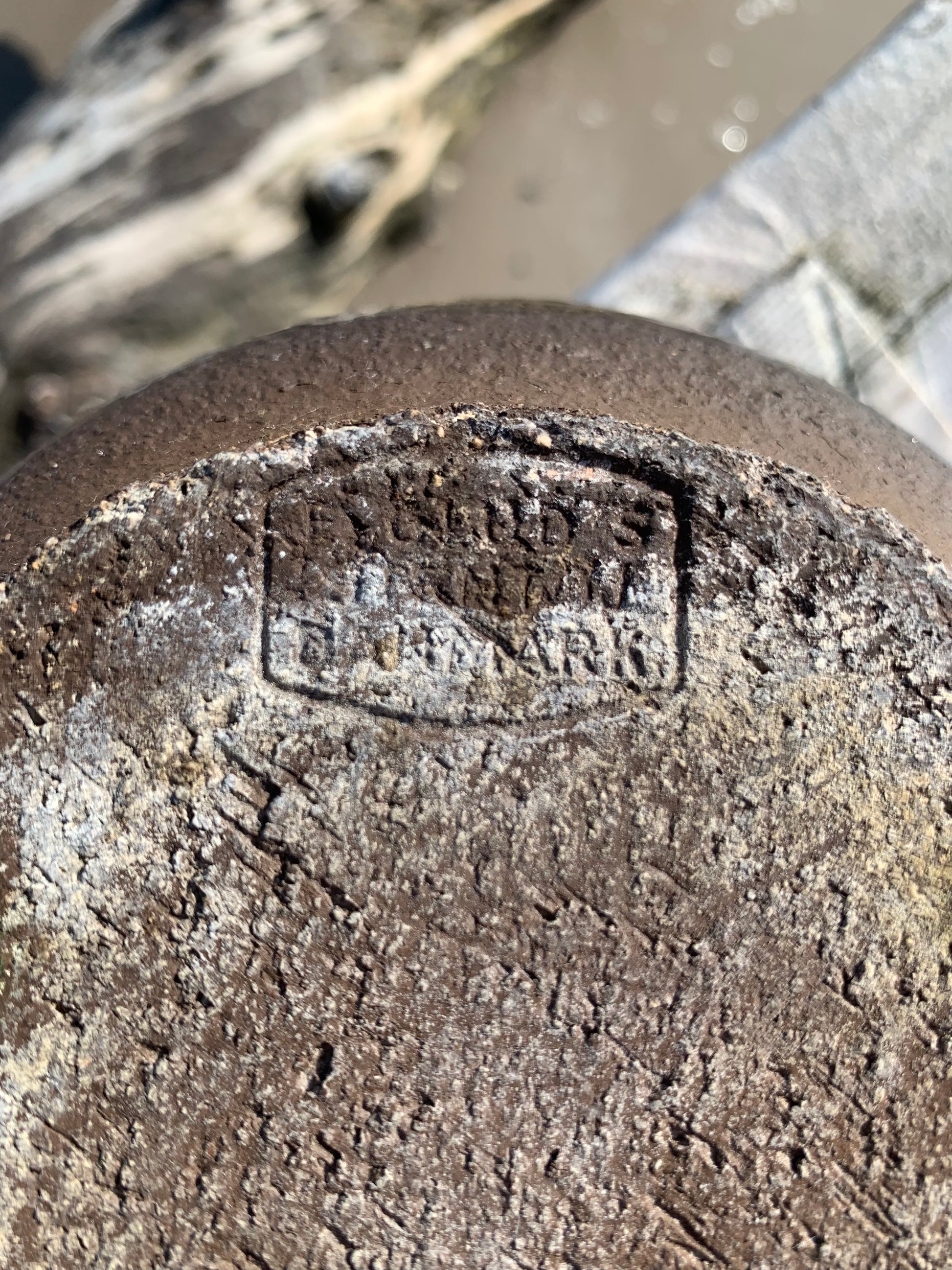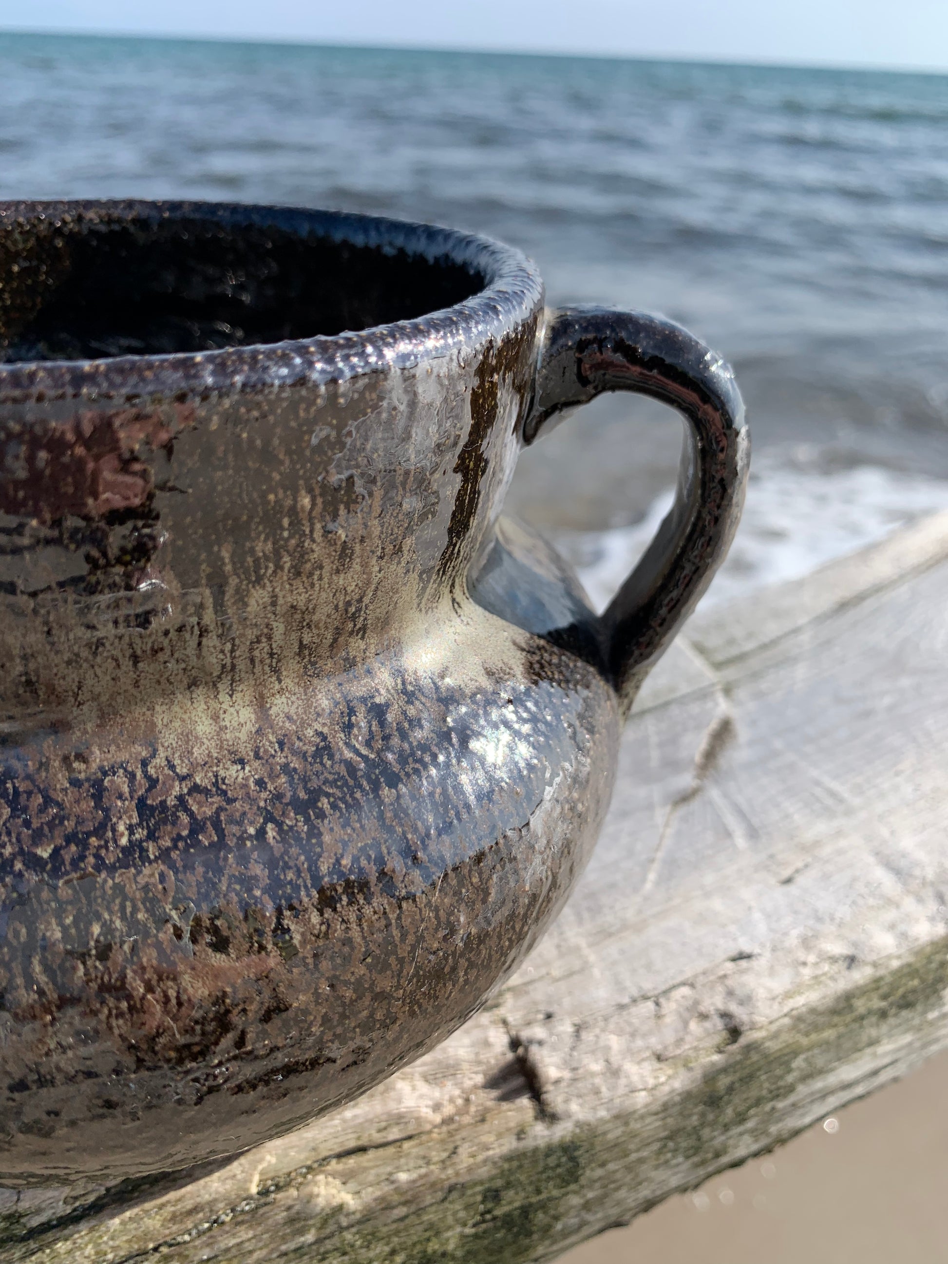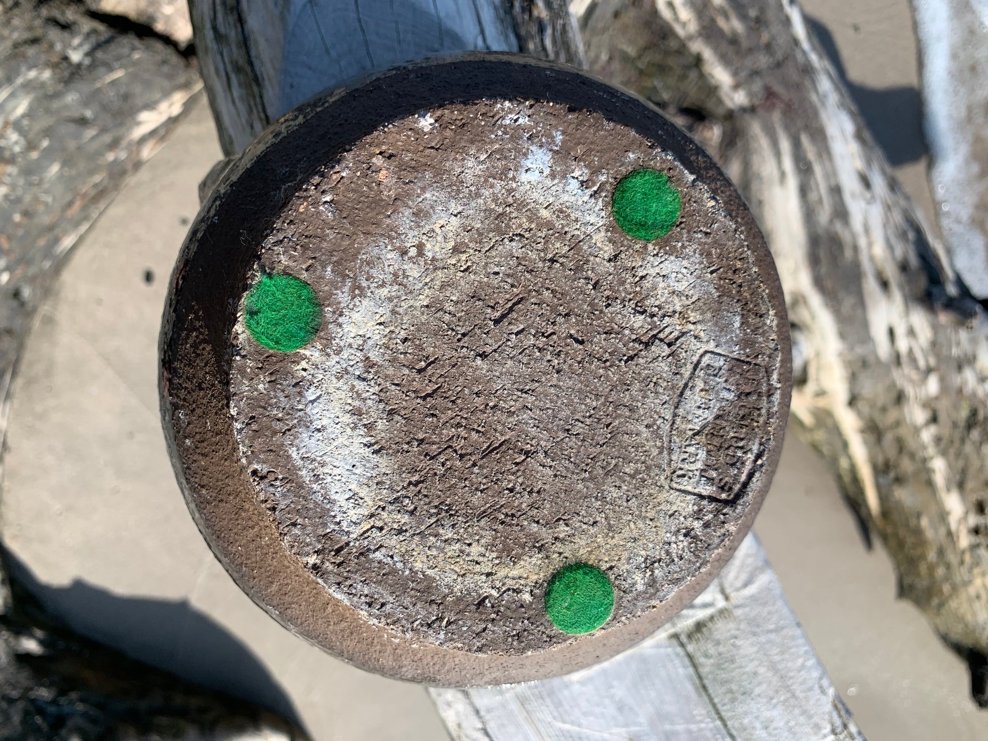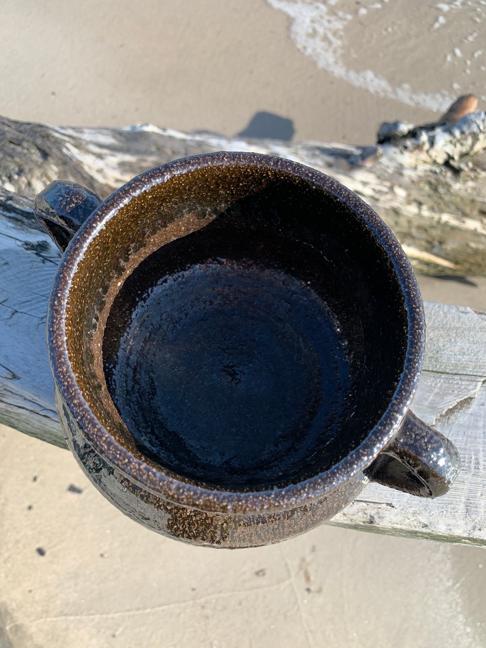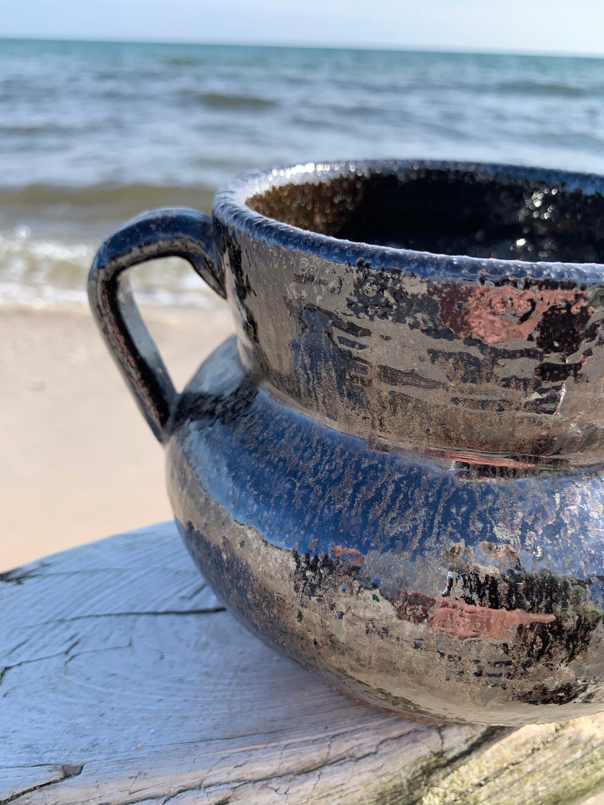 Keramikburk med öron. Tyvärr kan vi inte tyda vem som ligger bakom, bara att det är danskt. Stativet är fint och intakt.