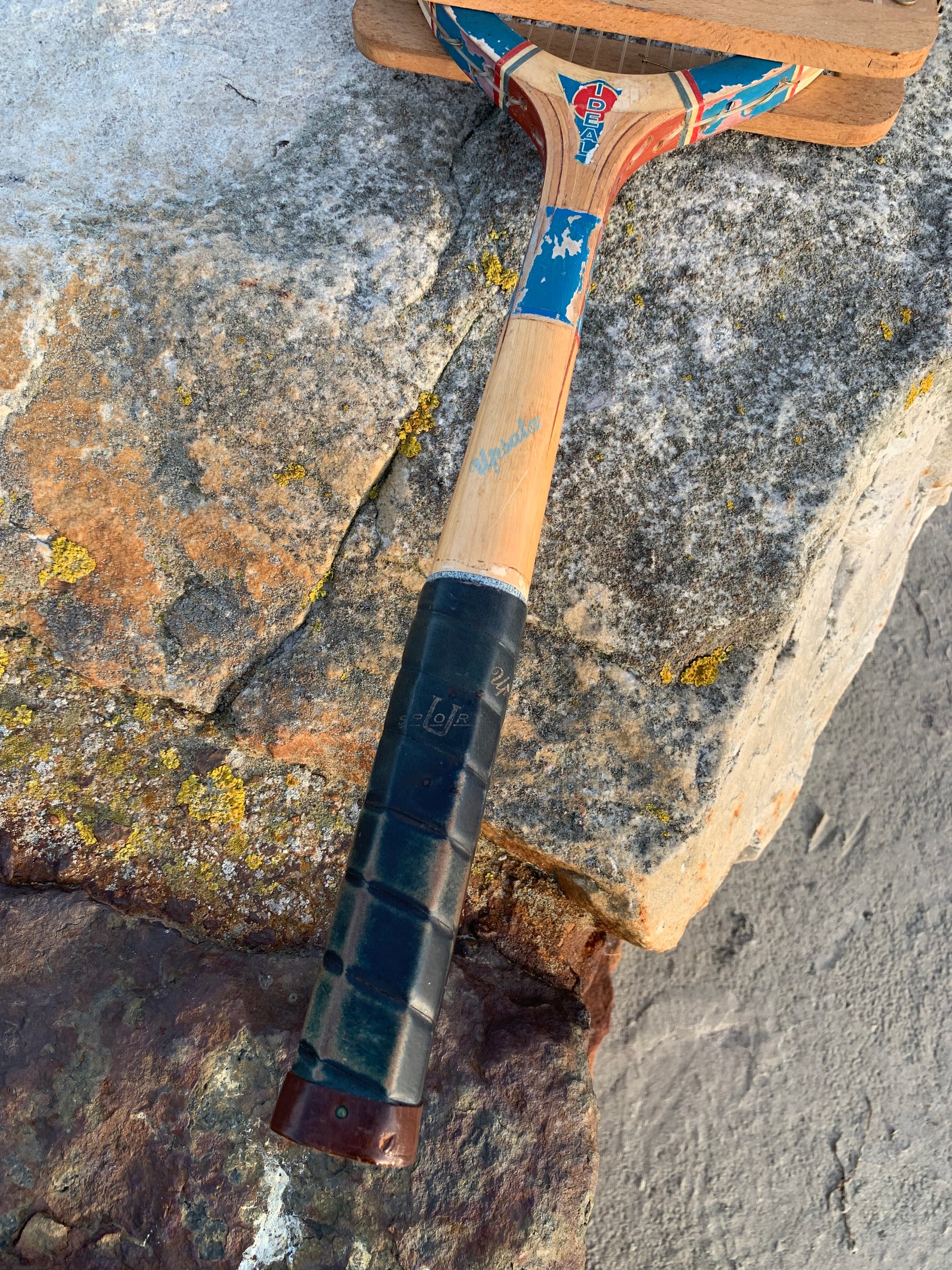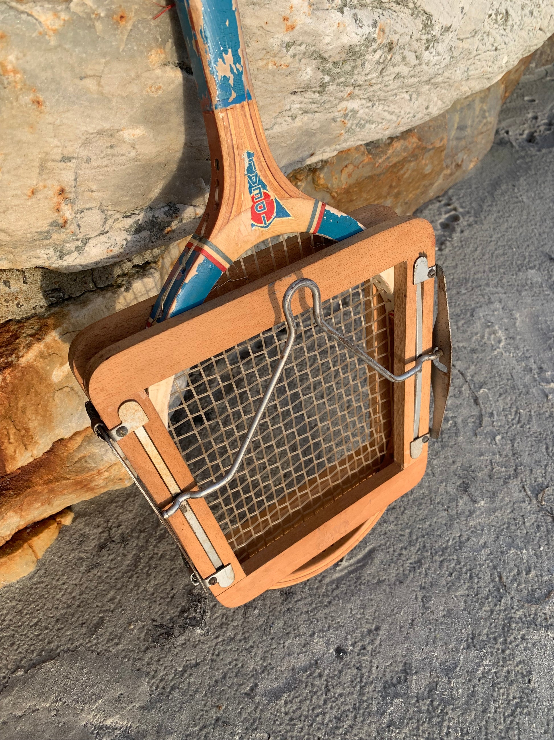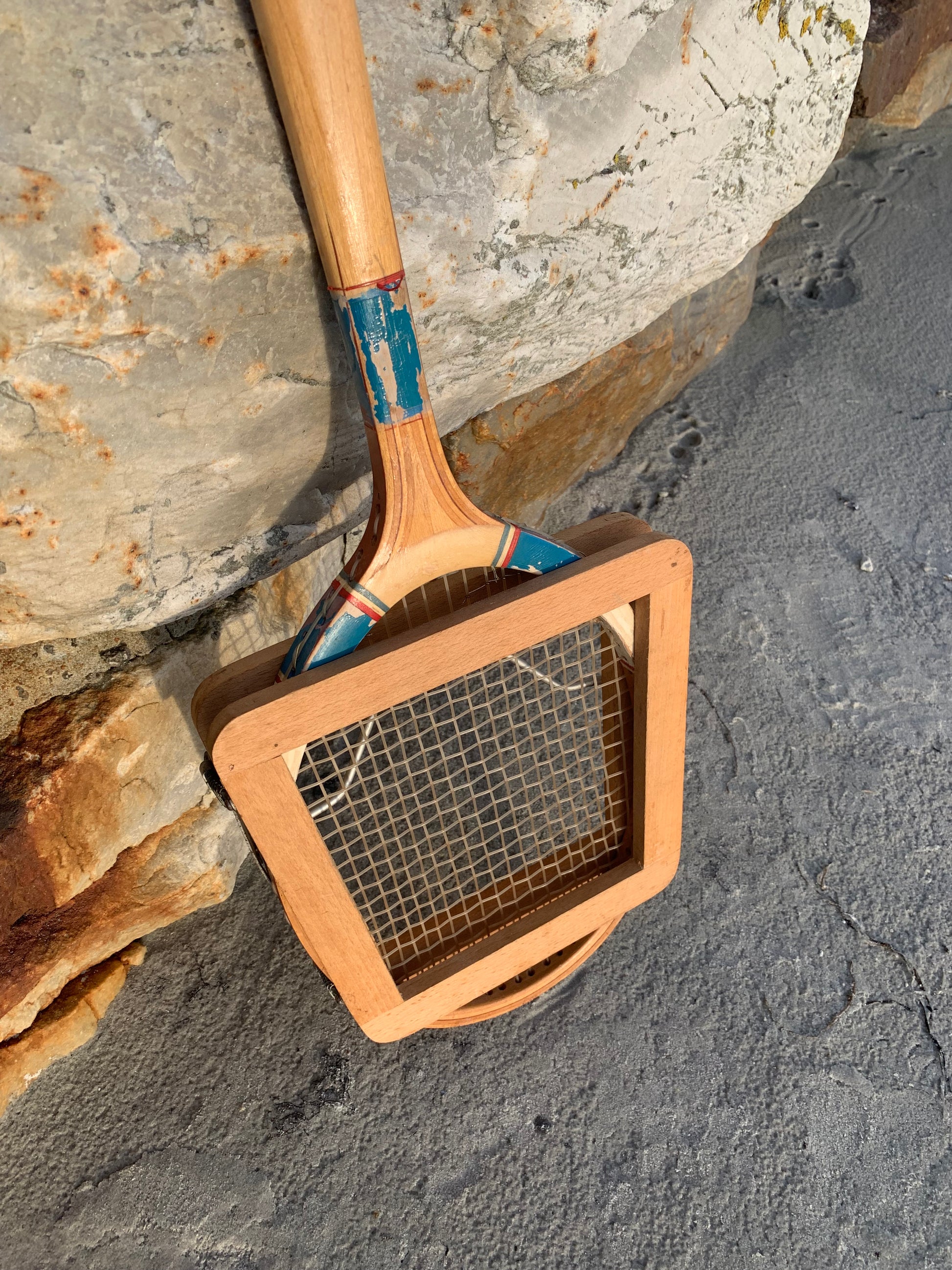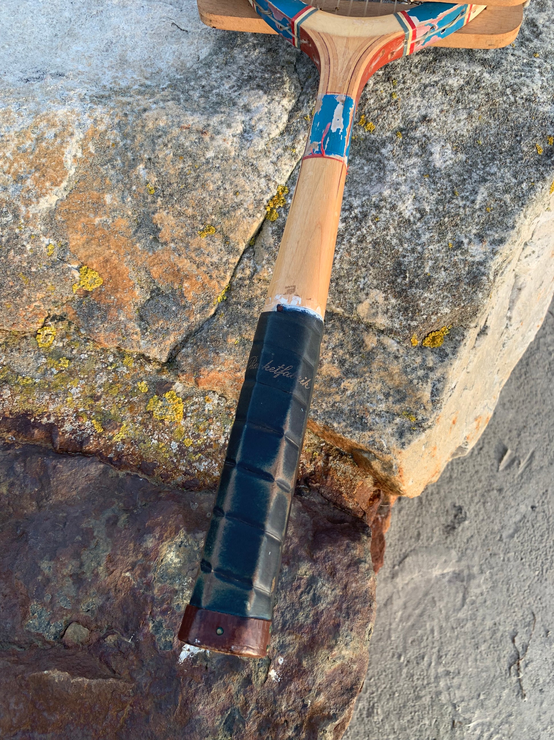 Fin och mycket dekorativ gammal tennisracket med ram.