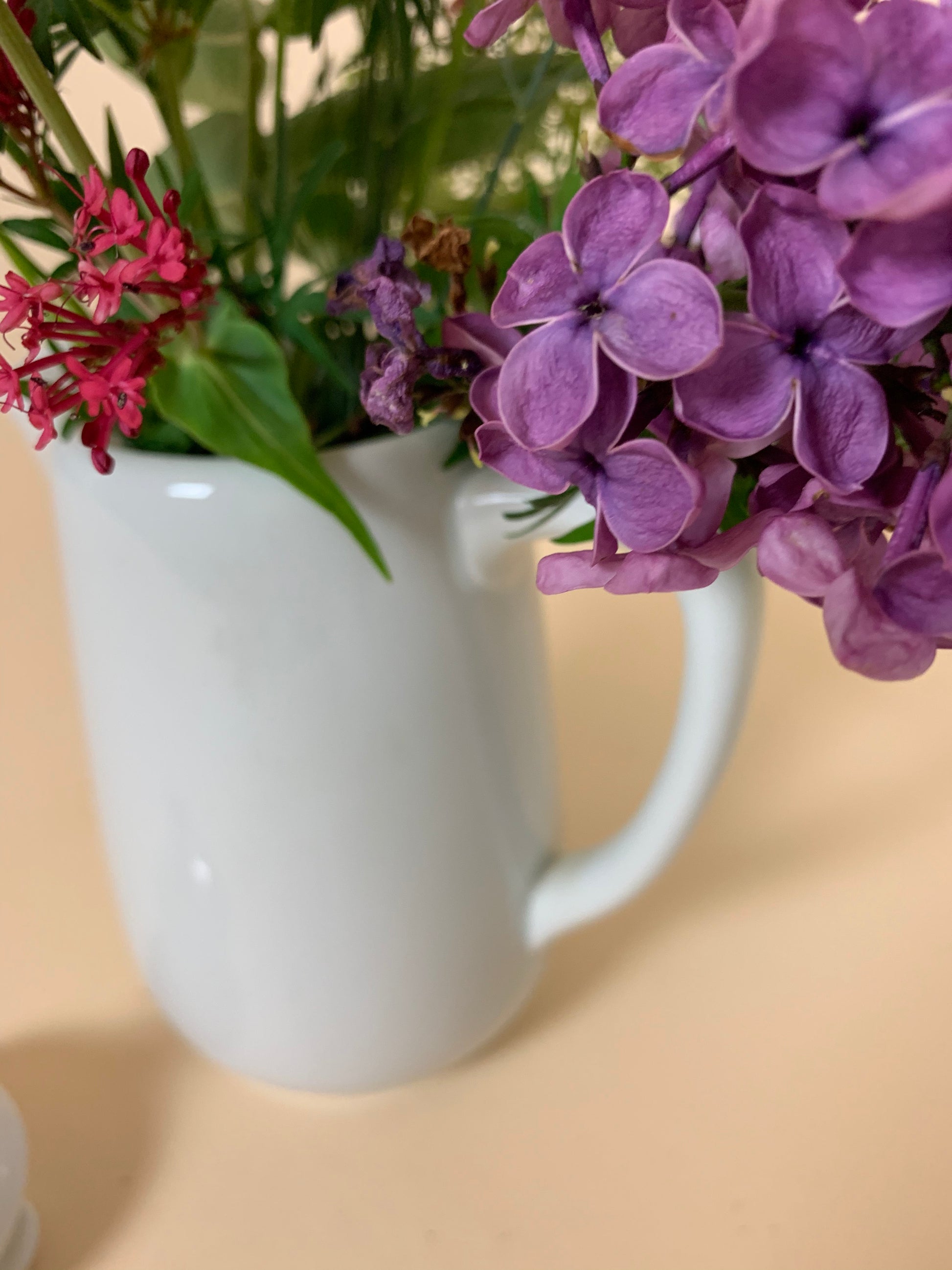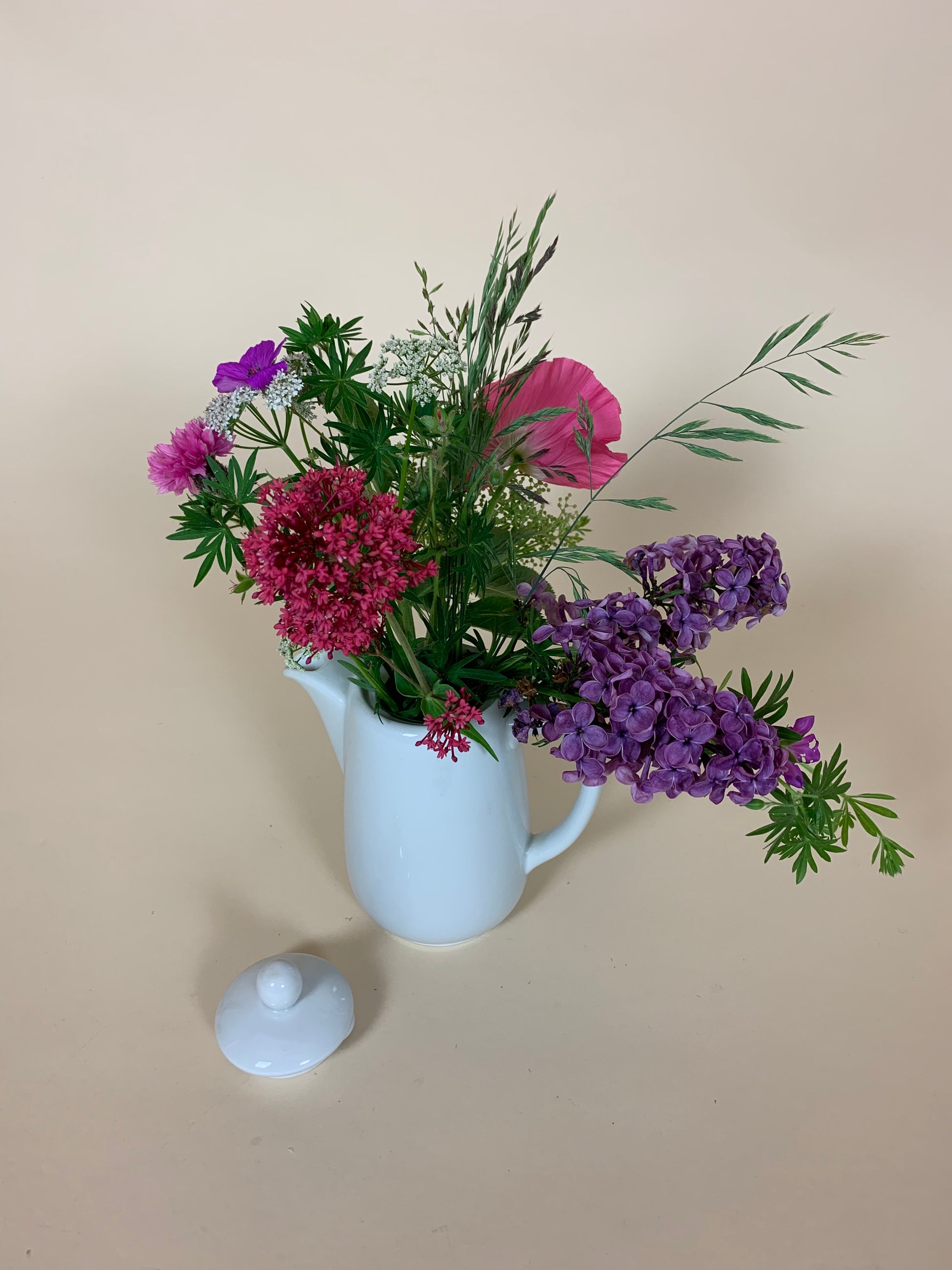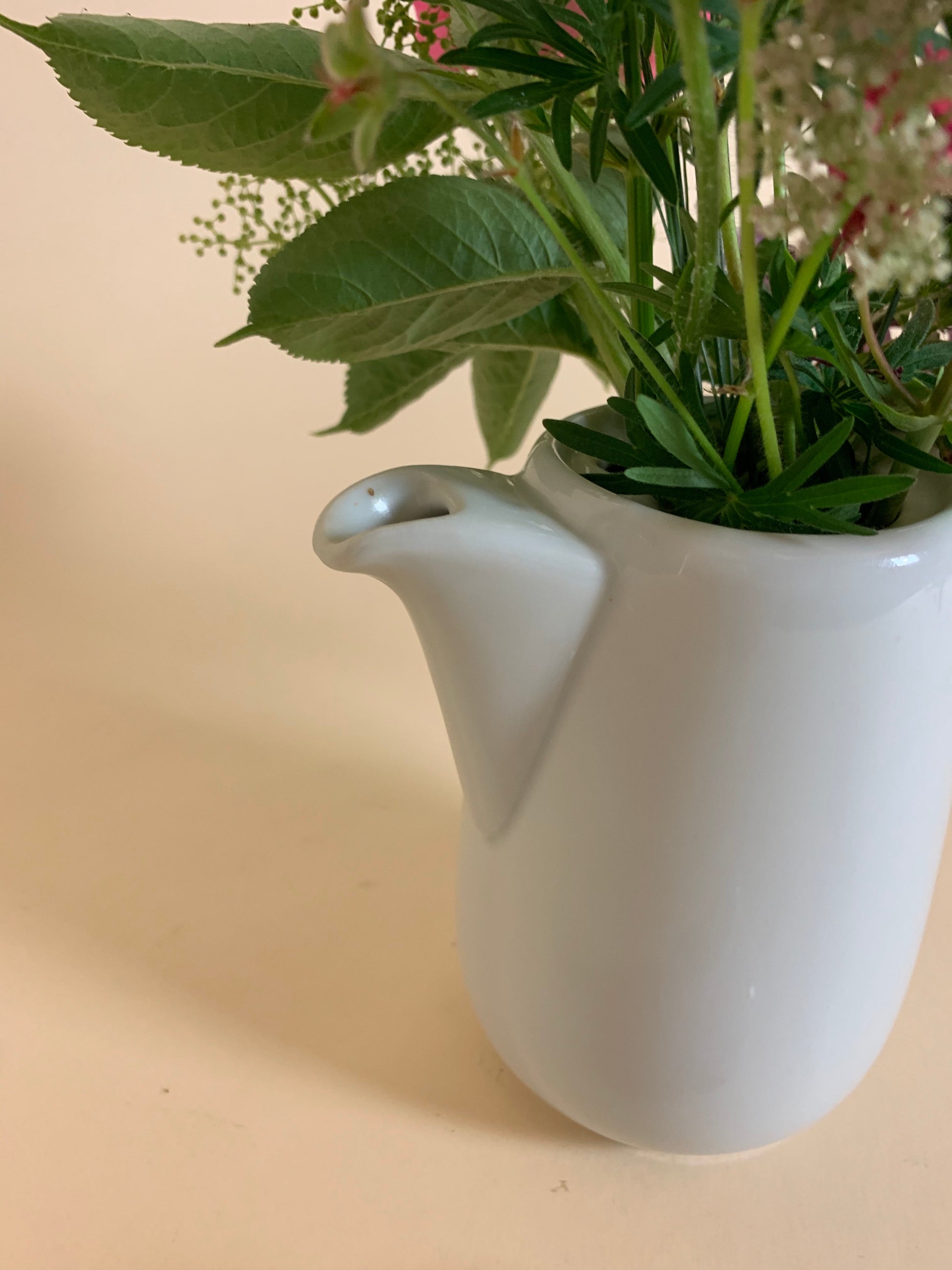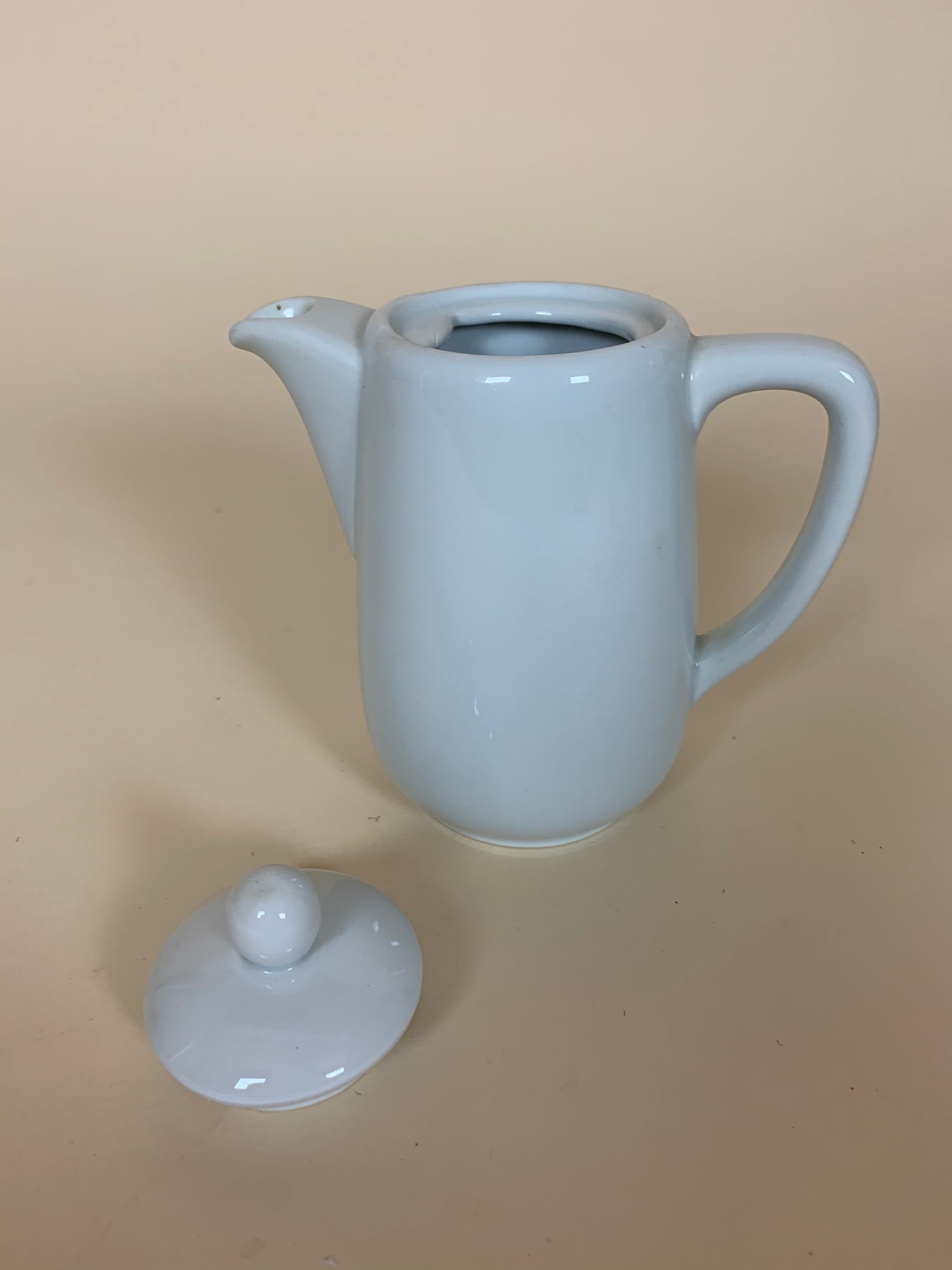 Fin porslinskanna med lock som fastnar när man häller upp från kannan.