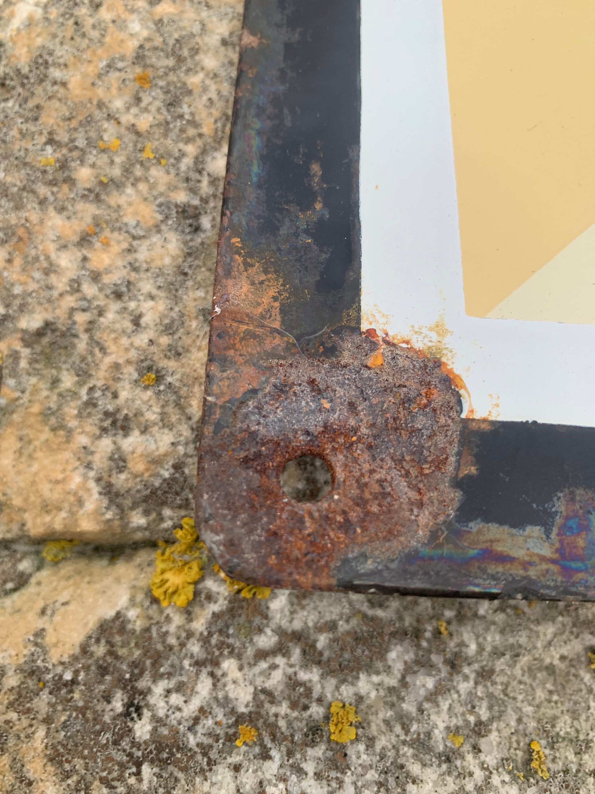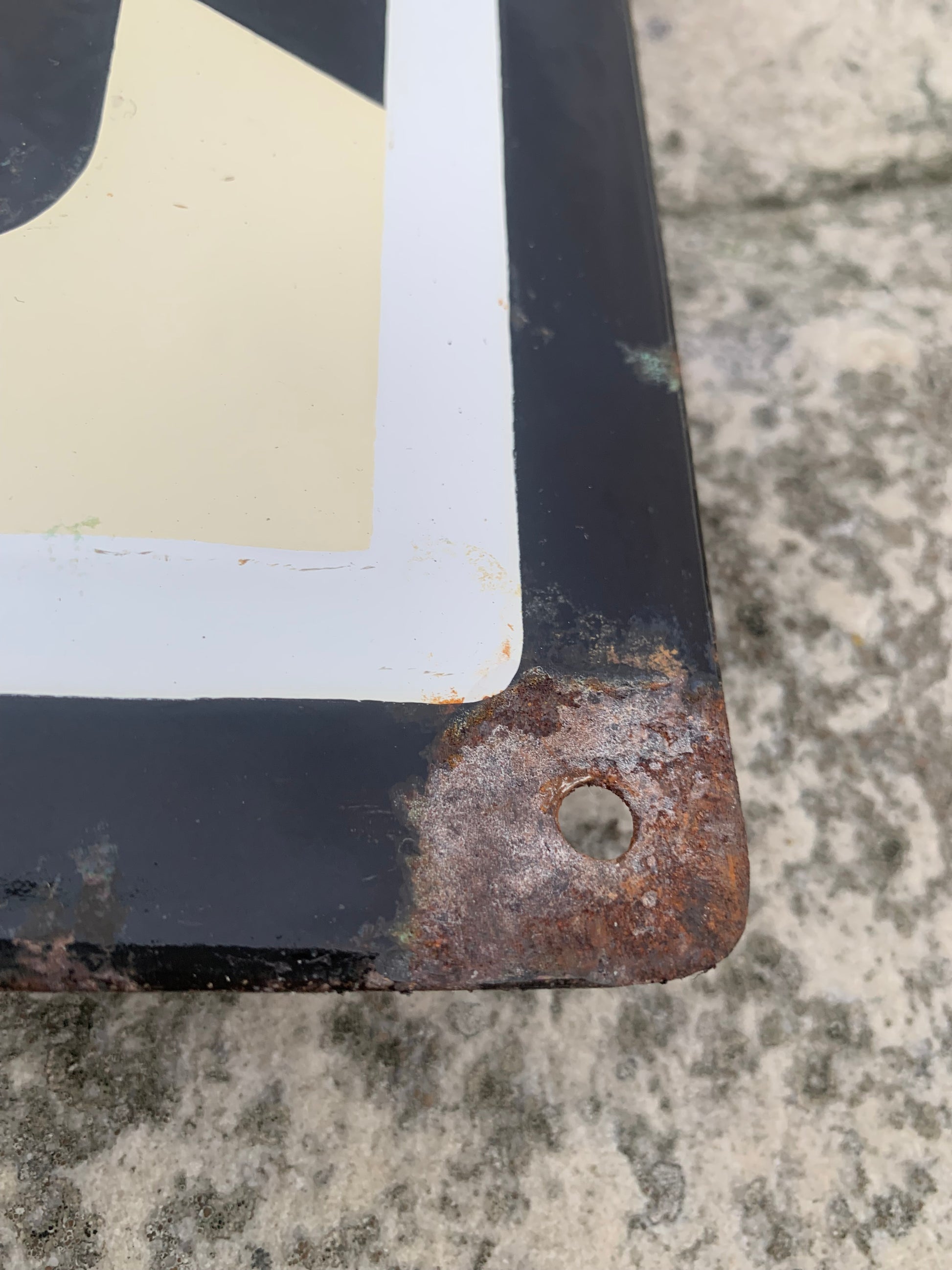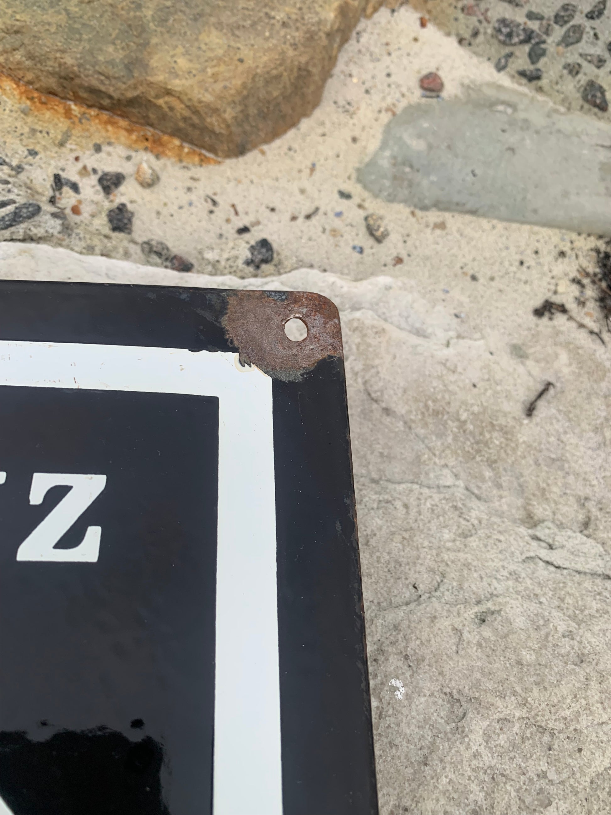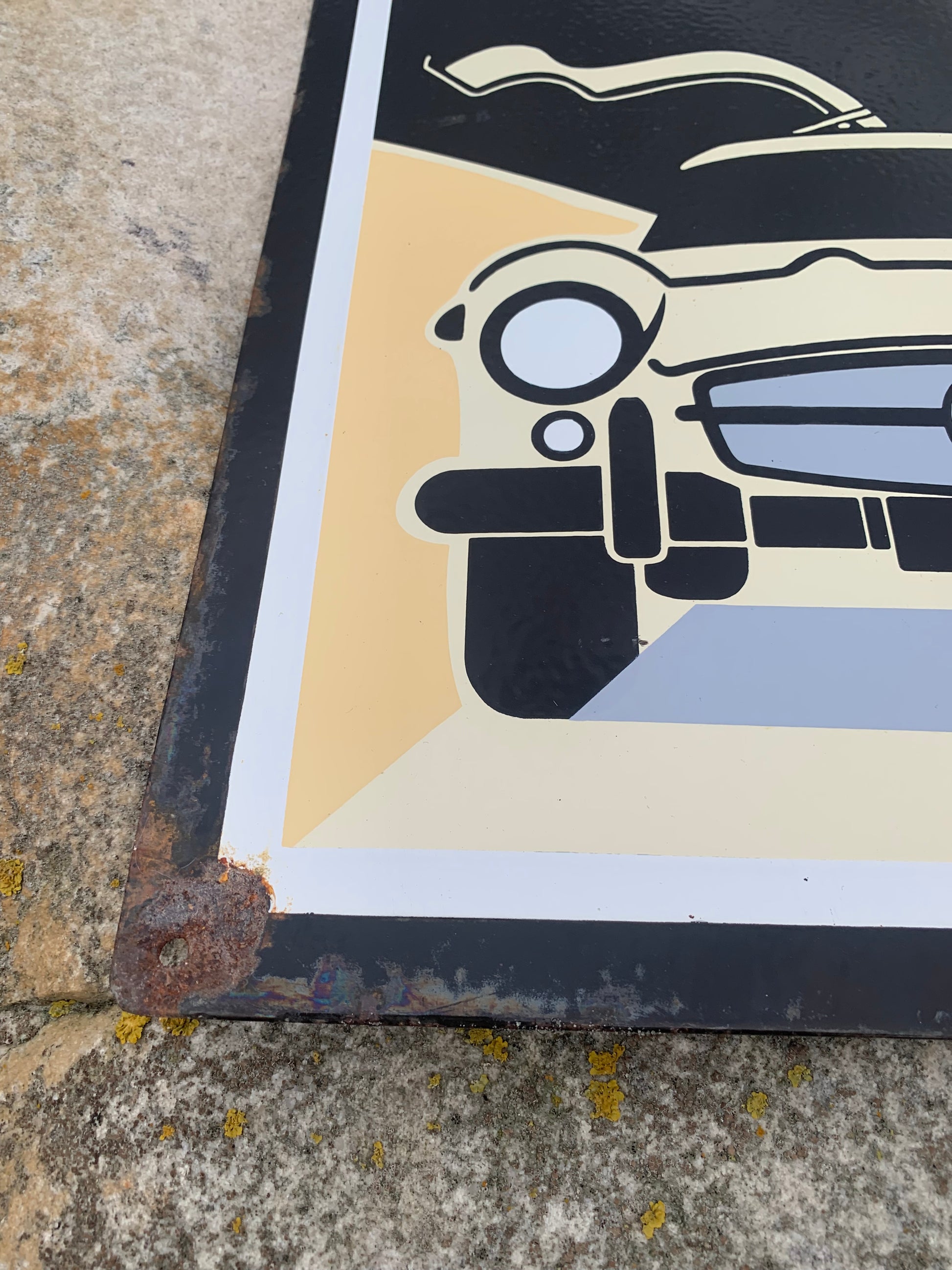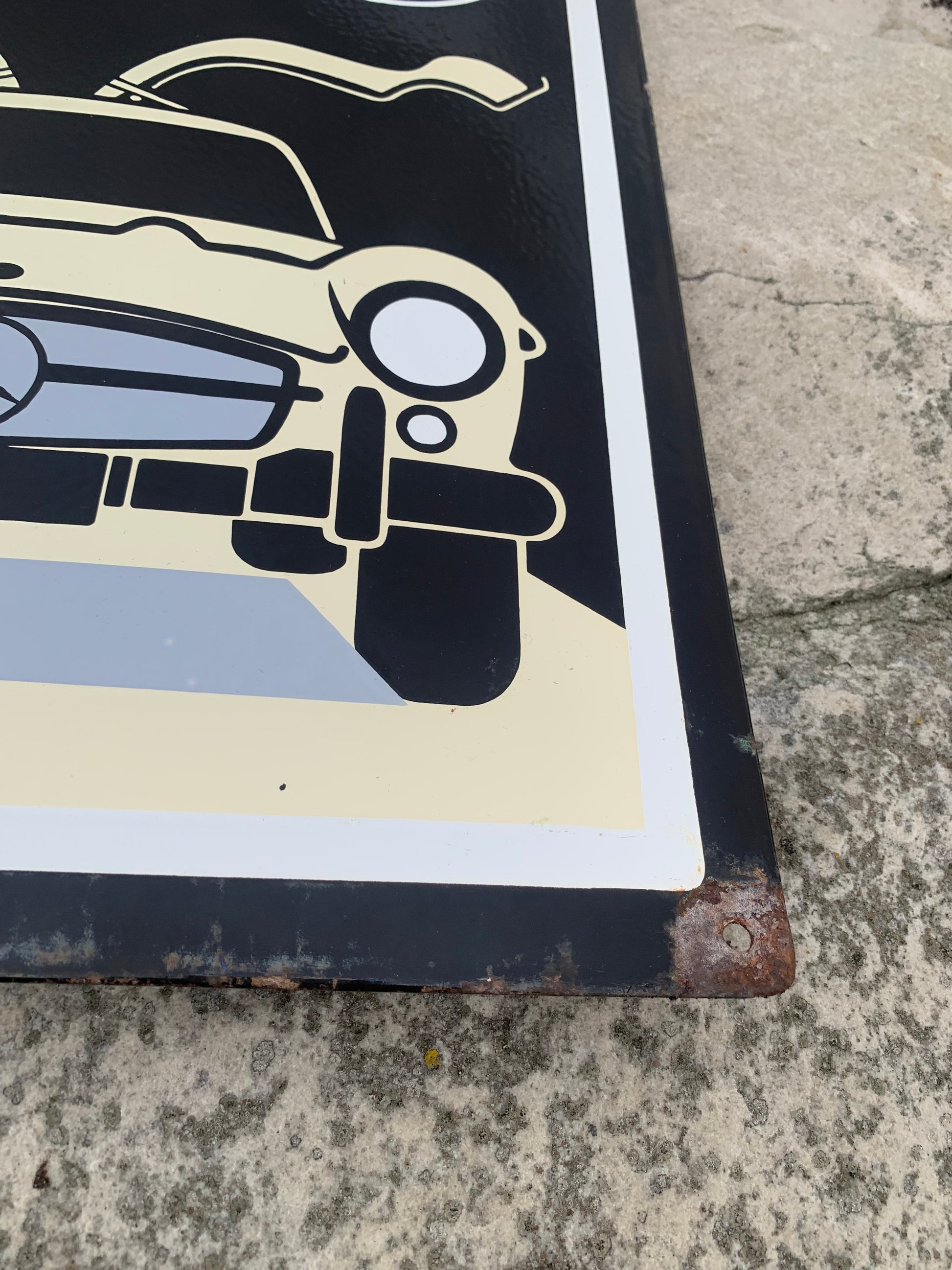 Mercedes emaljskylt (kupad). Skylten har tecken på slitage, särskilt i hörnen som dessa skyltar ofta har, men överlag är den i fint vintageskick.