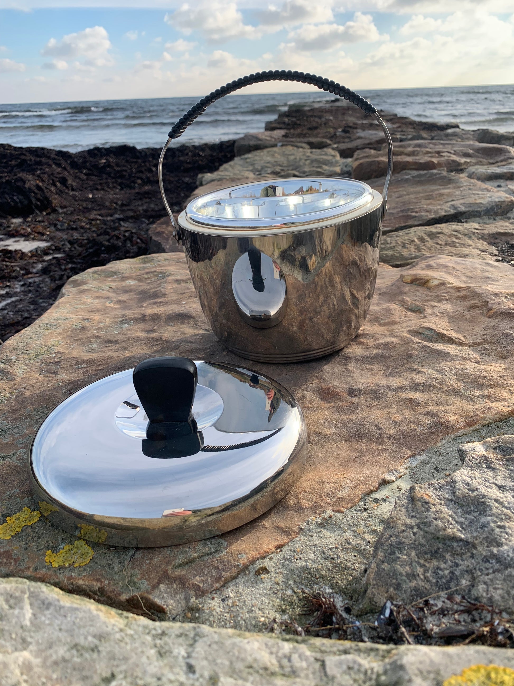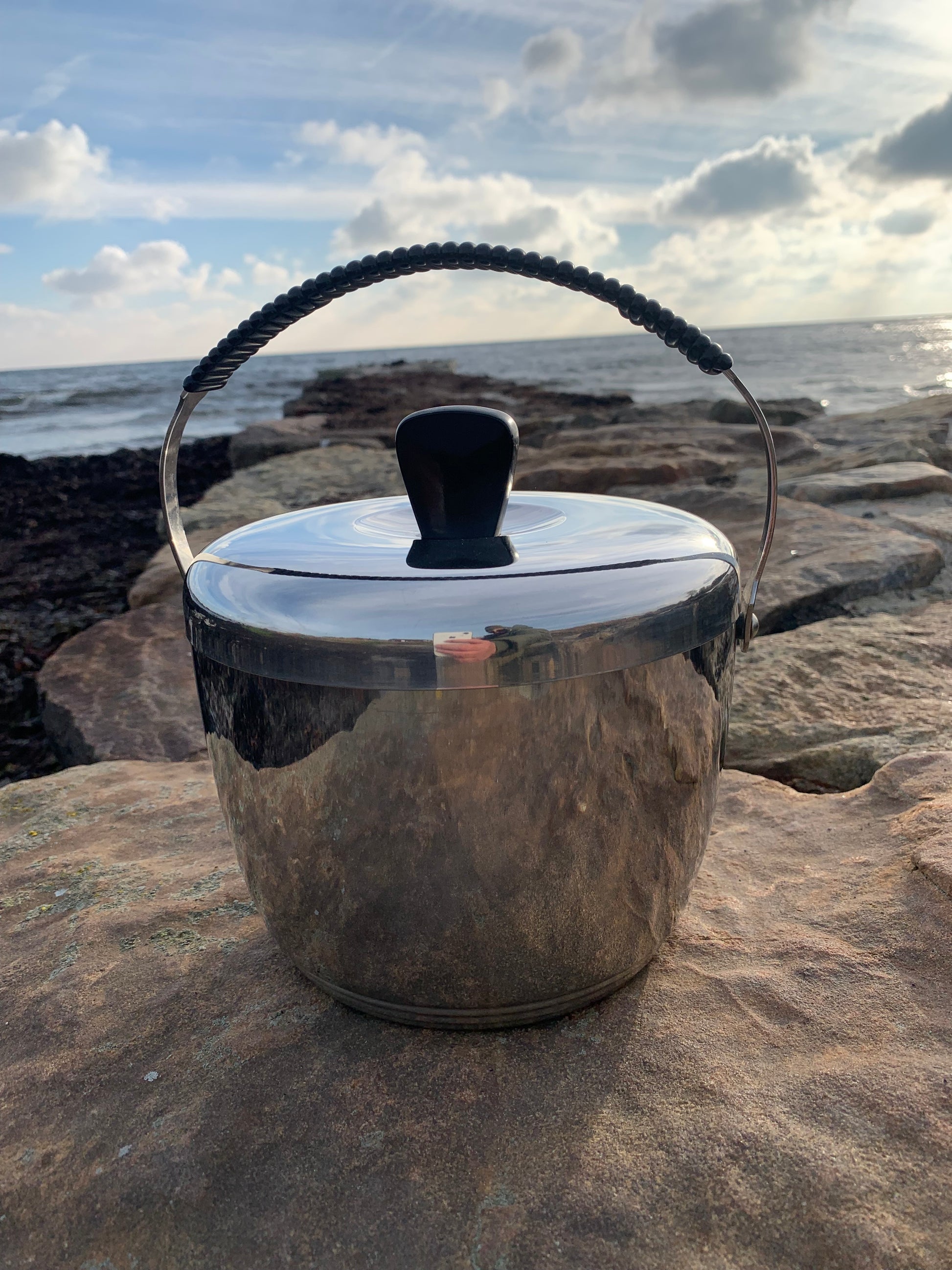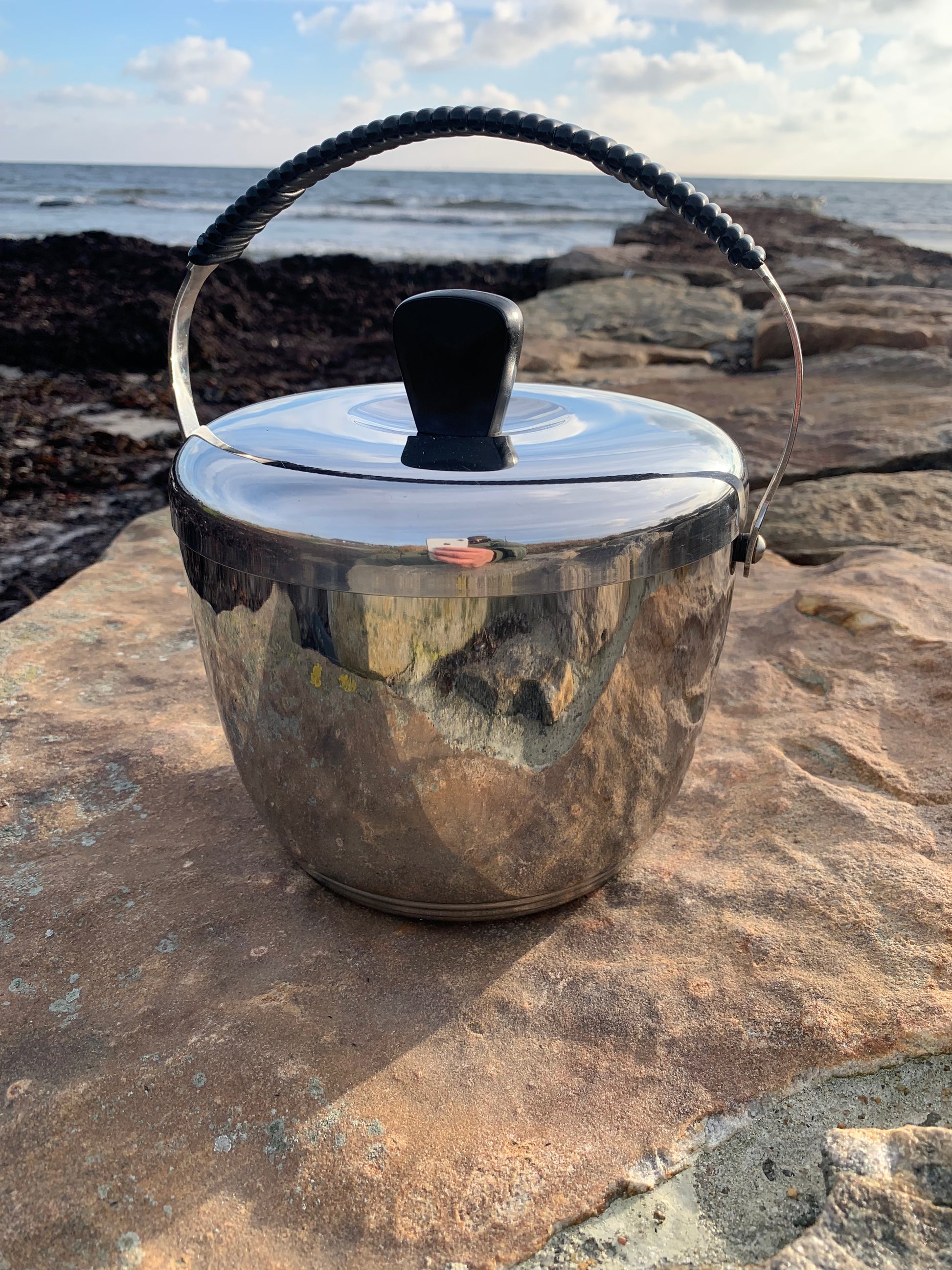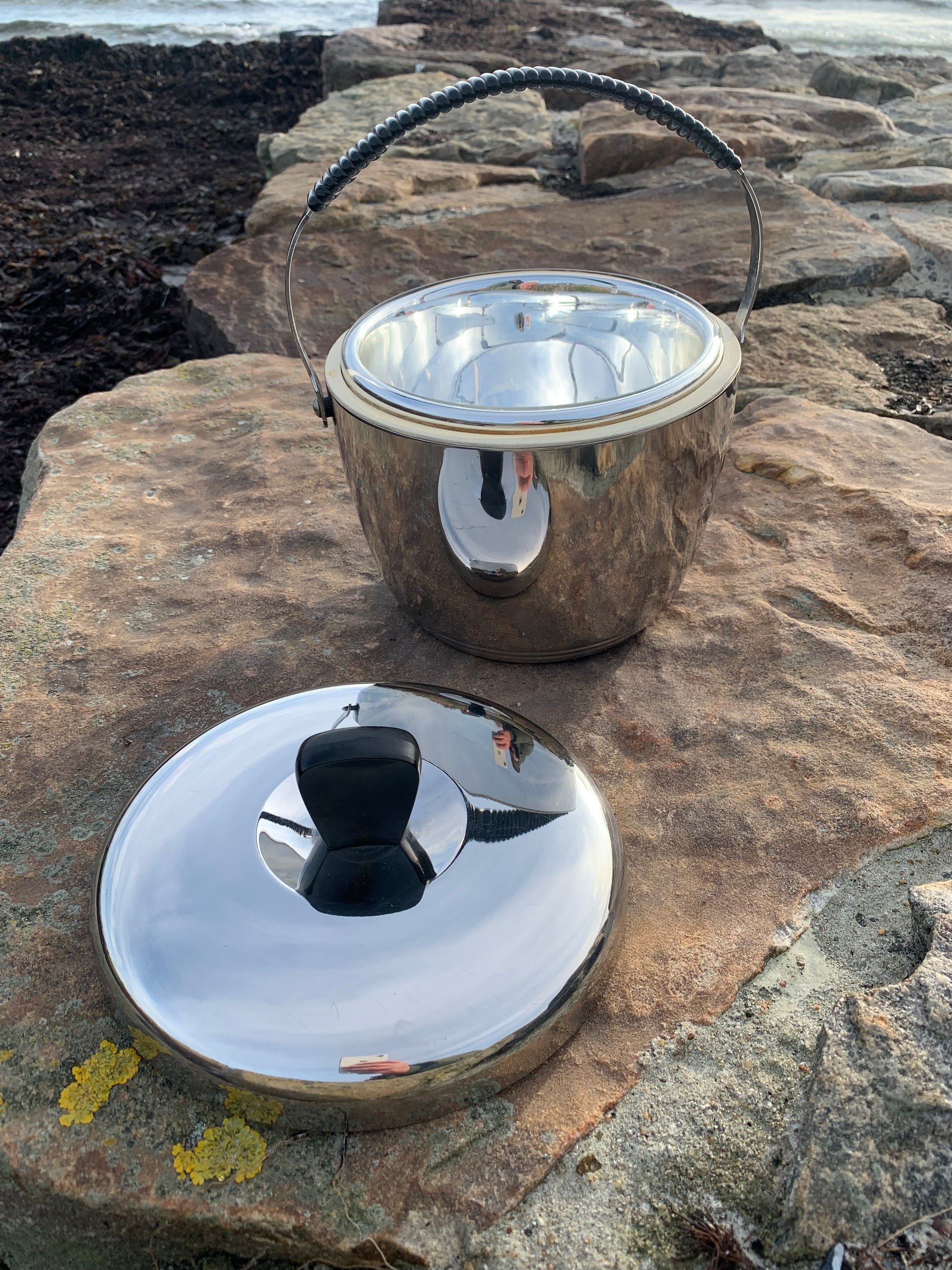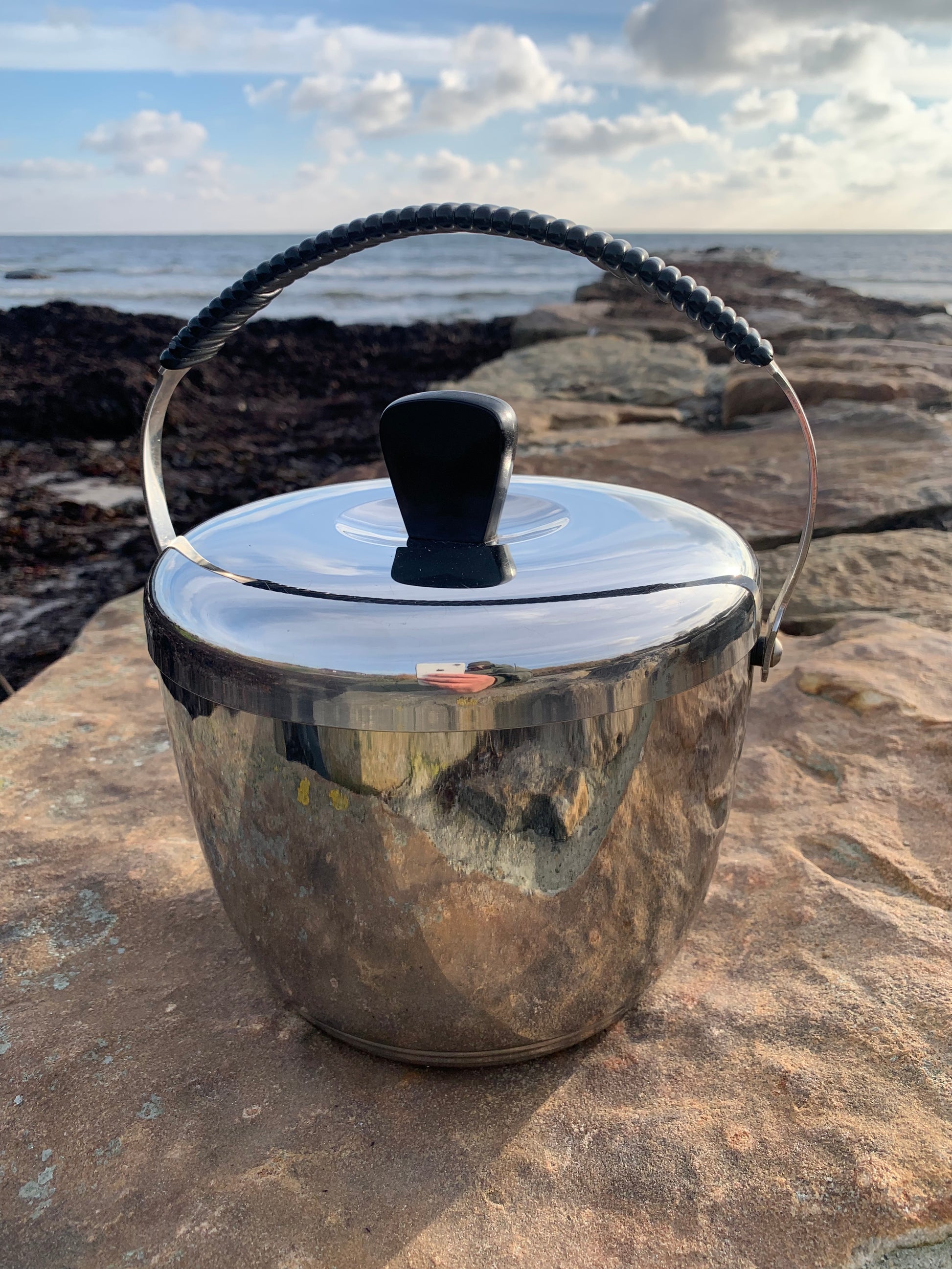 Riktigt fin ishink från Nils Johan - designad av Adam Thylstrup. Ishinken har några fina detaljer i form av en fläta på handtaget och ett fint litet handtag (troligen i bakelit). Den är från 1950-talet och har vissa åldersrelaterade tecken på slitage, men är överlag i gott skick med tanke på sin ålder. Vi har fått höra av en kund att den är bra på att hålla iskall väldigt länge.