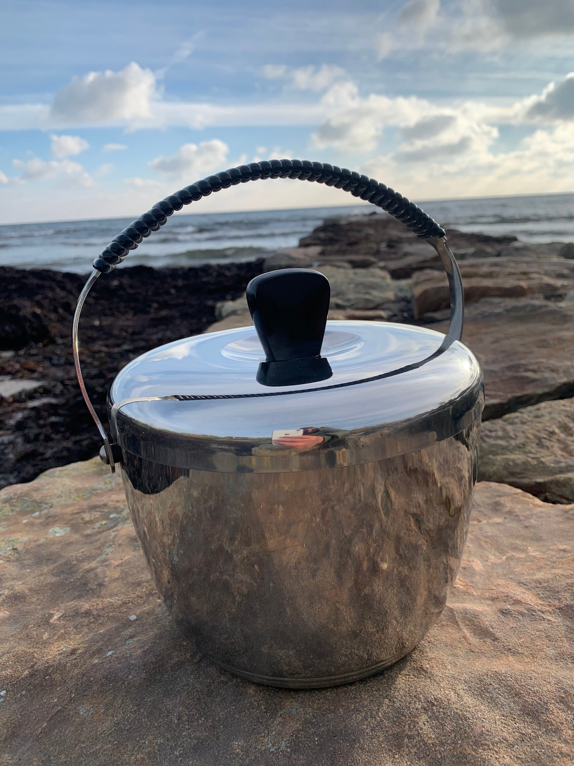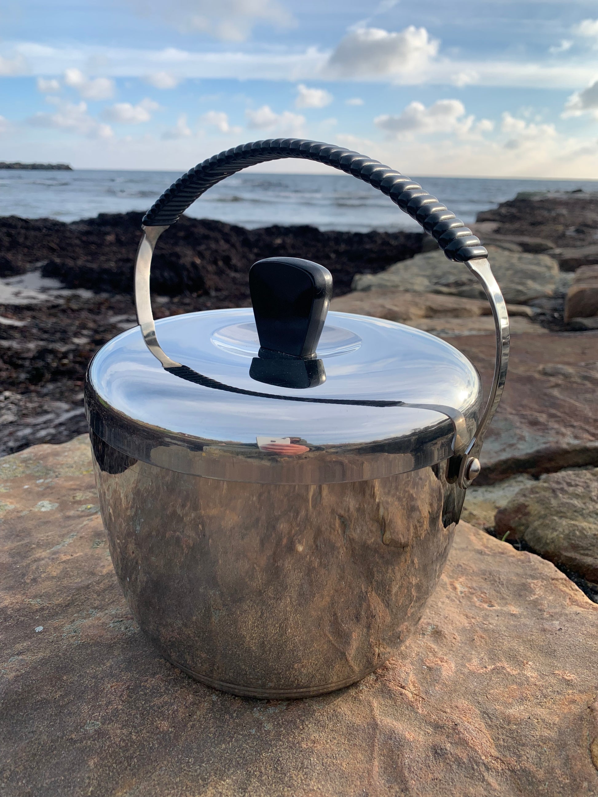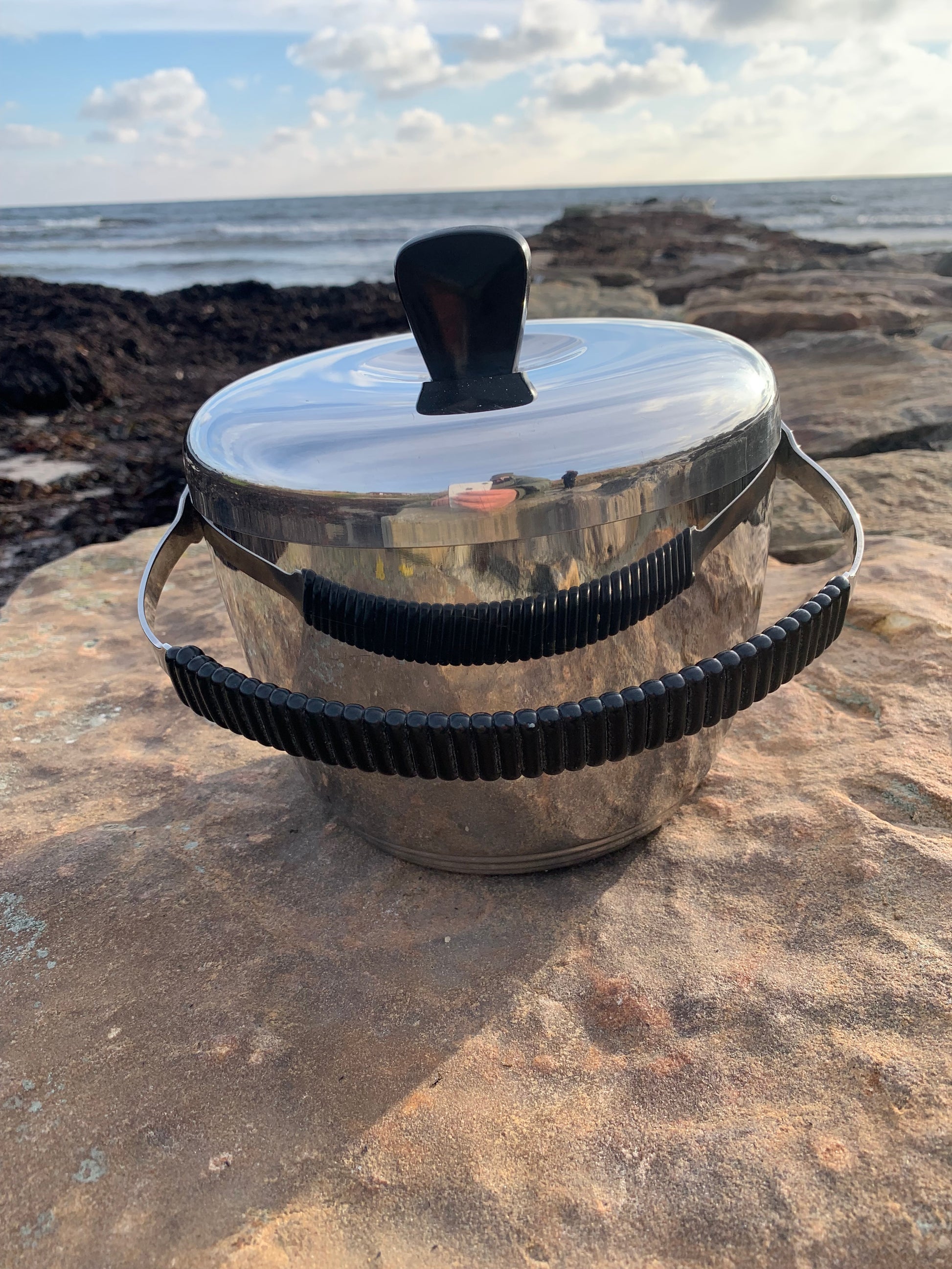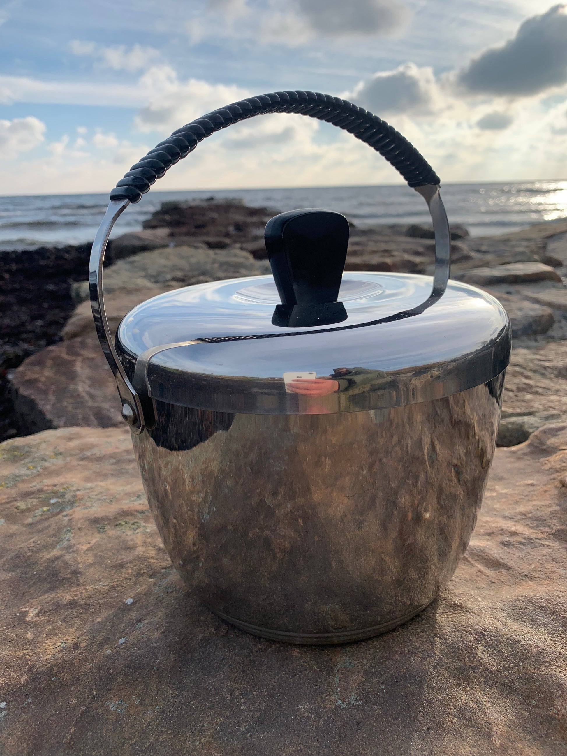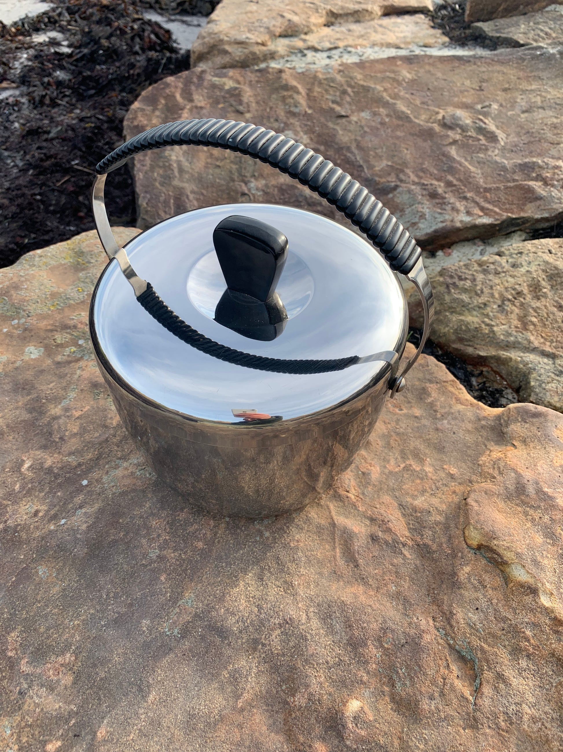 Riktigt fin ishink från Nils Johan - designad av Adam Thylstrup. Ishinken har några fina detaljer i form av en fläta på handtaget och ett fint litet handtag (troligen i bakelit). Den är från 1950-talet och har vissa åldersrelaterade tecken på slitage, men är överlag i gott skick med tanke på sin ålder. Vi har fått höra av en kund att den är bra på att hålla iskall väldigt länge.
