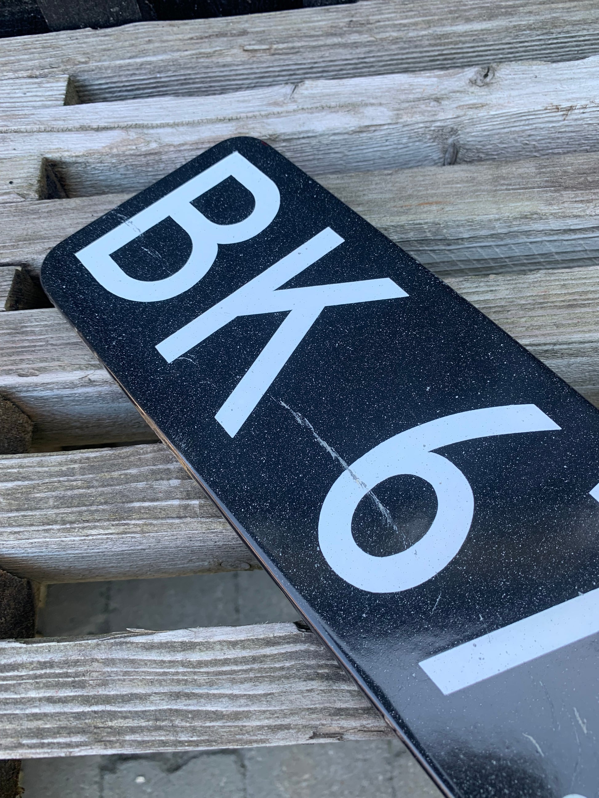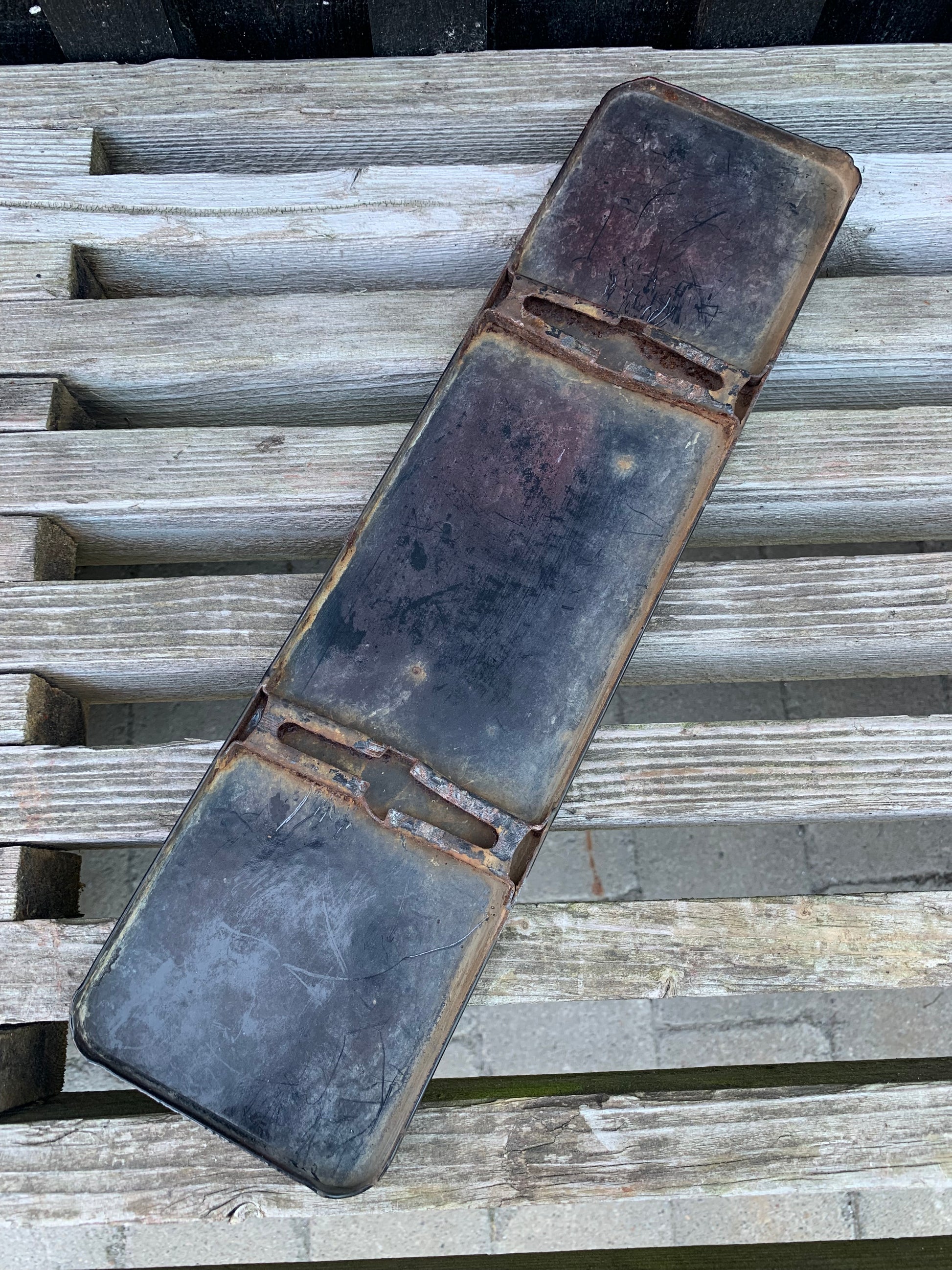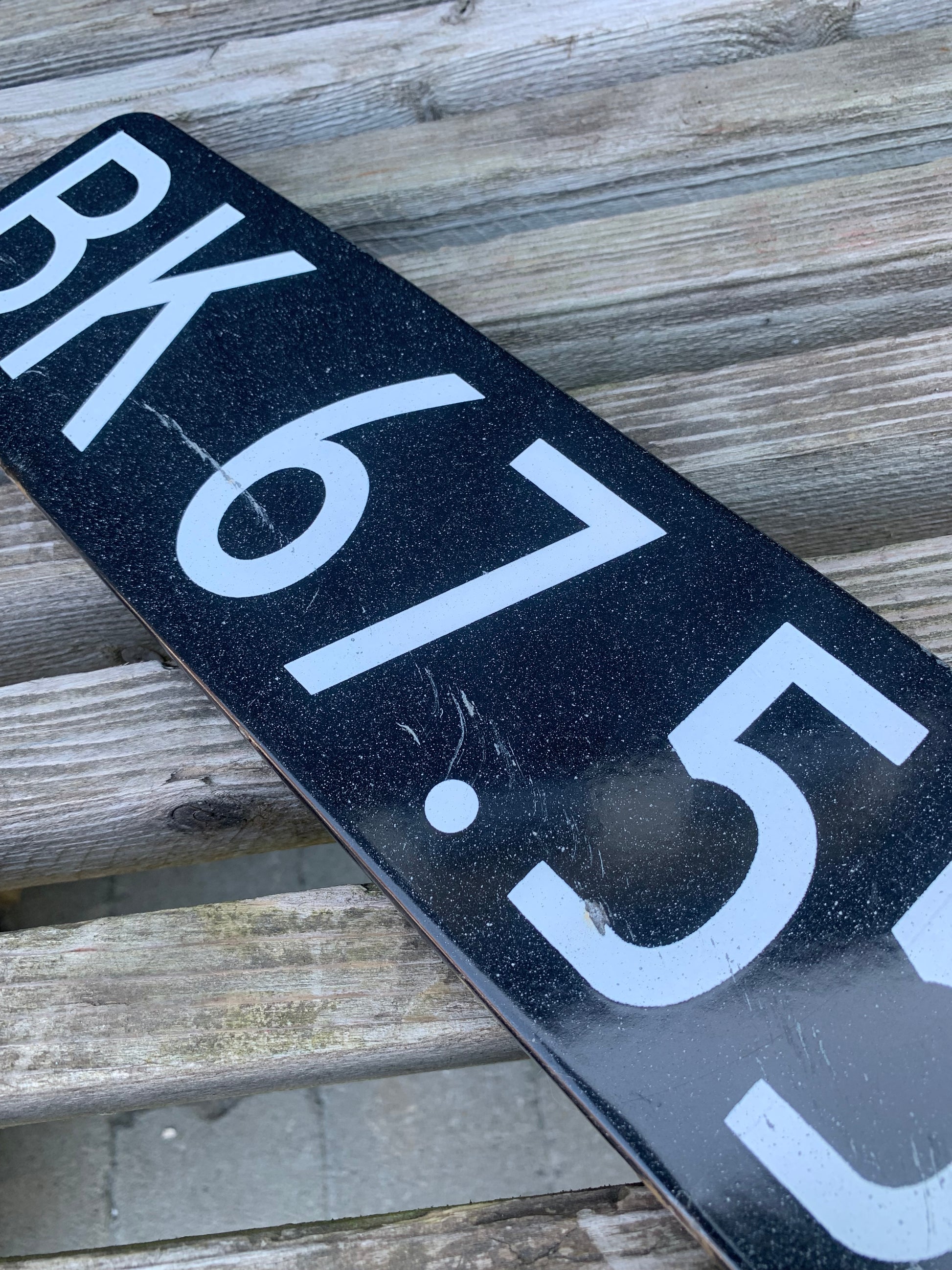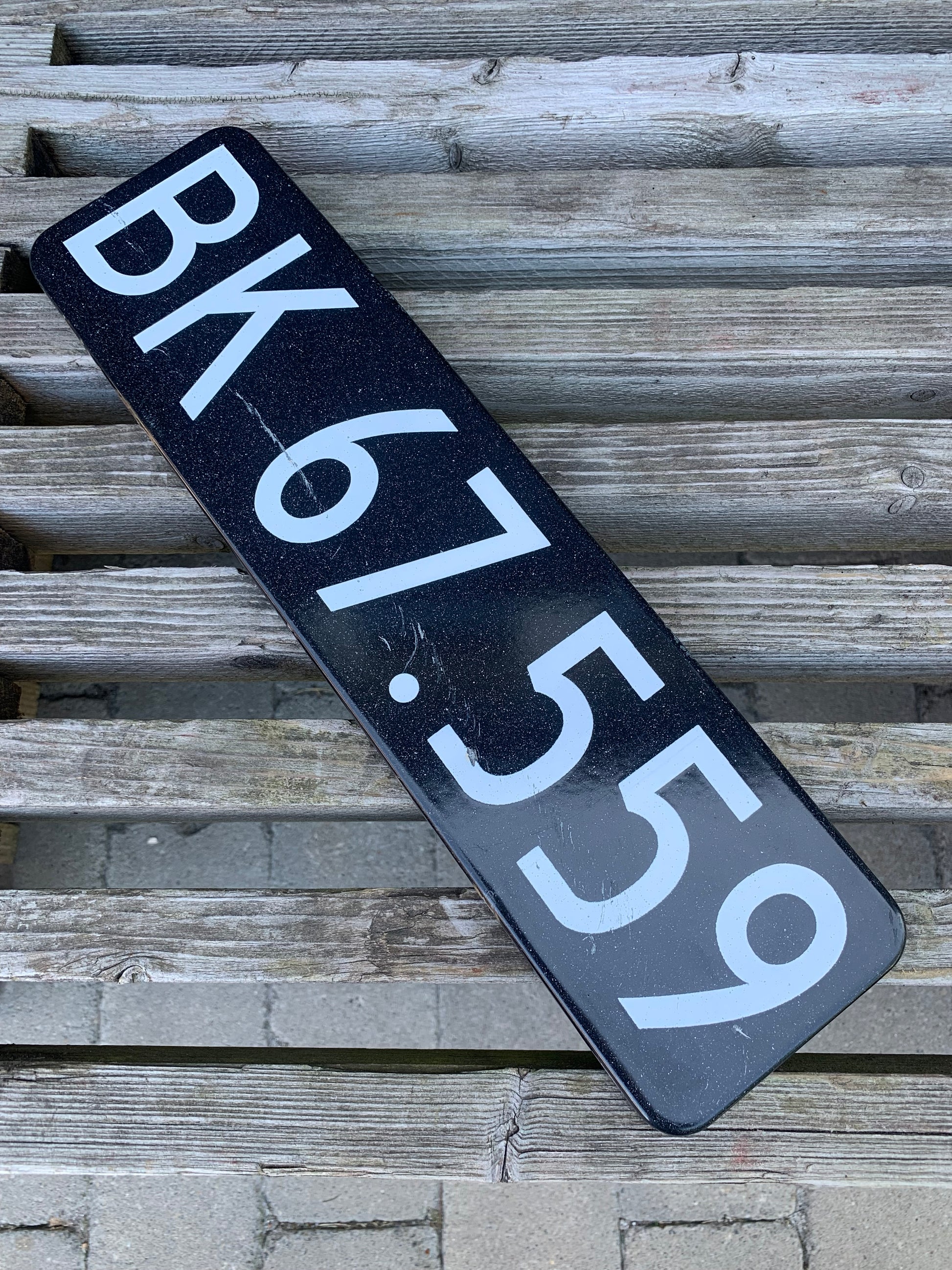 Denna gamla, charmiga registreringsskylt satt en gång på en bil. Tidens tand har tagit ut sin rätt, så den ser ut med den sorts patina (se bilder) som en i den åldern vanligtvis har.