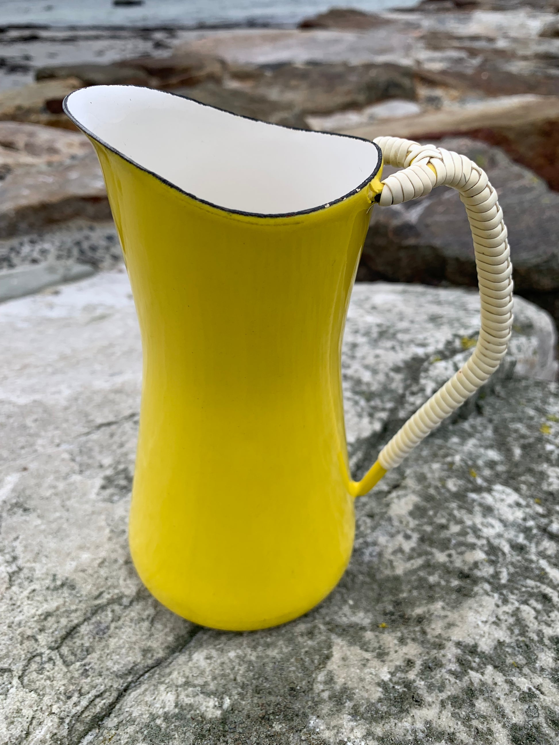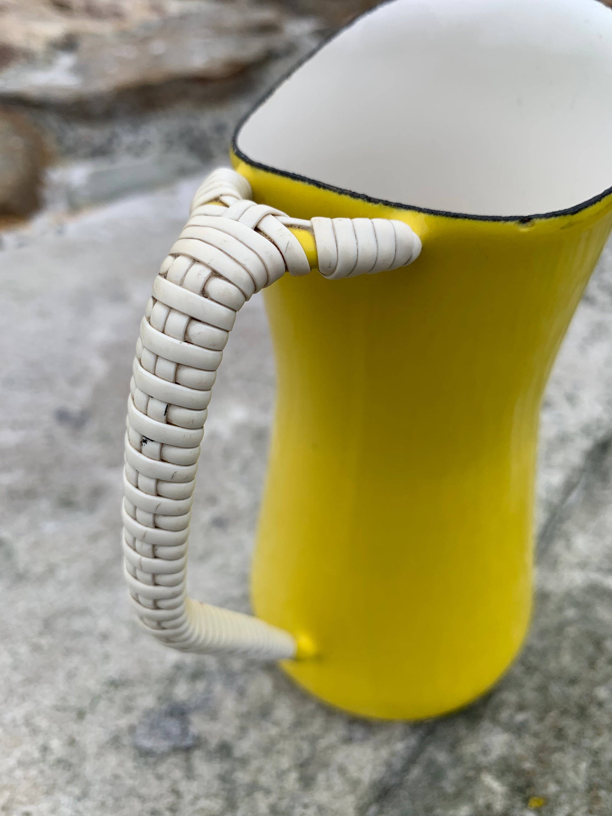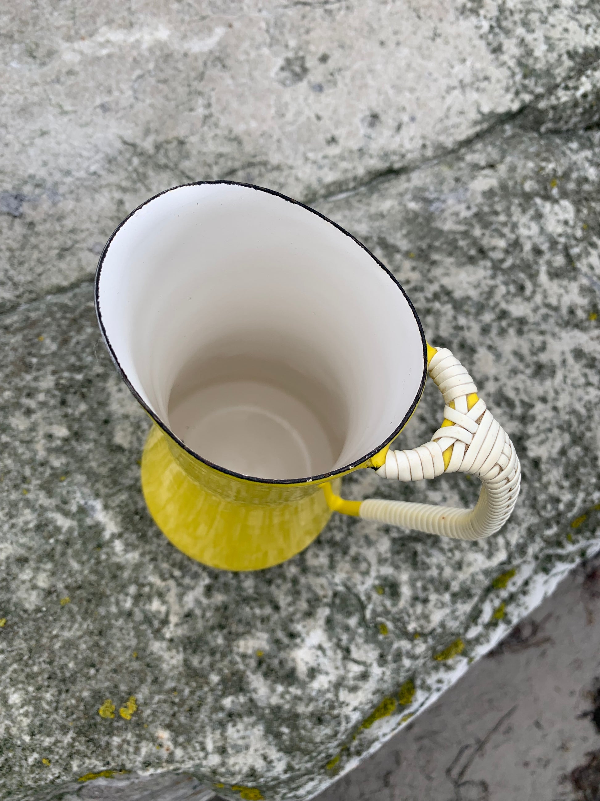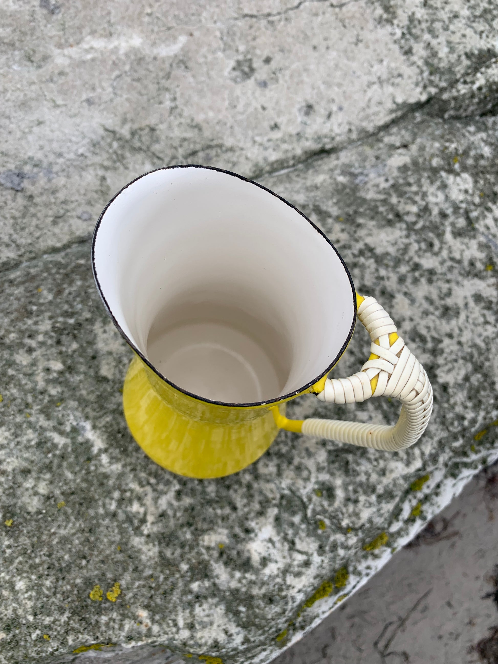 Vacker emaljkanna från Jens Harald Quistgaard. Den vackra kannan (med det välkända flätade handtaget) i fint vintageskick. Kannan har ett minimalt emaljflis längst ner på handtaget, en "liten fräkne" inuti botten och en liten mjuk buckla längst ner (svår att fånga på bild då den är nästan osynlig).