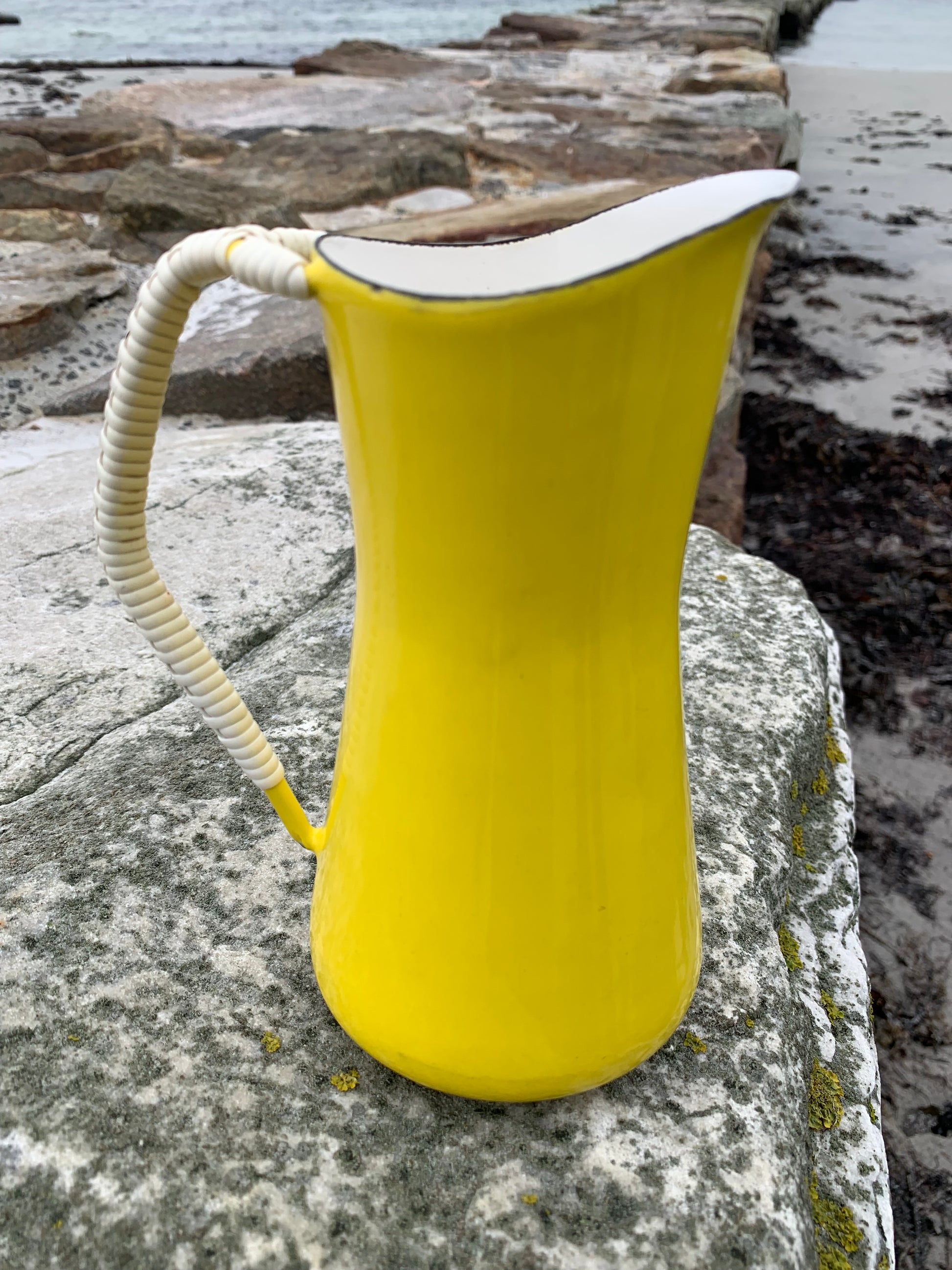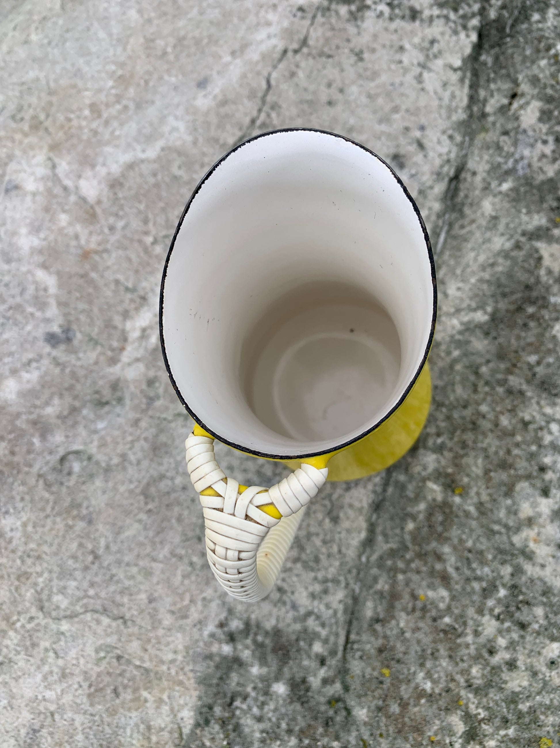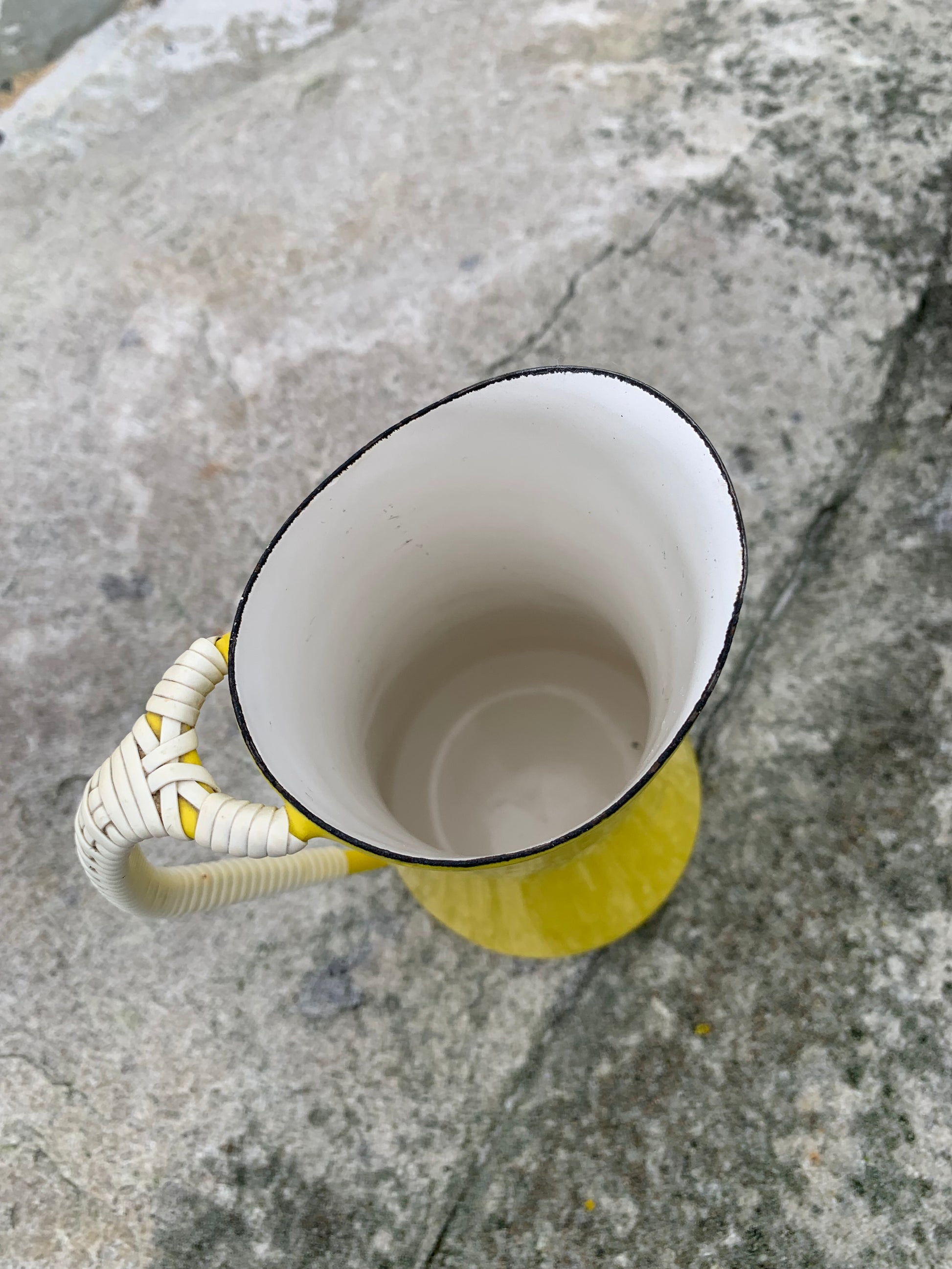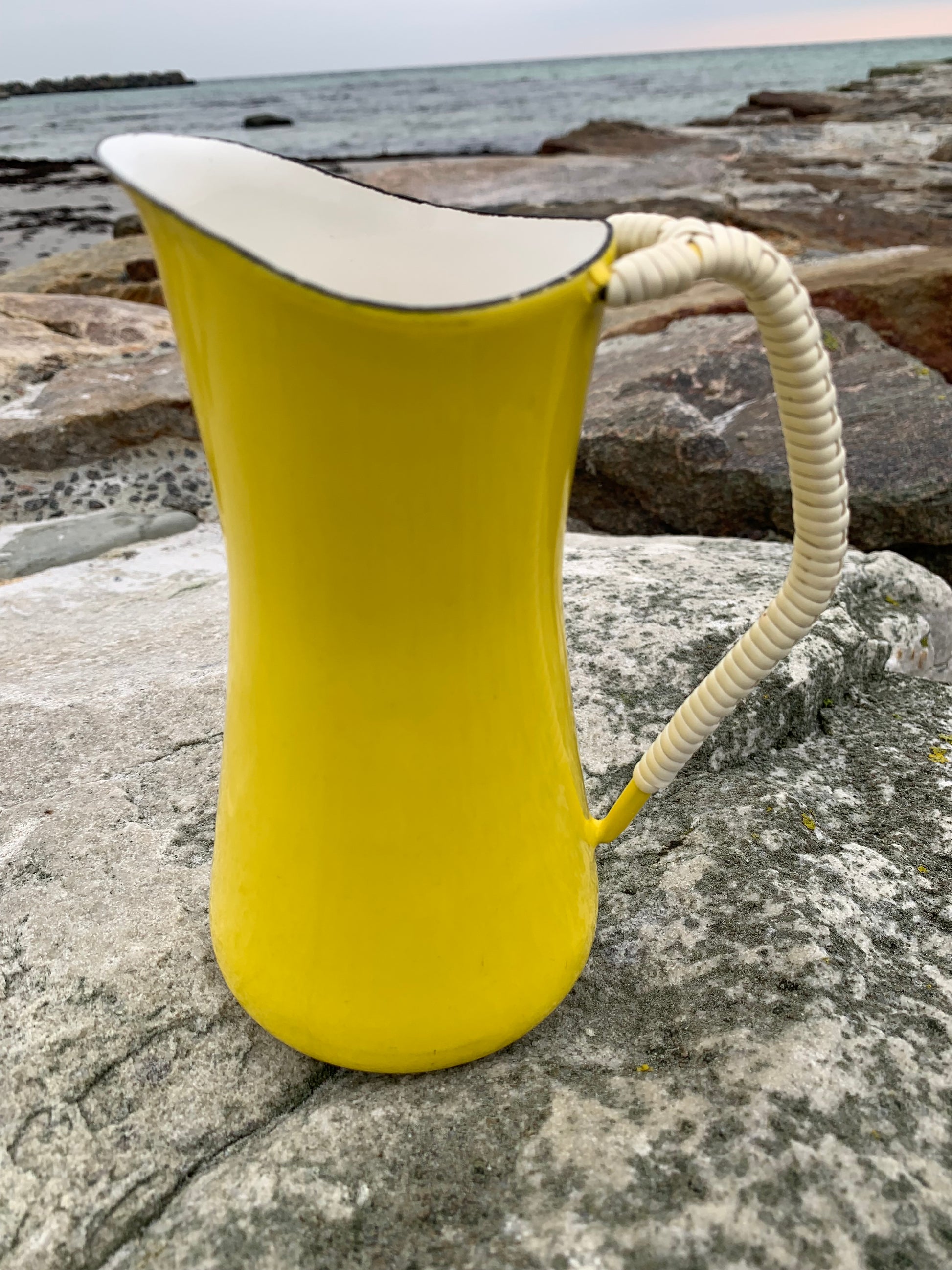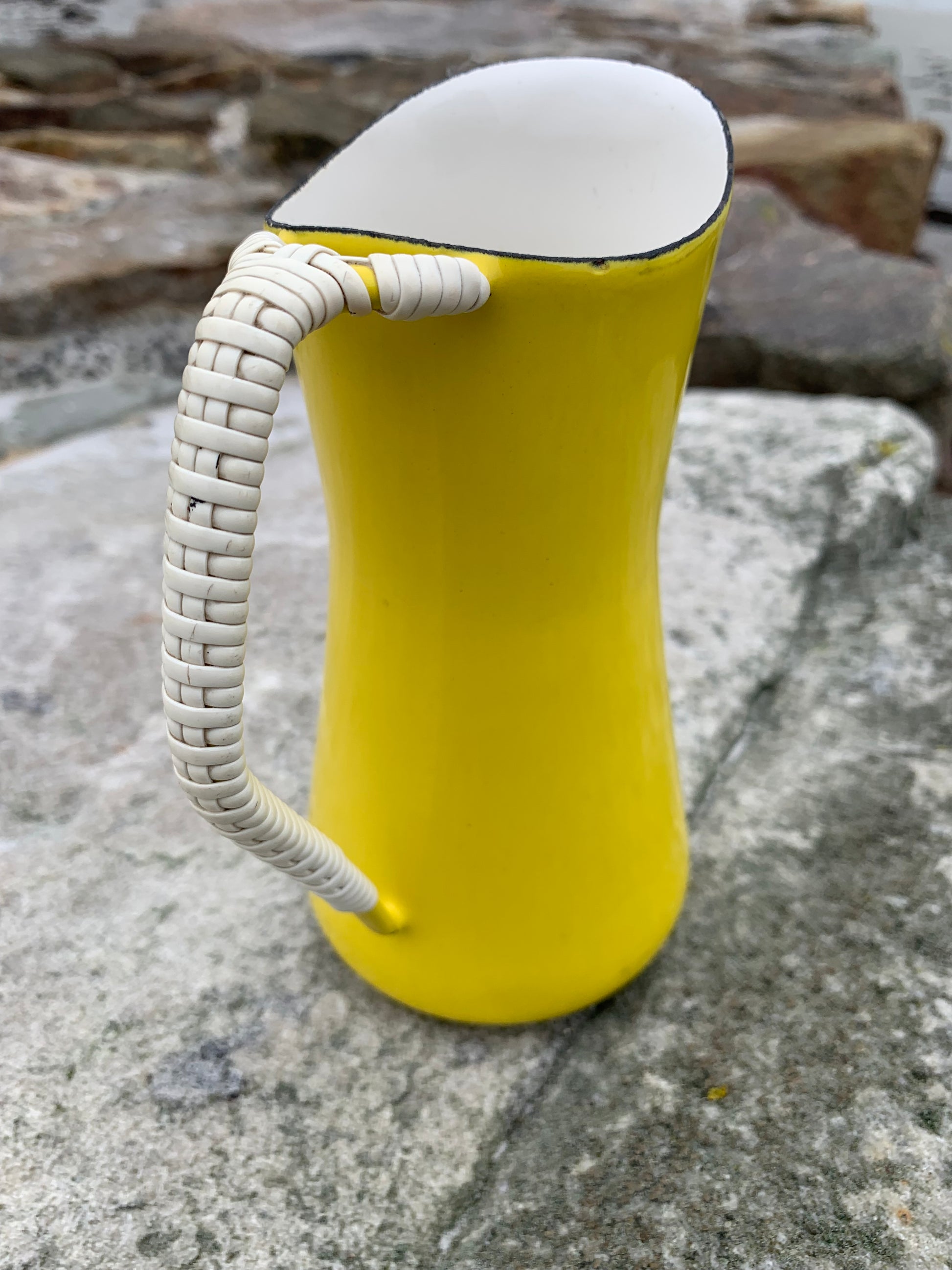 Vacker emaljkanna från Jens Harald Quistgaard. Den vackra kannan (med det välkända flätade handtaget) i fint vintageskick. Kannan har ett minimalt emaljflis längst ner på handtaget, en "liten fräkne" inuti botten och en liten mjuk buckla längst ner (svår att fånga på bild då den är nästan osynlig).