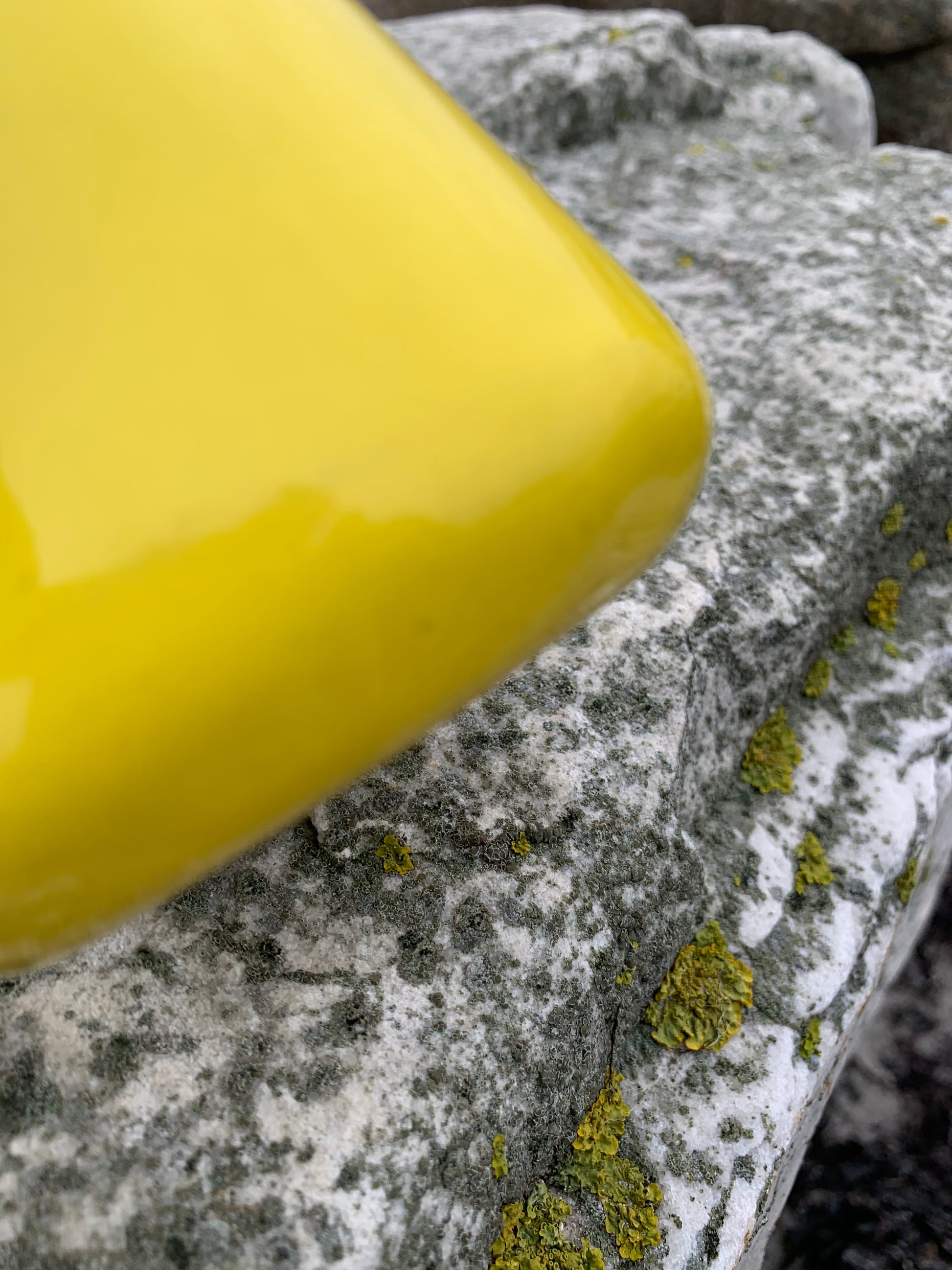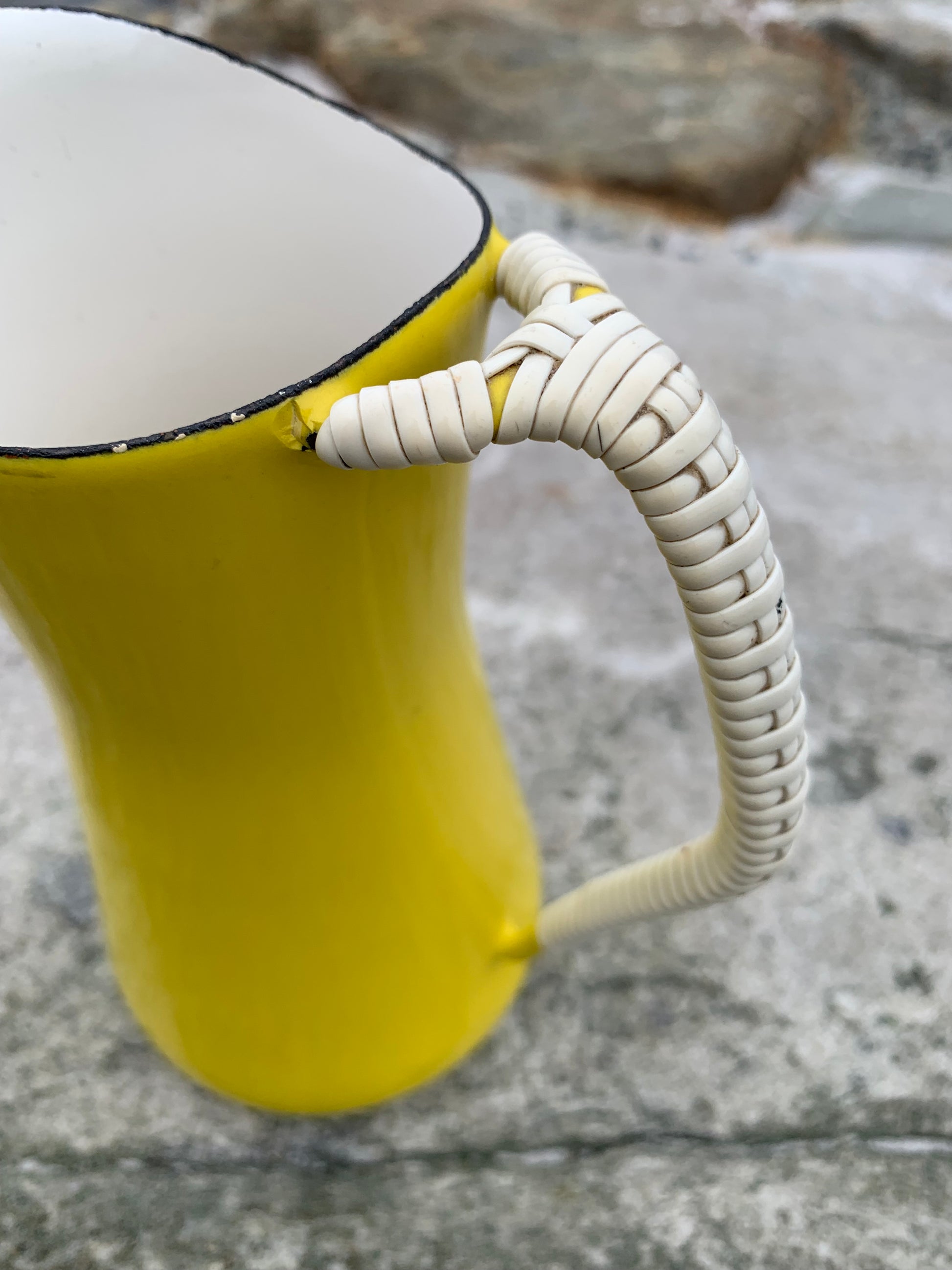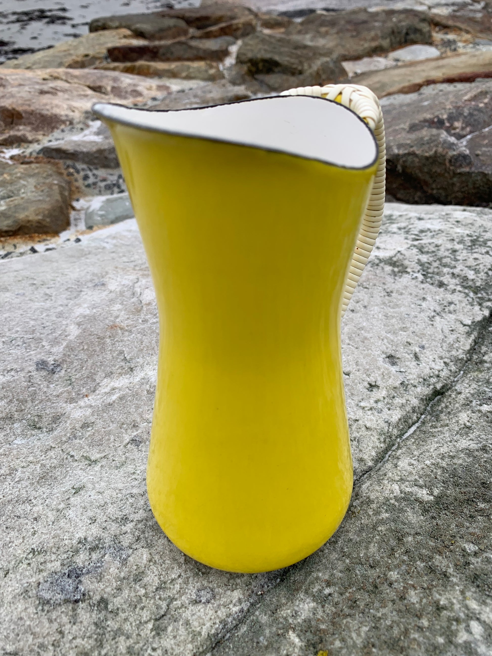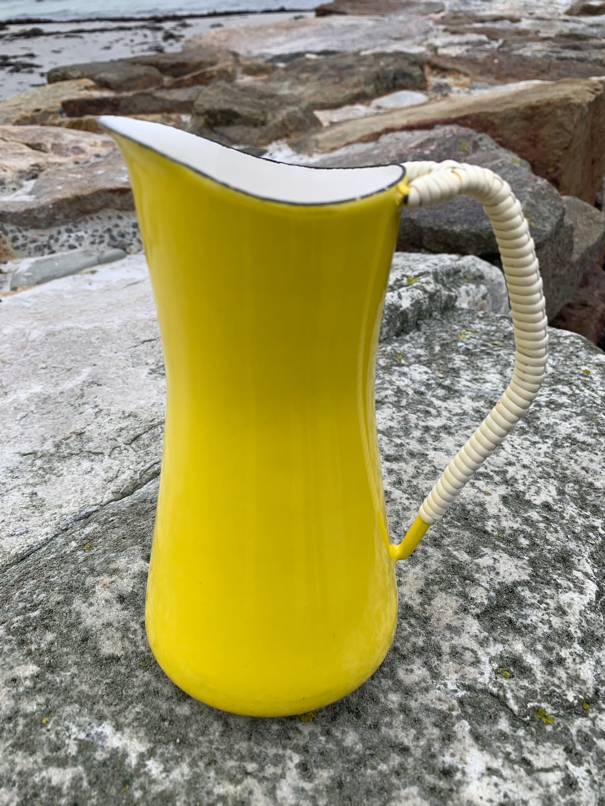 Vacker emaljkanna från Jens Harald Quistgaard. Den vackra kannan (med det välkända flätade handtaget) i fint vintageskick. Kannan har ett minimalt emaljflis längst ner på handtaget, en "liten fräkne" inuti botten och en liten mjuk buckla längst ner (svår att fånga på bild då den är nästan osynlig).