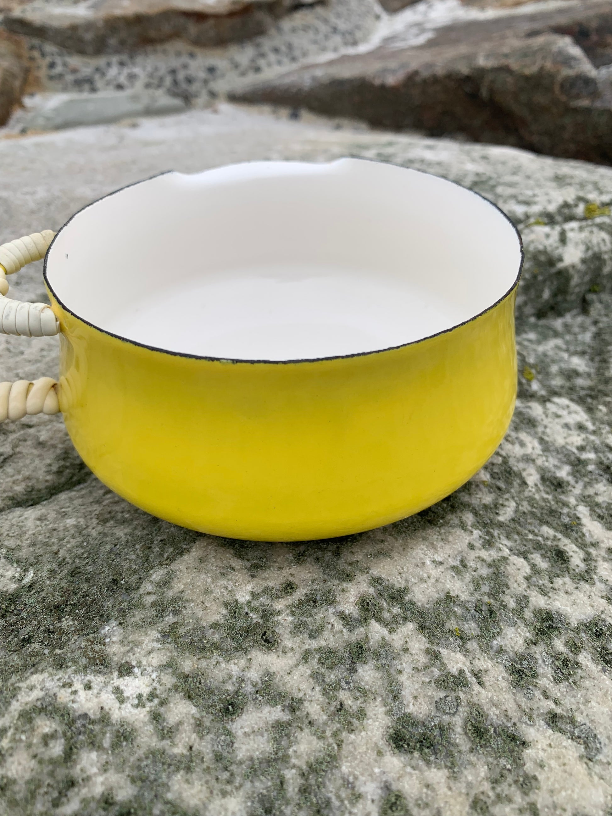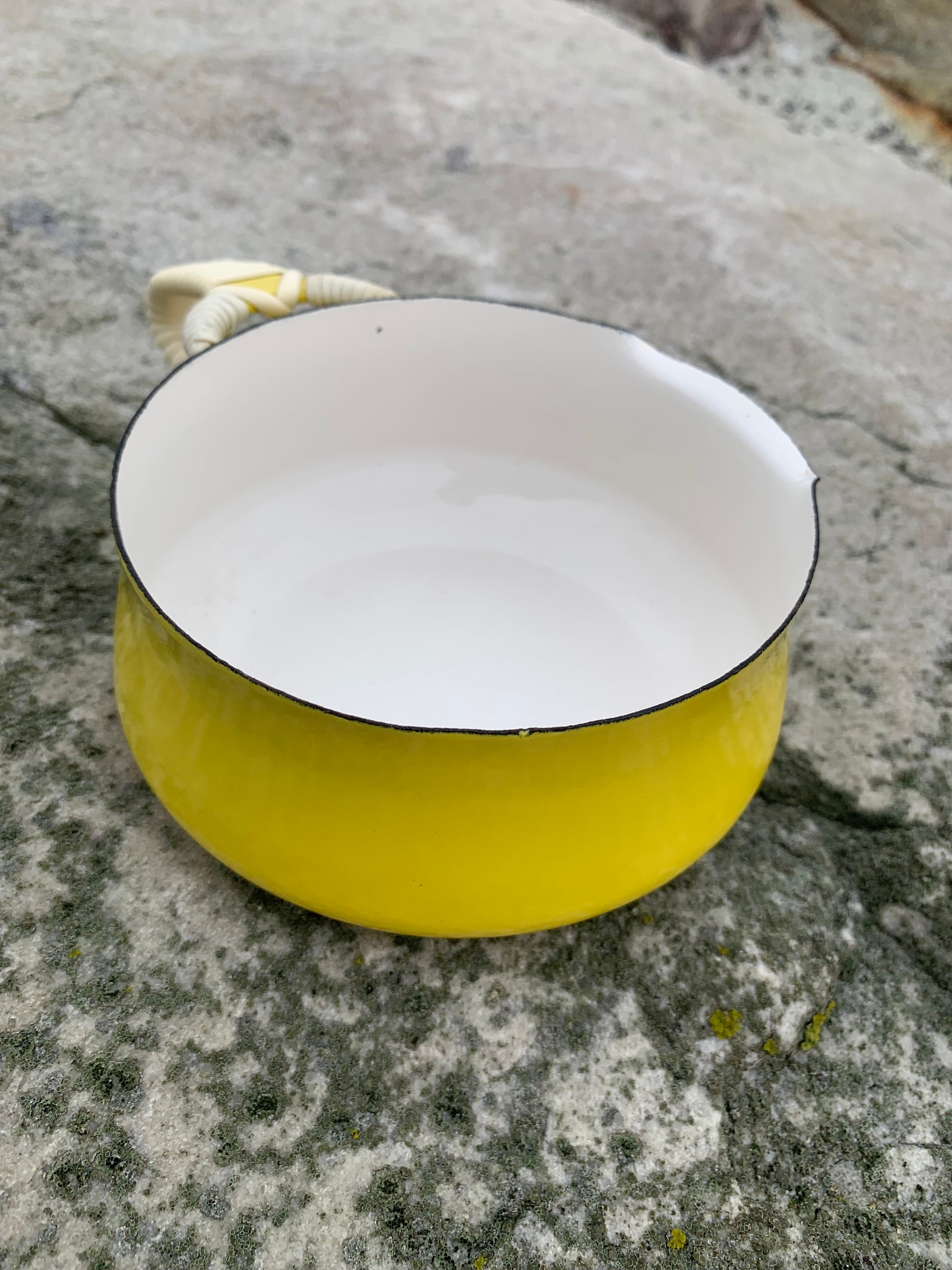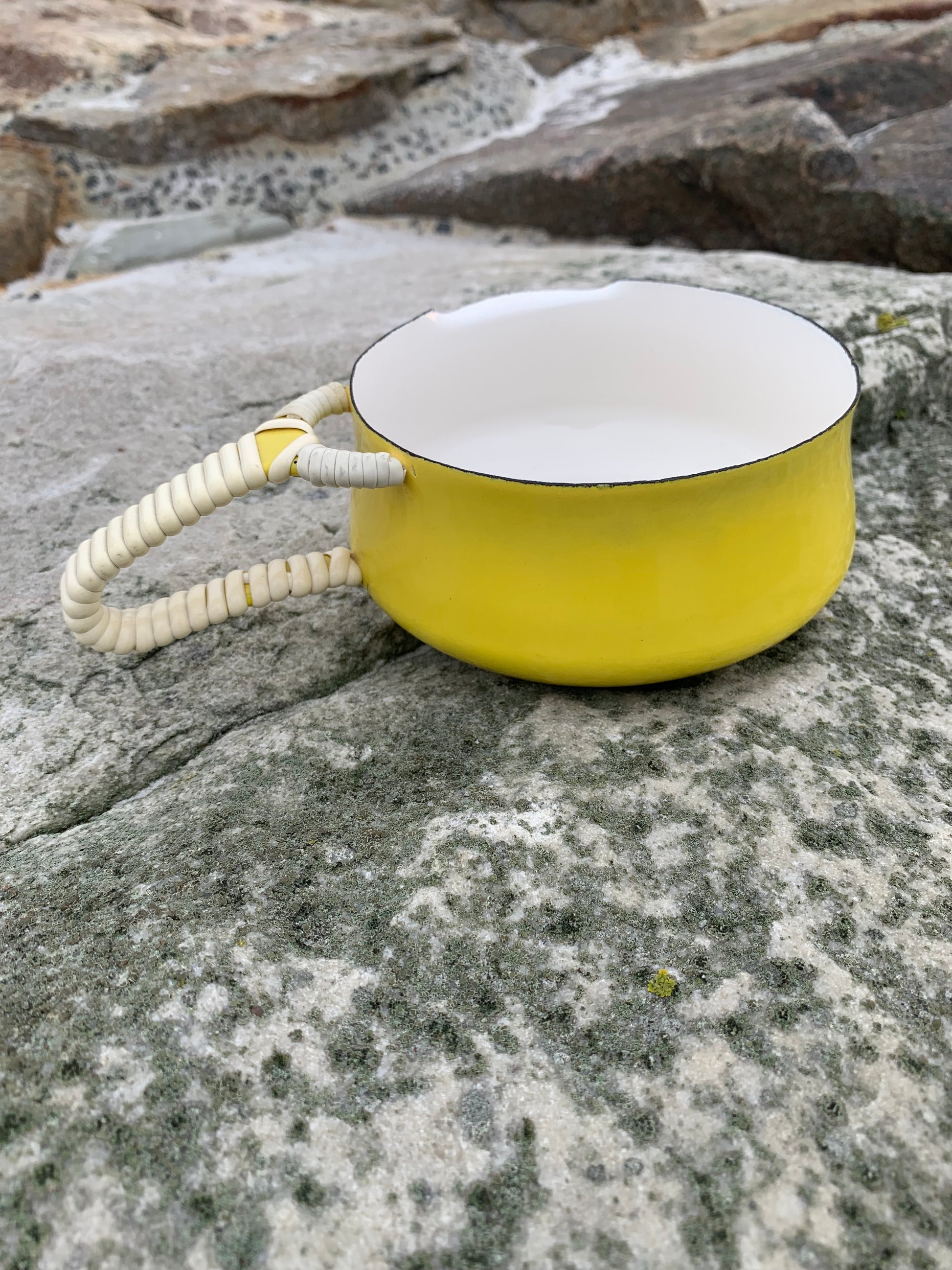 Ett exceptionellt fint exempel på den vackra emaljskålen (såsskålen) från Jens Harald Quistgaard. Den vackra gula skålen (med det välkända rottinghandtaget) är i sällan skådat gott skick med minimala tecken på slitage med tanke på dess ålder.