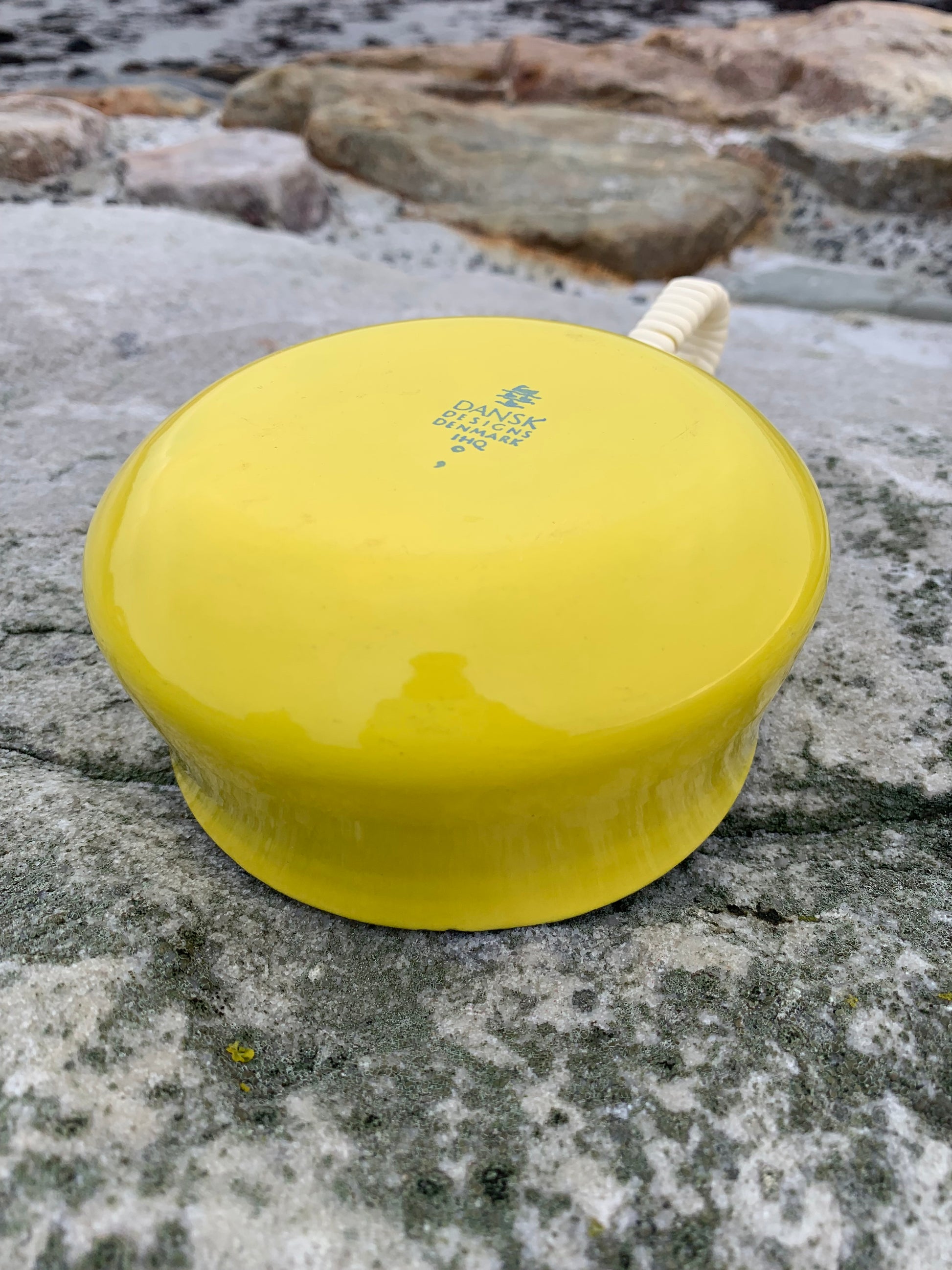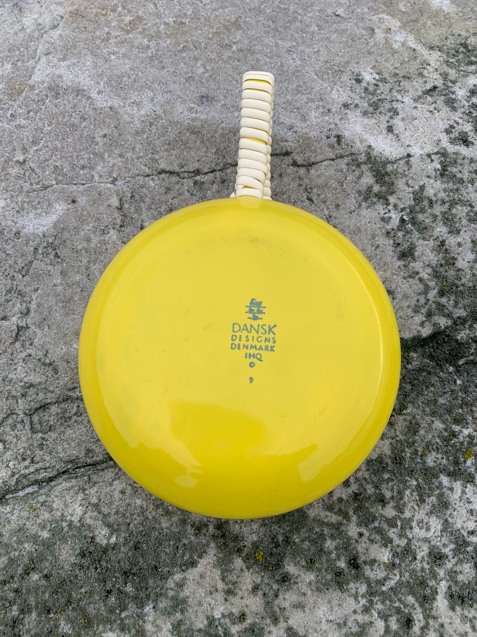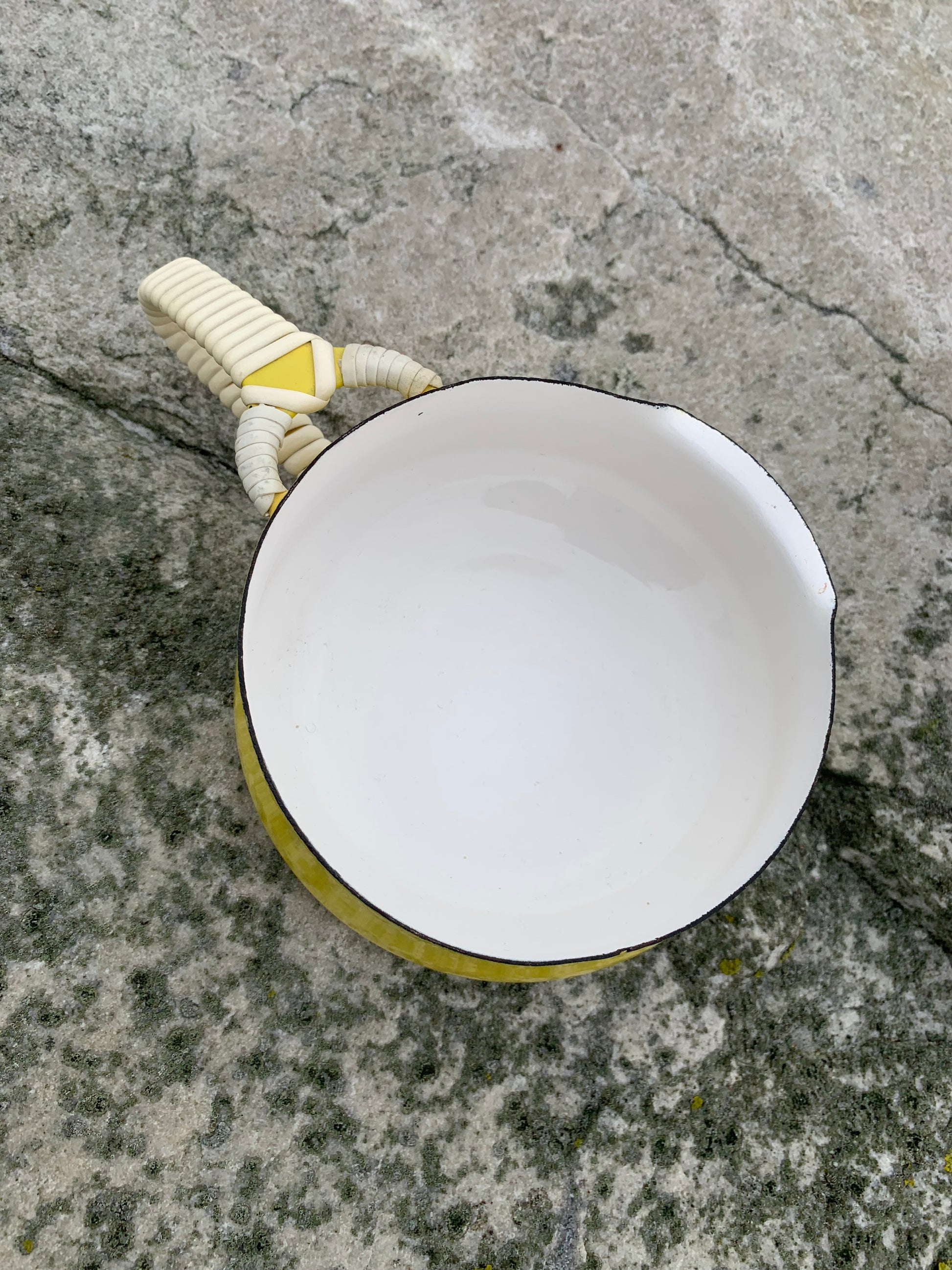 Ett exceptionellt fint exempel på den vackra emaljskålen (såsskålen) från Jens Harald Quistgaard. Den vackra gula skålen (med det välkända rottinghandtaget) är i sällan skådat gott skick med minimala tecken på slitage med tanke på dess ålder.