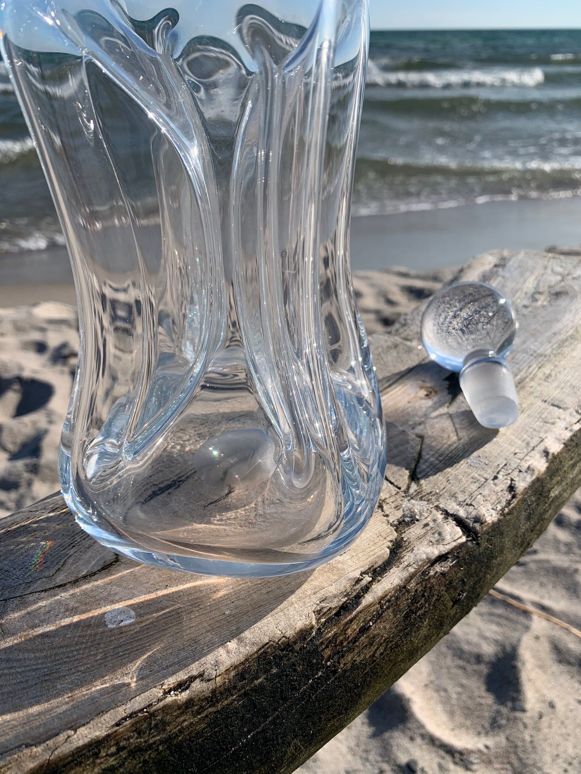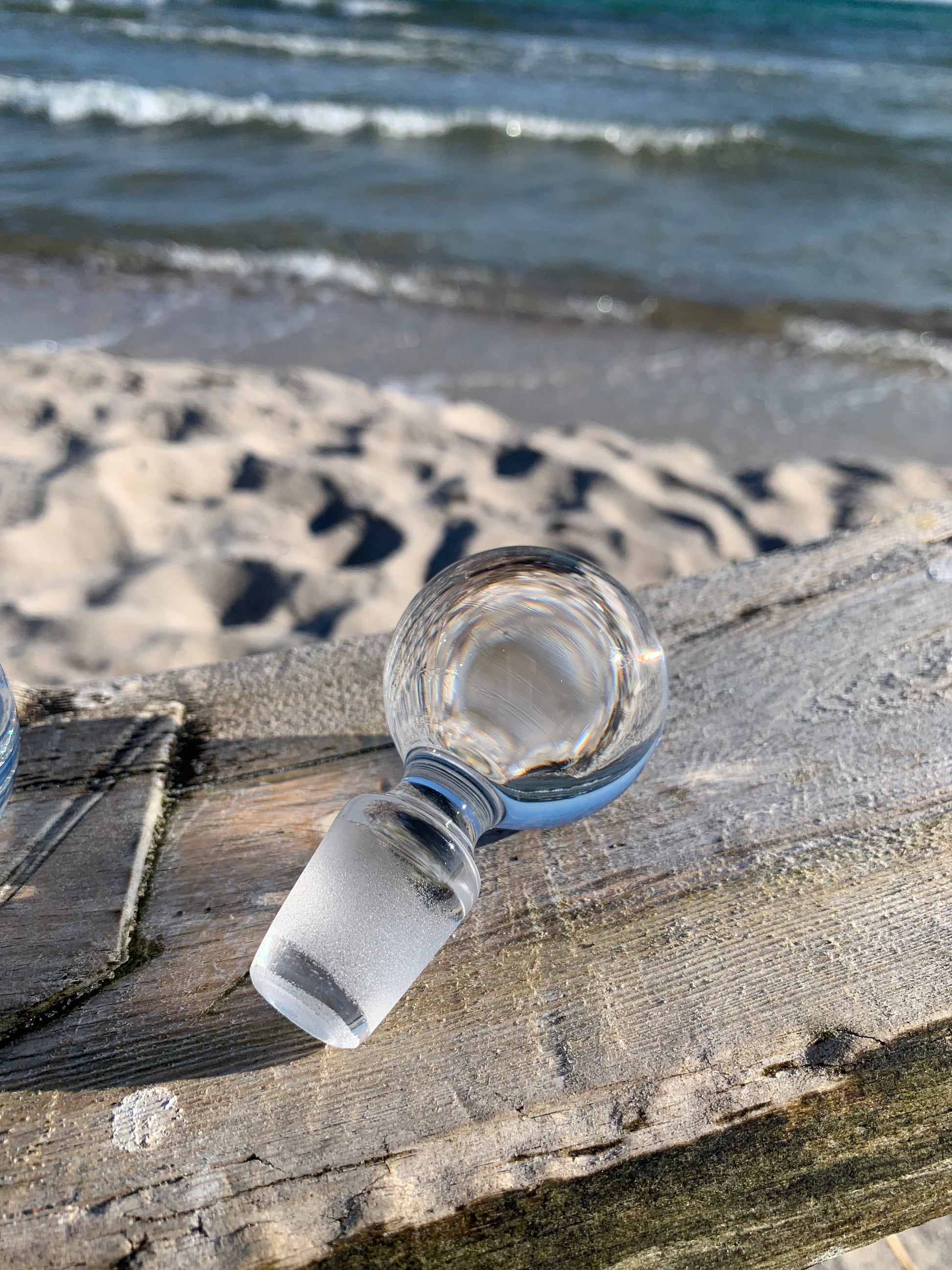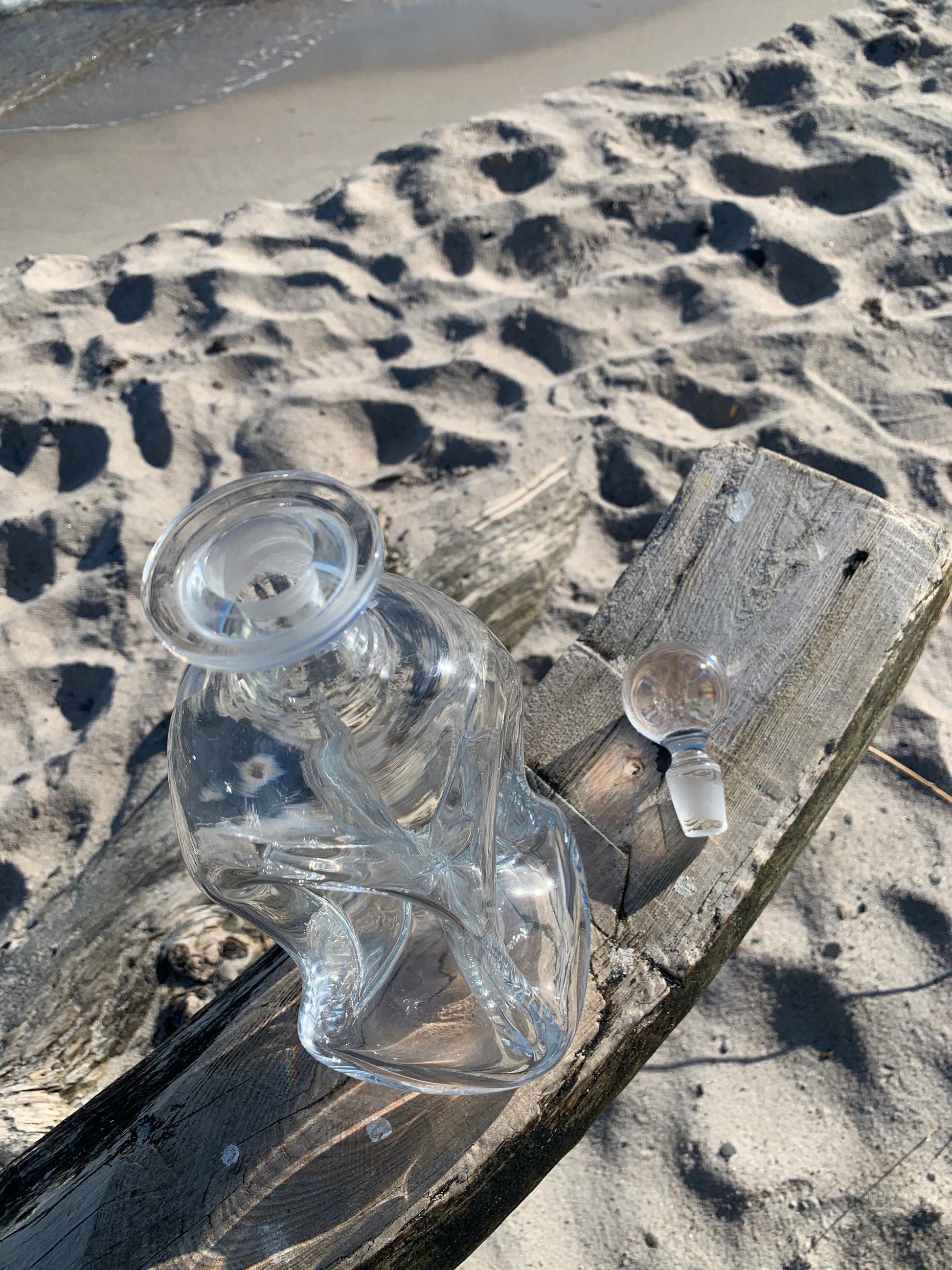 Stor Holmegaard chuckflaska med glaspropp. Längst ner på flaskan står Aktivbanken diskret skrivet. Flaskan har några åldersrelaterade tecken på användning.