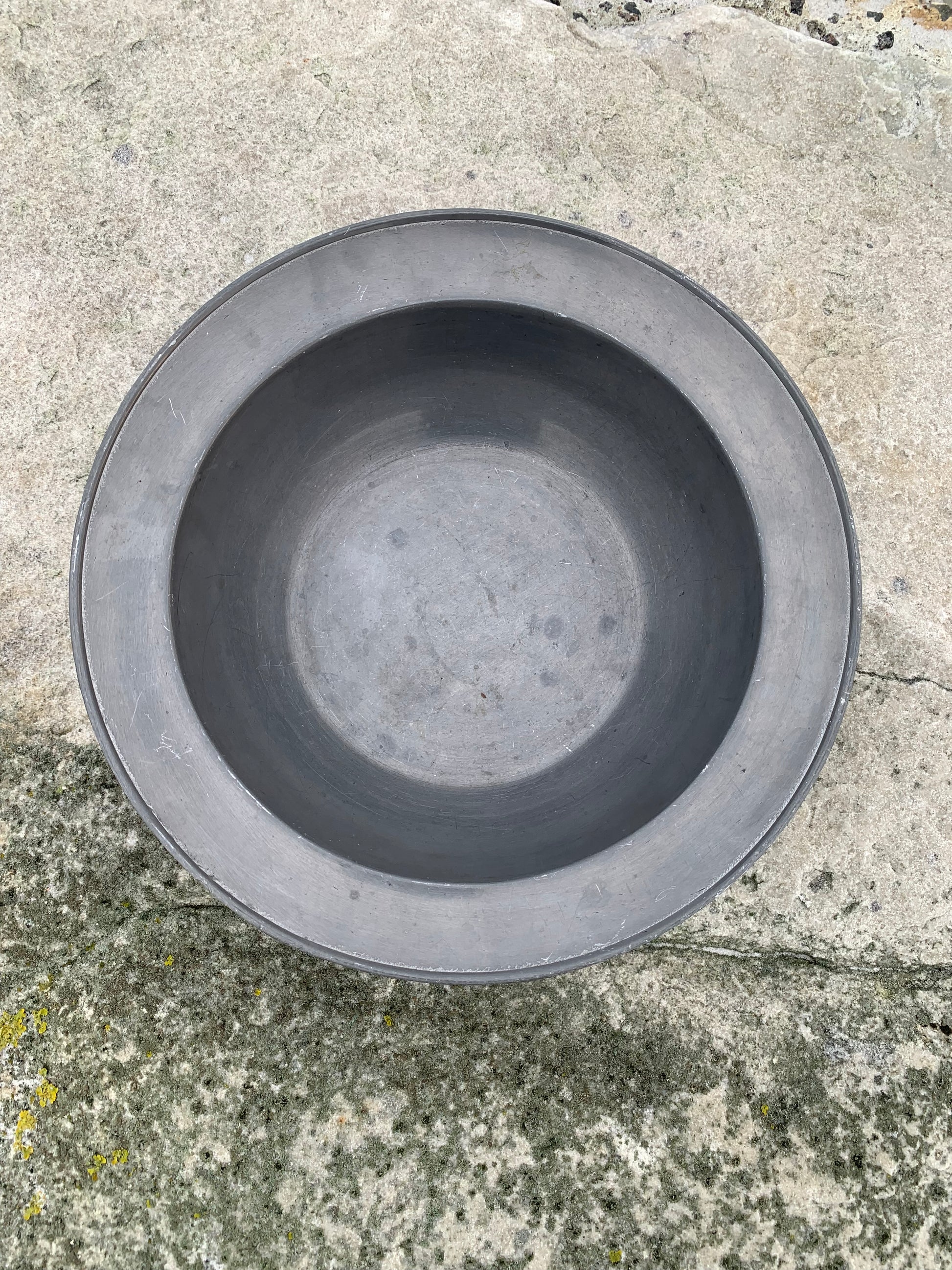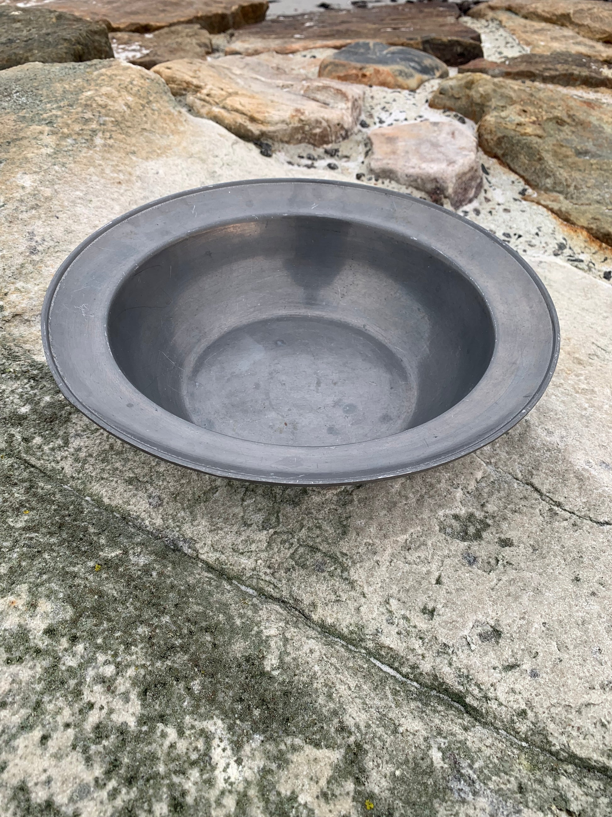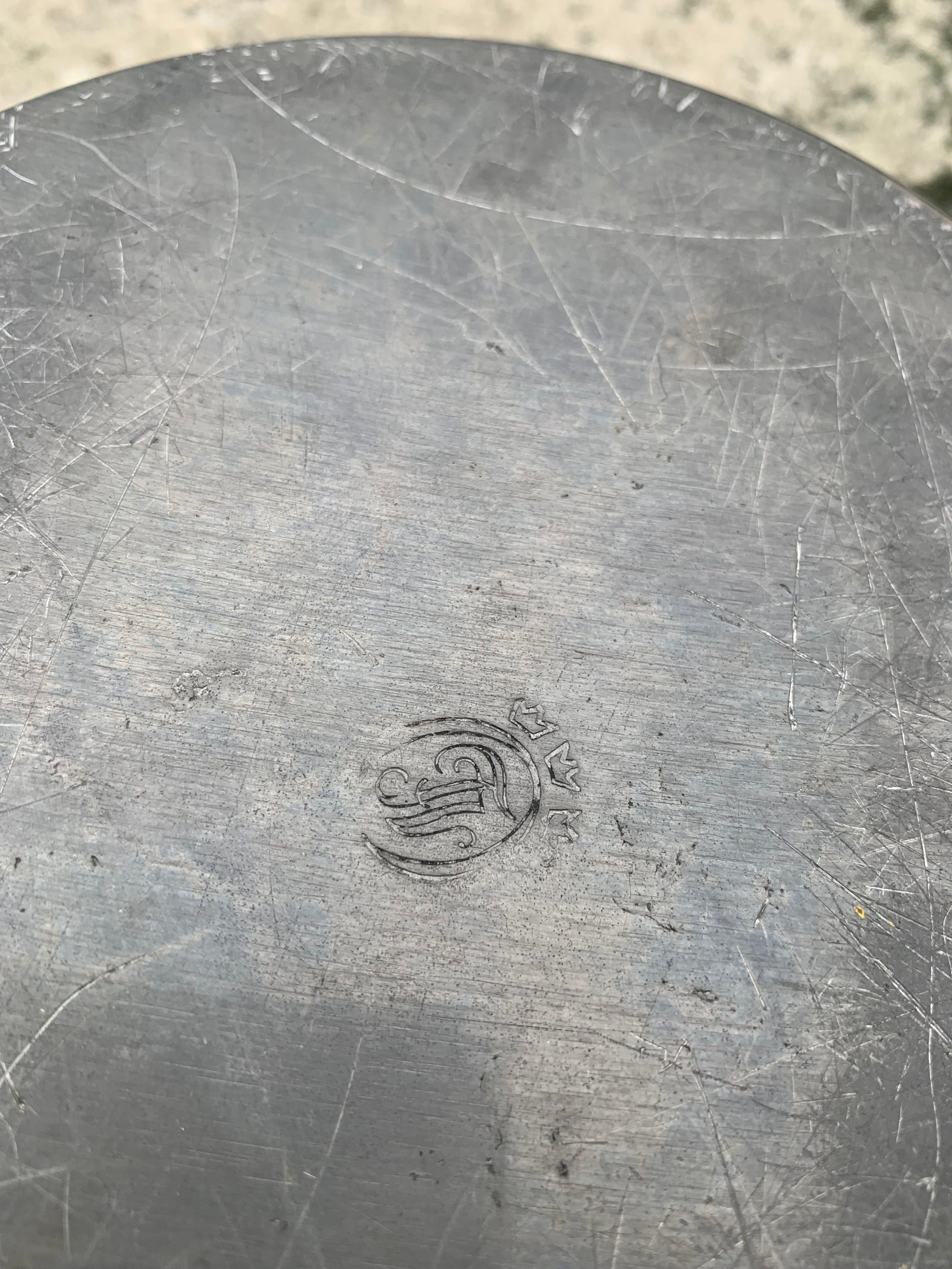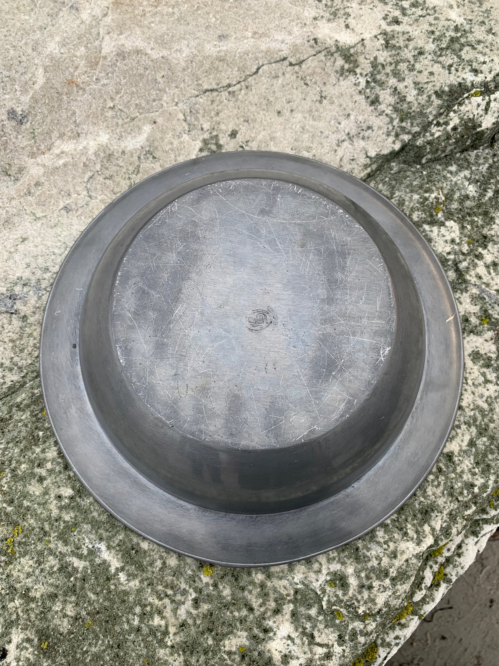 Vackert gammalt tennfat med mycket patina - mycket dekorativt och med stämpel.