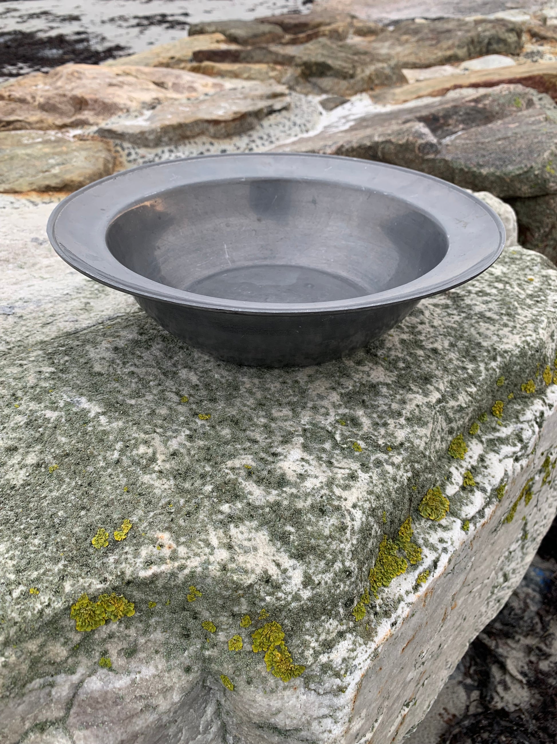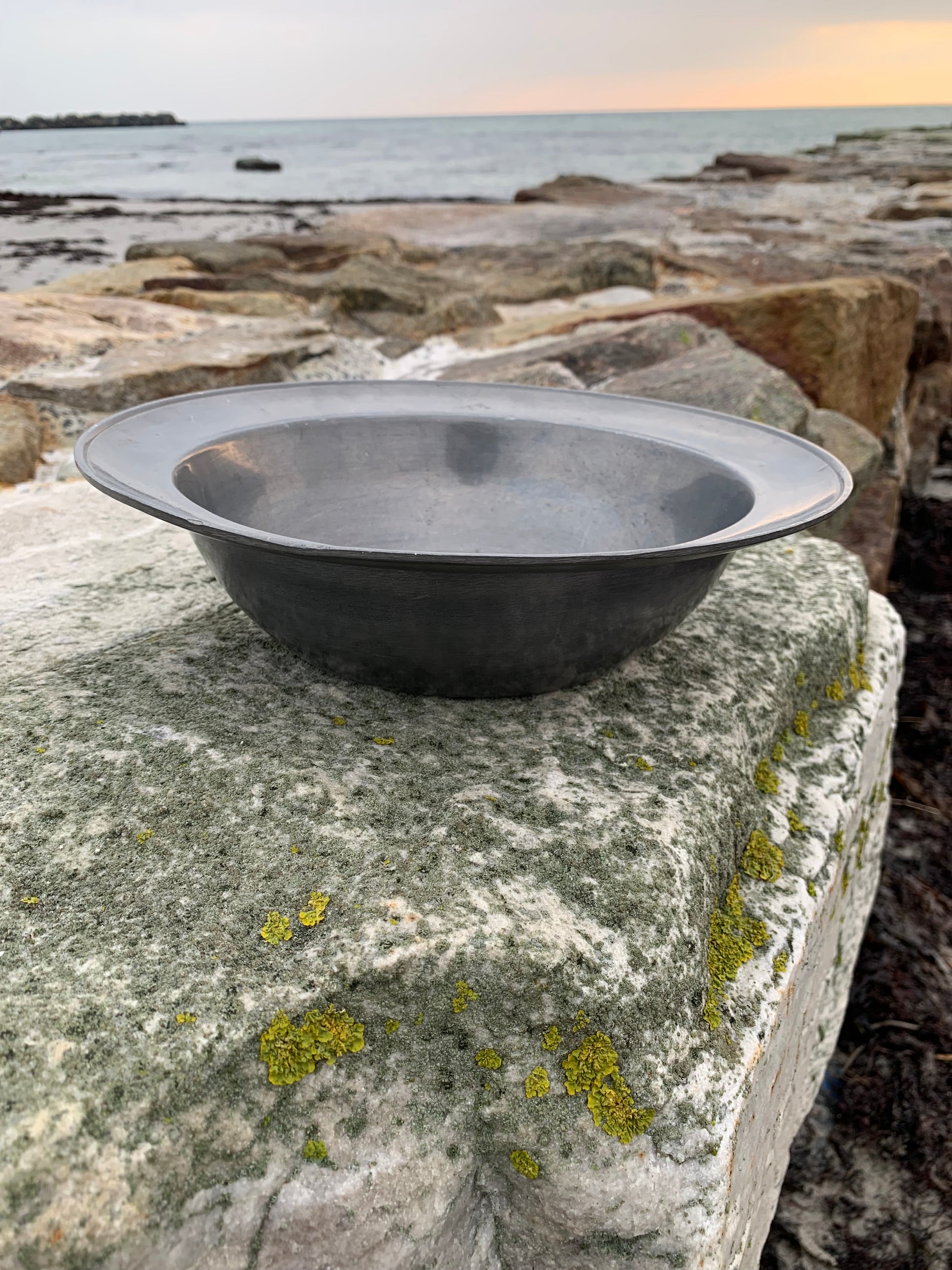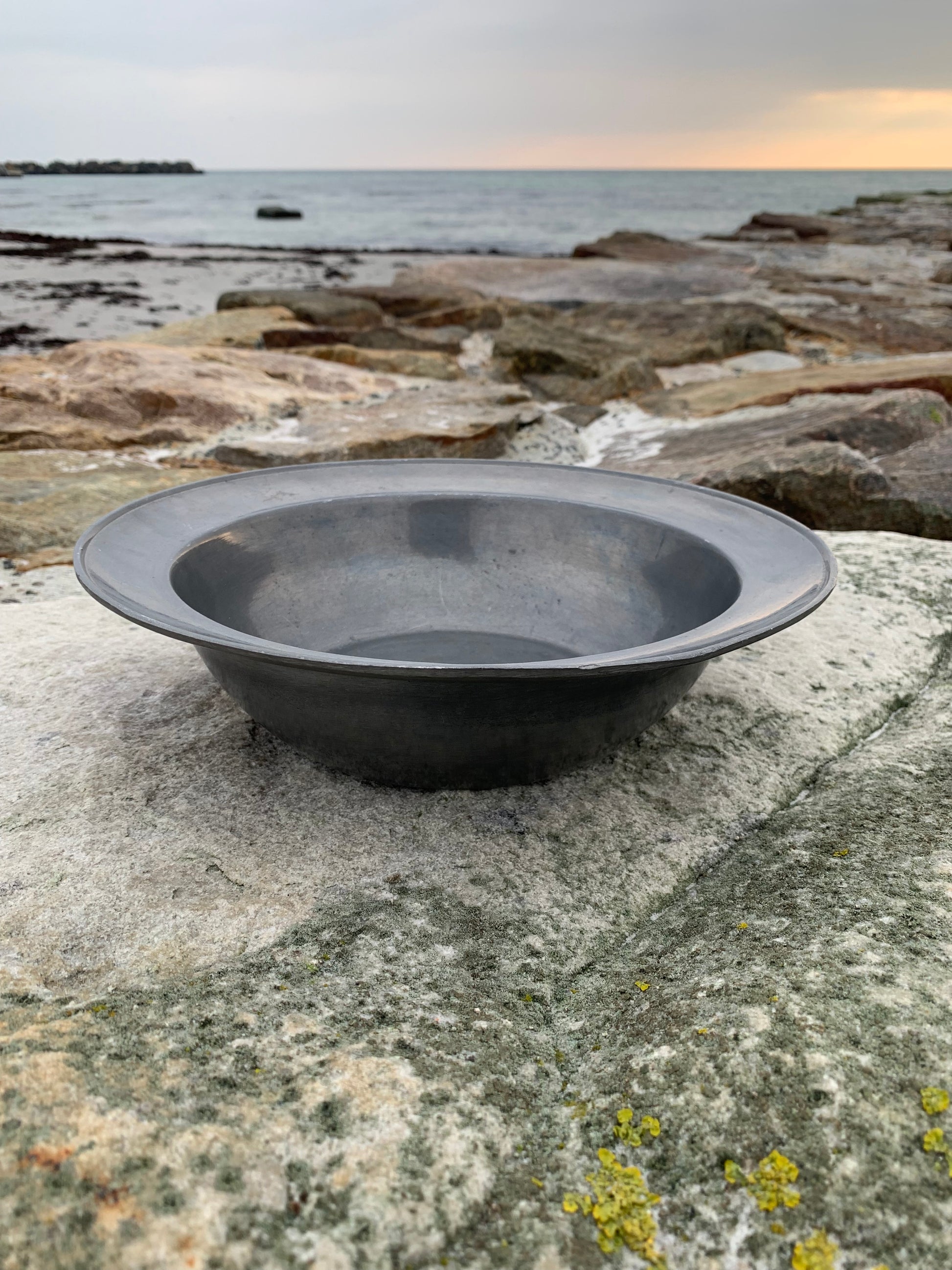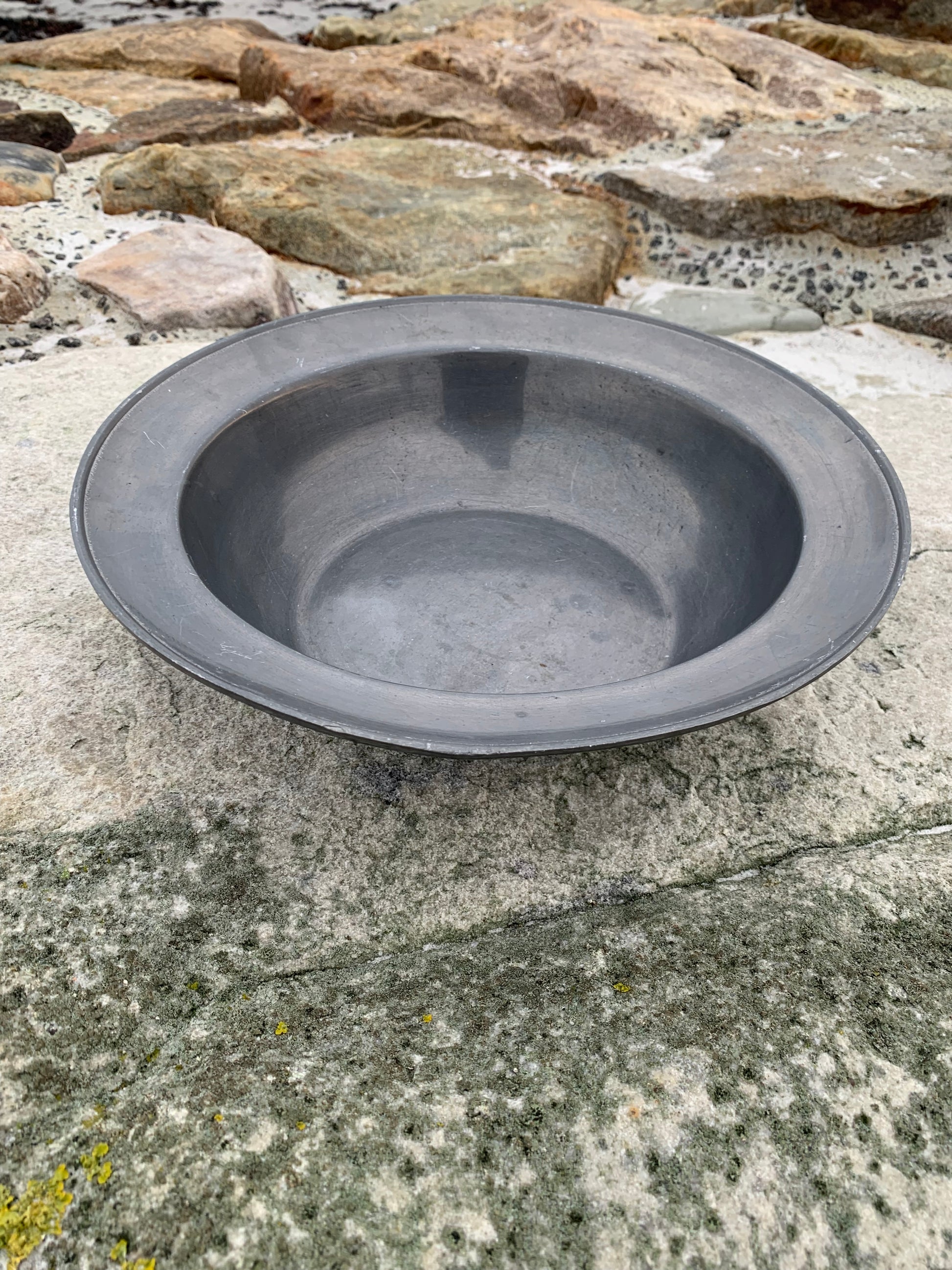 Vackert gammalt tennfat med mycket patina - mycket dekorativt och med stämpel.