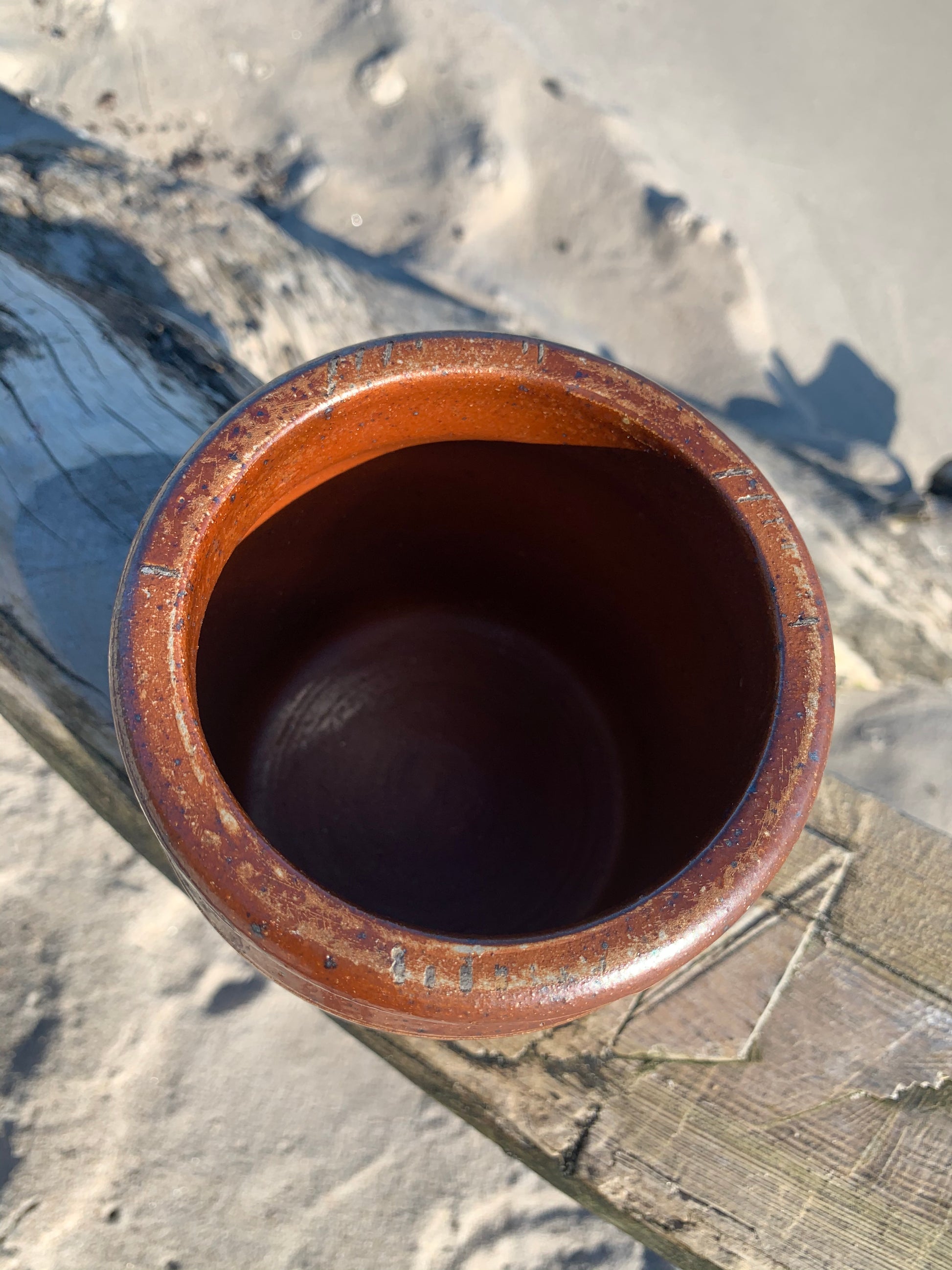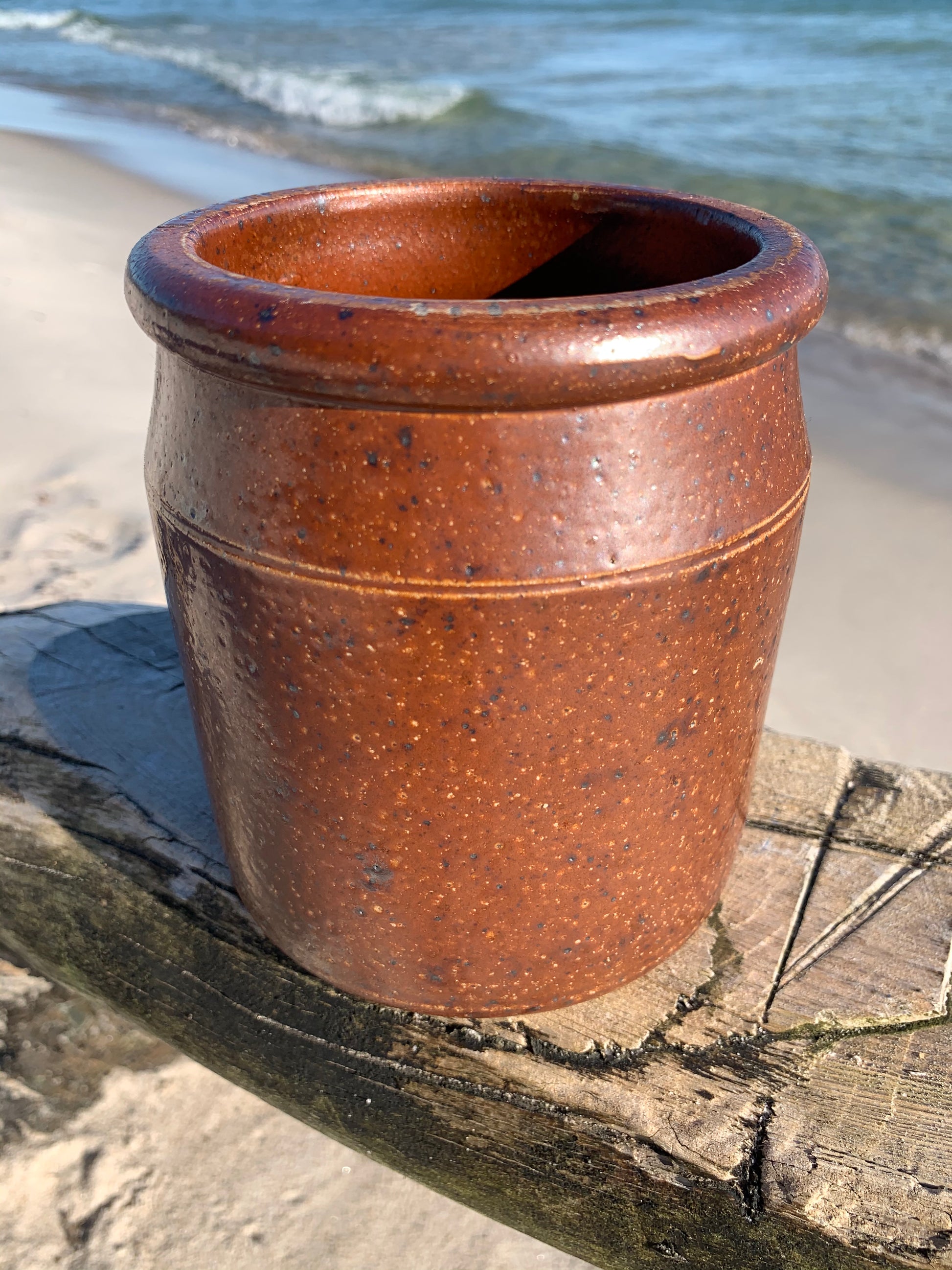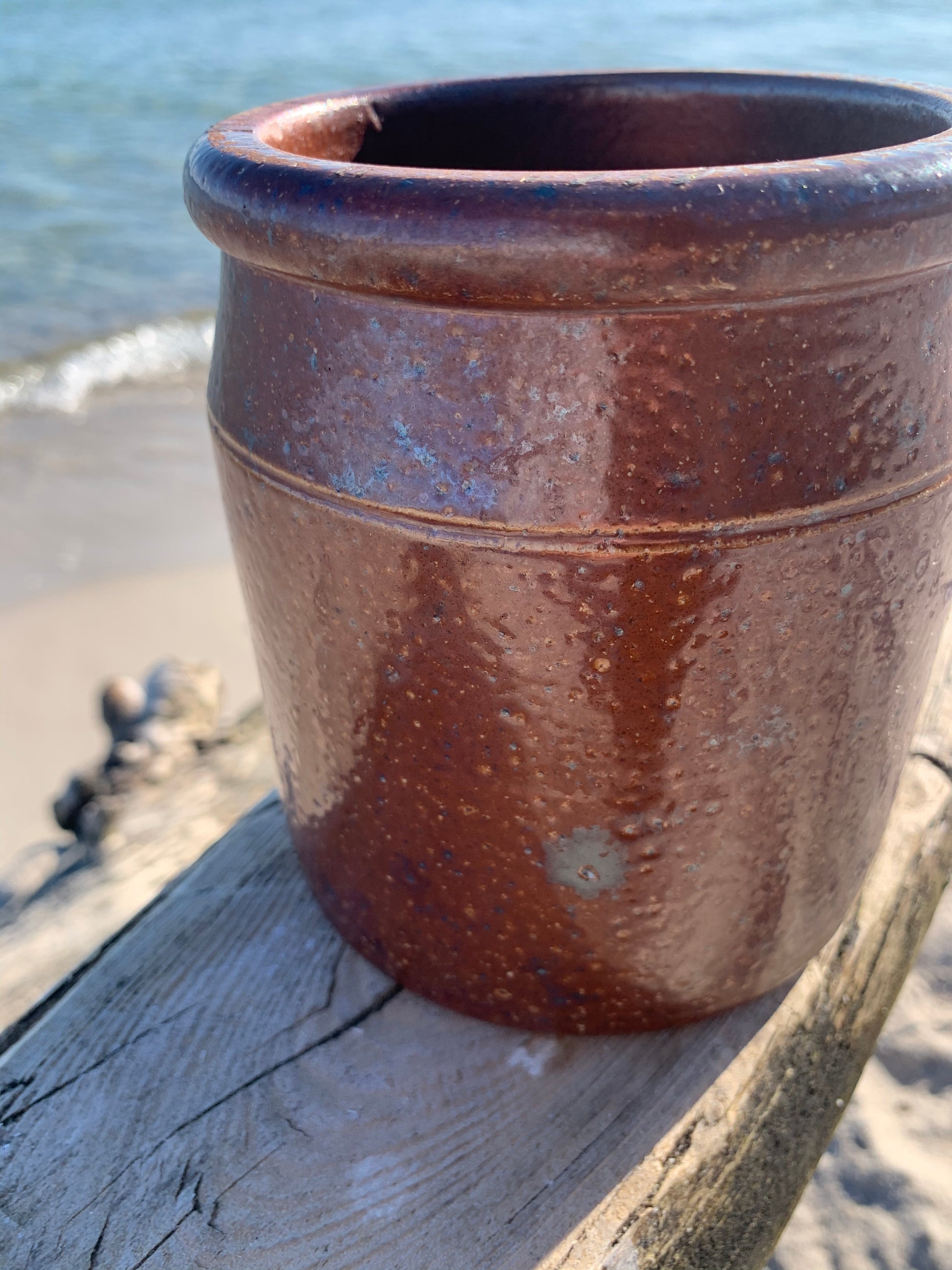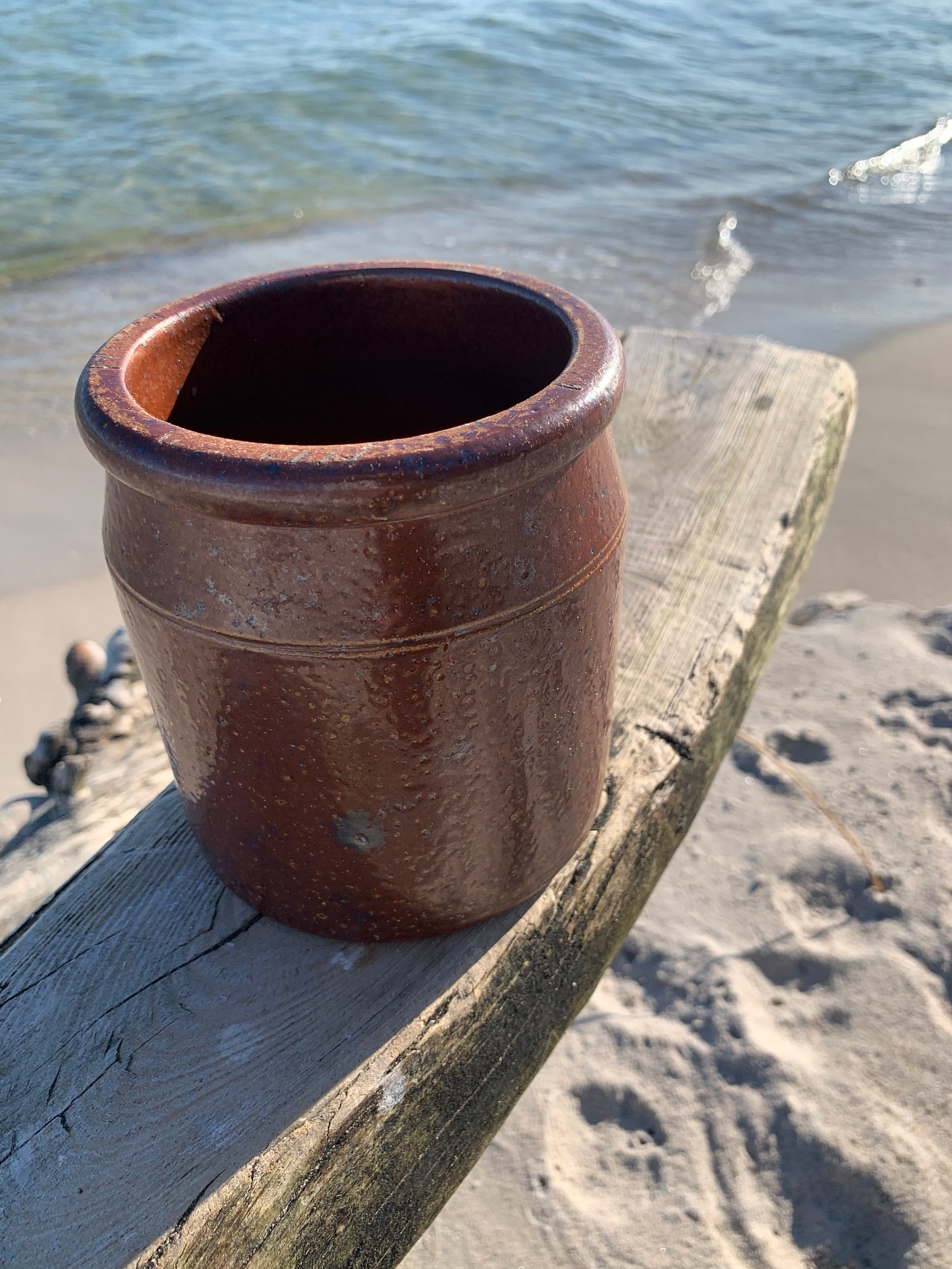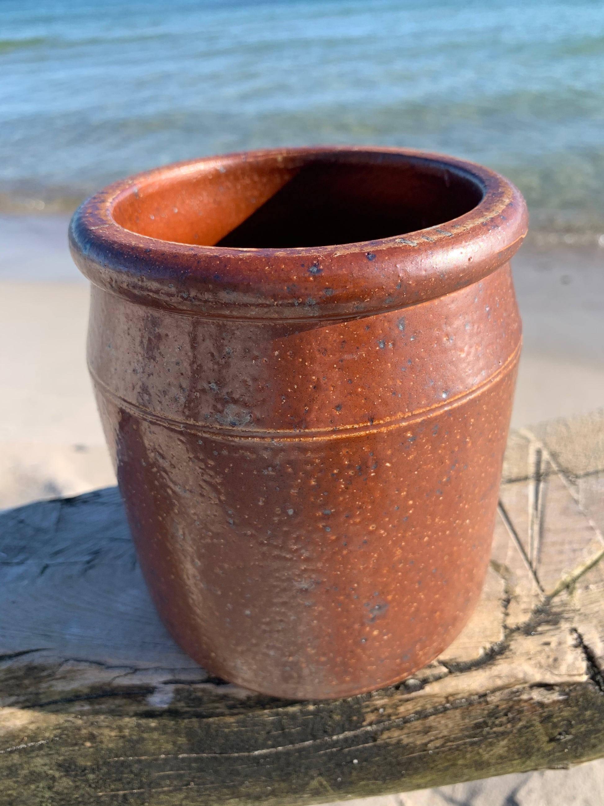 Användbar inläggningsburk som kan användas till en växt, till köksredskap eller vad du nu kan tänka dig. Burken är original, charmig och har en patina.