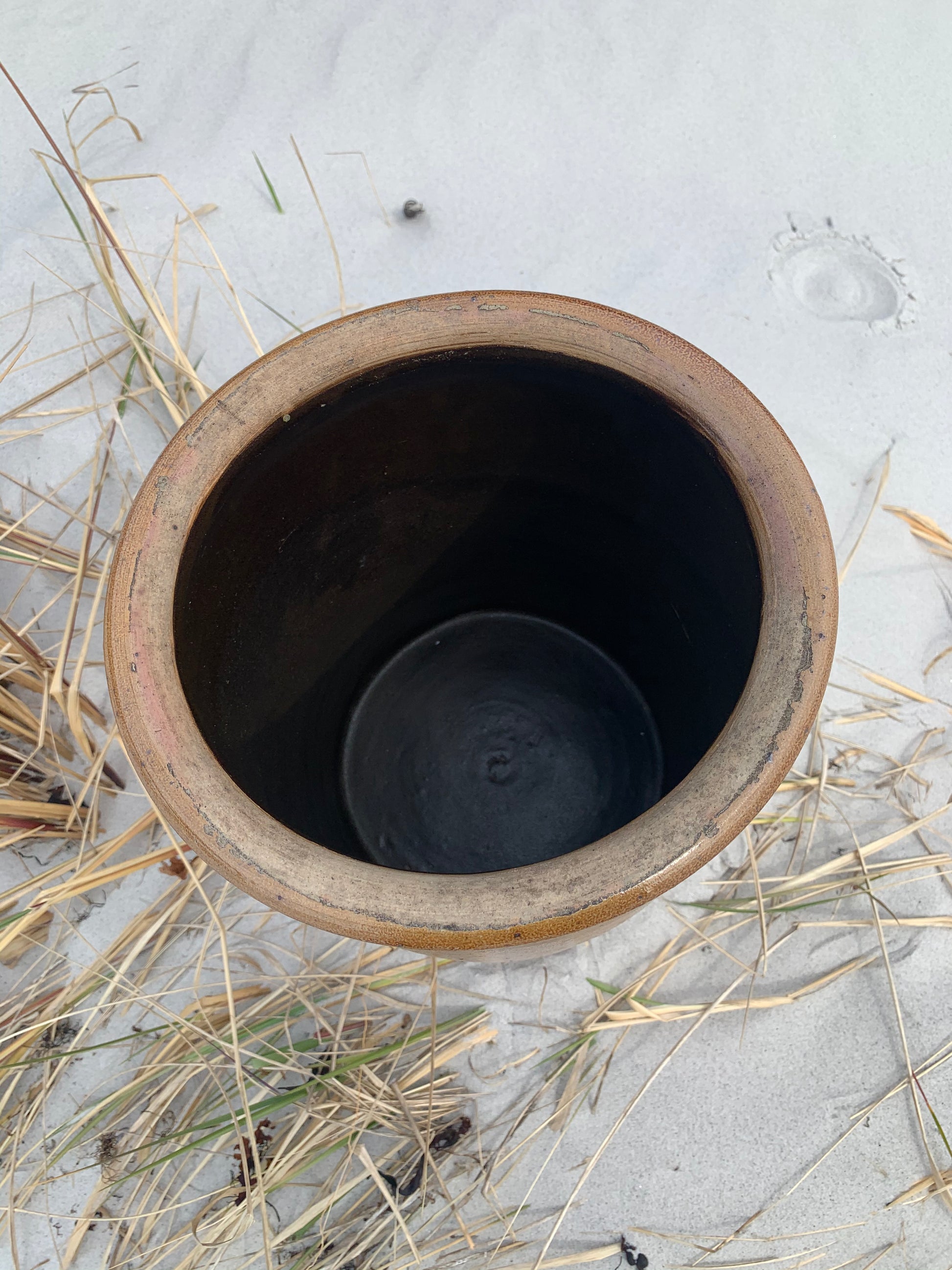 Användbar inläggningsburk som kan användas till en växt, till köksredskap eller vad du nu kan tänka dig. Burken har patina och en yttre spricka i botten.