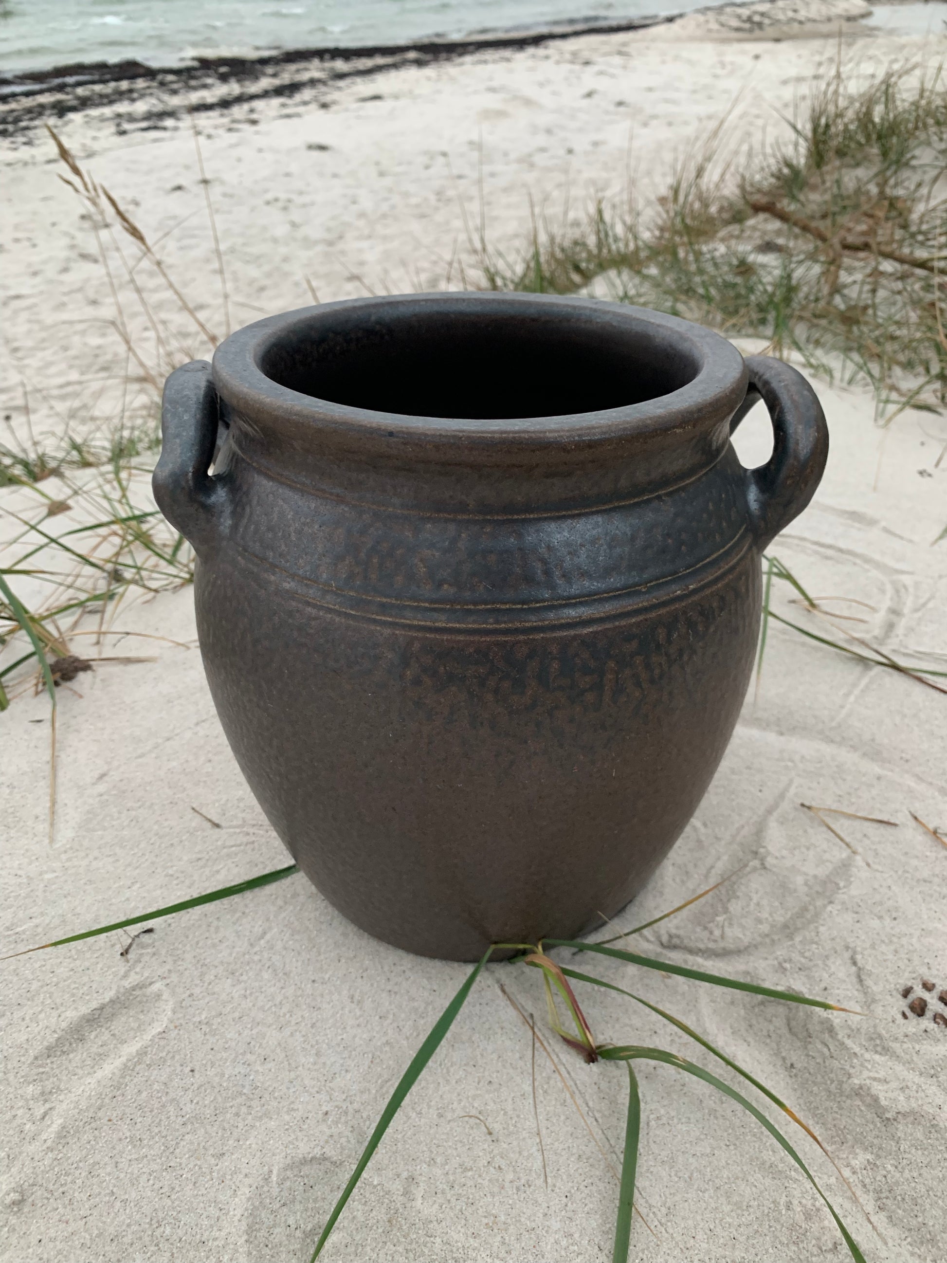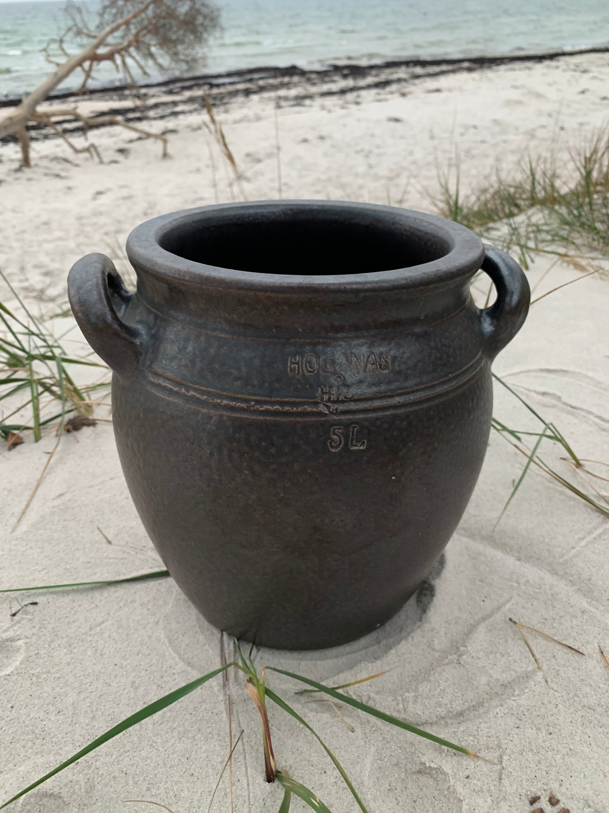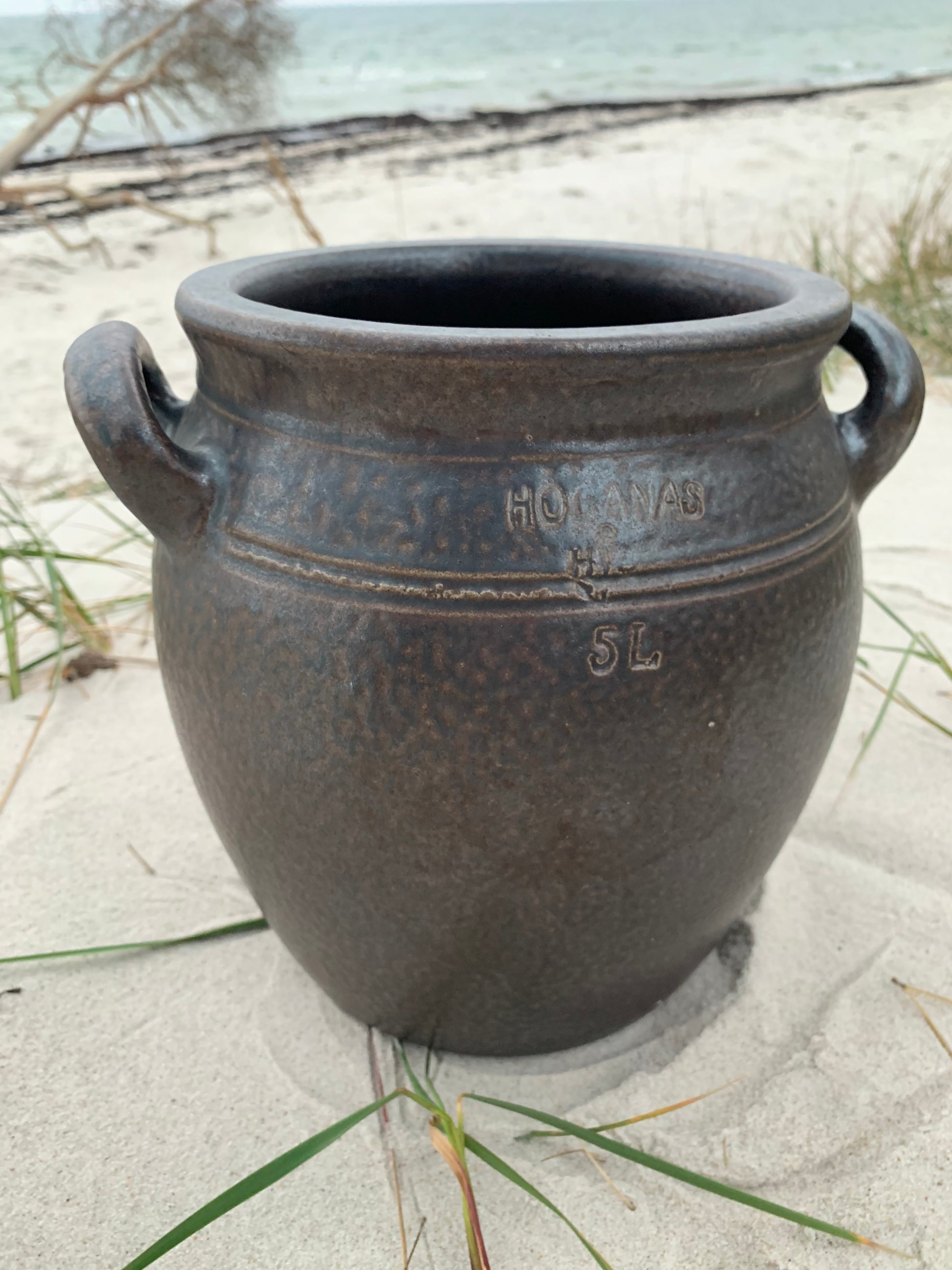 Användbar inläggningsburk som kan användas till en växt, till köksredskap eller vad du nu kan tänka dig. Burken är original, charmig och har en patina.