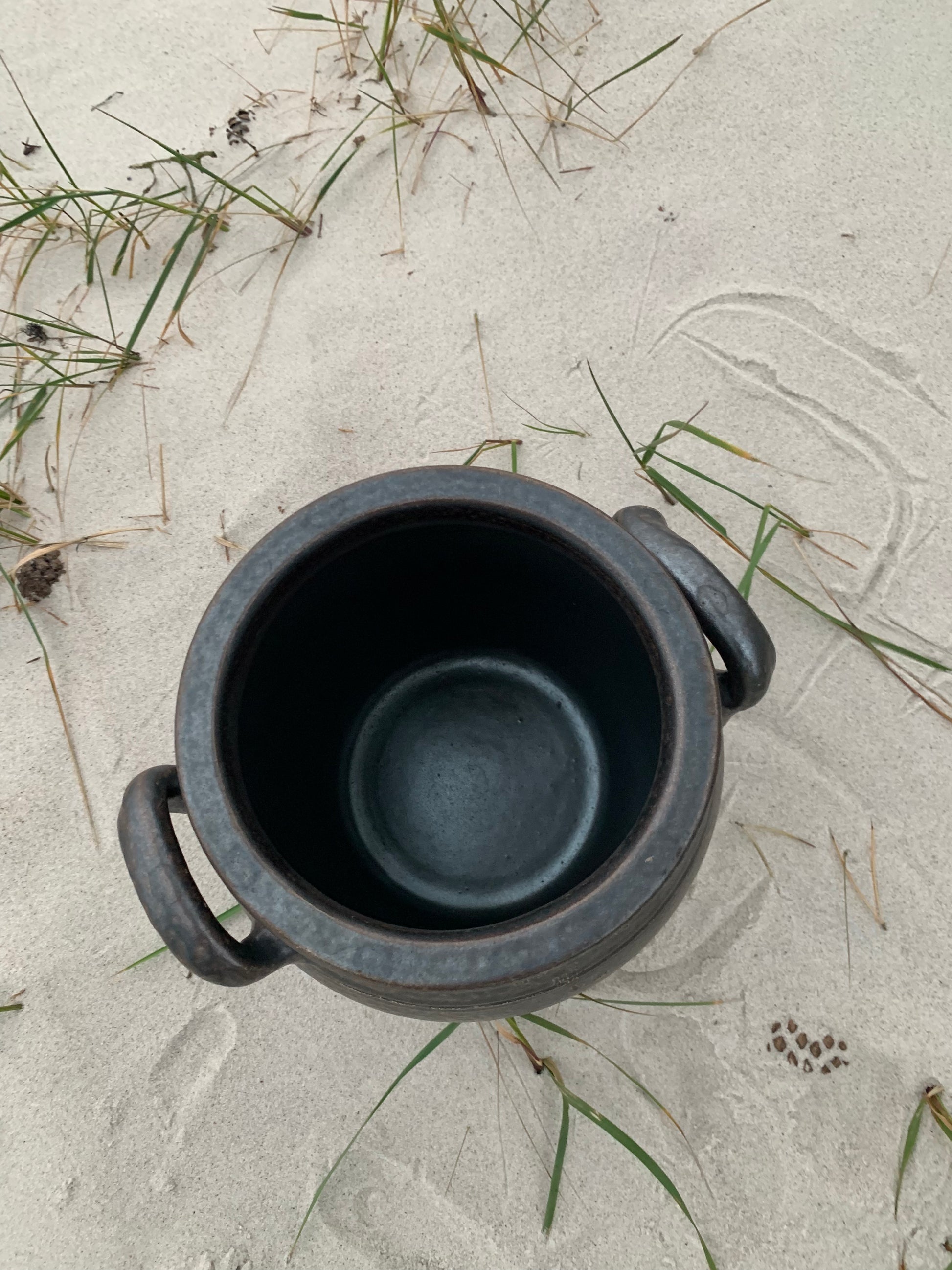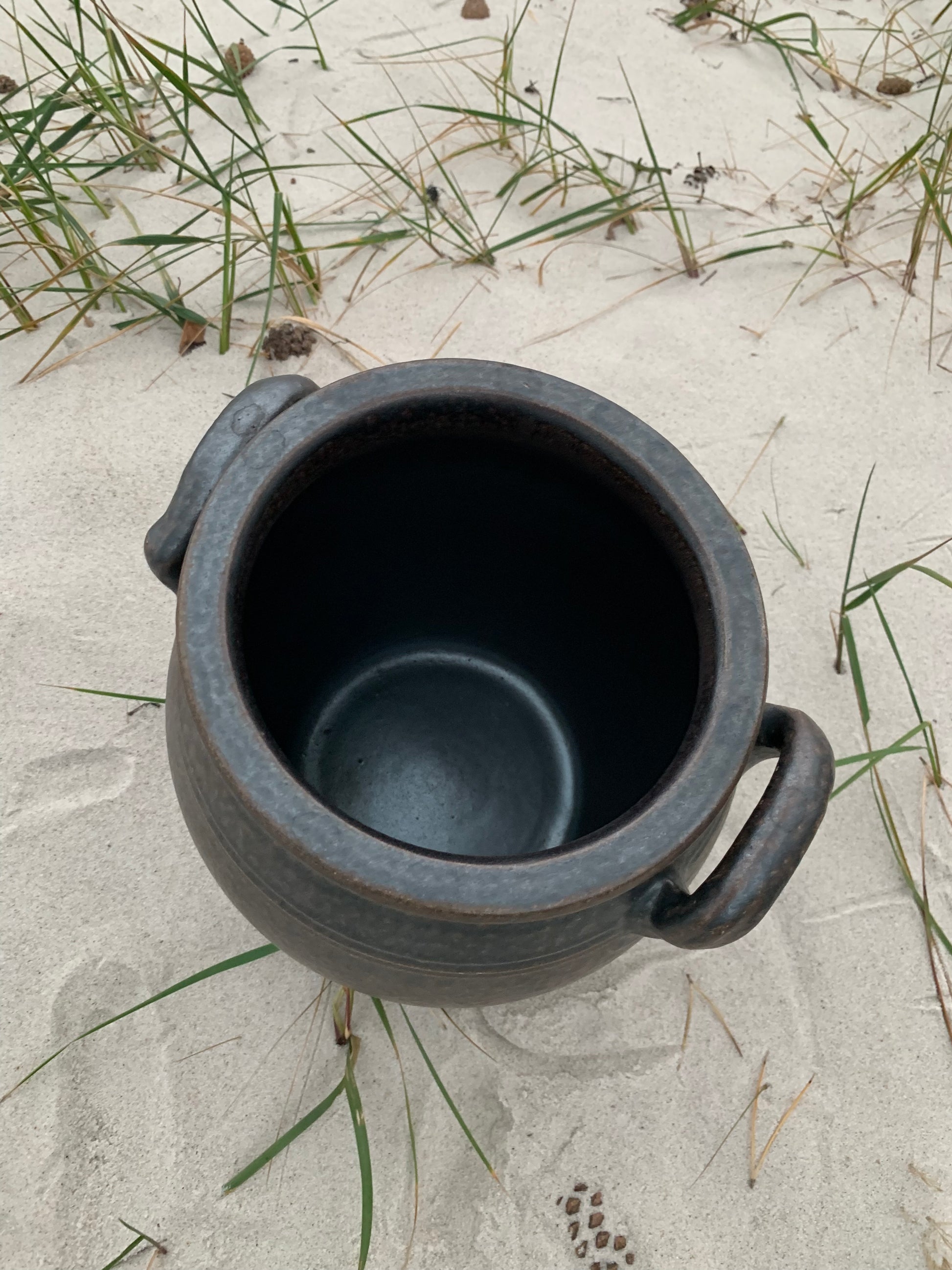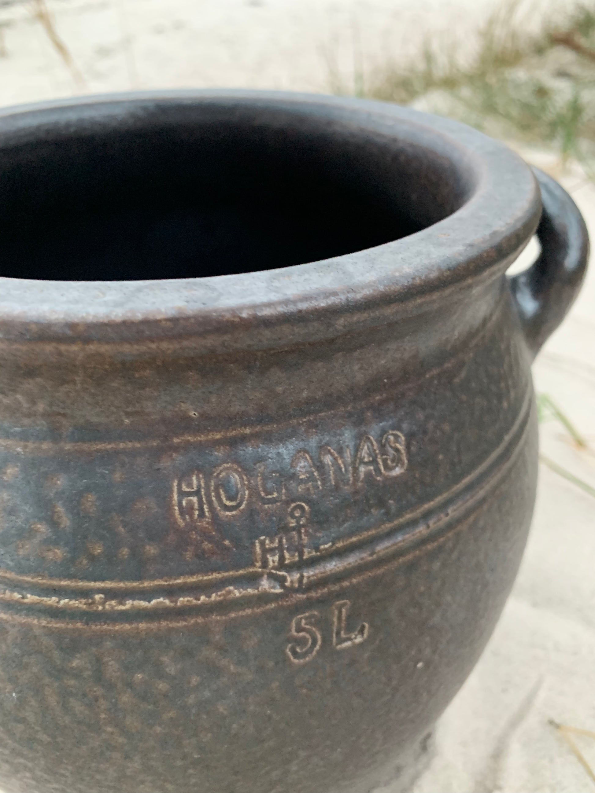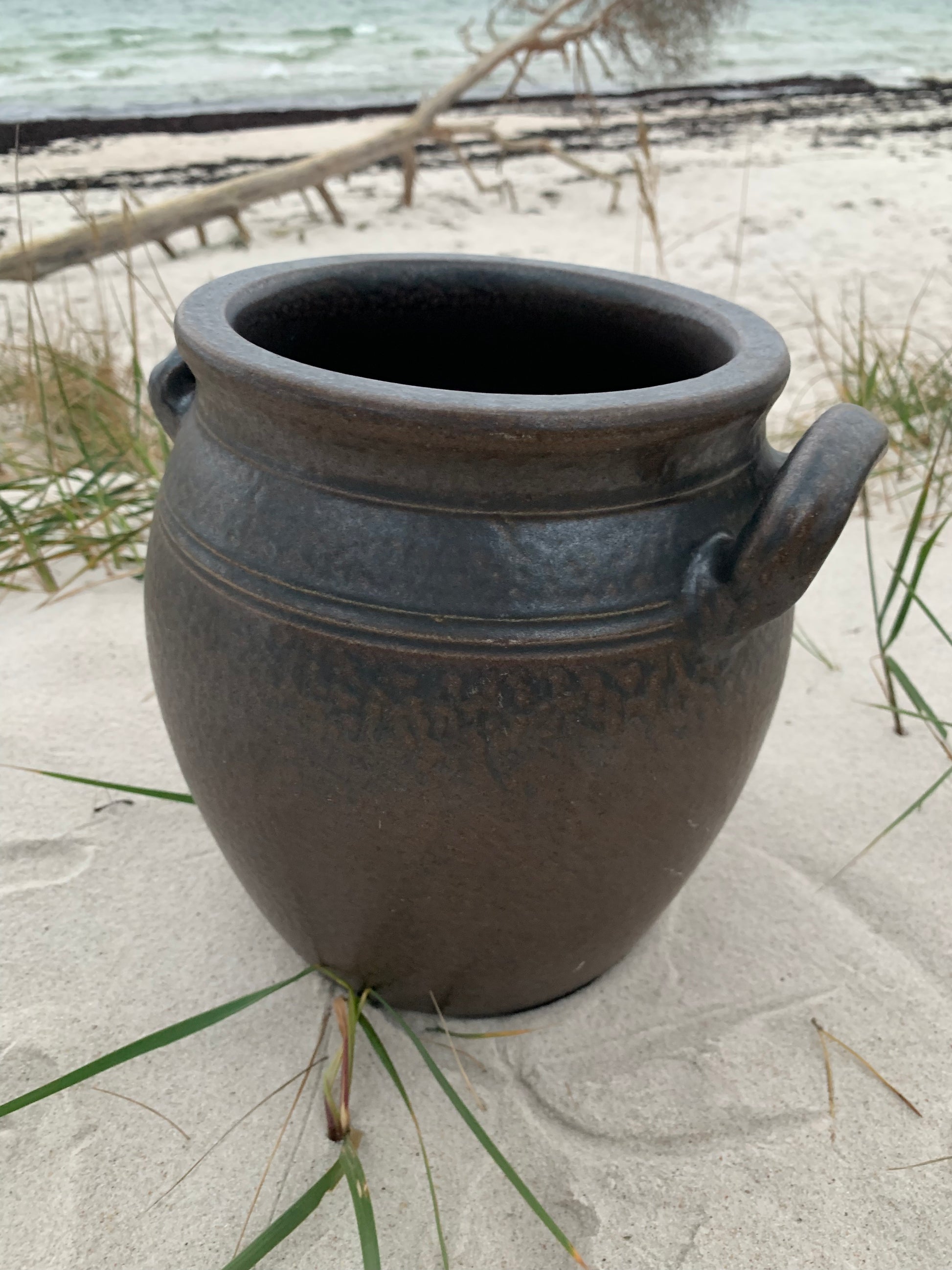 Användbar inläggningsburk som kan användas till en växt, till köksredskap eller vad du nu kan tänka dig. Burken är original, charmig och har en patina.