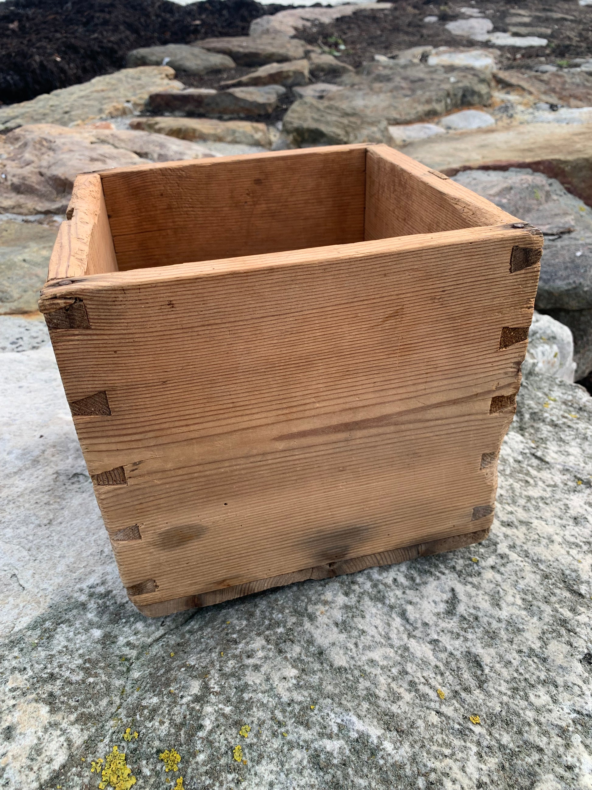 Gammal och mycket charmig trälåda. Lådan har fina hantverksdetaljer (hörnen är tejpade ihop) och den har ett uttryck som har tagit många år att uppnå.
