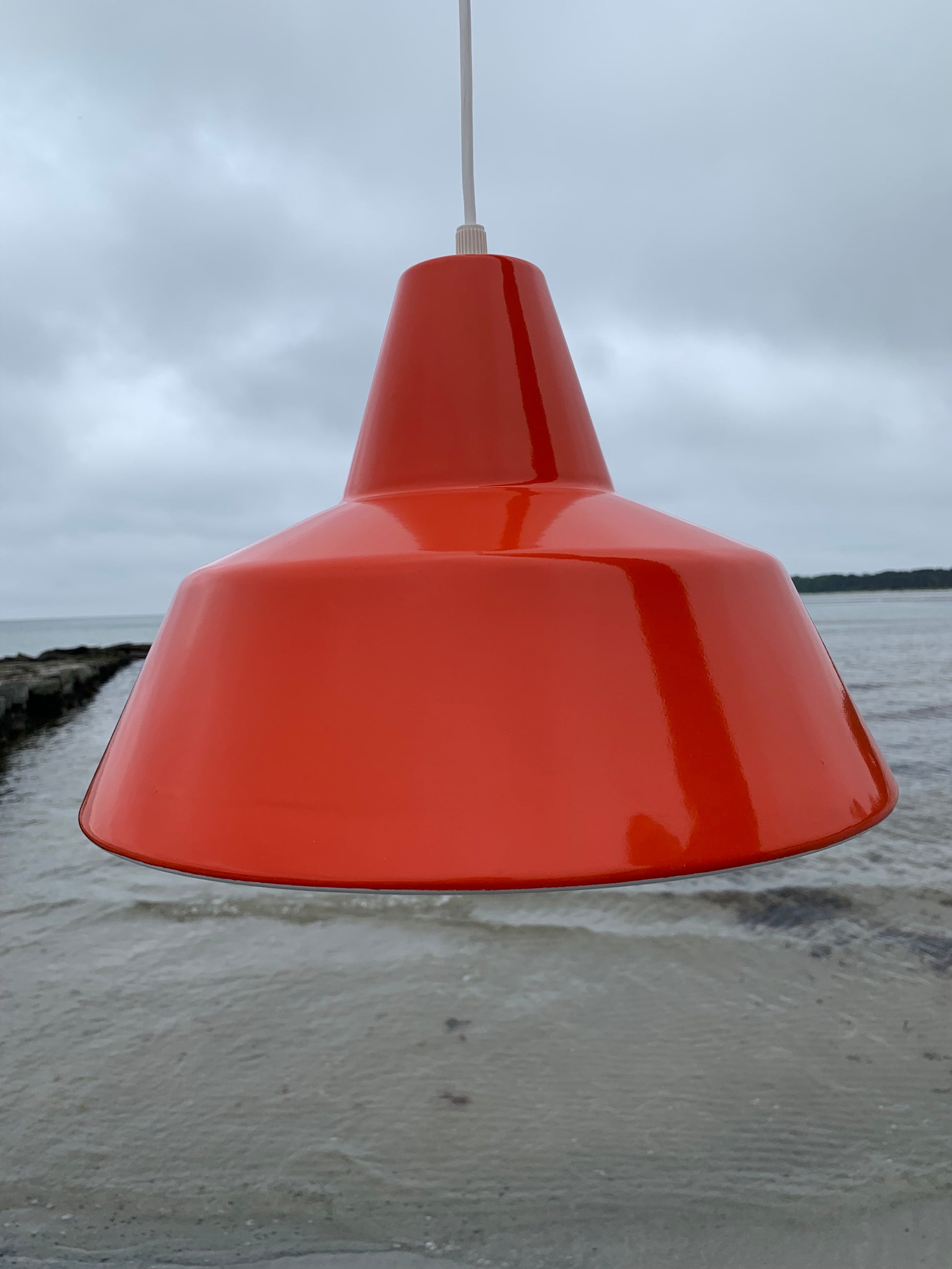 Verkstadslampa i klassisk version. Lampan har vissa åldersrelaterade bruksspår och ett enda litet nagg (se bild). Sammantaget är den dock i mycket gott vintageskick.